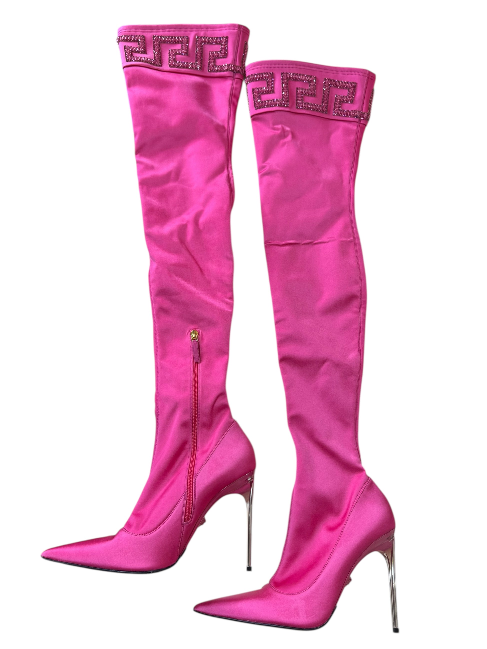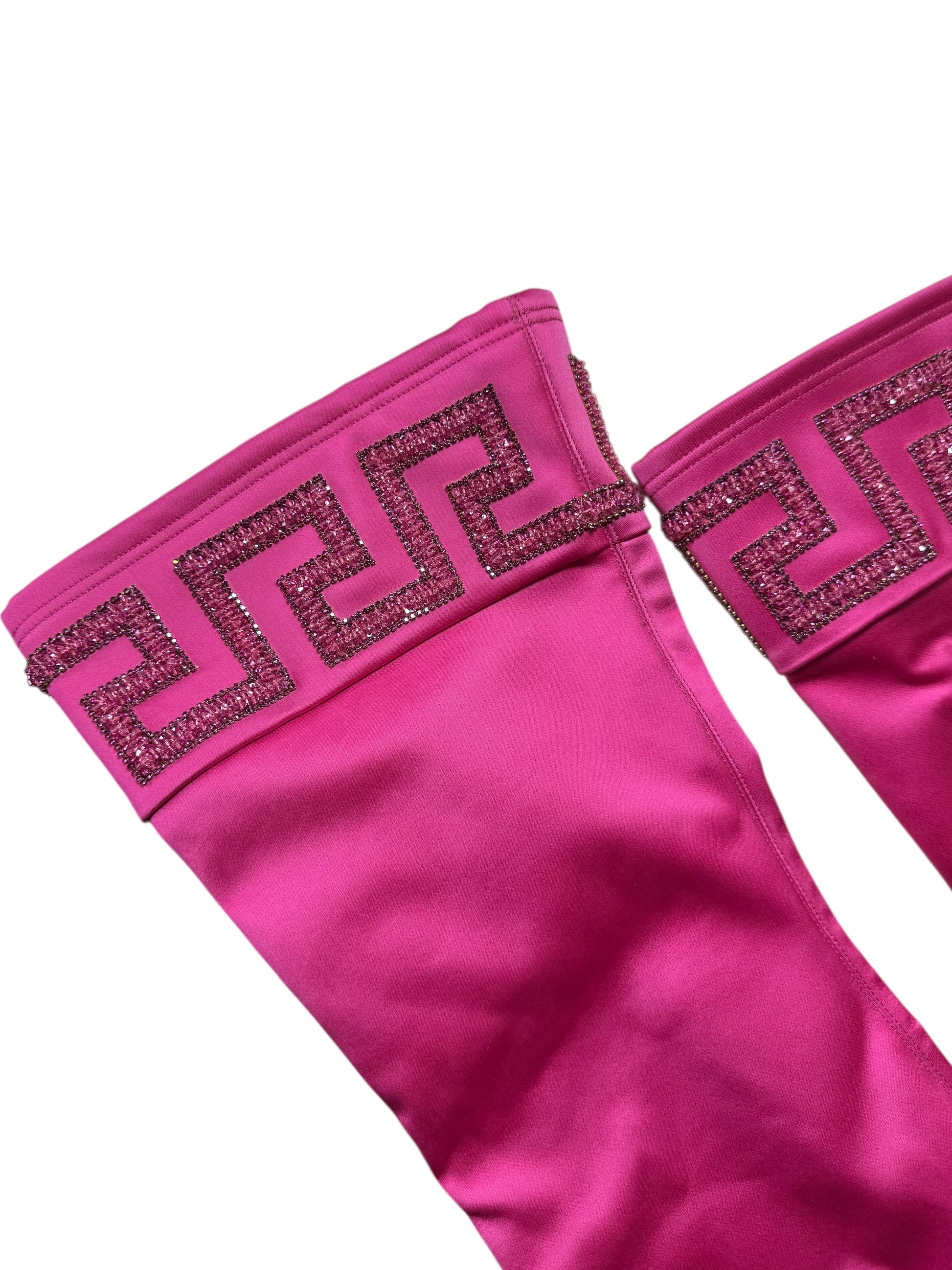 Stivali alti Versace fucsia in satin con tacco a spillo e greca di strass – Nuovi, taglia 40