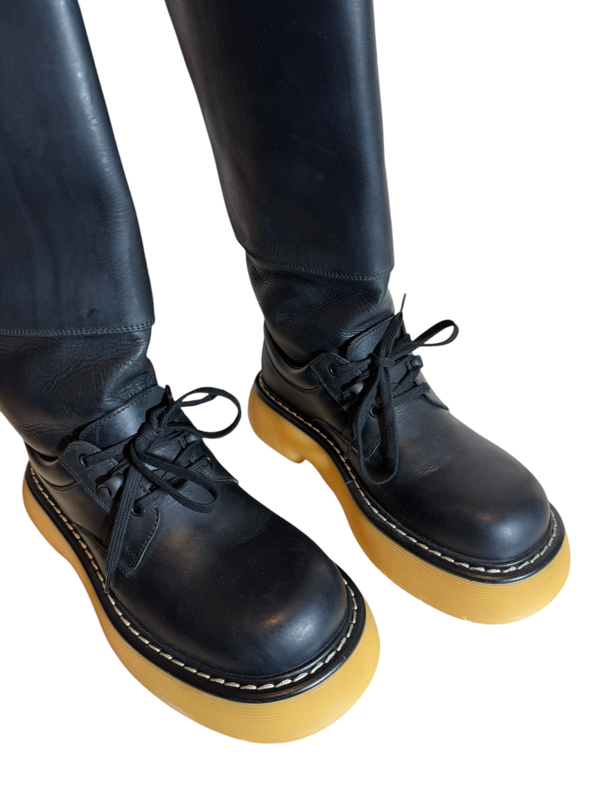 Stivali firmati Bottega Veneta, realizzati in pelle nera di alta qualità, caratterizzati da un design audace e moderno con una suola chunky gialla che garantisce comfort e stile.