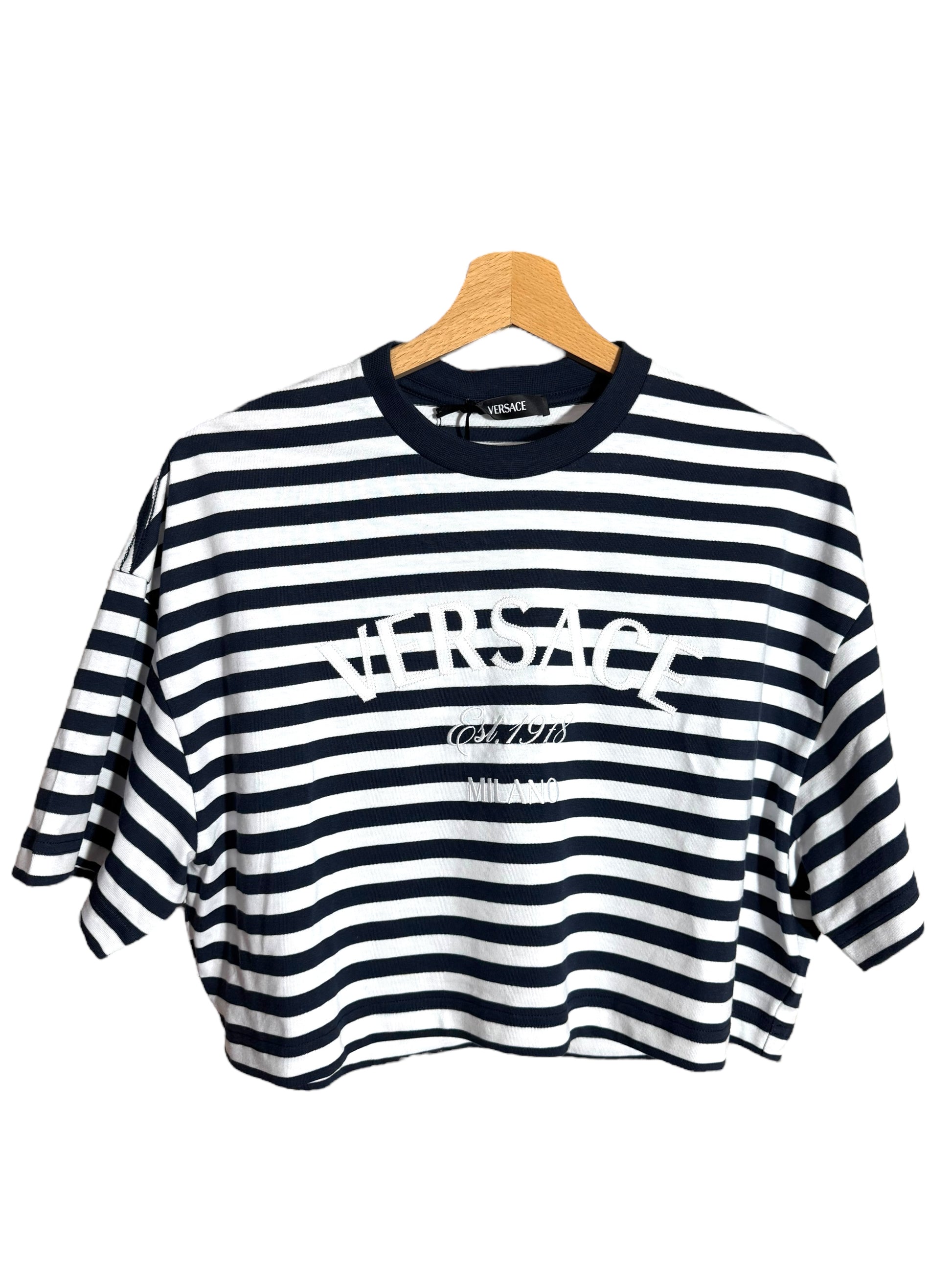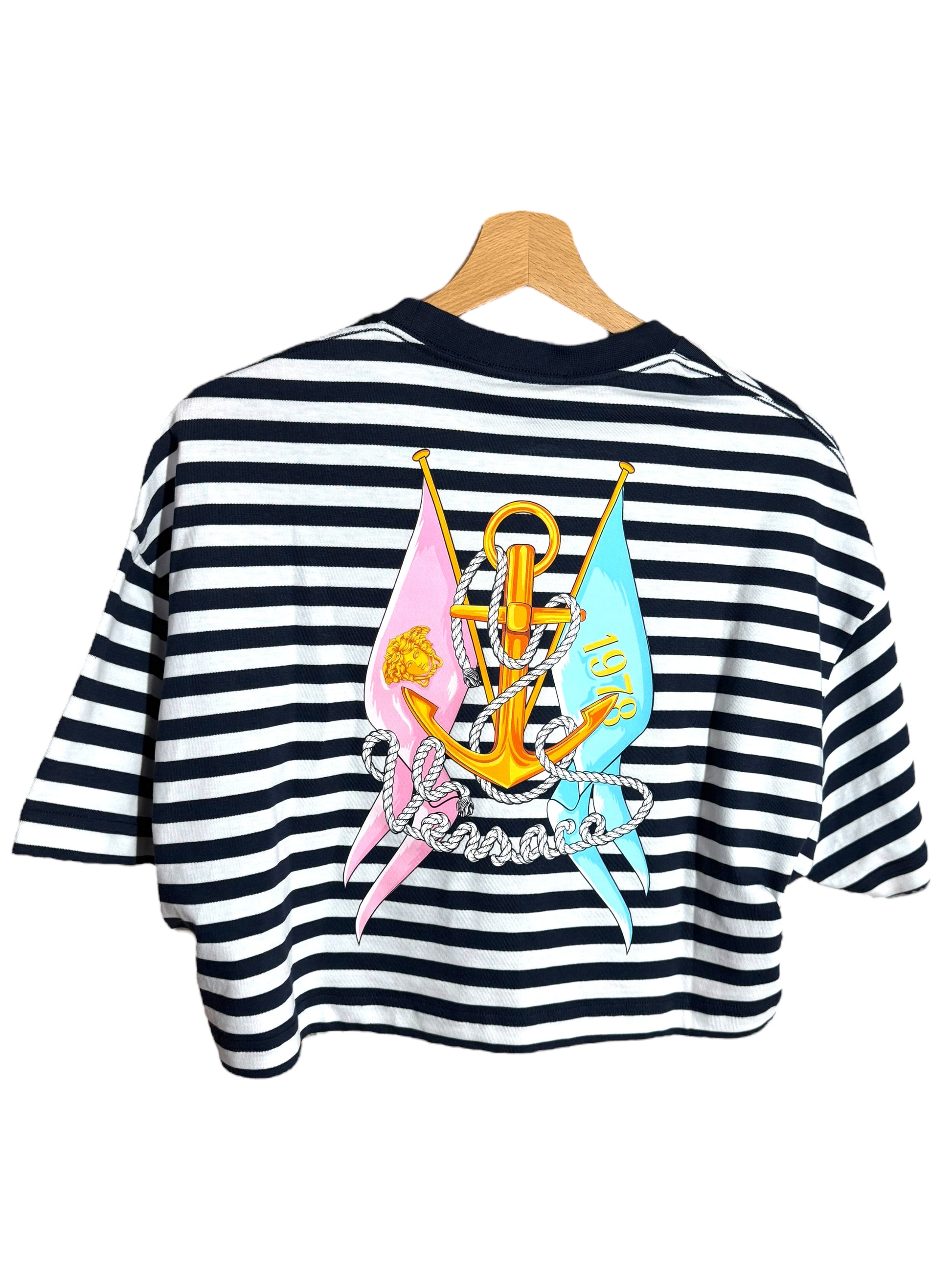 T-shirt Versace originale, nuova con cartellino, dal design a righe bianche e blu navy in stile marinaro. Presenta un logo Versace Est. 1978 Milano ricamato sul petto e una stampa con ancora e bandiere sulla schiena. Modello cropped fit a maniche larghe.