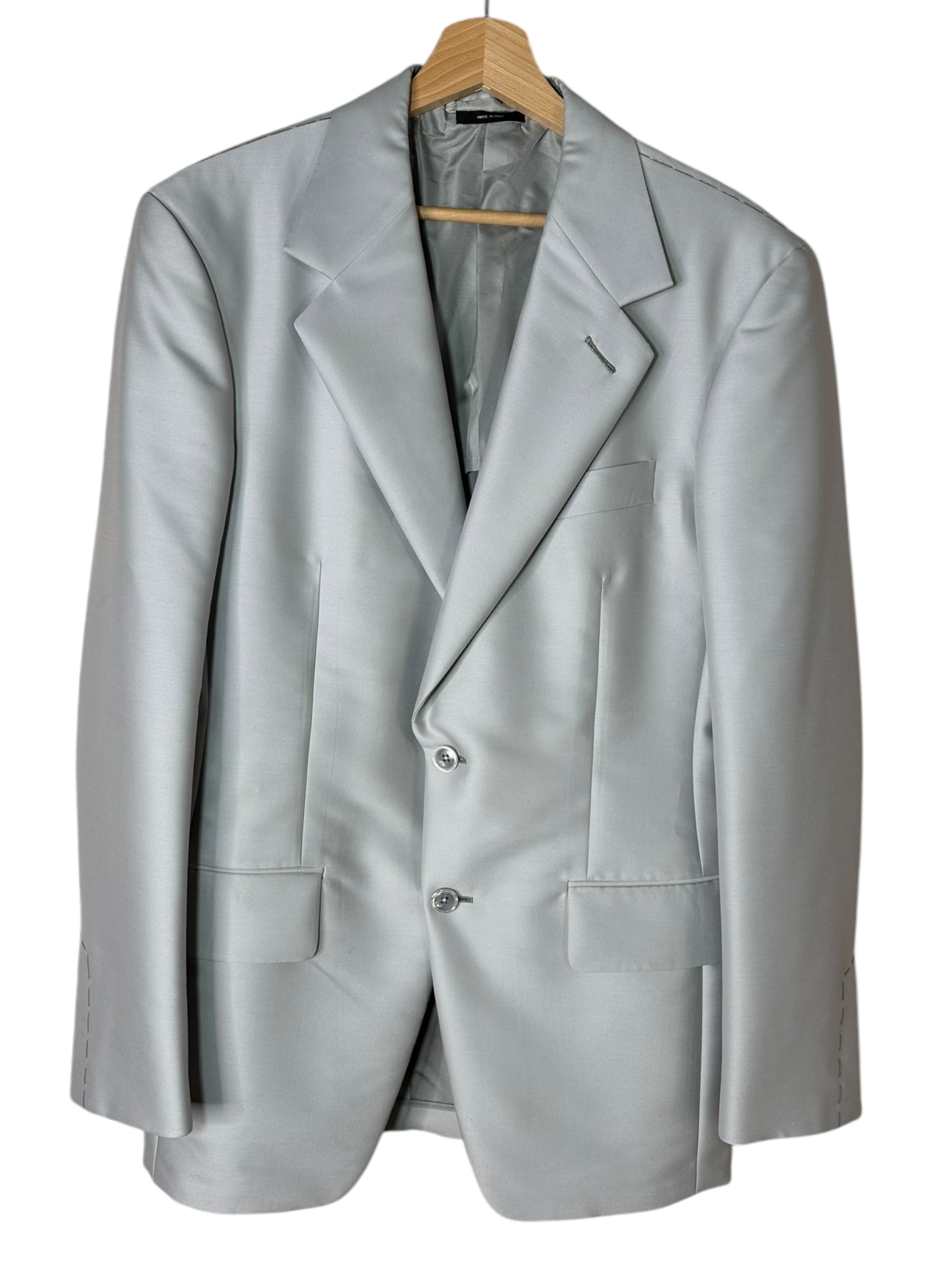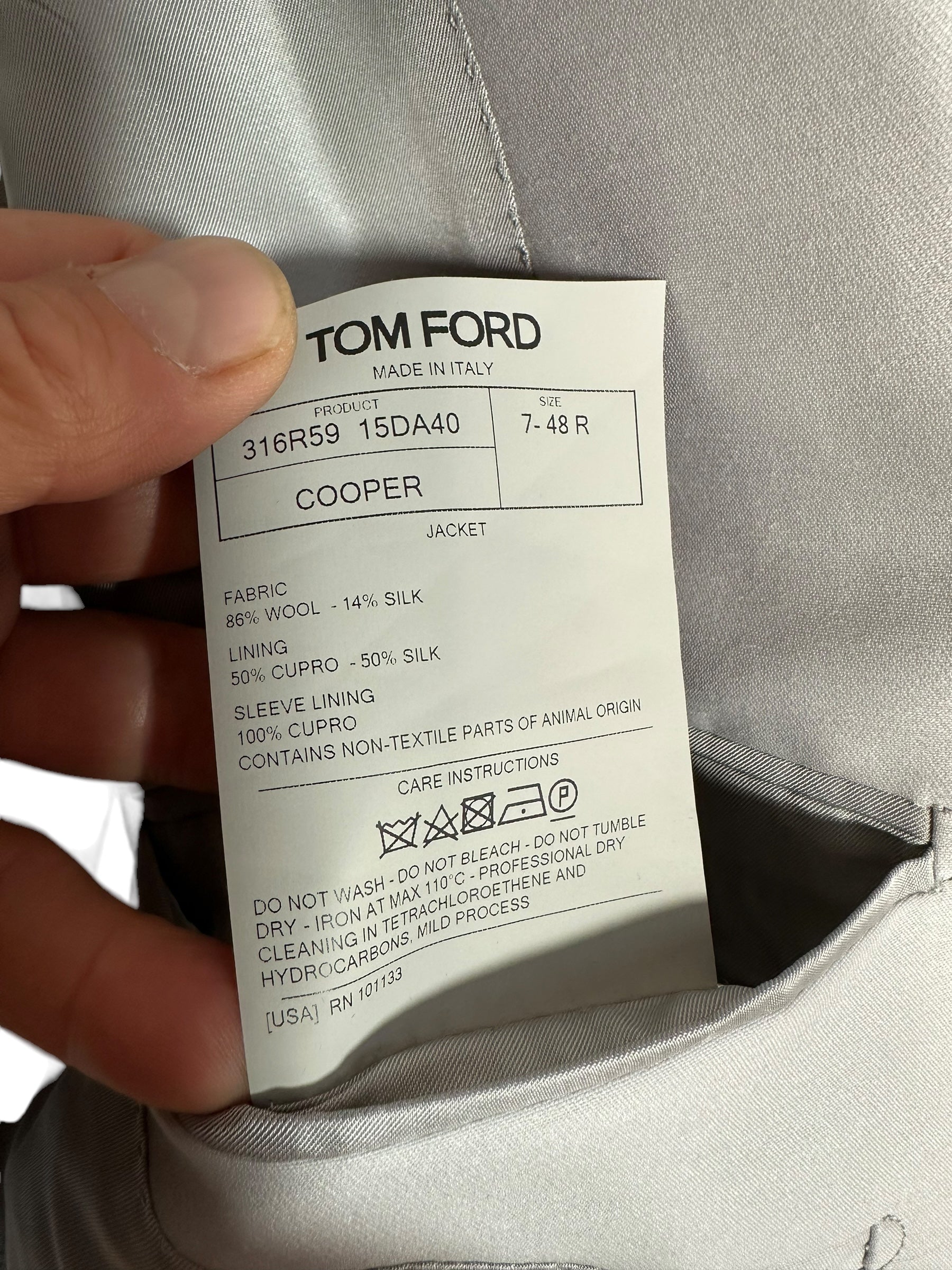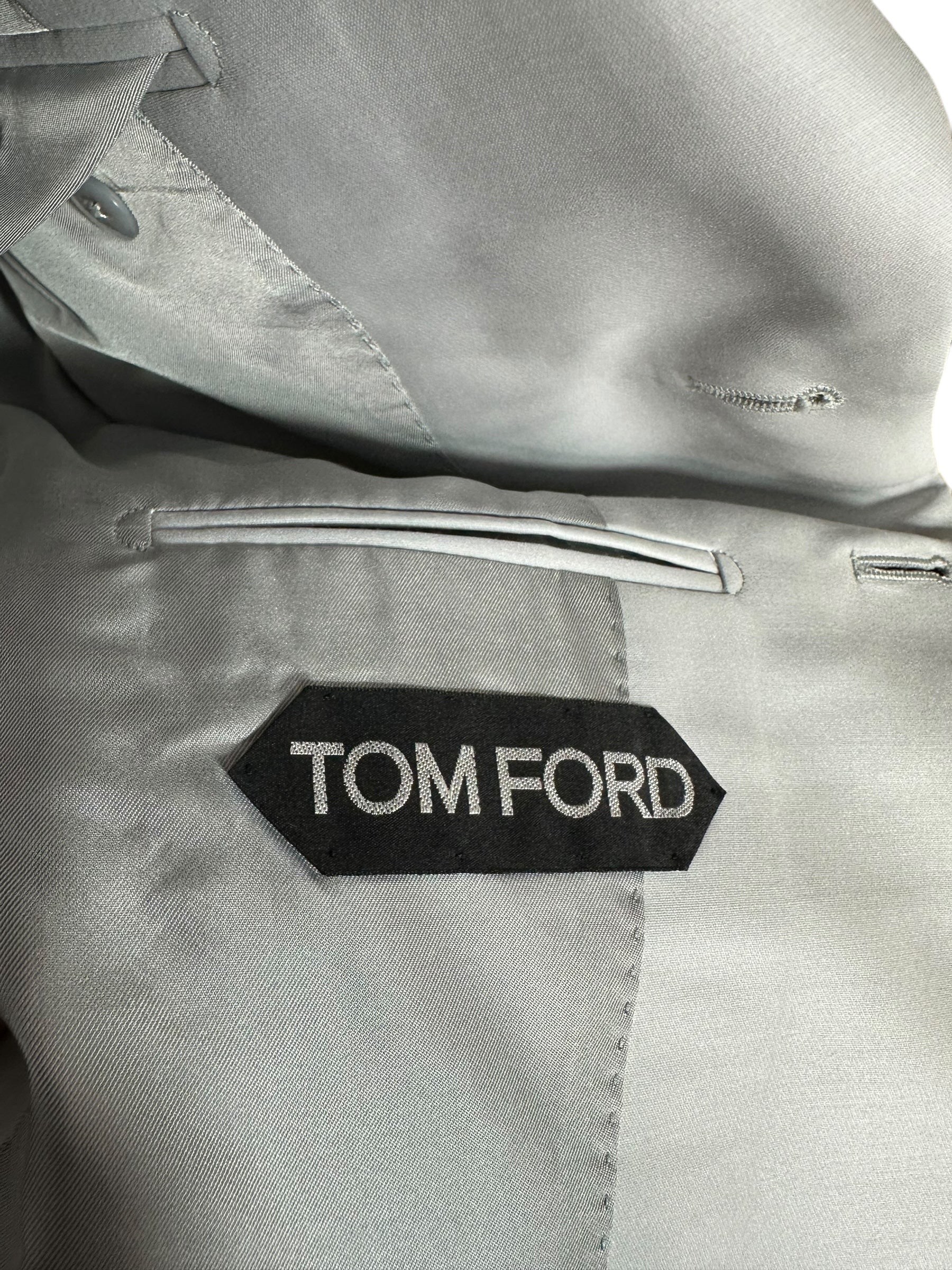 Blazer Tom Ford, modello Cooper, realizzato in un raffinato tessuto misto che unisce la morbidezza della lana alla lucentezza della seta. Un capo iconico che incarna il lusso sartoriale del brand, con dettagli strutturati e una silhouette impeccabile.