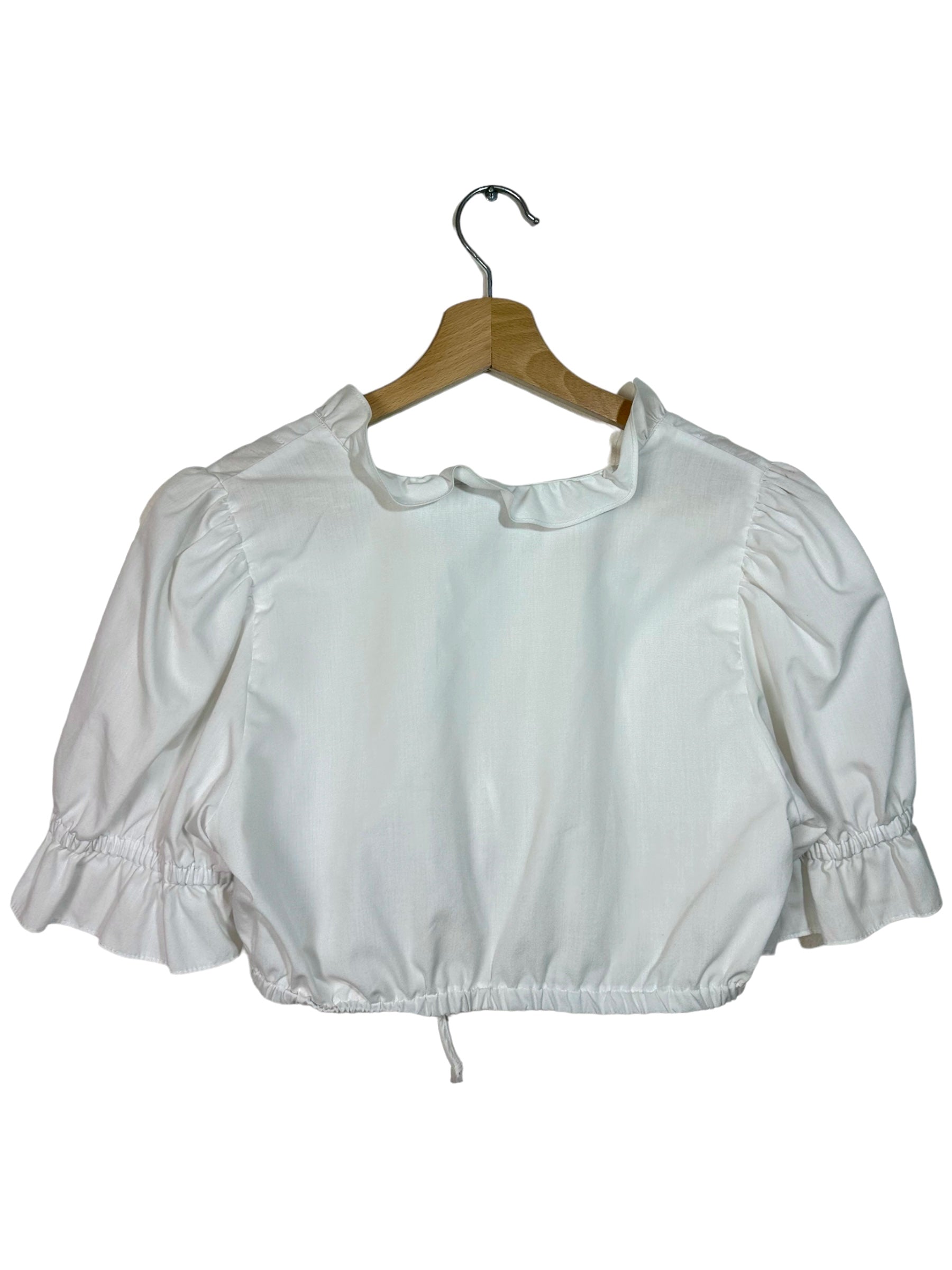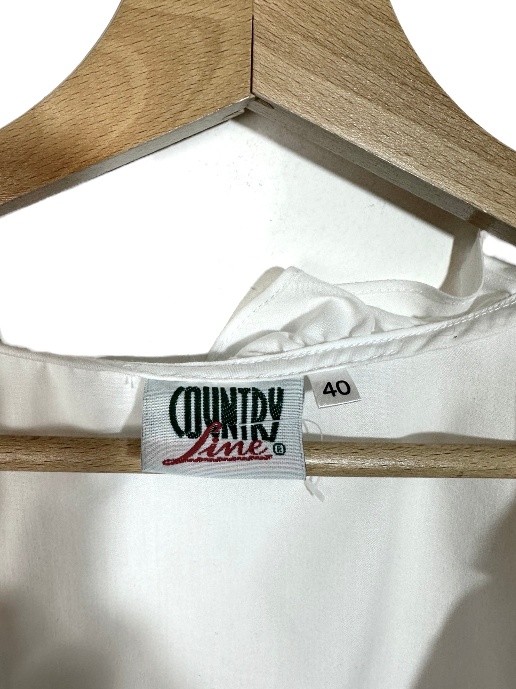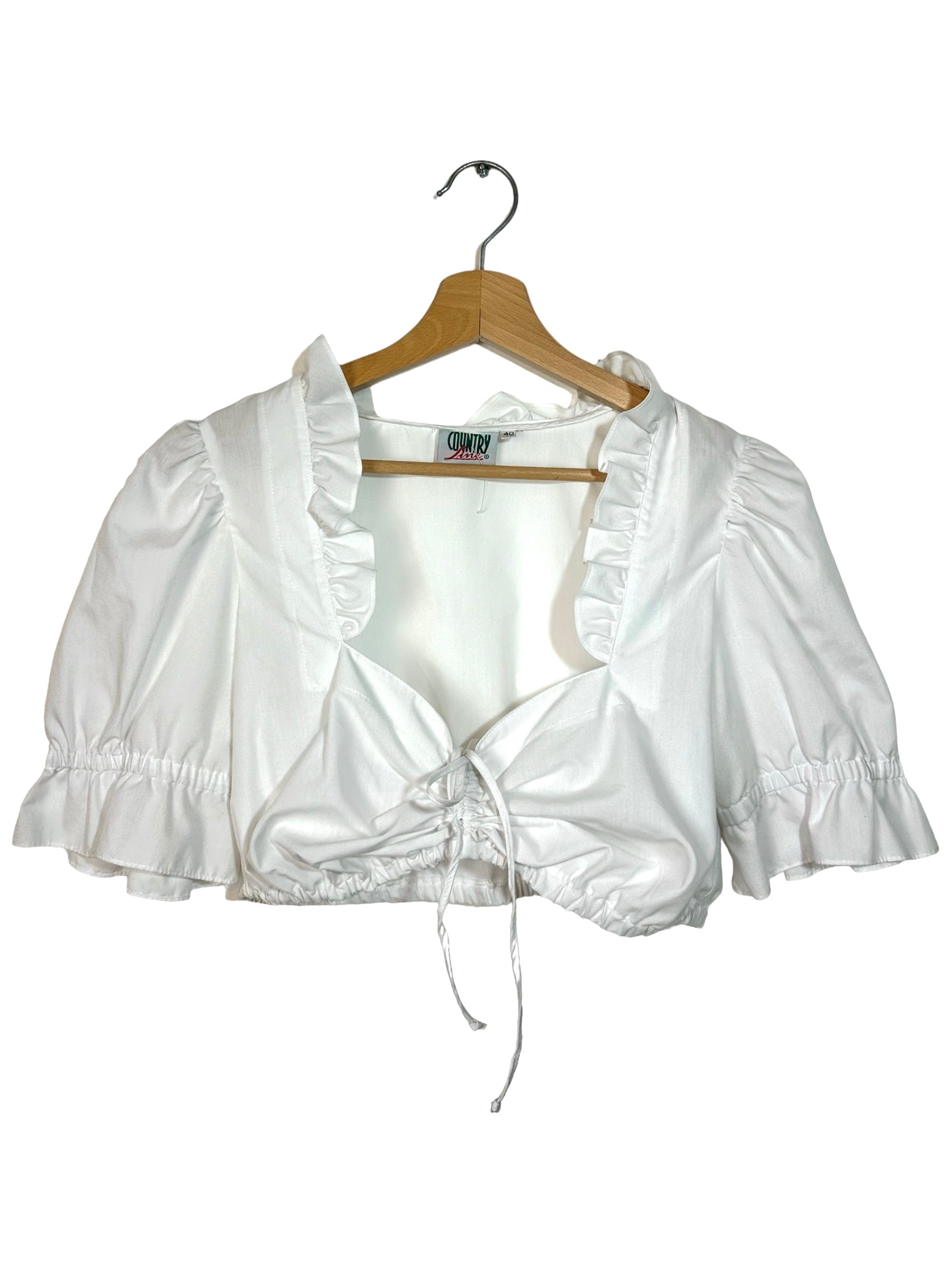 Top country vintage in cotone bianco a maniche corte con scollo a cuore e coulisse sul davanti. Tg. 40
