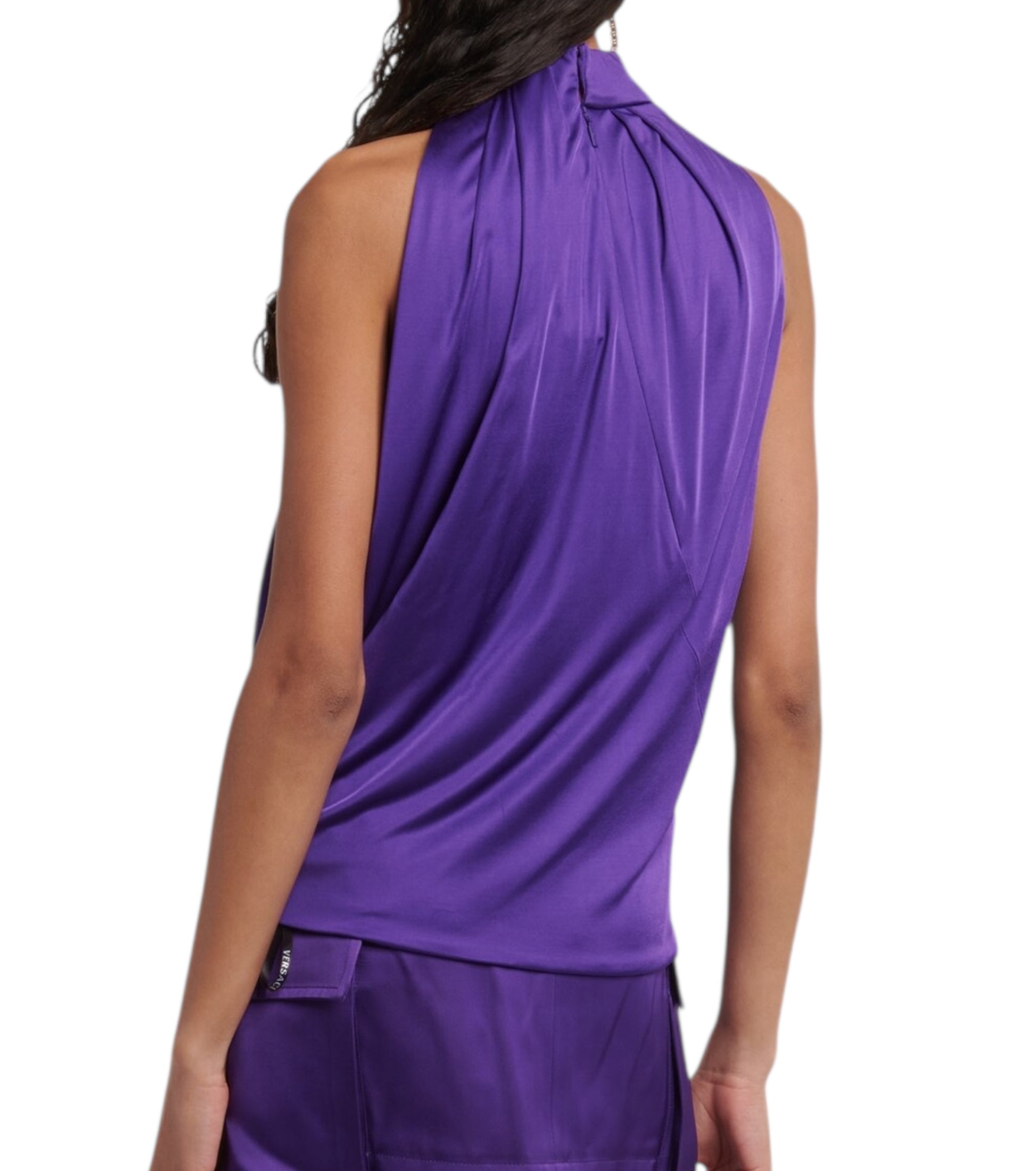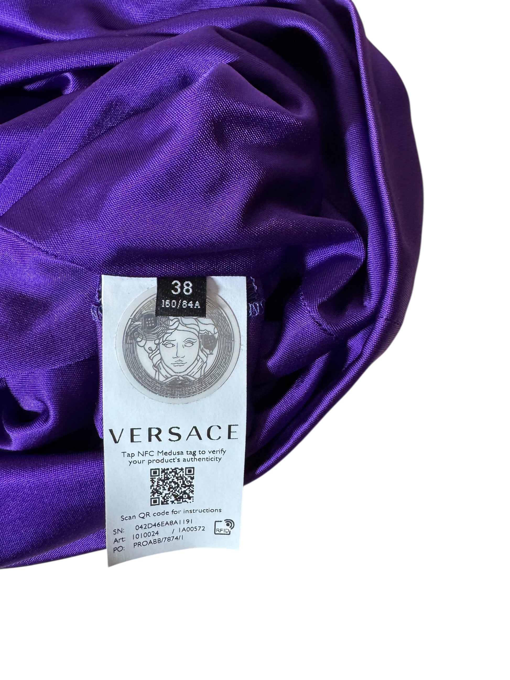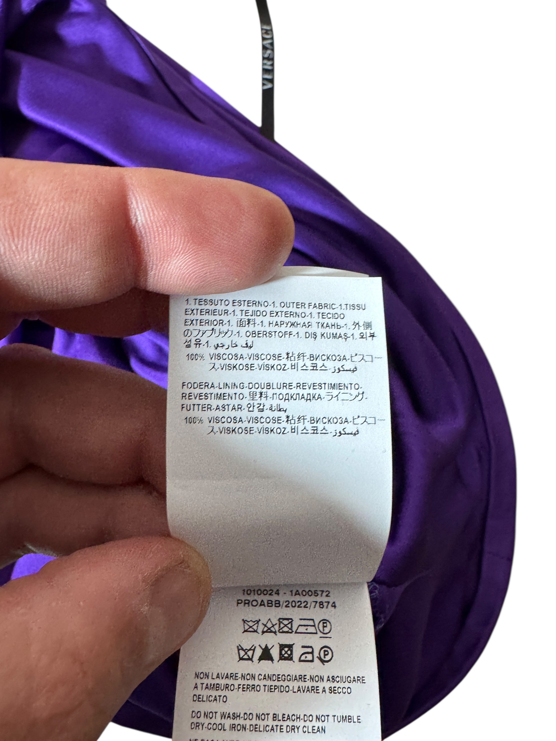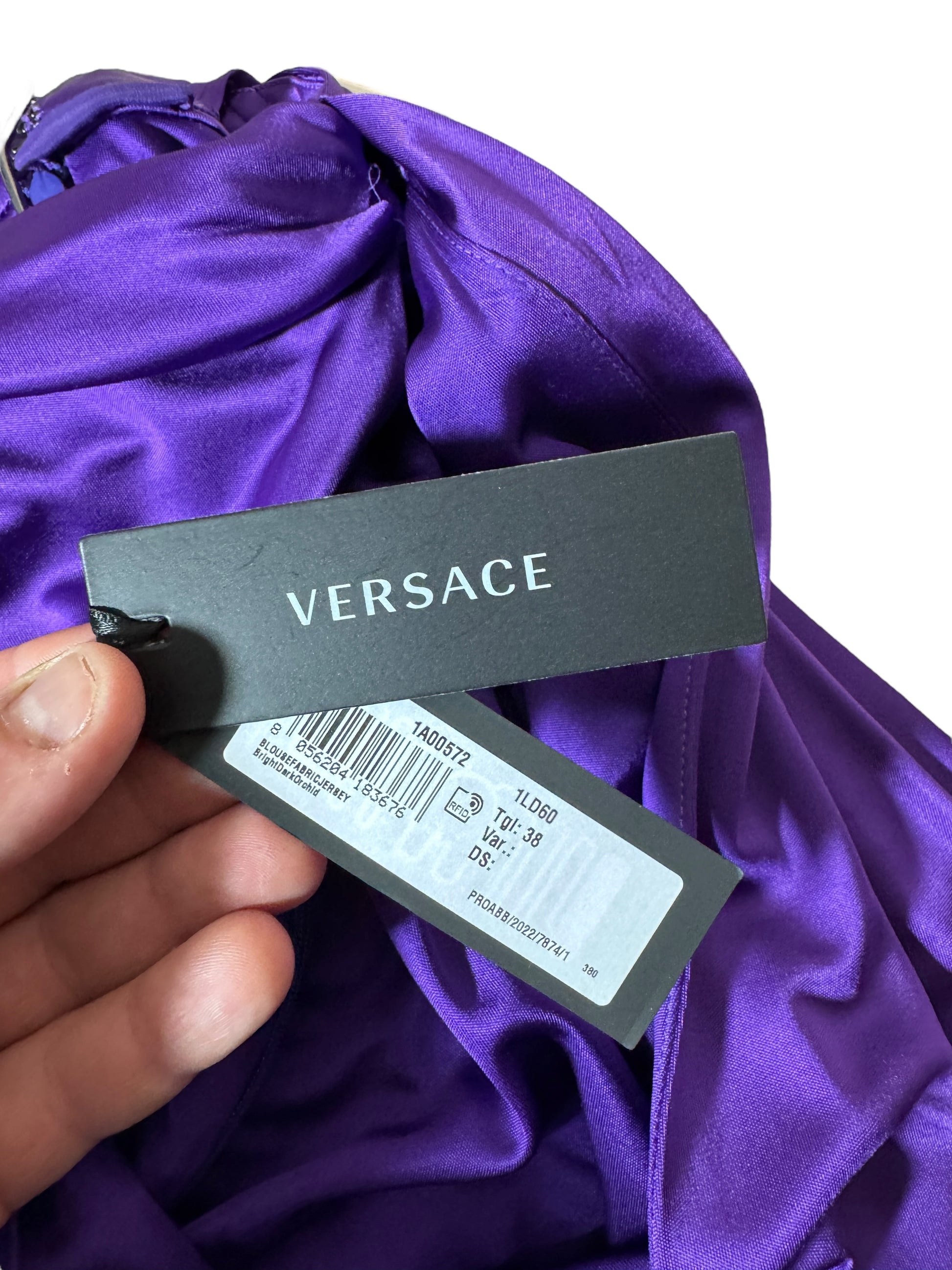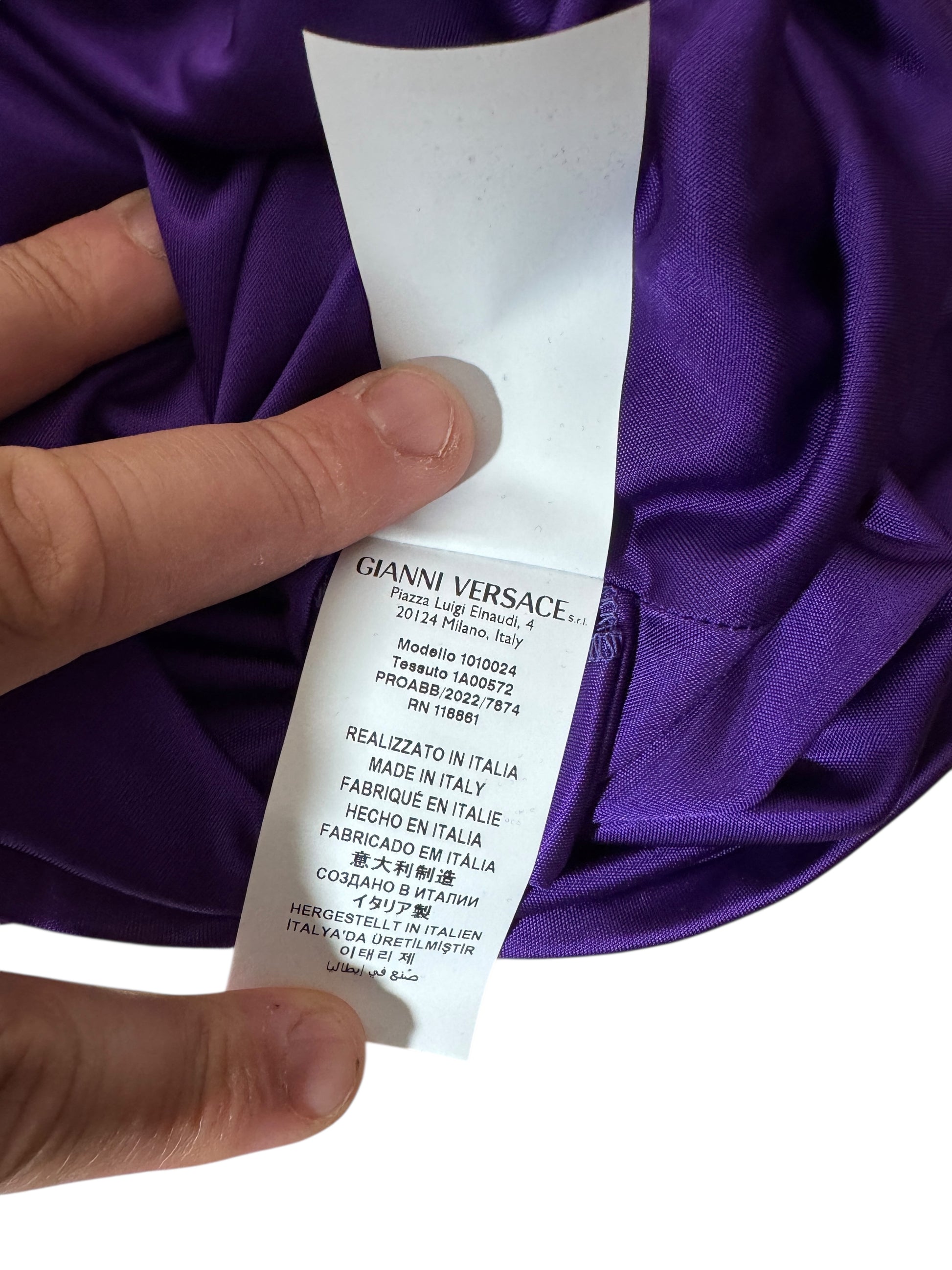 Top elegante da donna firmato Versace, realizzato in viscosa lucida con drappeggio morbido e profondo scollo frontale. Colore viola intenso, vestibilità fluida e sensuale, chiusura con zip posteriore invisibile. Nuovo con cartellino e tag NFC per la verifica autenticità.