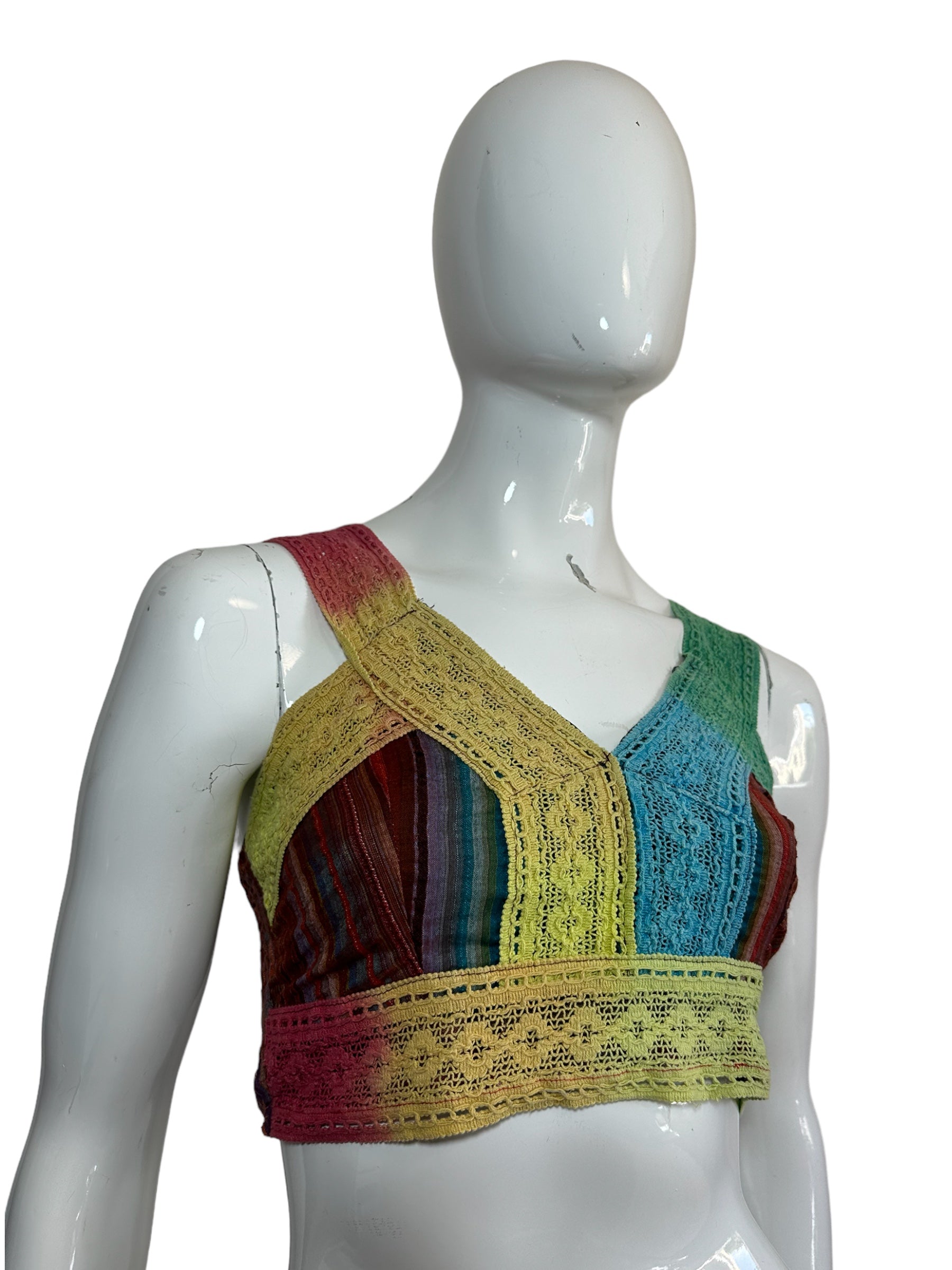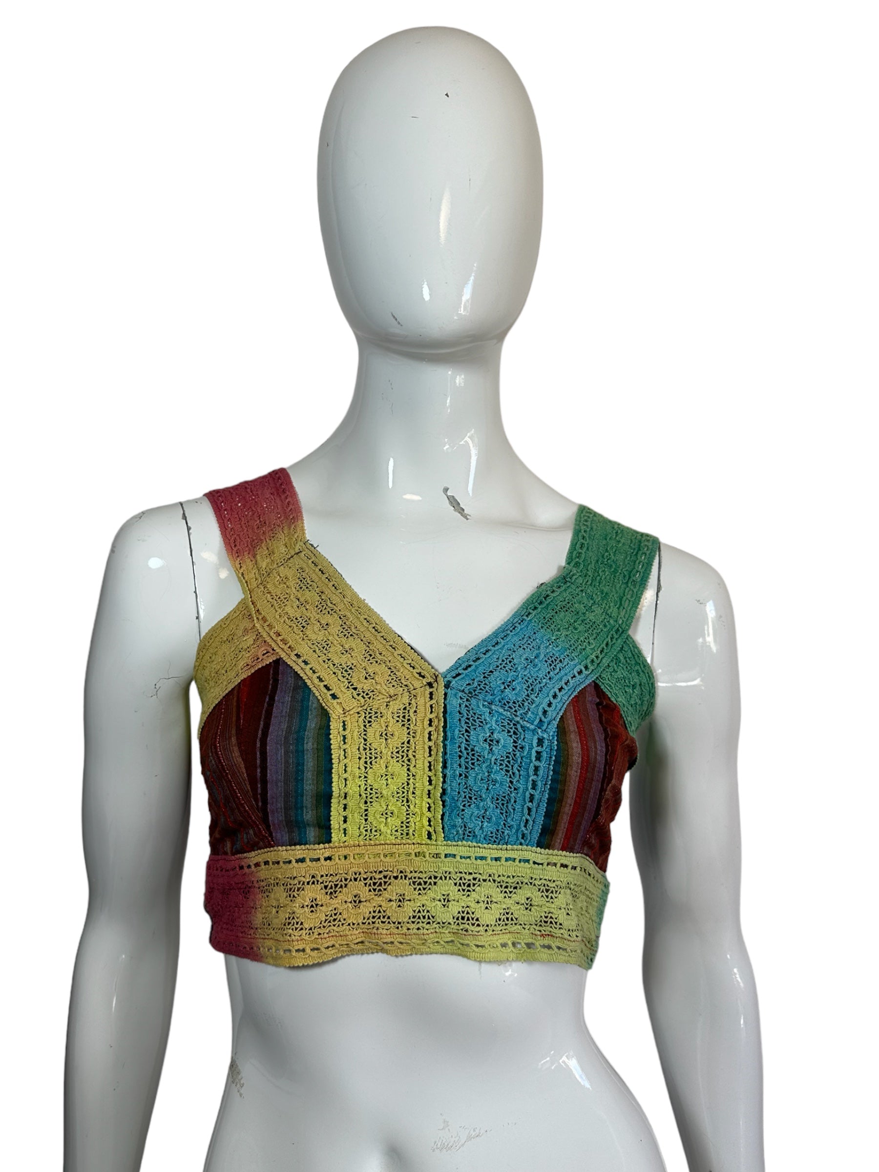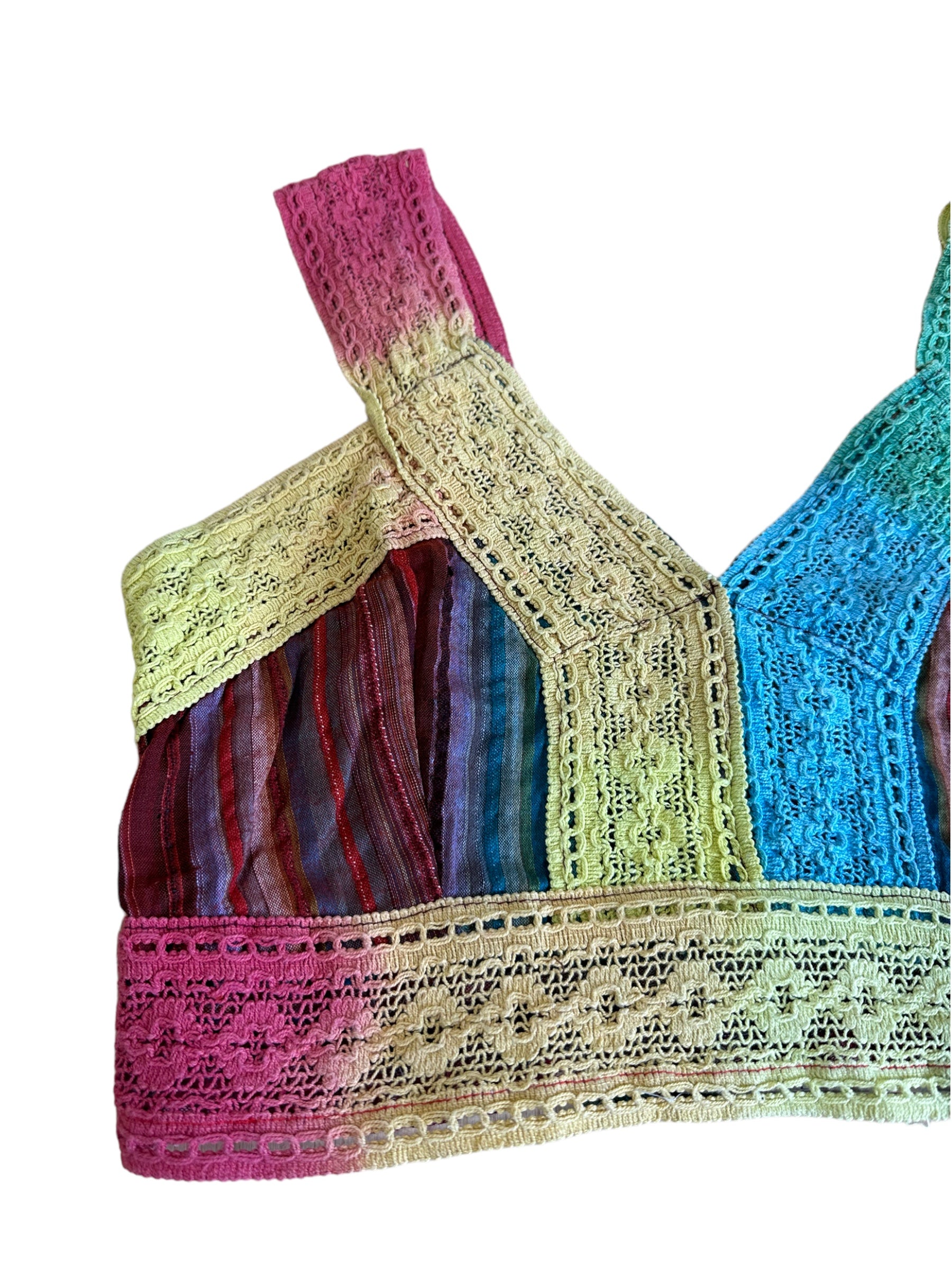 Top etnico vintage in cotone multicolore con spalline larghe e profilo superiore lavorato. Parte posteriore elasticizzata. Tg. S