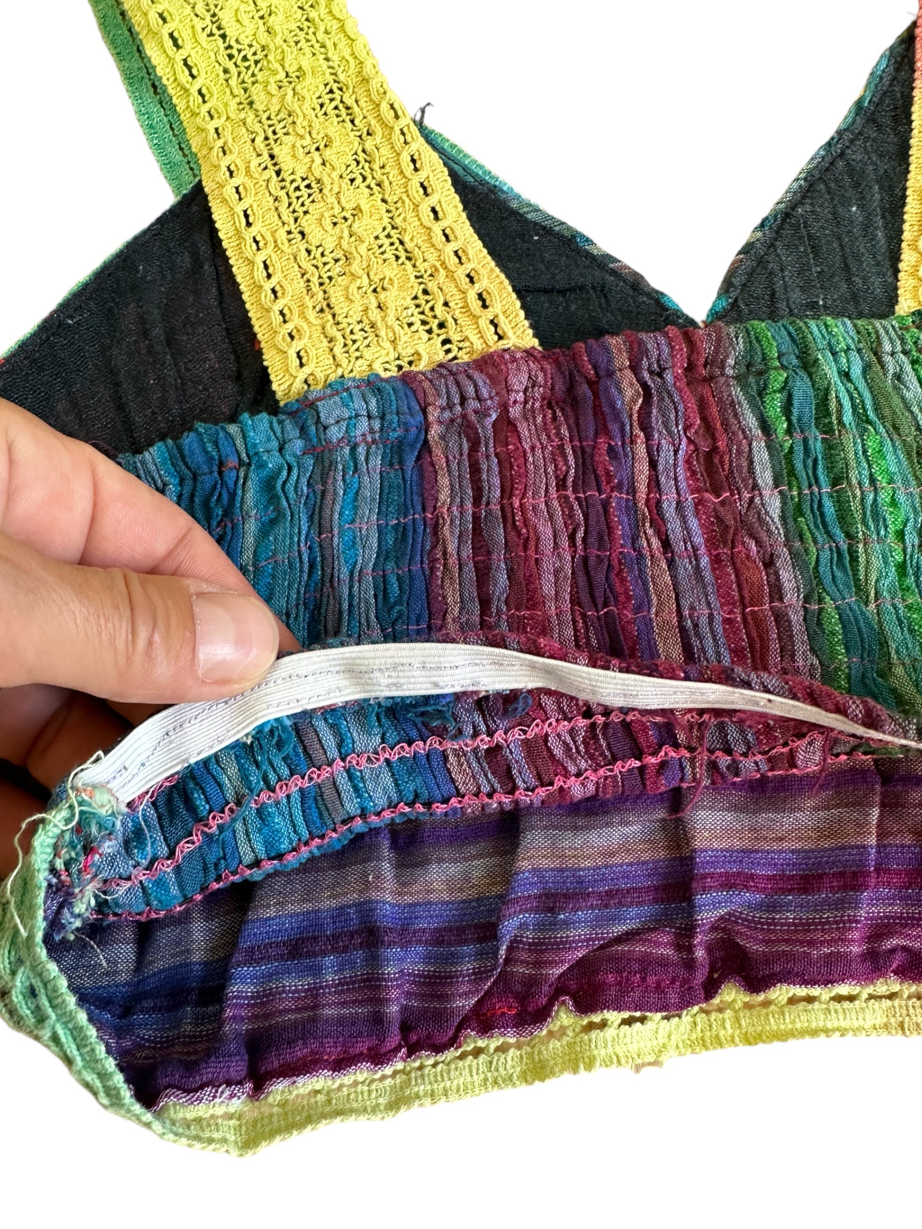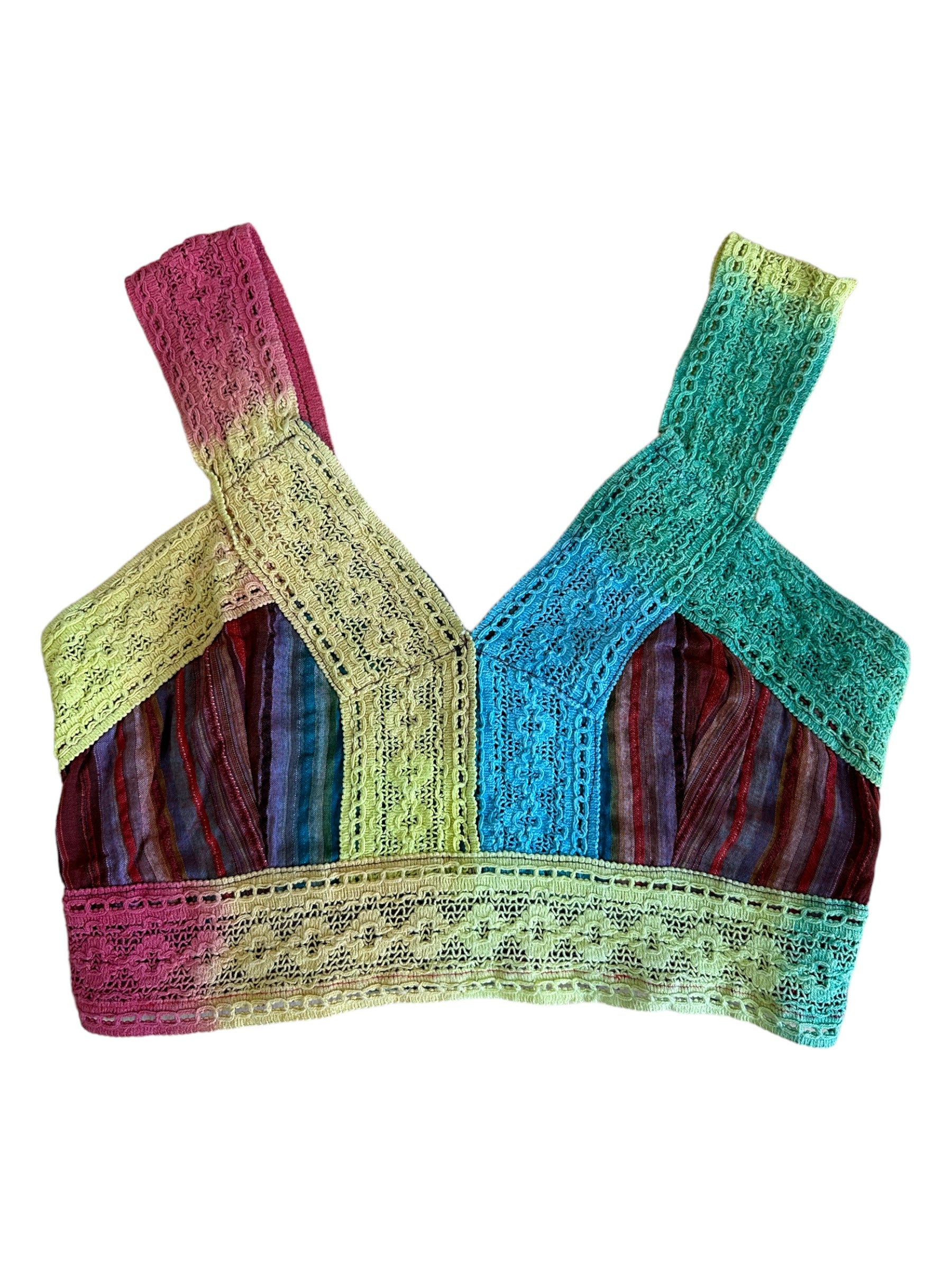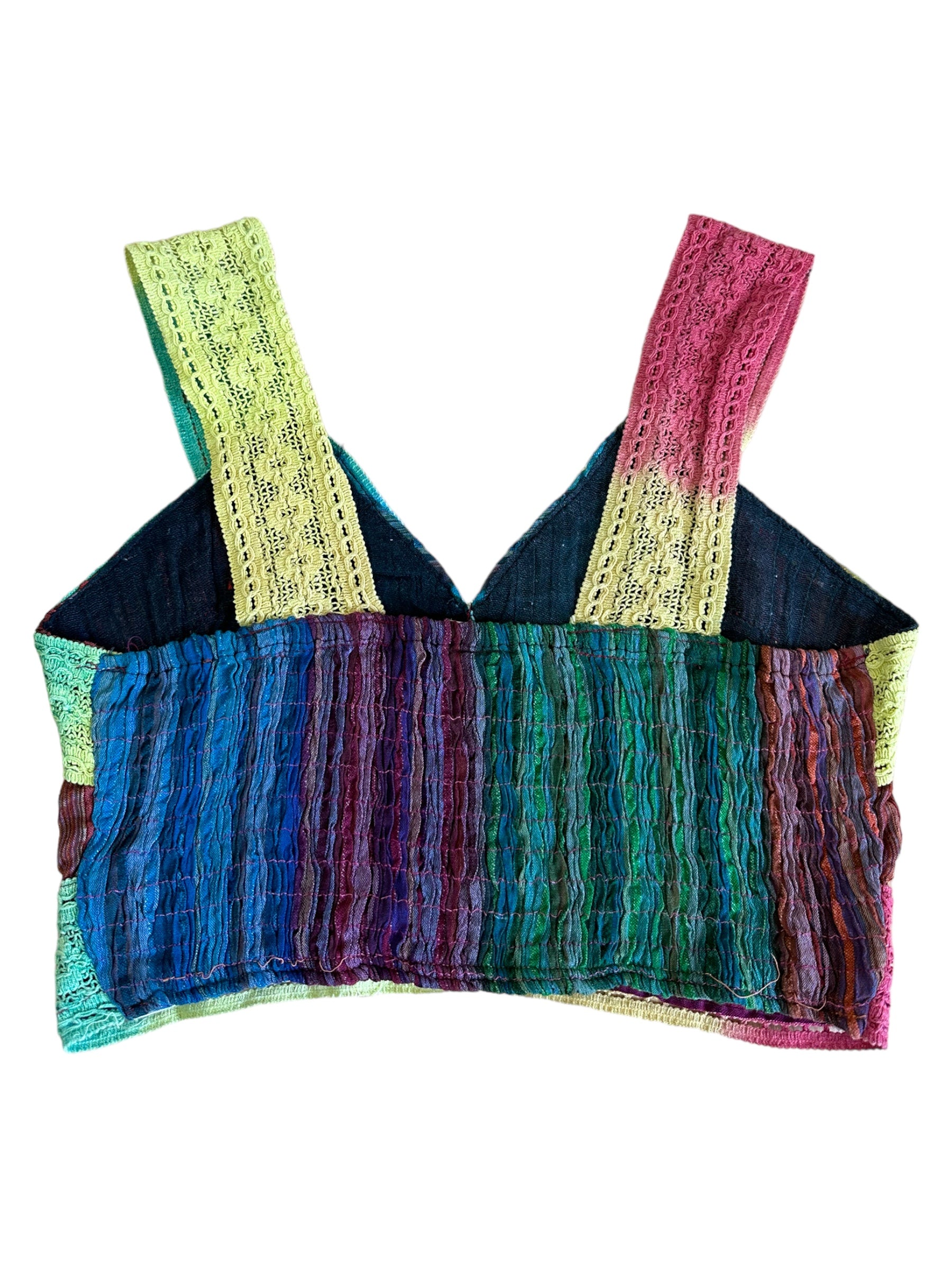 Top etnico vintage in cotone multicolore con spalline larghe e profilo superiore lavorato. Parte posteriore elasticizzata. Tg. S