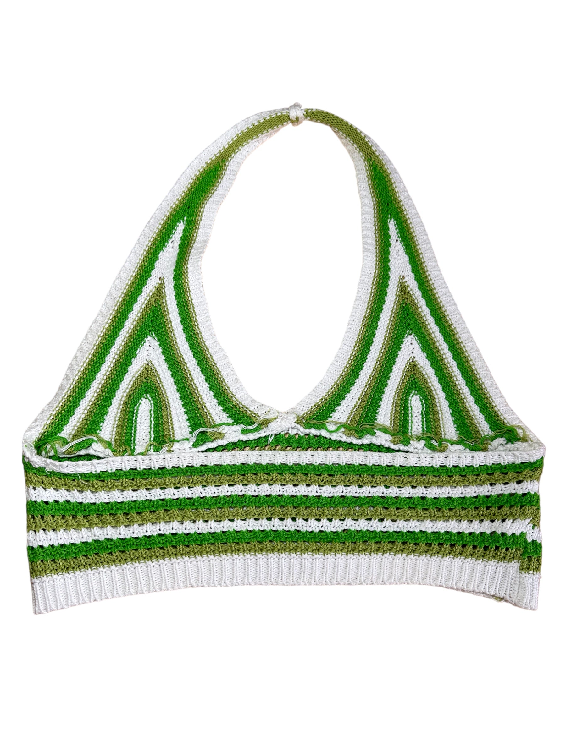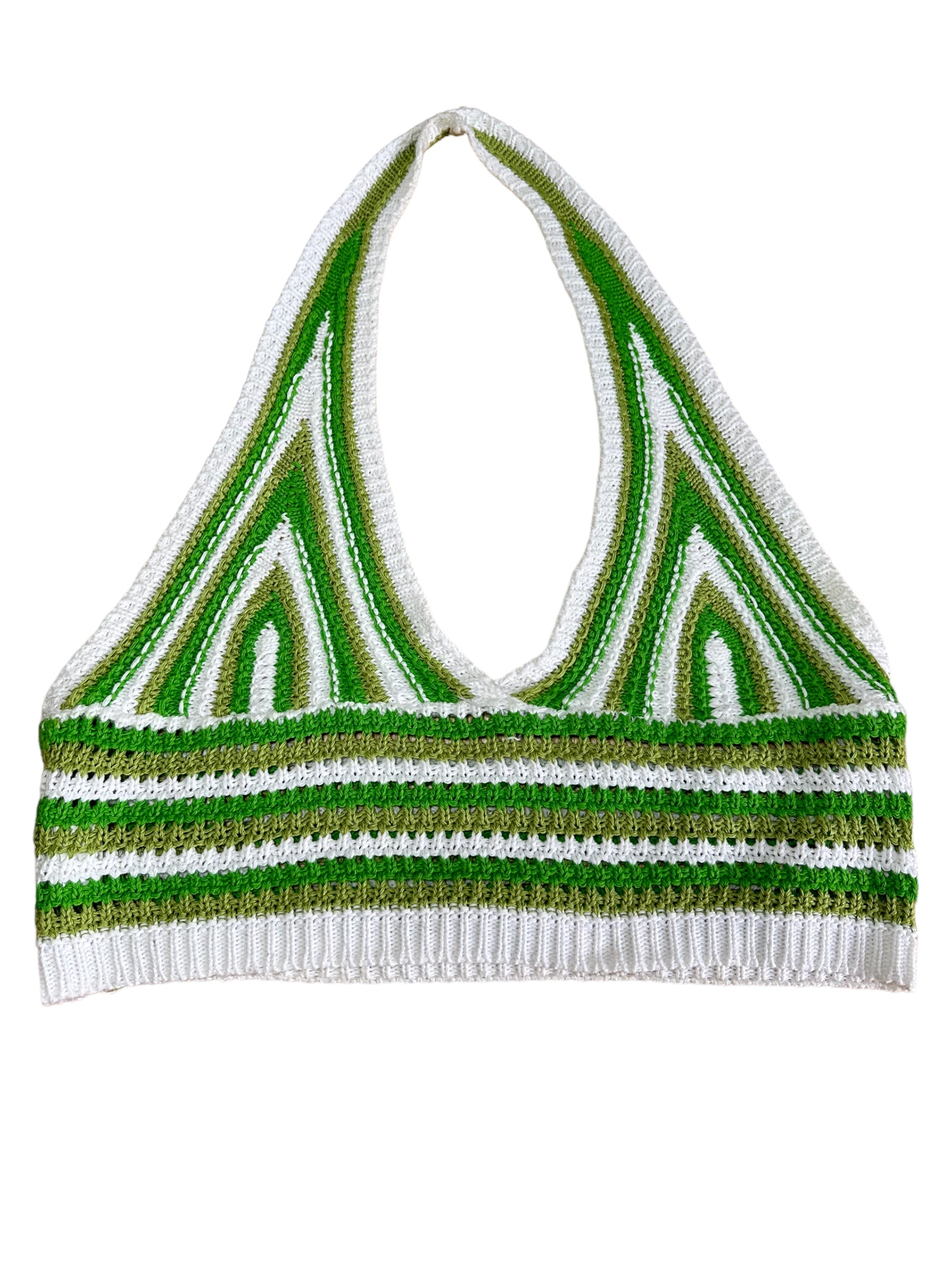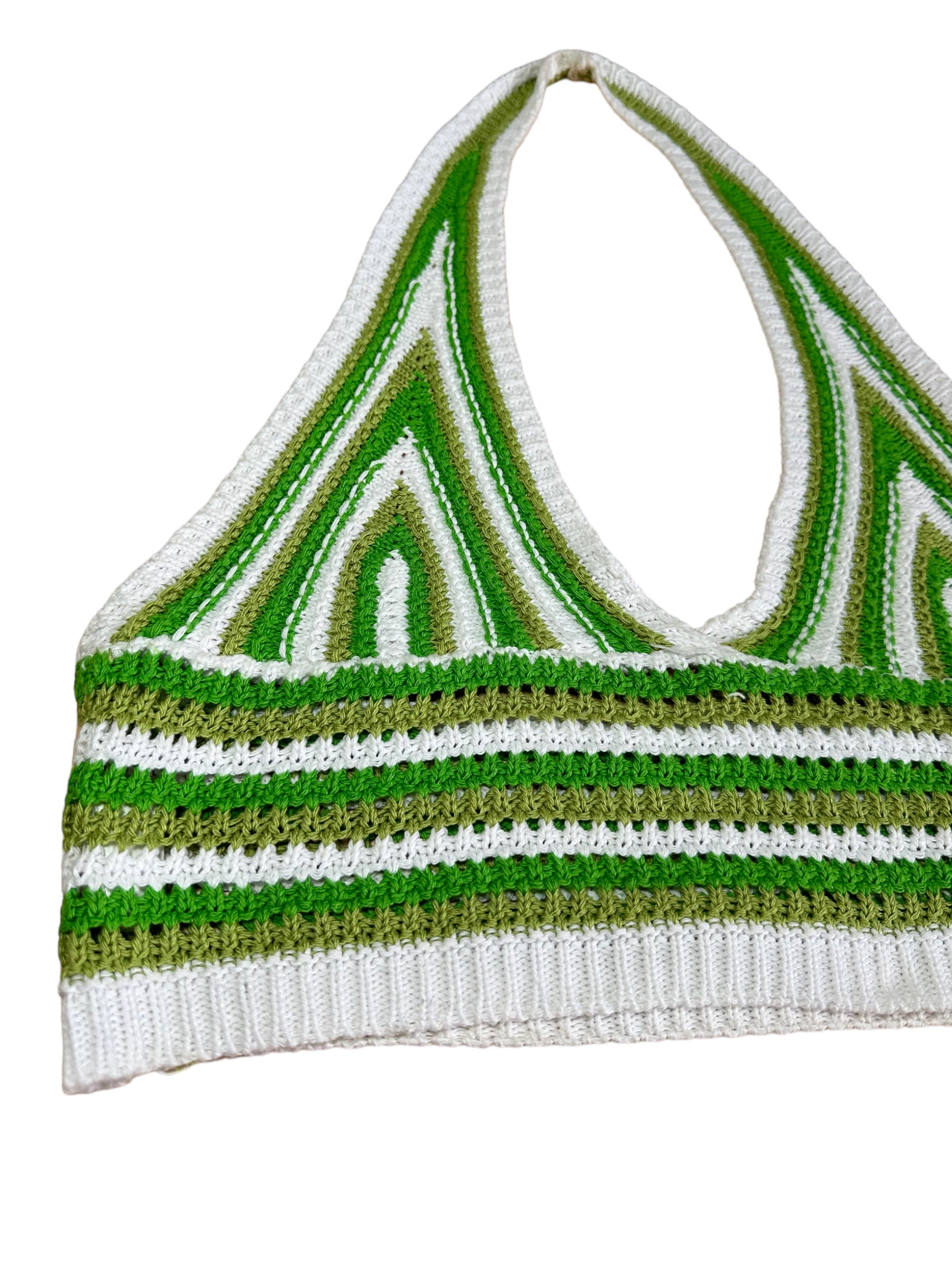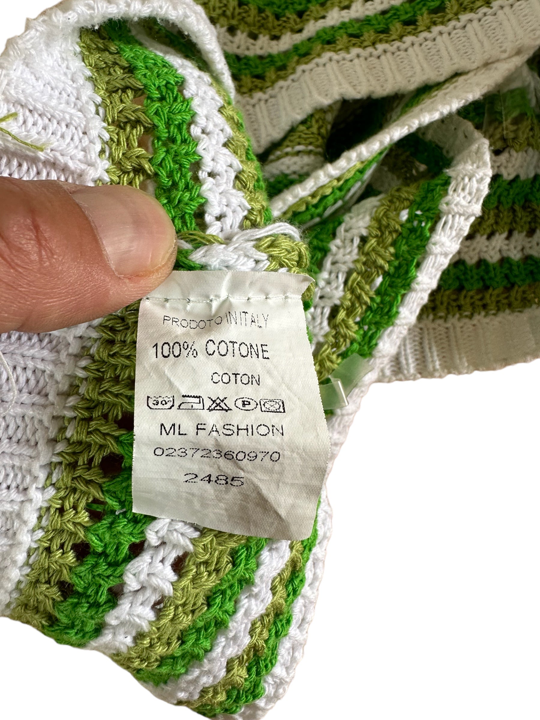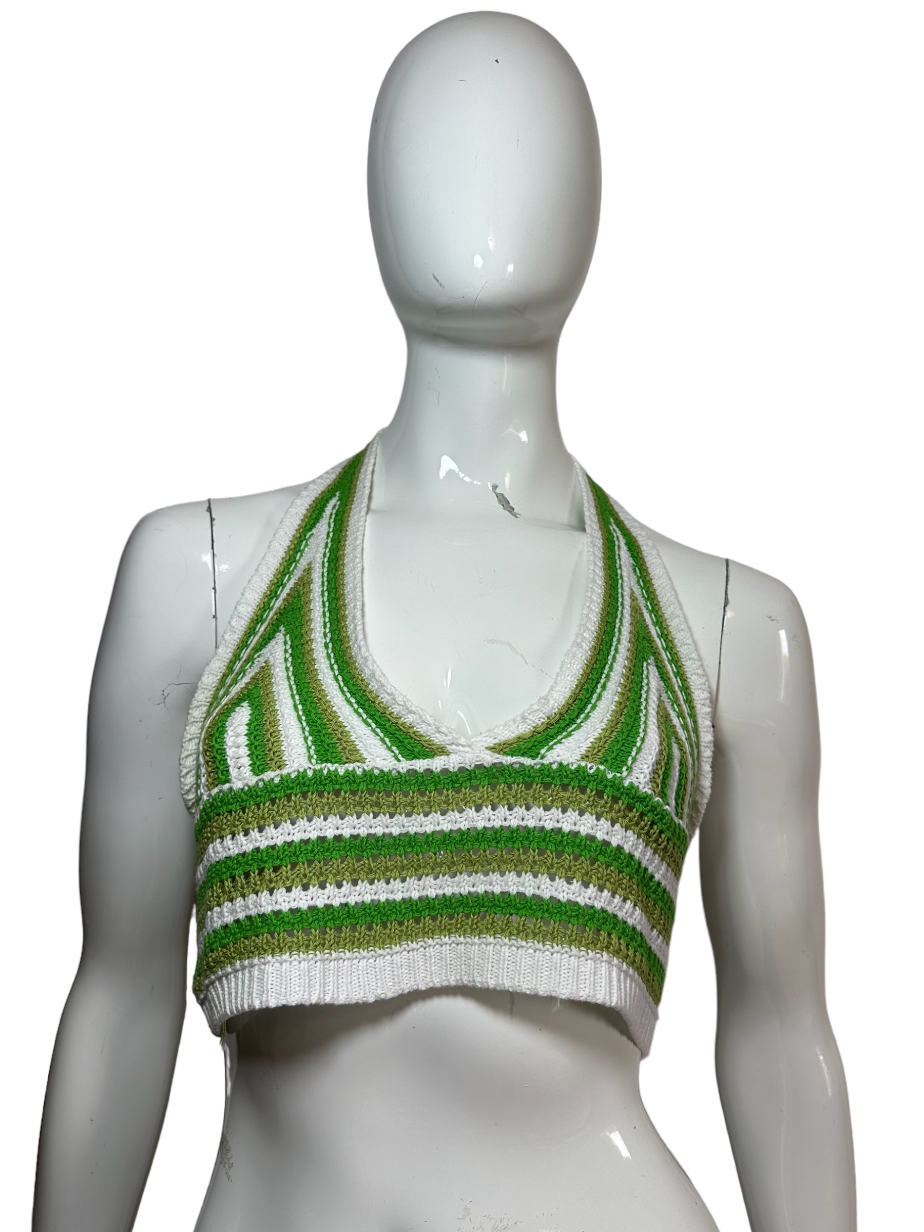 Top vintage lavorato a crochet in cotone verde a bianco con nodo attorno al collo. Tg. S