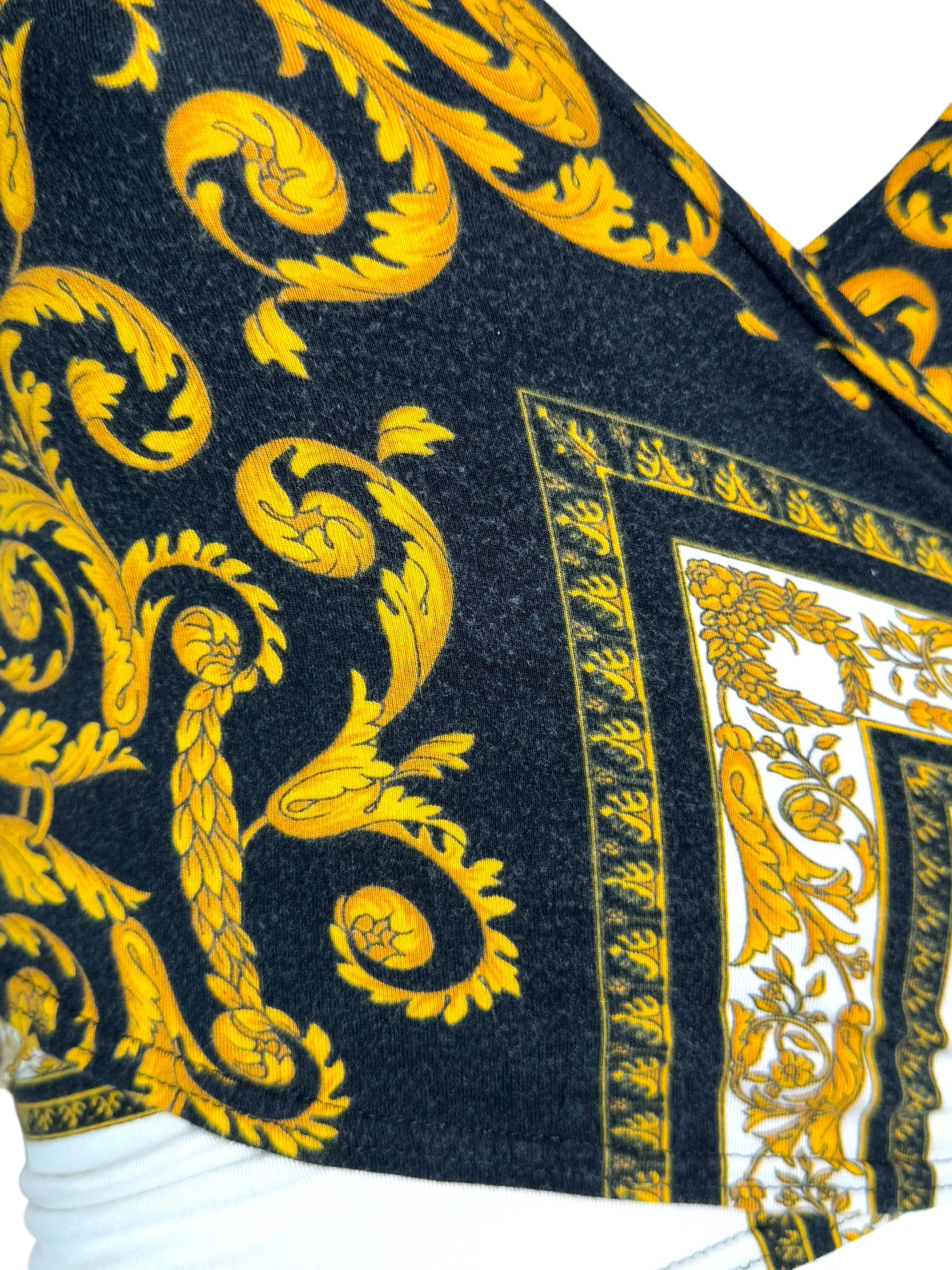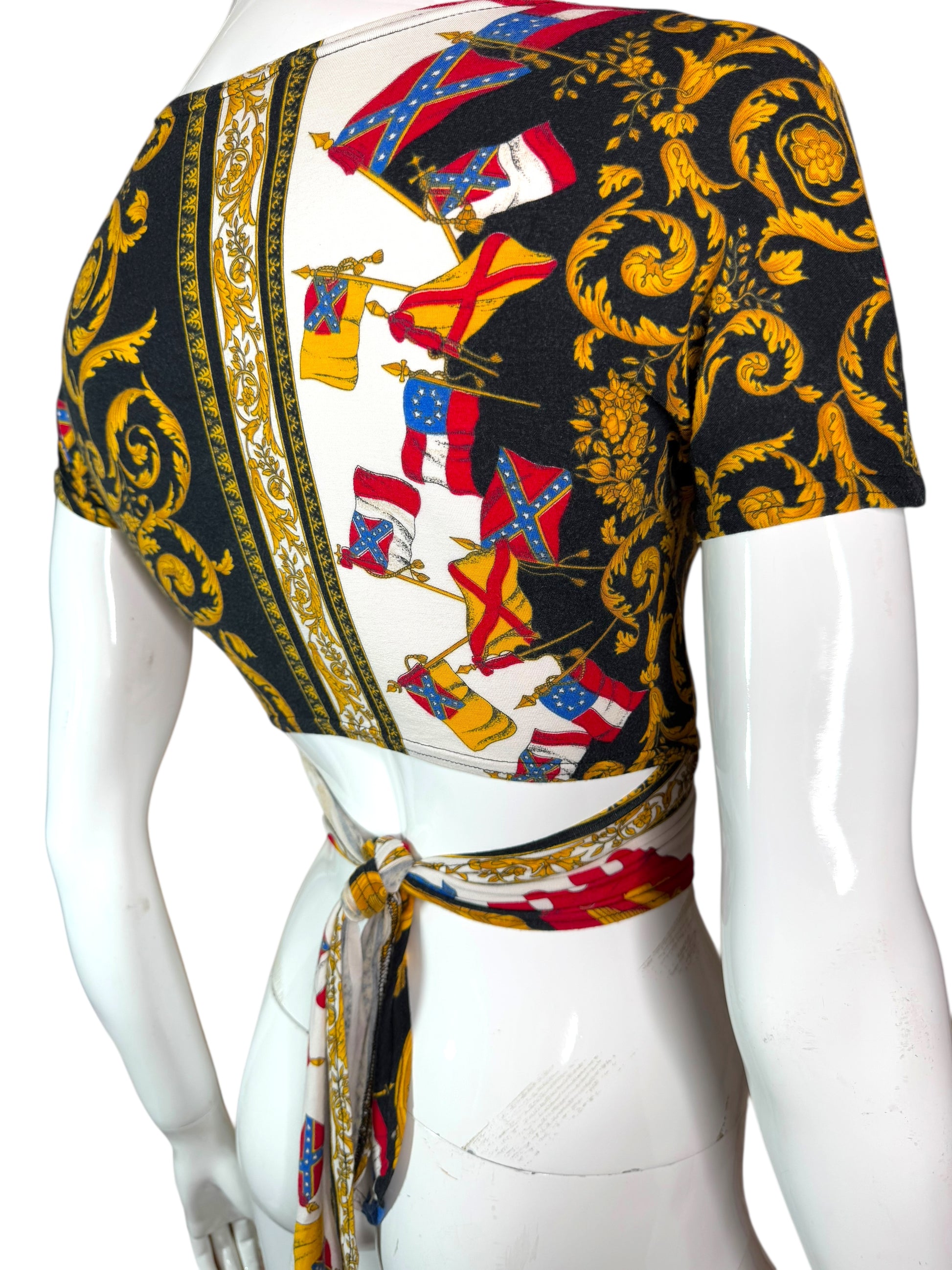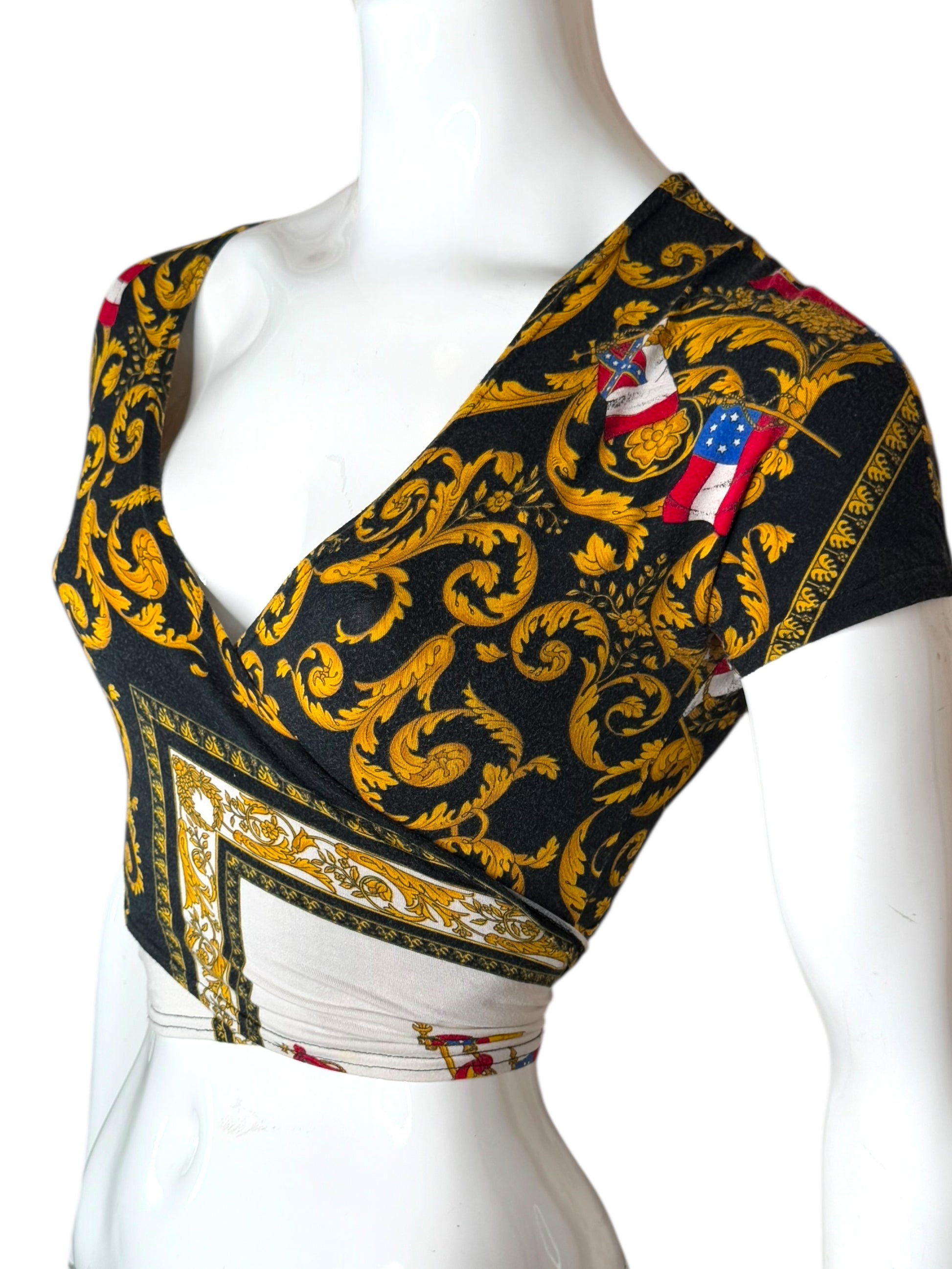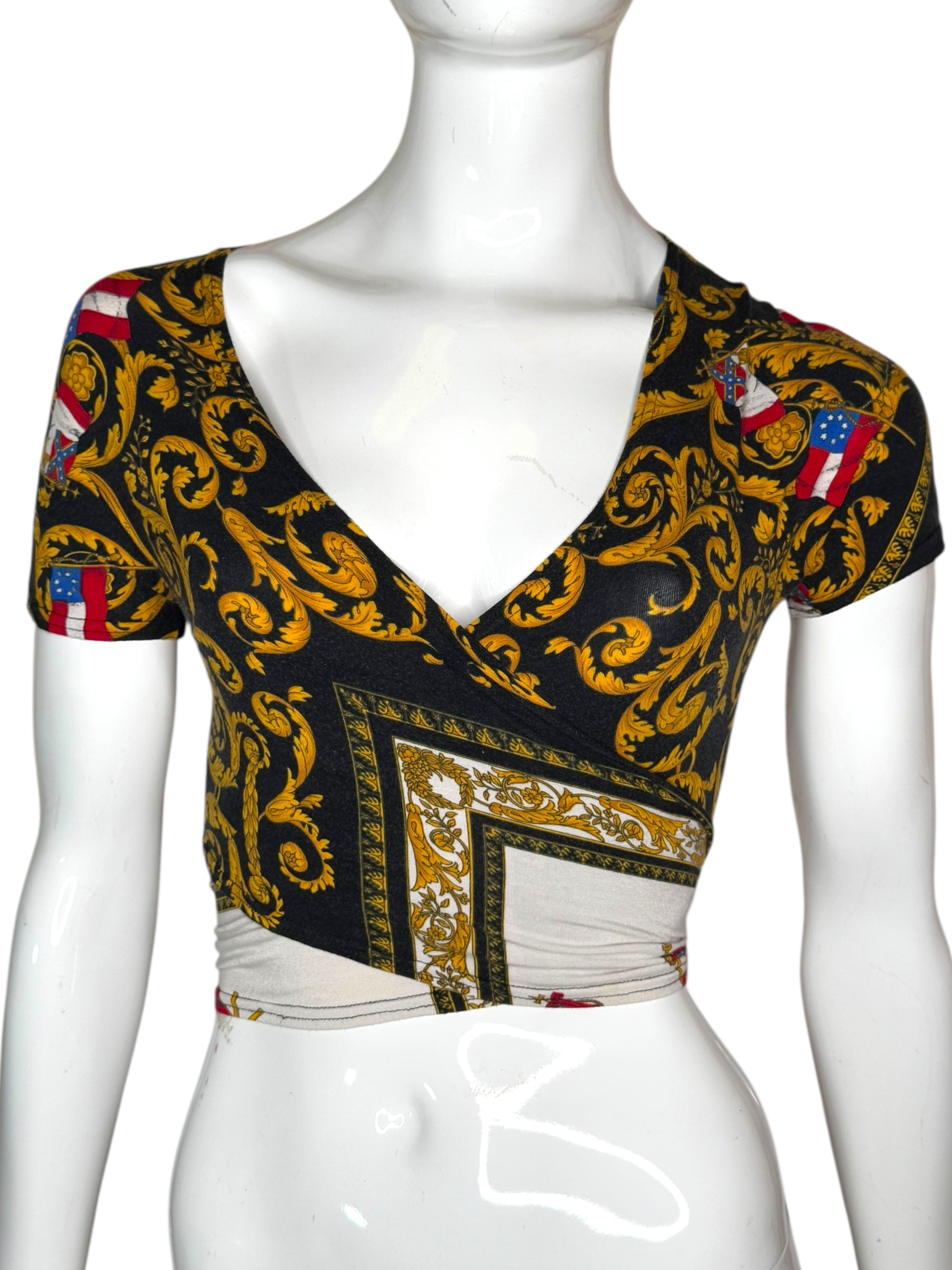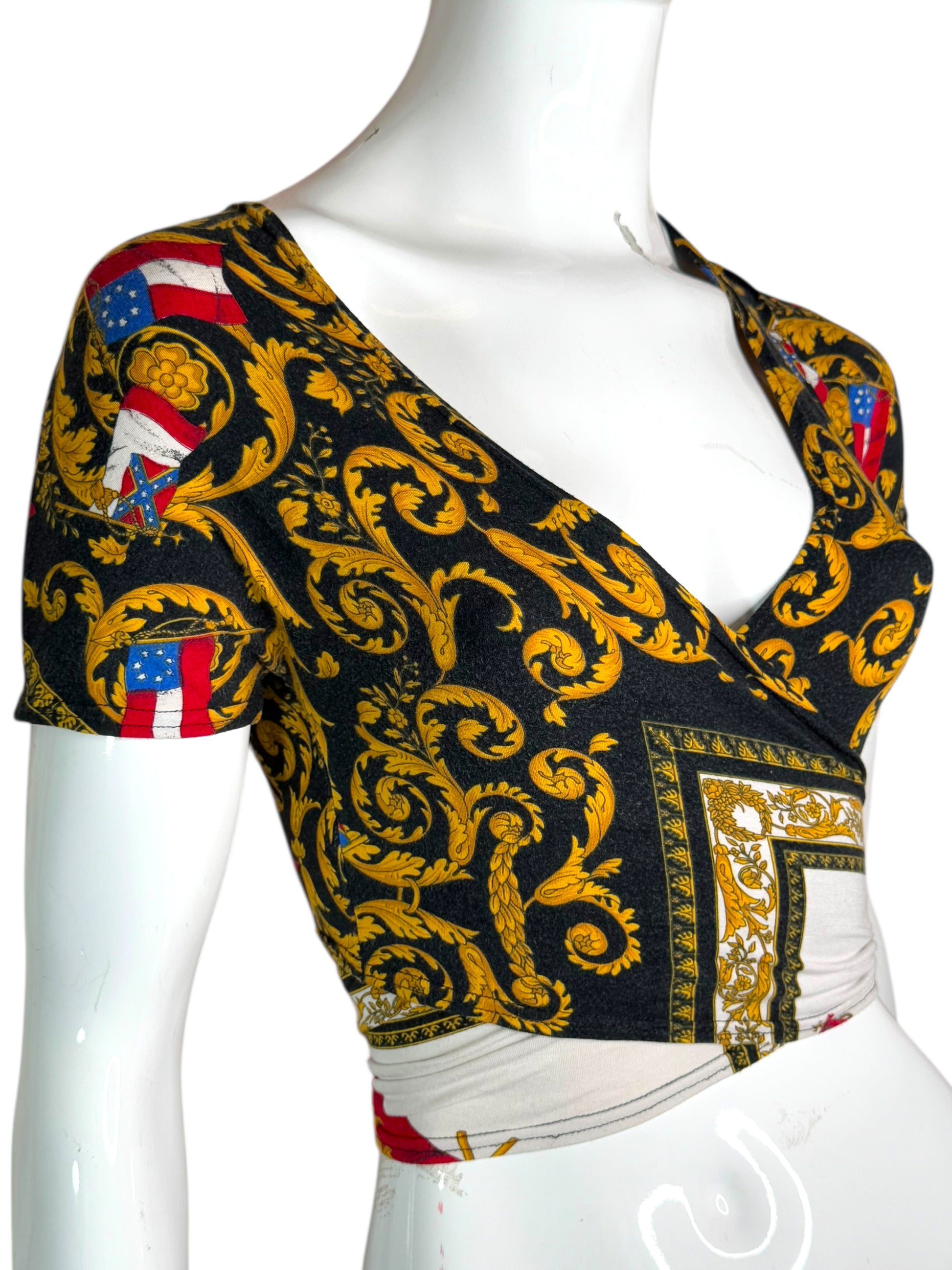 Top vintage originale VERSUS Gianni Versace, anni ’90. Modello corto con profonda scollatura a V, incrocio sul davanti e laccio da annodare sul retro. Stampa barocca con inserti di bandiere USA in stile patchwork, tipico dell’estetica audace del brand.