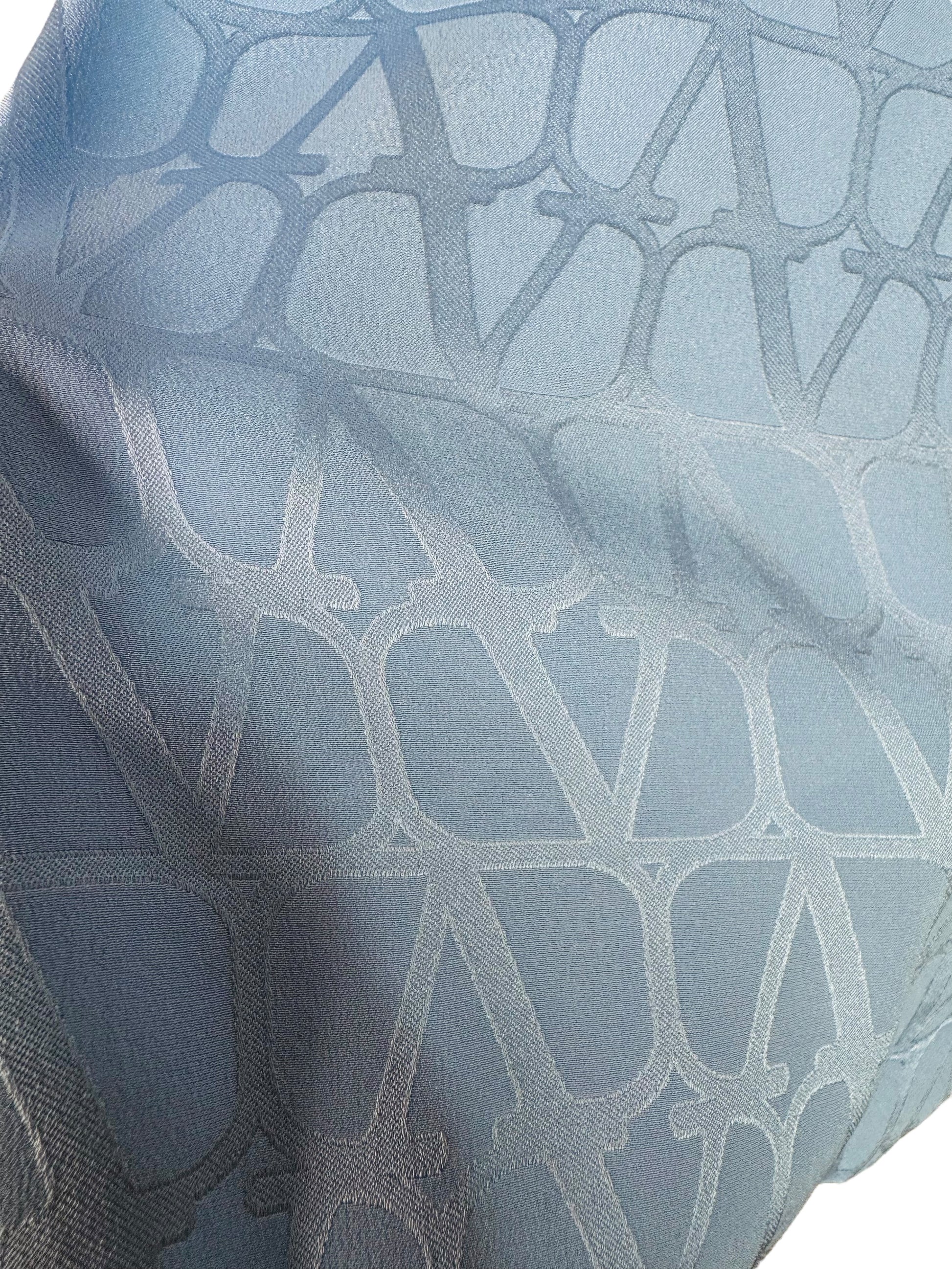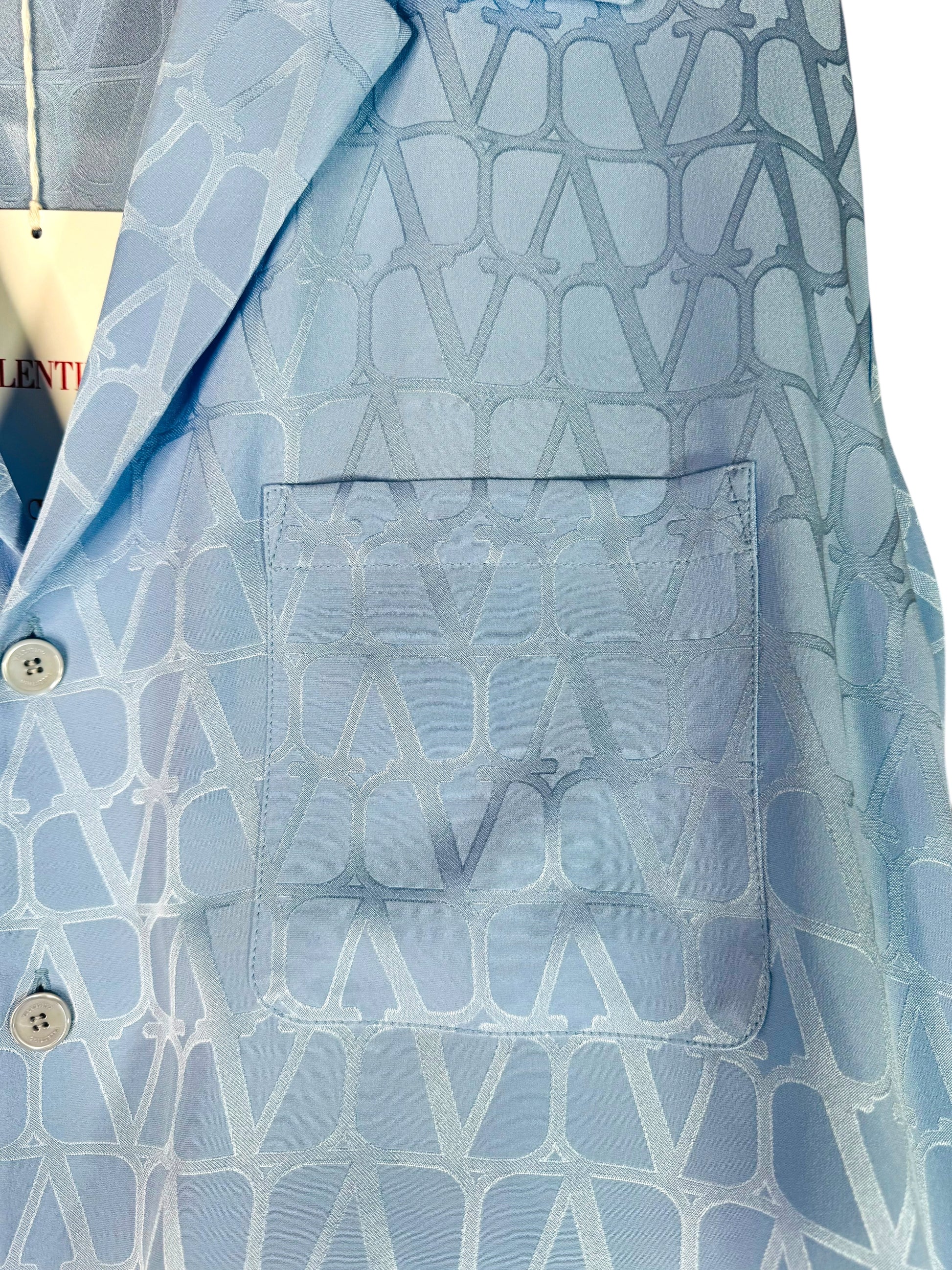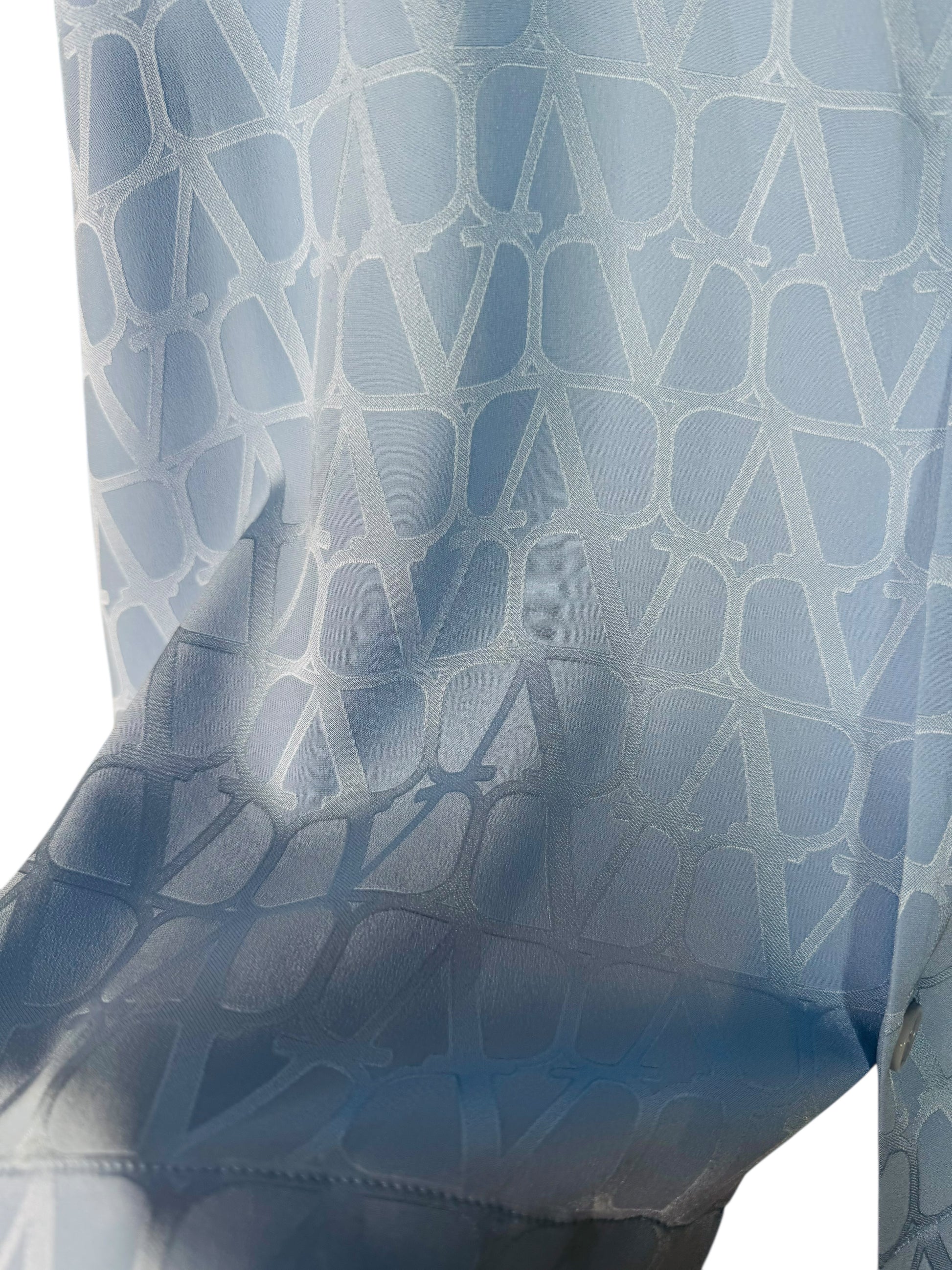 Camicia Valentino in pura seta, nuova con cartellino, della collezione attuale. Colore azzurro con monogramma V in jacquard tono su tono, colletto aperto e bottoni logati. Realizzata in Italia con tessuto di altissima qualità.