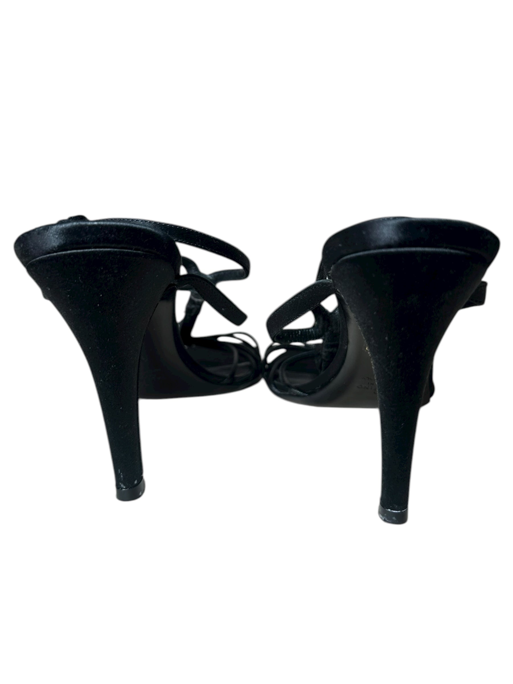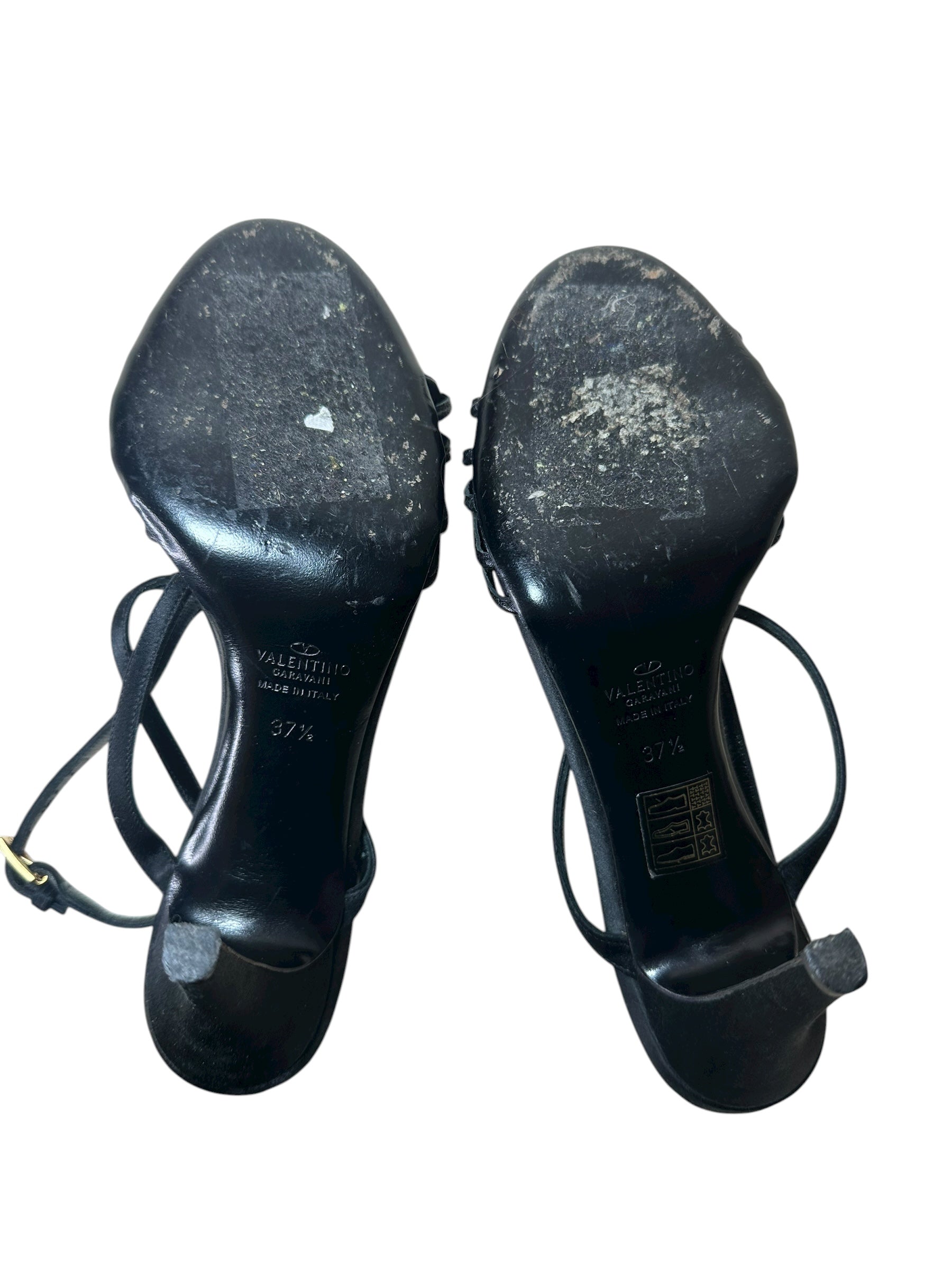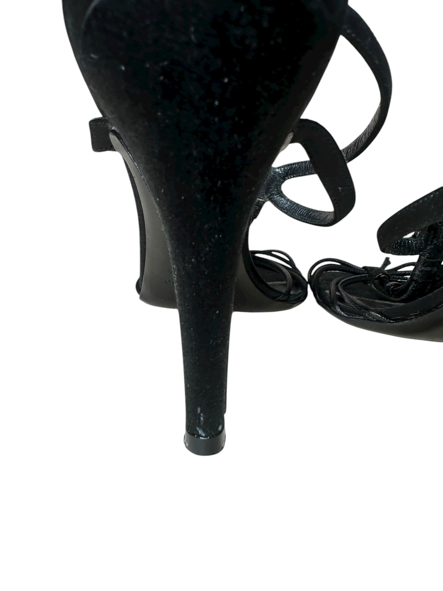 Eleganti sandali Valentino Garavani realizzati in raso nero con inserti in pelle, impreziositi da sottili listini intrecciati e applicazione floreale frontale tono su tono. La silhouette femminile e raffinata è completata da un tacco a stiletto di circa 10 cm e da una chiusura con cinturino regolabile alla caviglia con fibbia dorata.