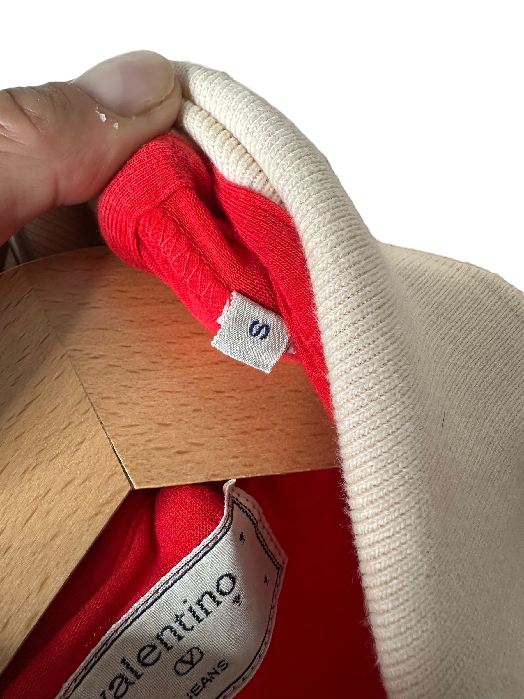 All’altezza del punto vita, in corrispondenza della fine della fila di bottoni, è ricamato il logo Valentino in bianco, tono su tono con gli inserti sulle maniche.