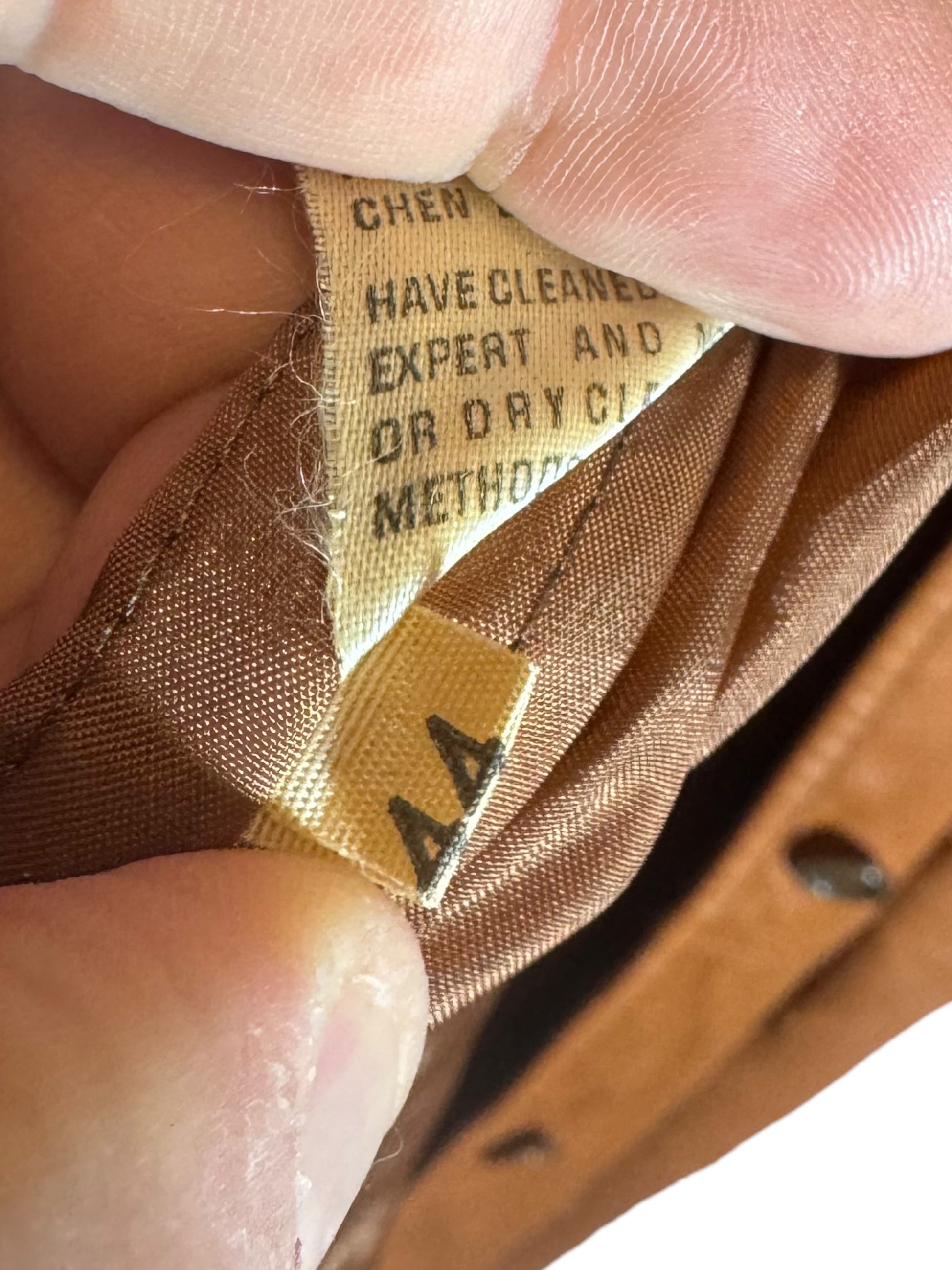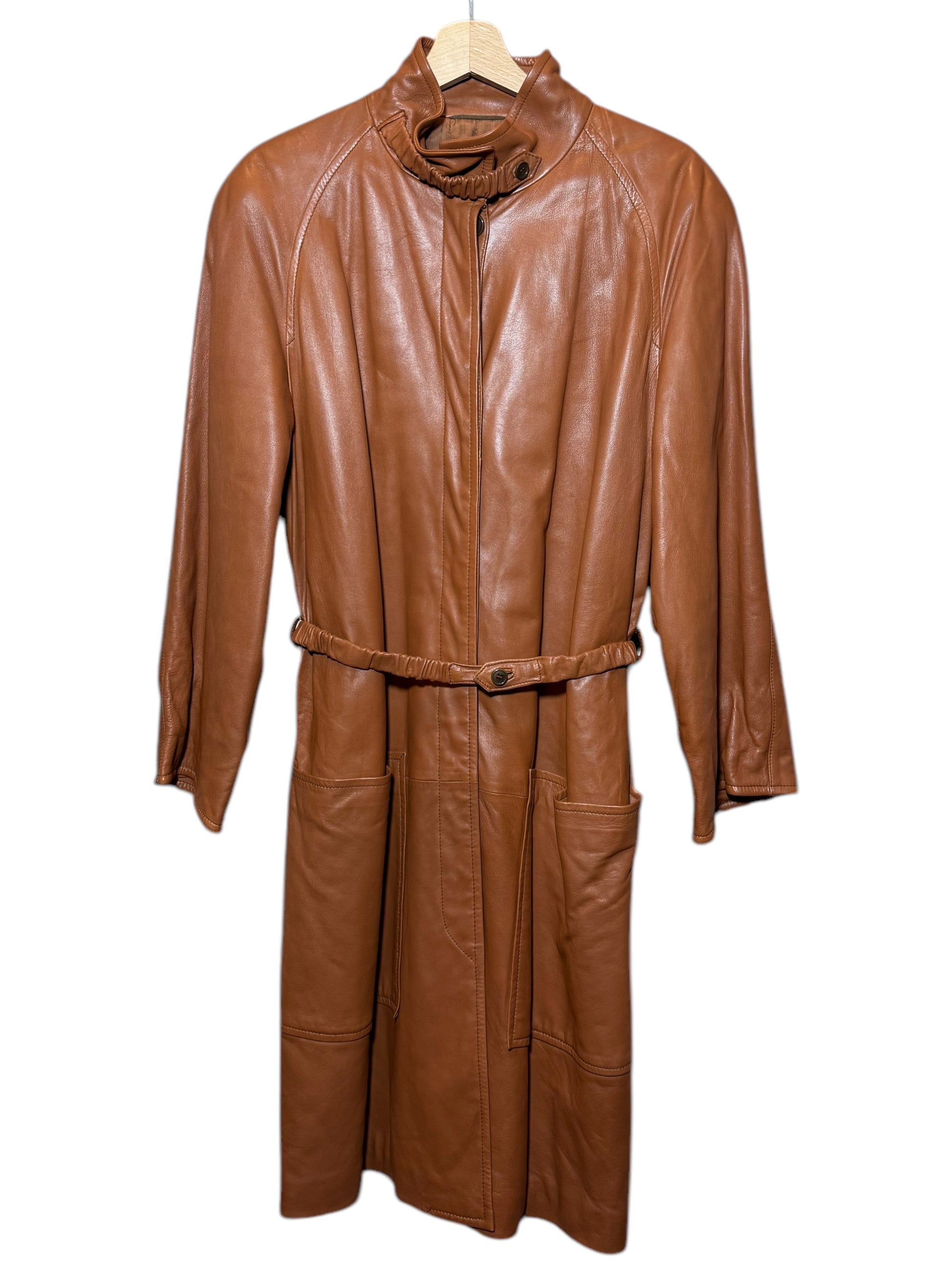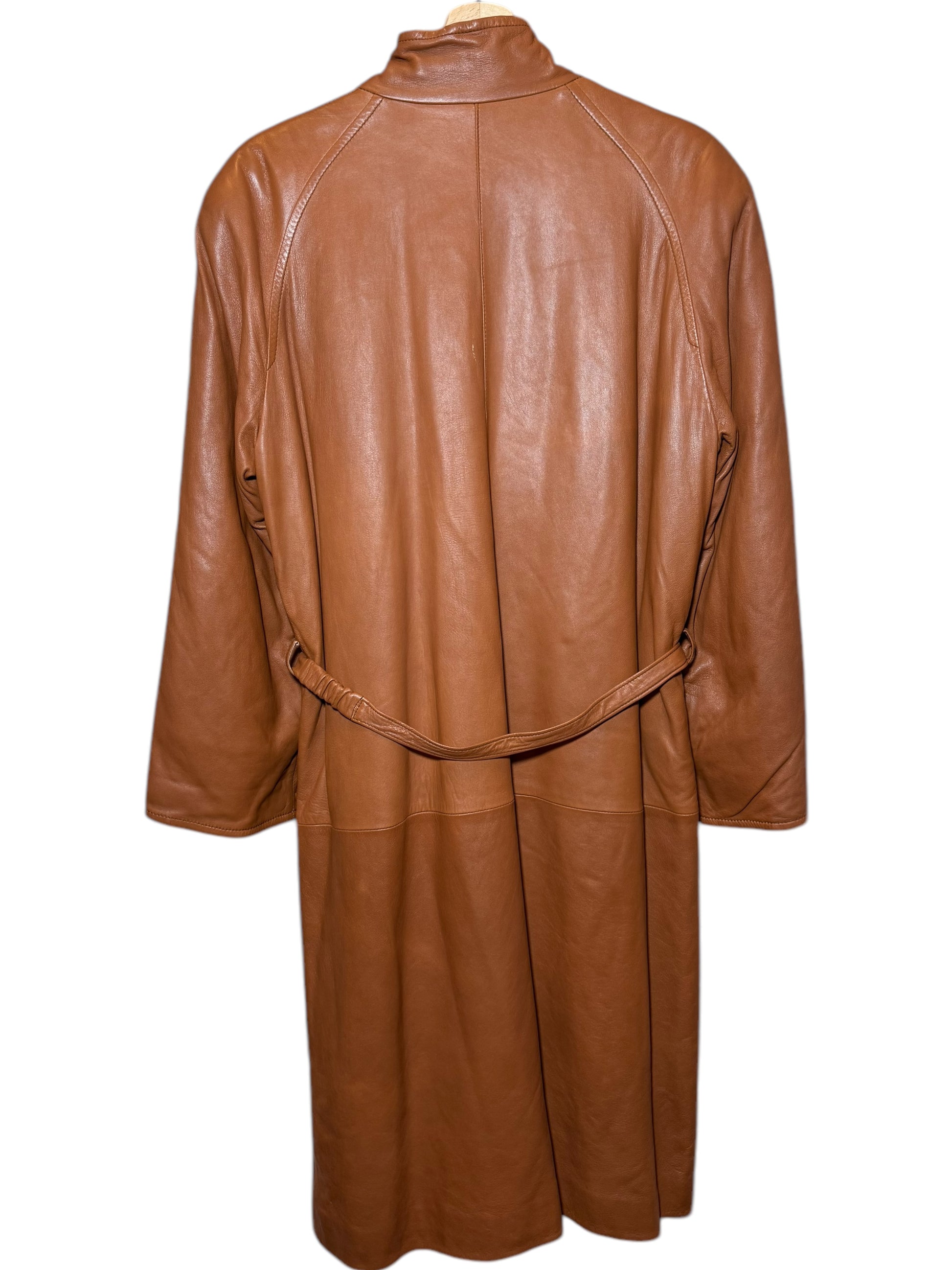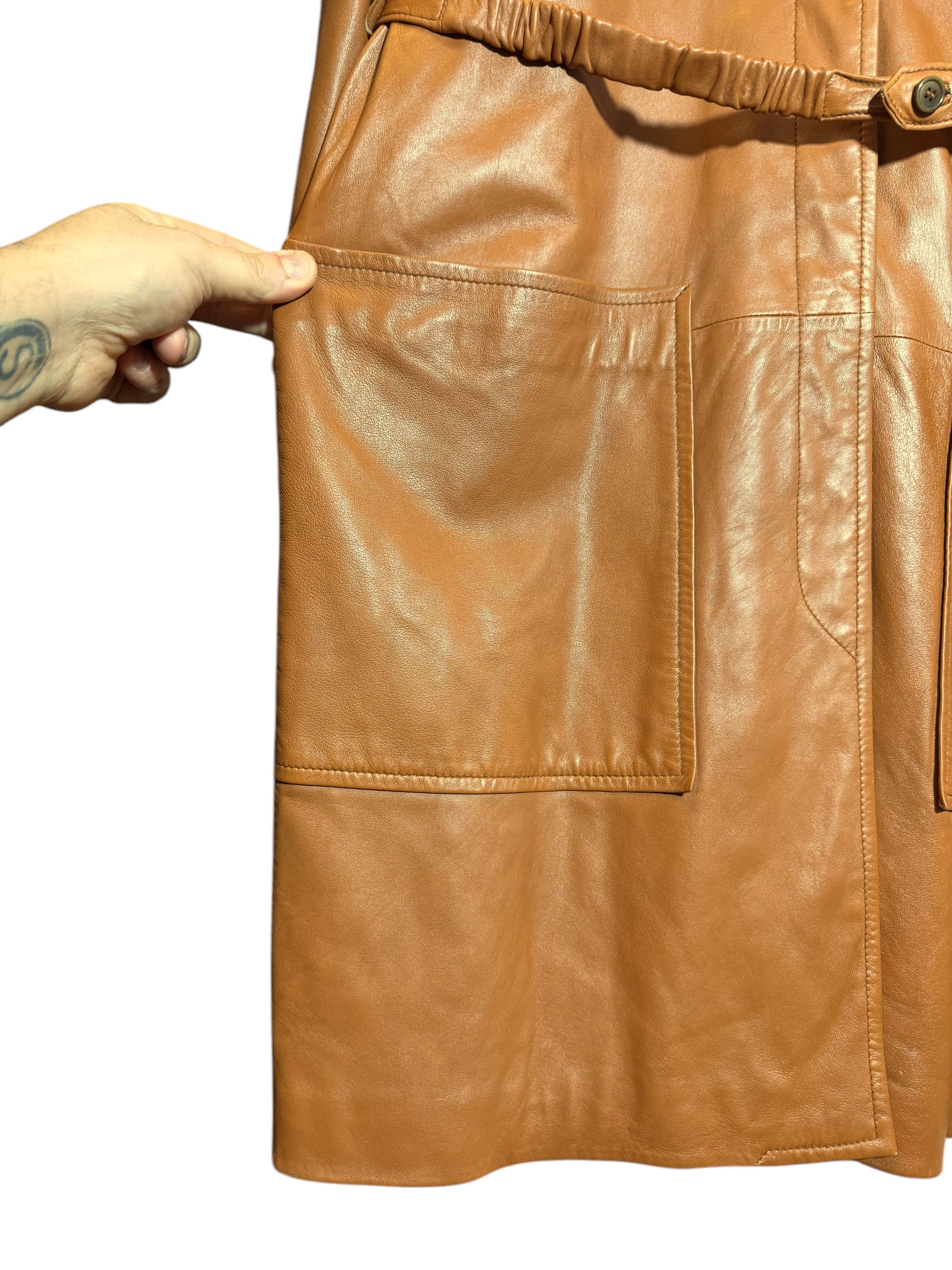Elegante cappotto lungo in pelle firmato Valentino Pelle, realizzato artigianalmente in Italia. Il capo presenta un design raffinato con chiusura frontale a bottoni nascosti, collo alto con cinturino arricciato, cintura regolabile con bottone singolo e ampie tasche frontali. L’interno è foderato con tessuto trapuntato che garantisce comfort e calore. Il colore marrone caramello aggiunge un tocco sofisticato, rendendolo un capo senza tempo. Piccola imperfezione sulla parte posteriore, come mostrato nelle immagini.