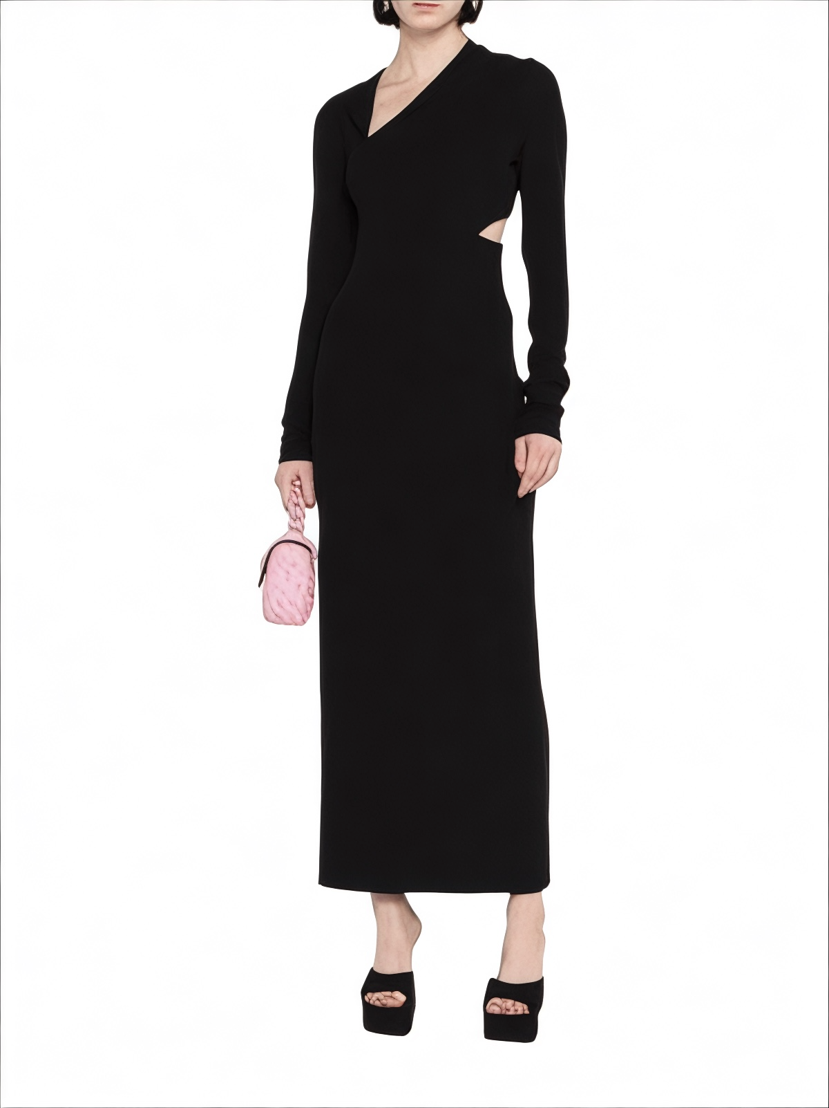 Elegante abito lungo firmato Versace, realizzato in Italia in viscosa di alta qualità. Il modello è caratterizzato da un design aderente e fluido, con cappuccio drappeggiato, maniche lunghe e uno spacco laterale sulla gamba per un tocco sensuale. Il dettaglio cut-out asimmetrico sul fianco aggiunge una nota audace e moderna. Un capo perfetto per eventi serali, gala e red carpet.