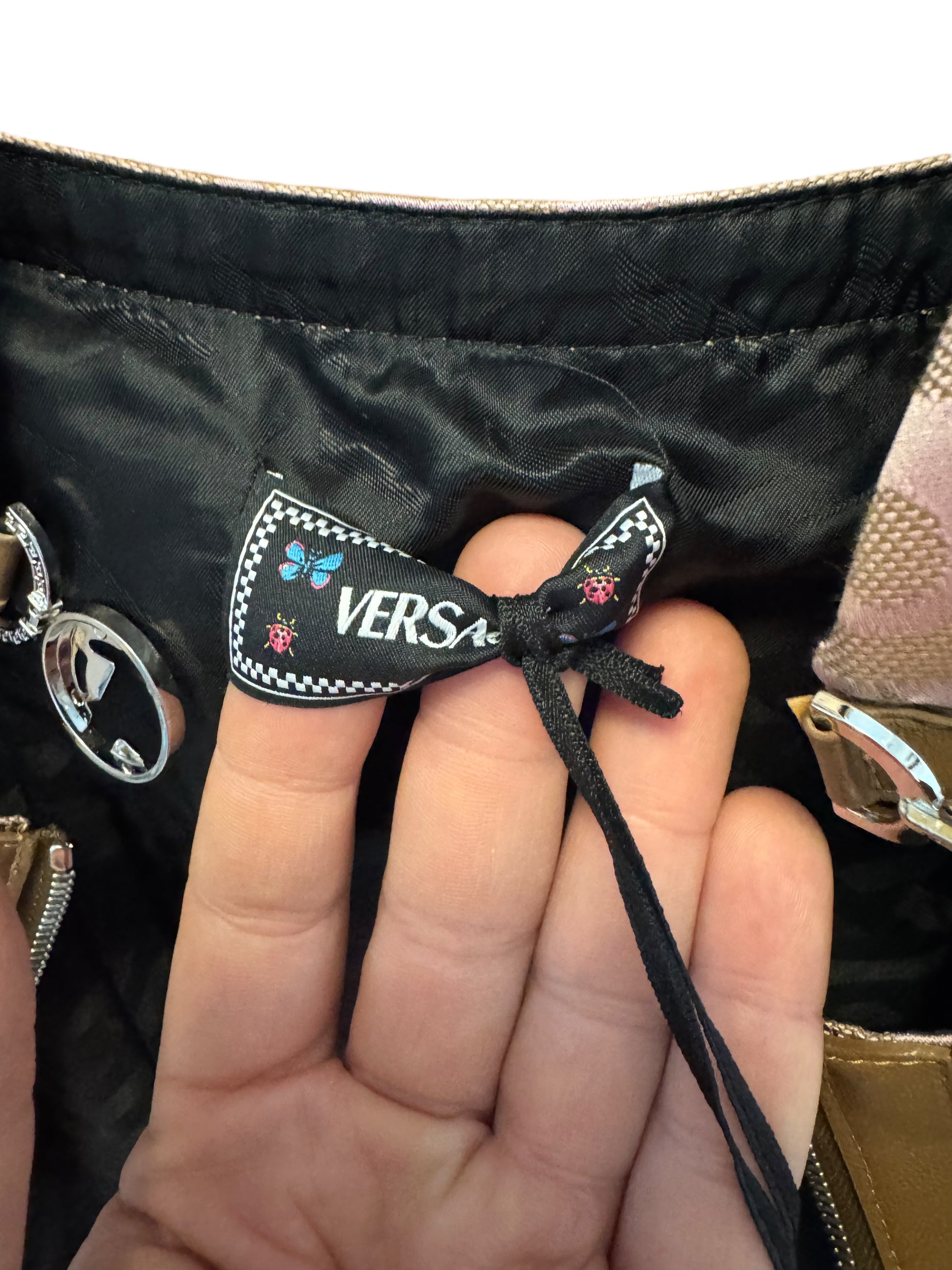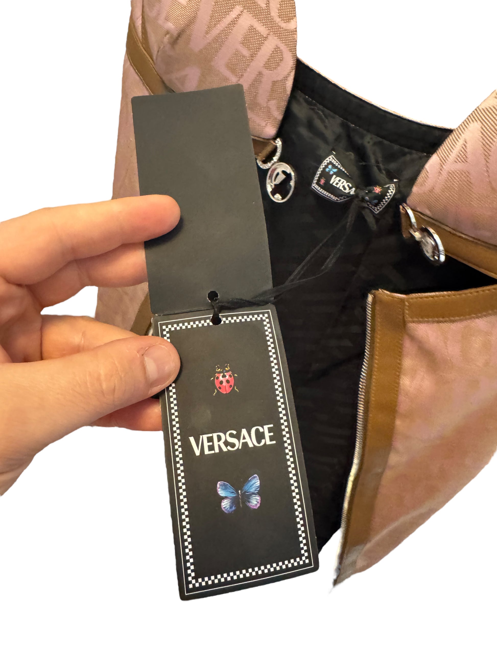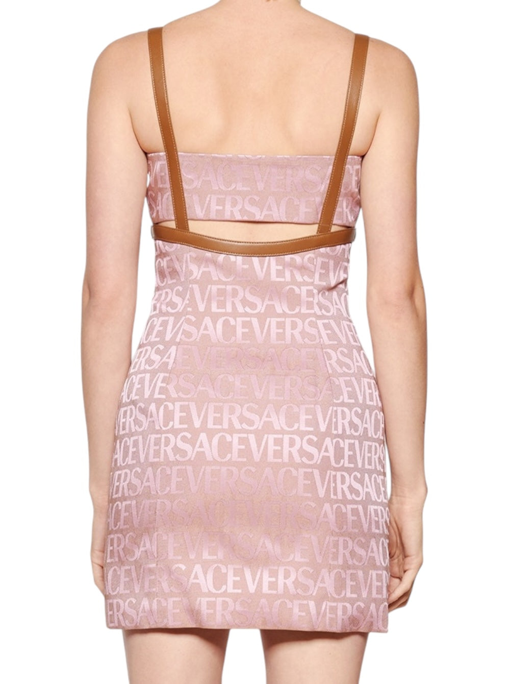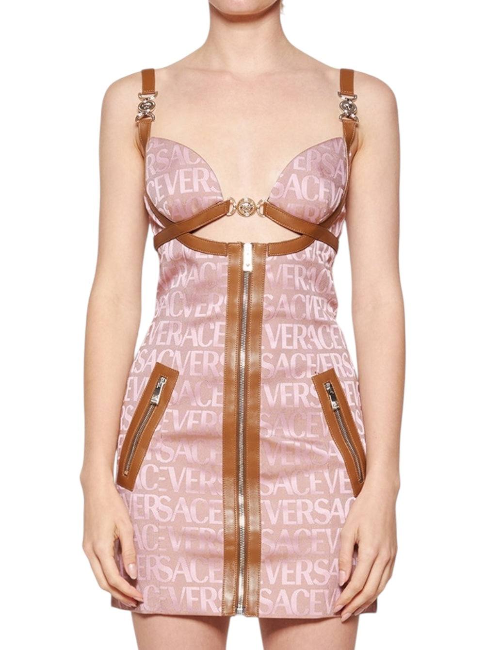 Abito mini di lusso firmato Versace, realizzato in tessuto logato rosa con dettagli in pelle color cuoio. Il design presenta una silhouette aderente con coppe strutturate, spalline regolabili con iconiche placche Medusa in metallo argentato e zip frontale a doppio cursore. Tasche con chiusura a zip e dettagli in pelle completano l’estetica audace e raffinata del capo.
