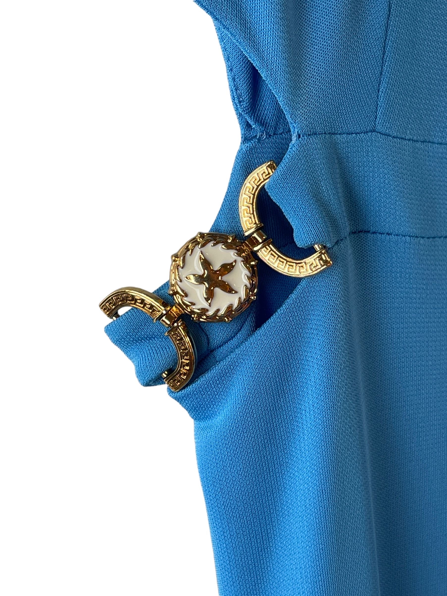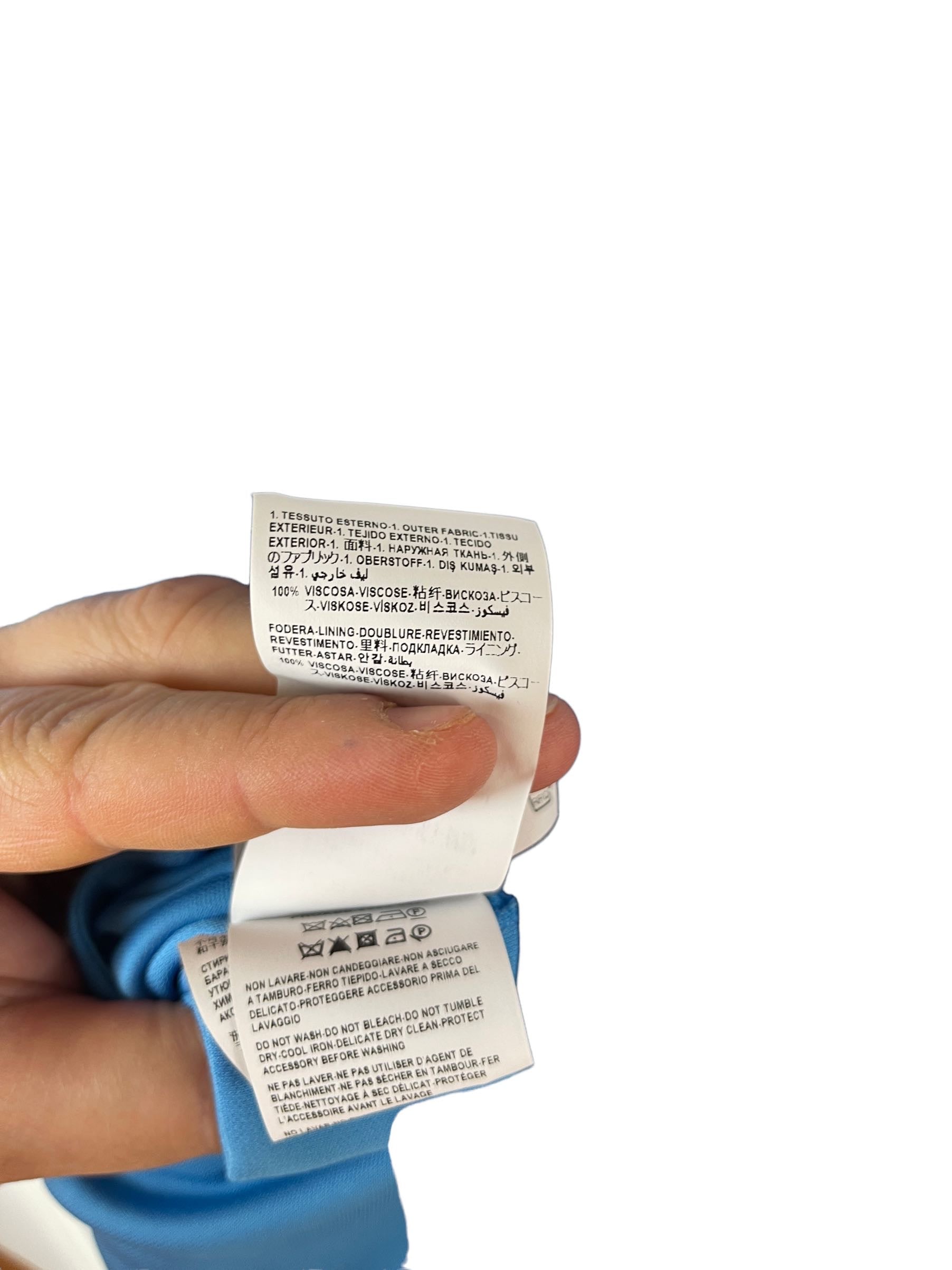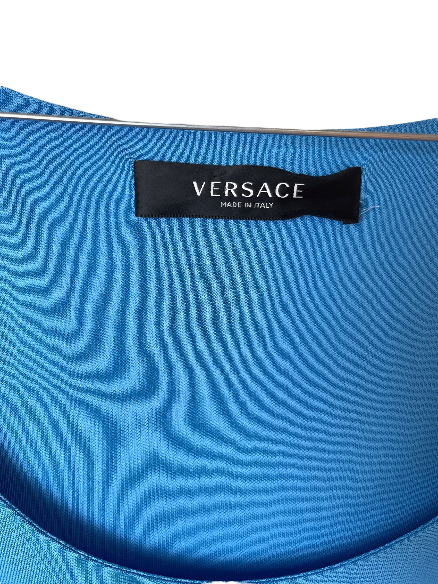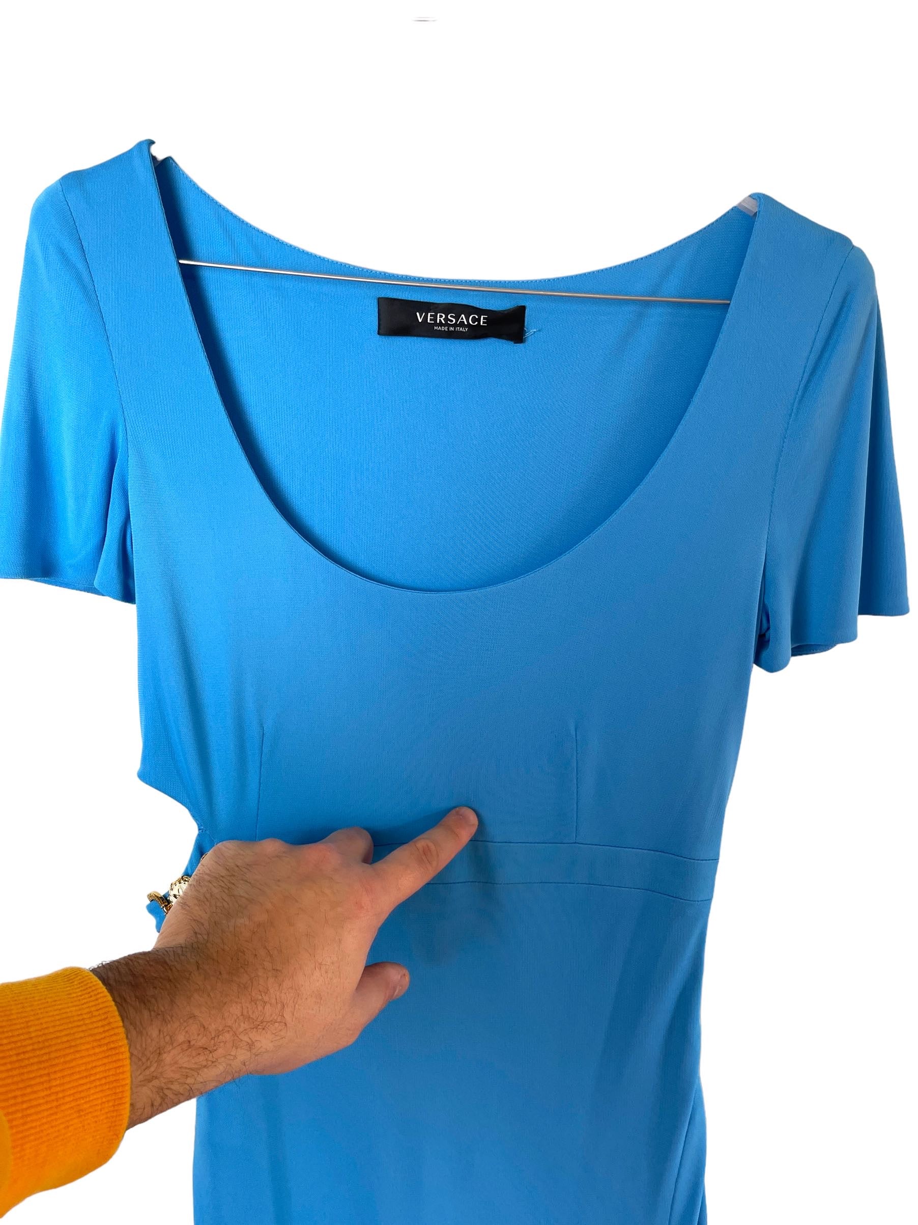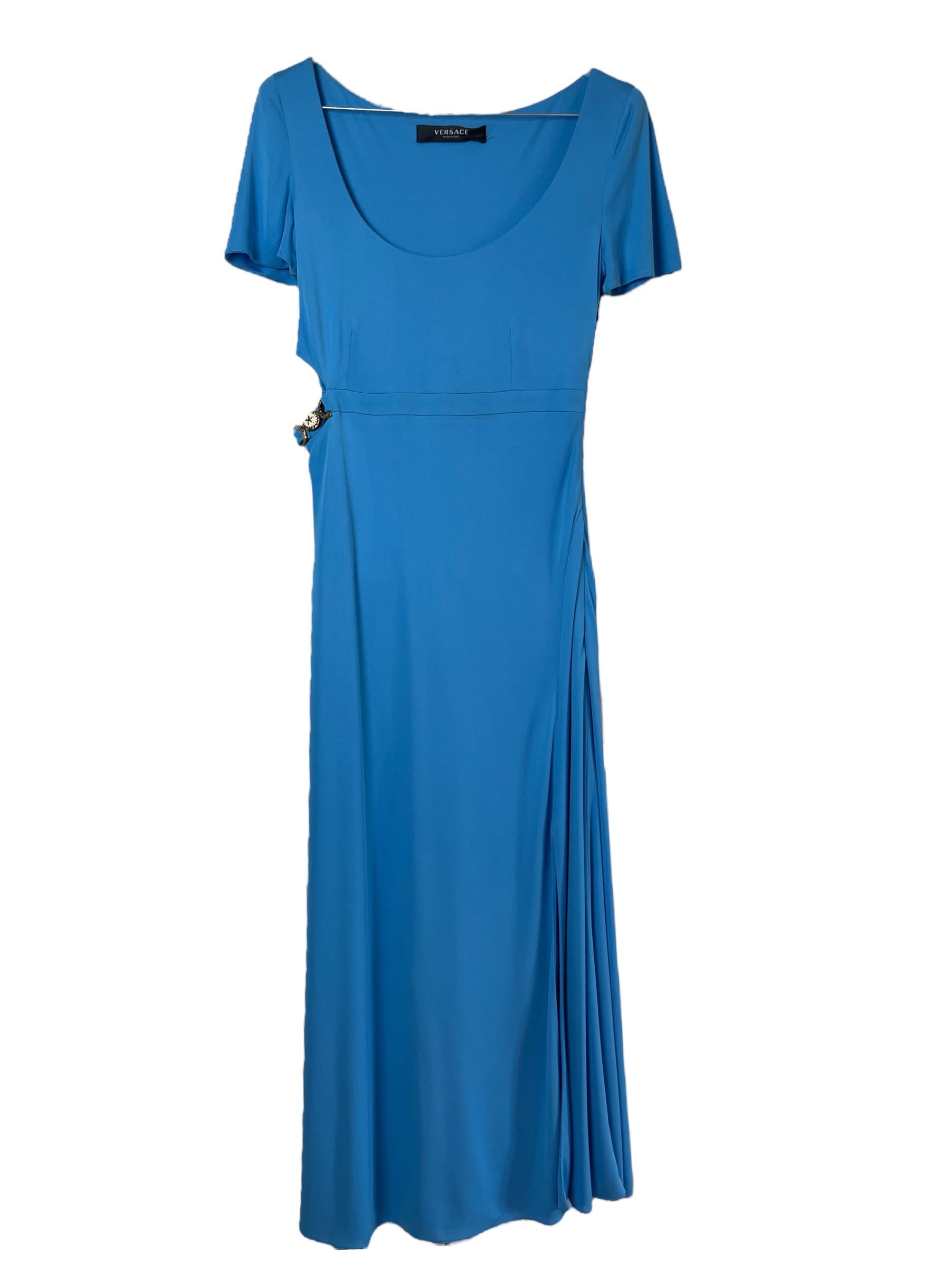 Versace, abito in viscosa azzurro con spacco laterale e gioiello tresor de la mer. Nuovo, mai usato. Taglia 42. Piccolo filo tirato impercettibile, vedi foto.