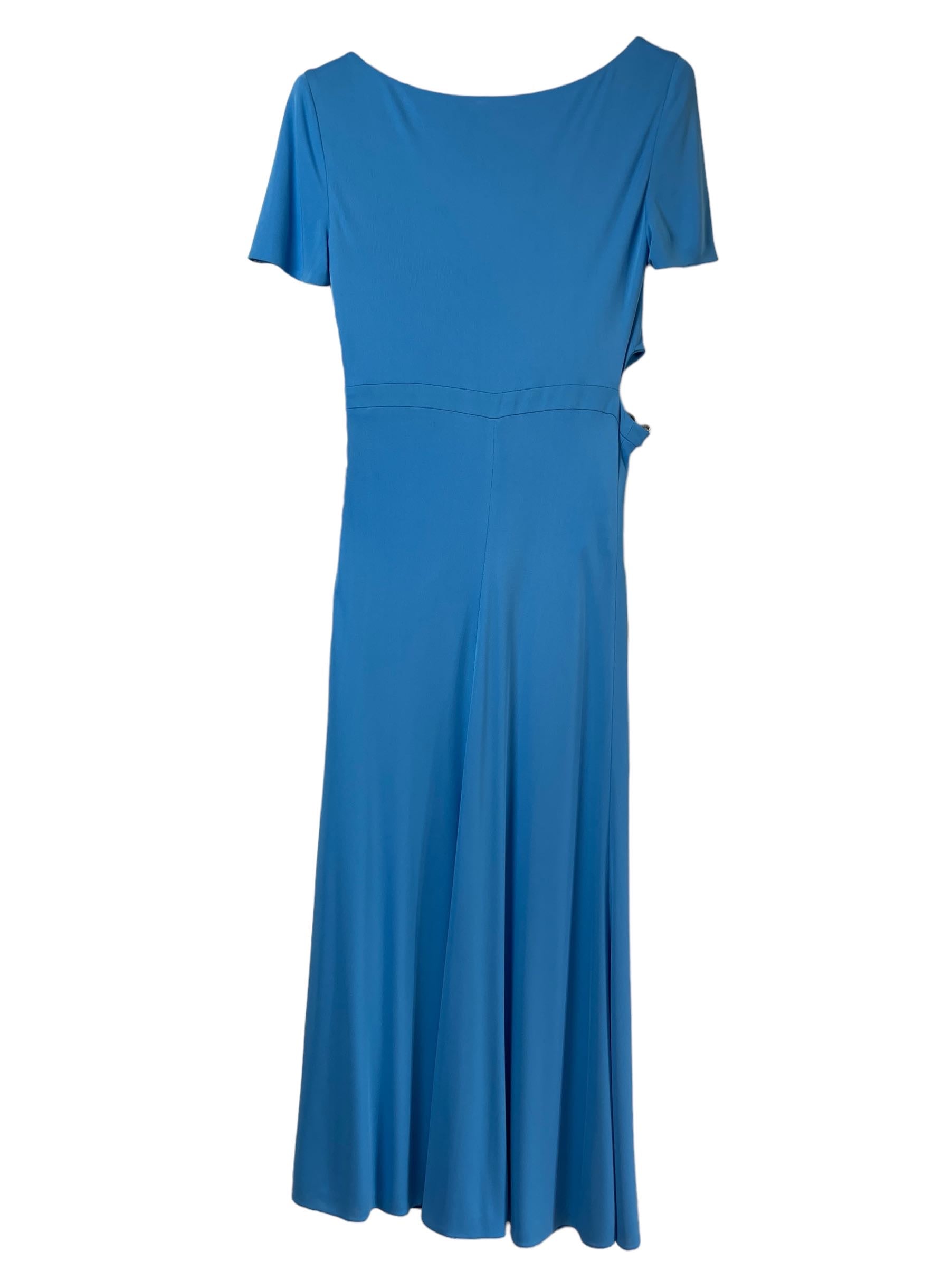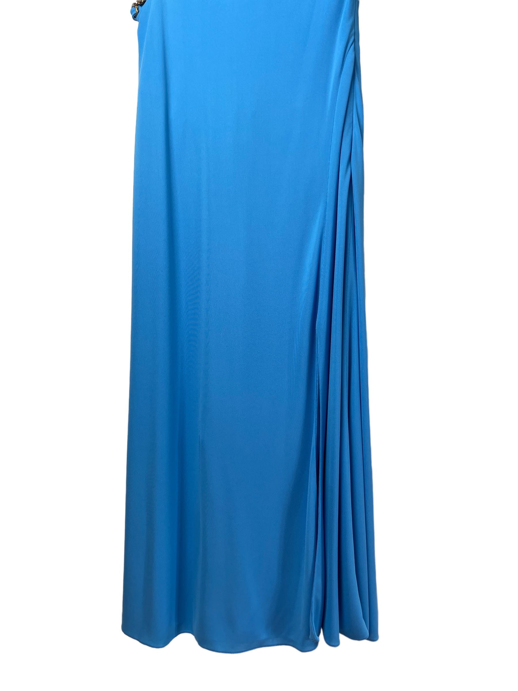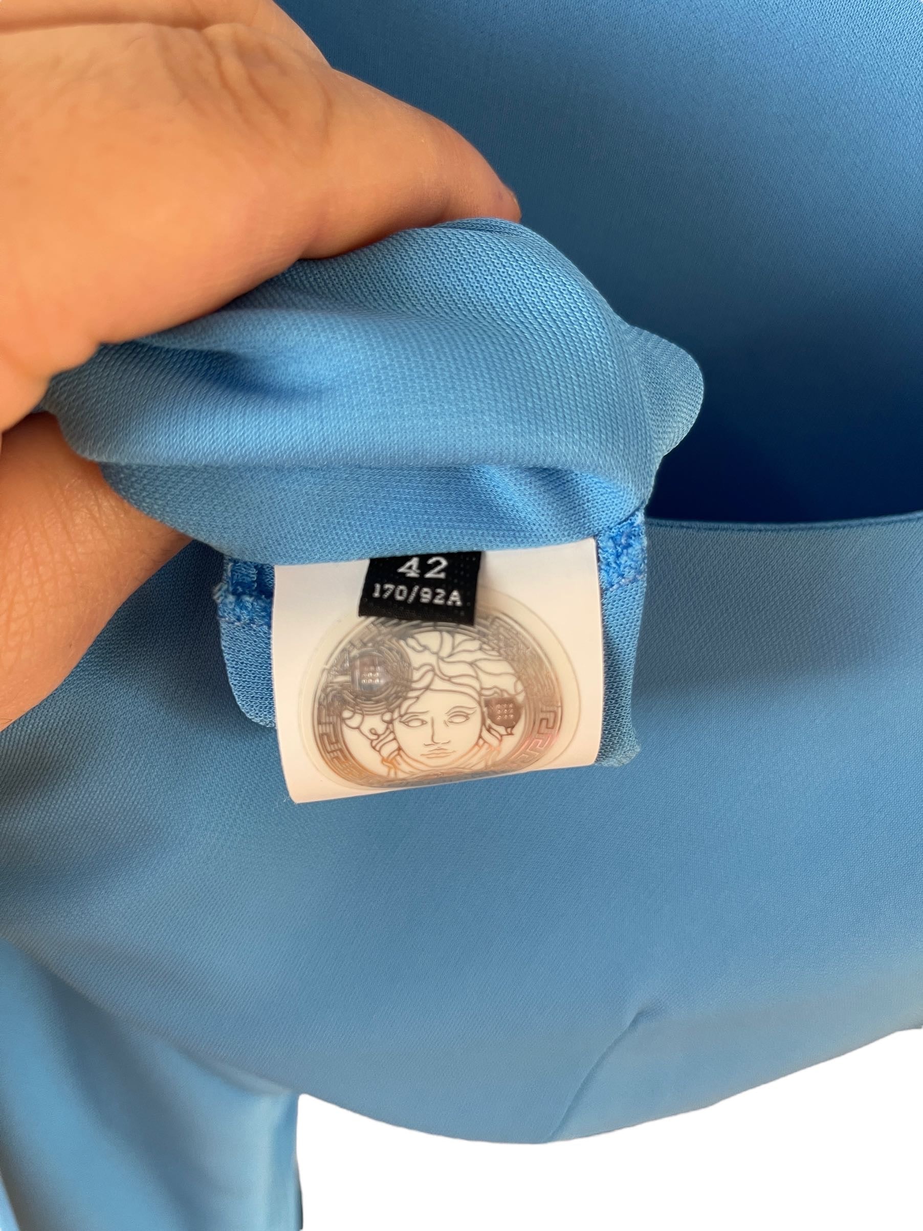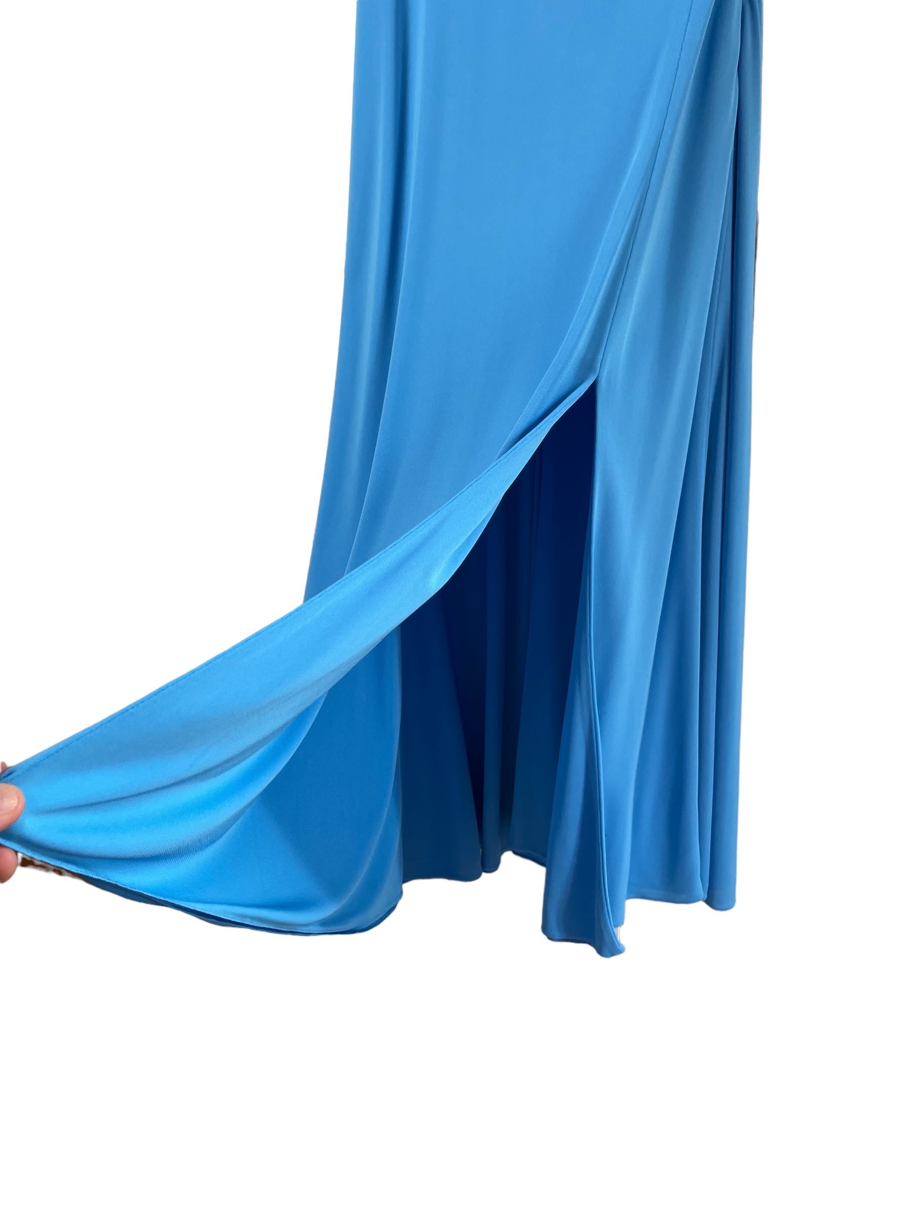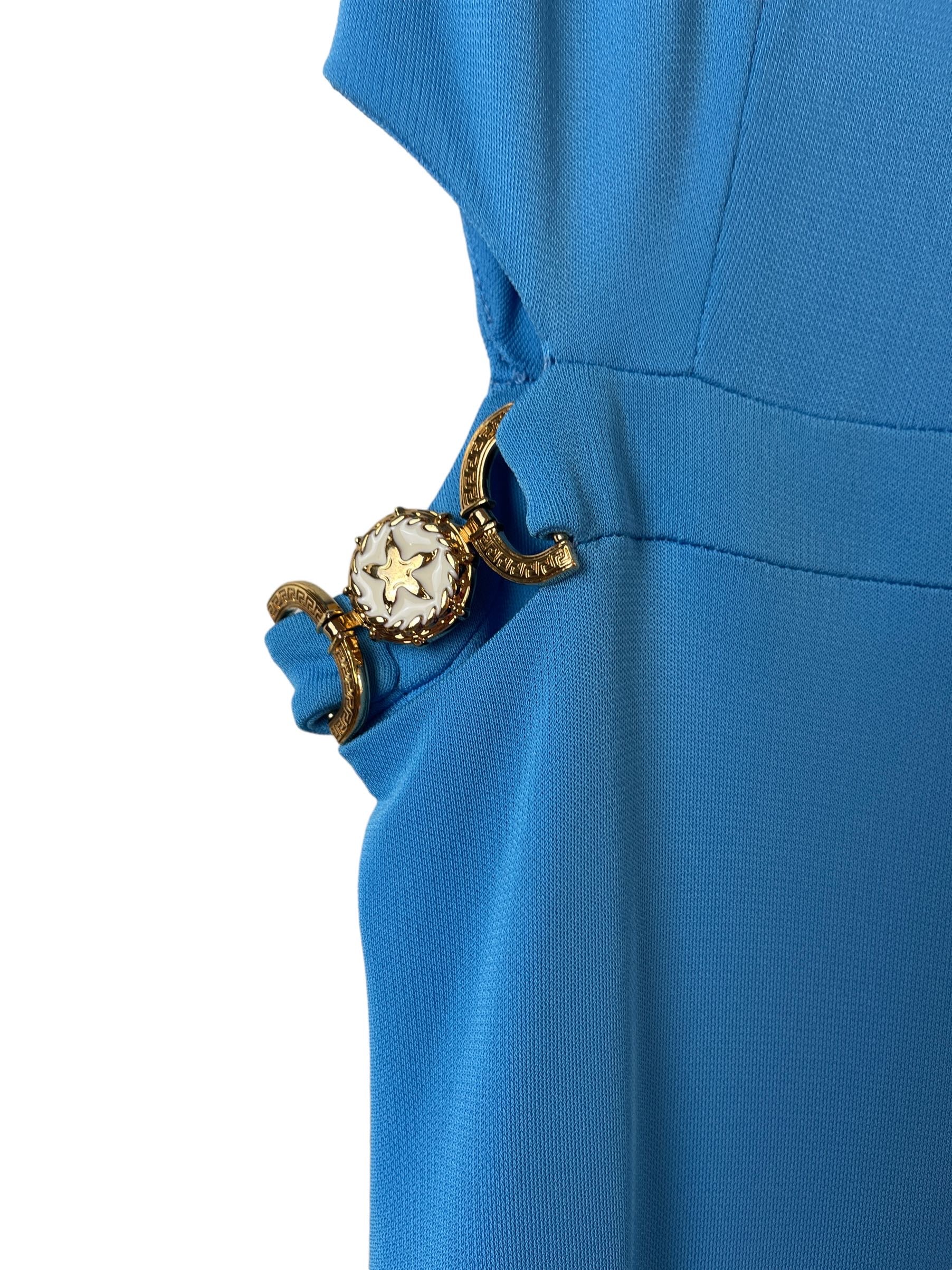 Versace, abito in viscosa azzurro con spacco laterale e gioiello tresor de la mer. Nuovo, mai usato. Taglia 42. Piccolo filo tirato impercettibile, vedi foto.