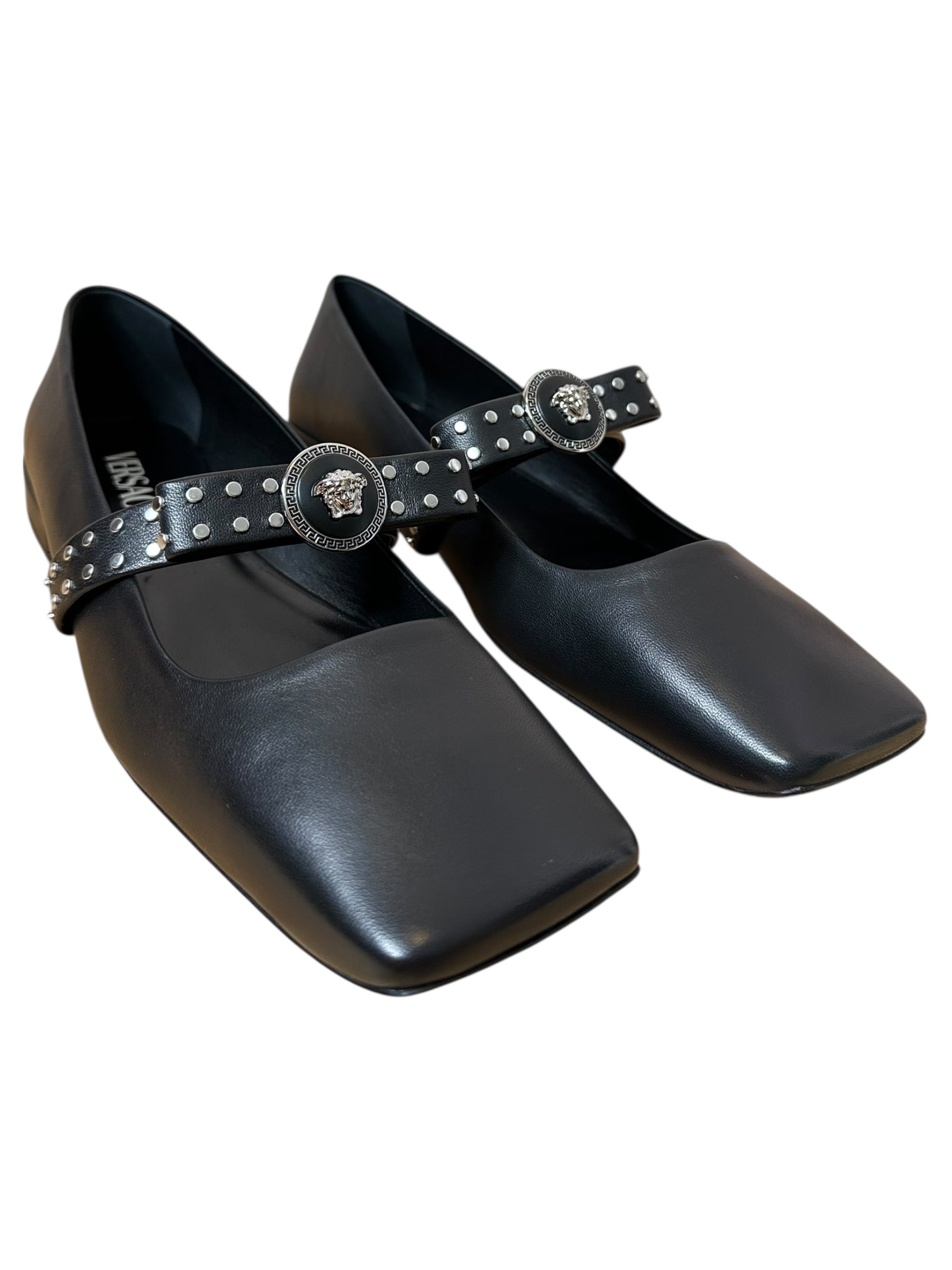 Eleganti ballerine firmate Versace, realizzate in pelle liscia nera di alta qualità. Il modello presenta una punta squadrata e un cinturino sul collo del piede arricchito da borchie metalliche e iconico medaglione Medusa centrale, dettaglio distintivo della maison. Linea pulita e struttura confortevole, ideali sia per look quotidiani che più ricercati.