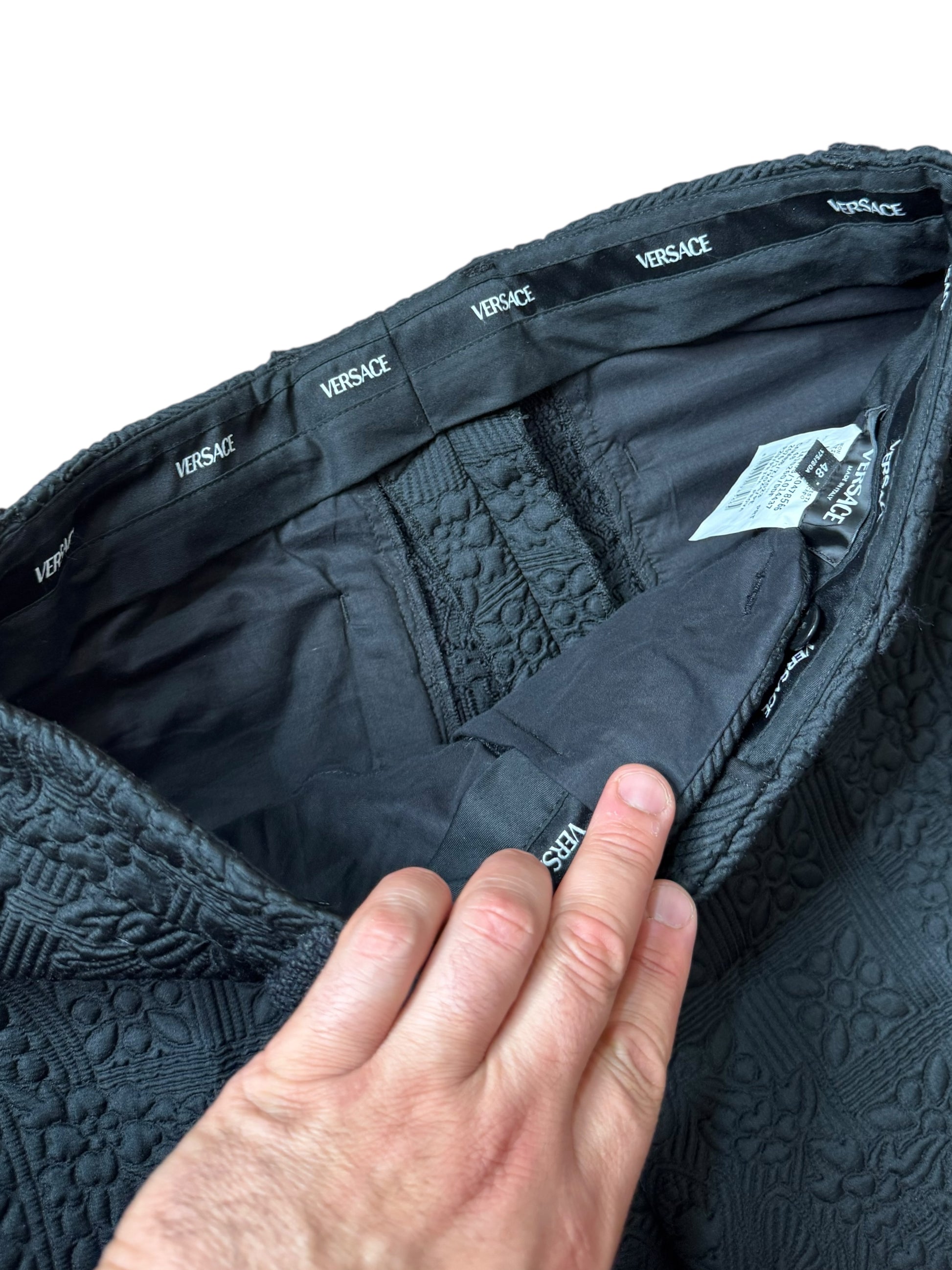 Bermuda originale Versace in tessuto jacquard nero con motivo floreale e geometrico in rilievo. Un capo di grande pregio della collezione Primavera/Estate 2024, realizzato in Italia con finiture di alta qualità.