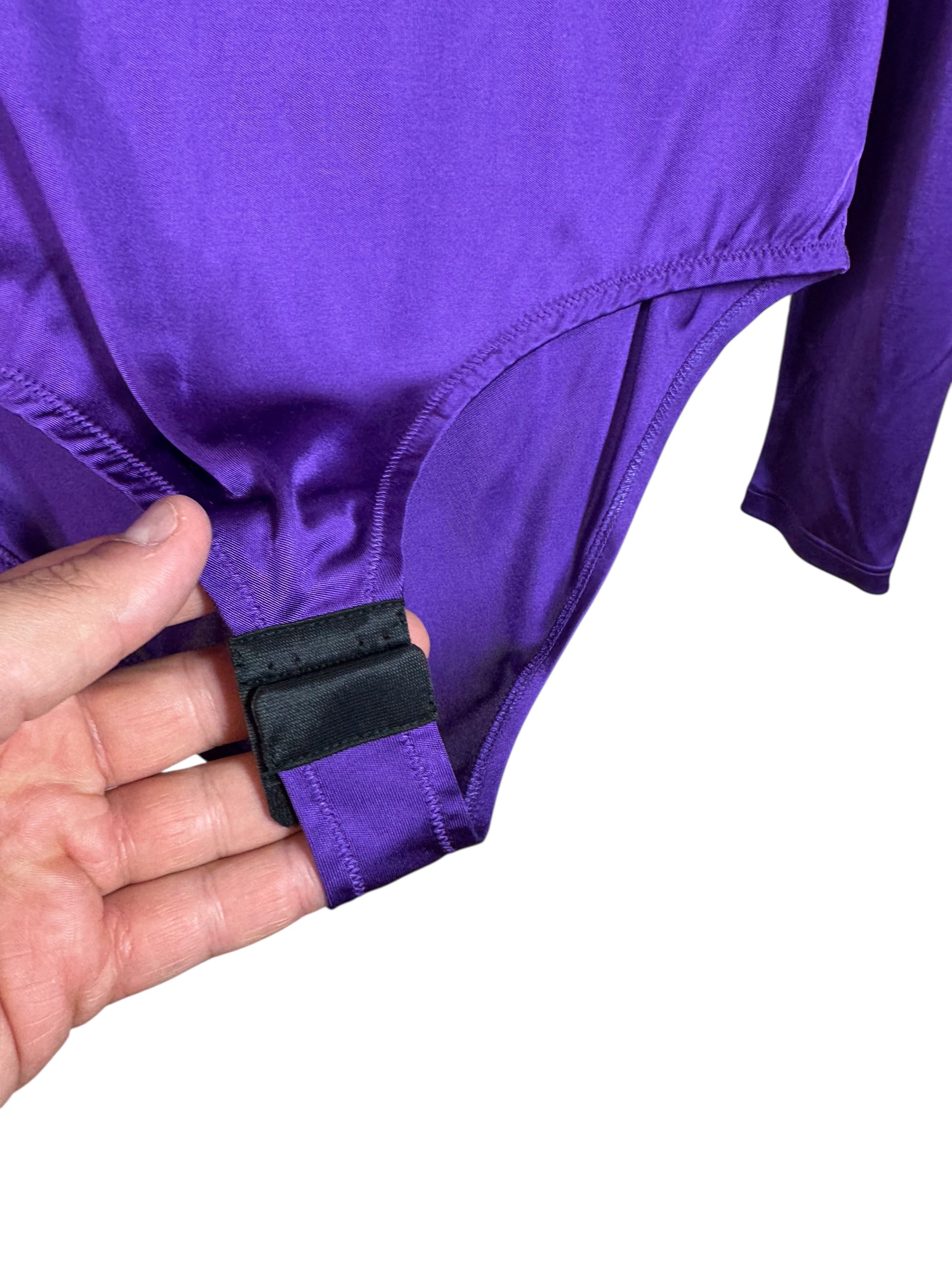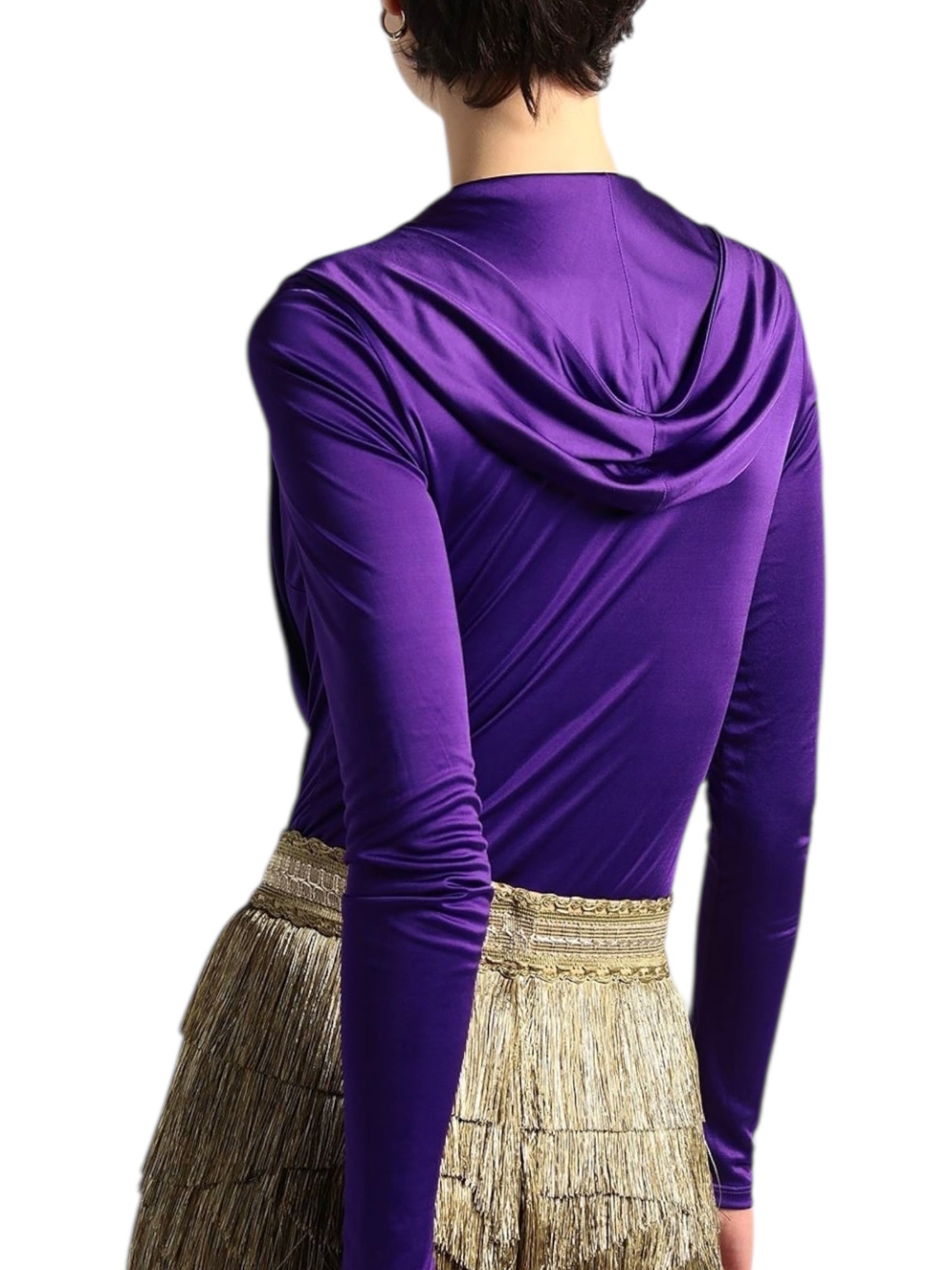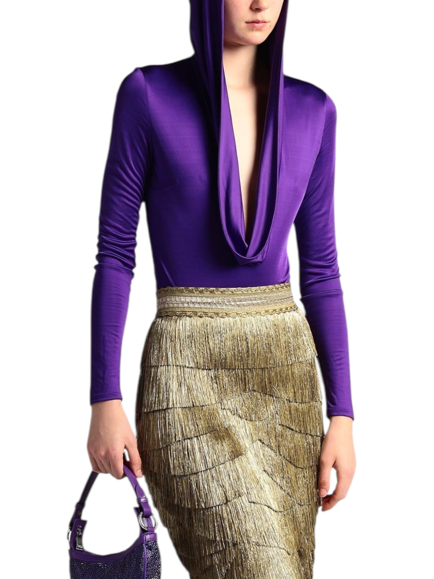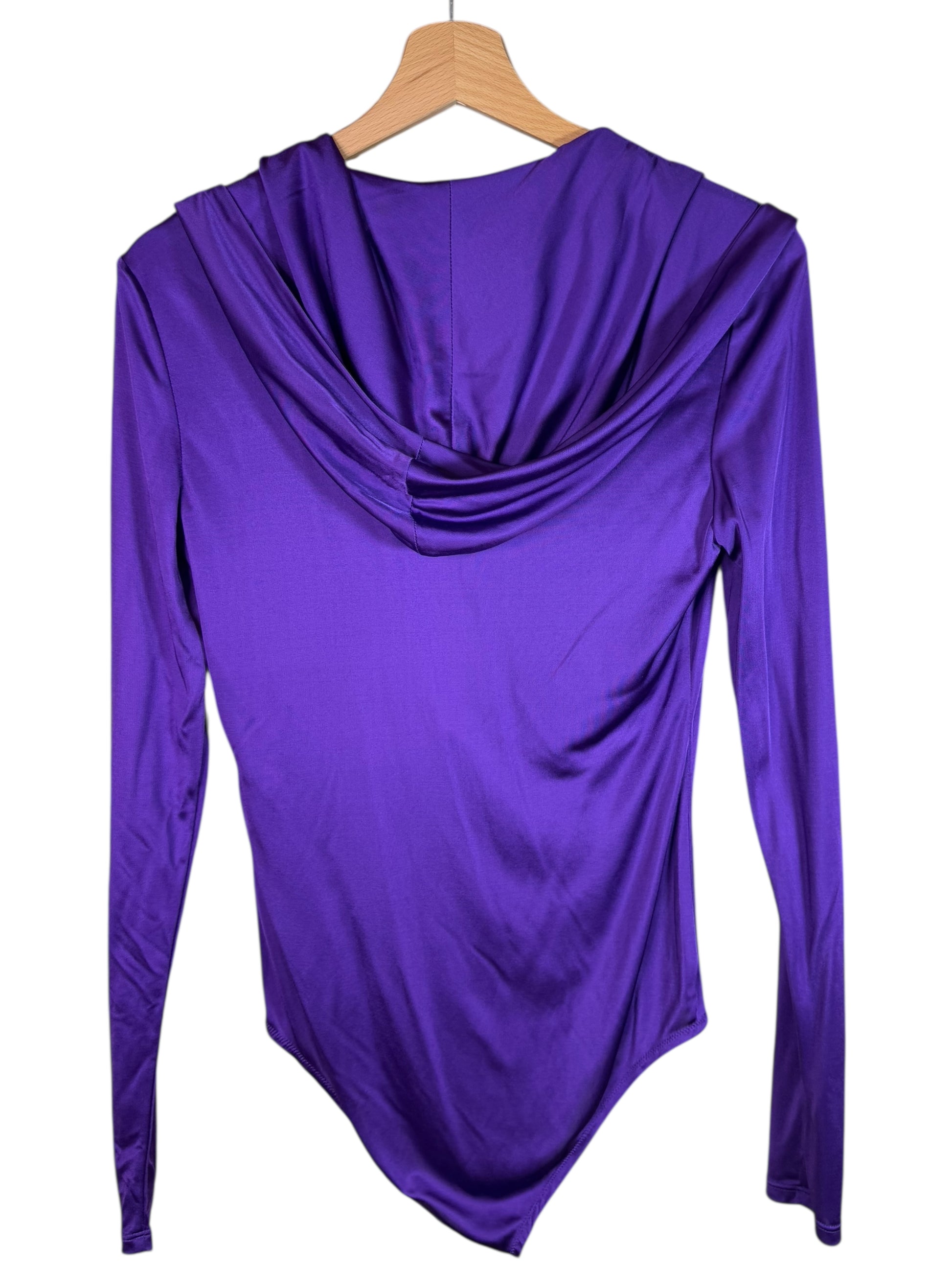 Body originale Versace in viscosa fluida lucida, con un design scenico e sensuale. Caratterizzato da uno scollo anteriore profondo con drappeggio, cappuccio integrato, maniche lunghe e chiusura a scatto. Il capo è lo stesso indossato in passerella, con tag NFC per l’autenticazione. Perfetto per look da sera di forte impatto o styling editoriali.