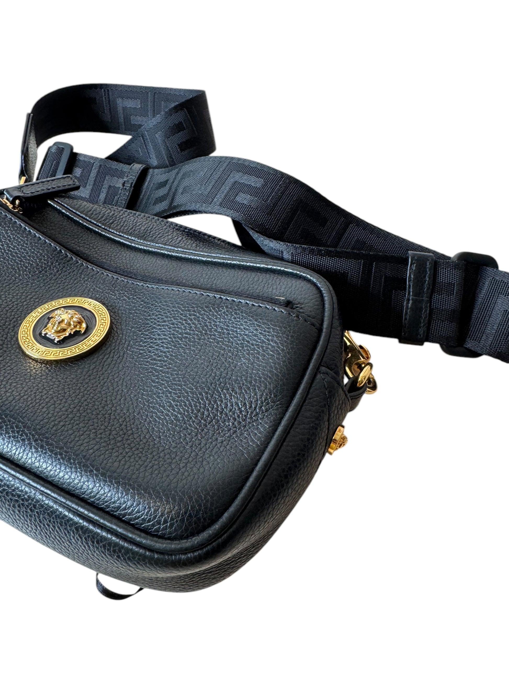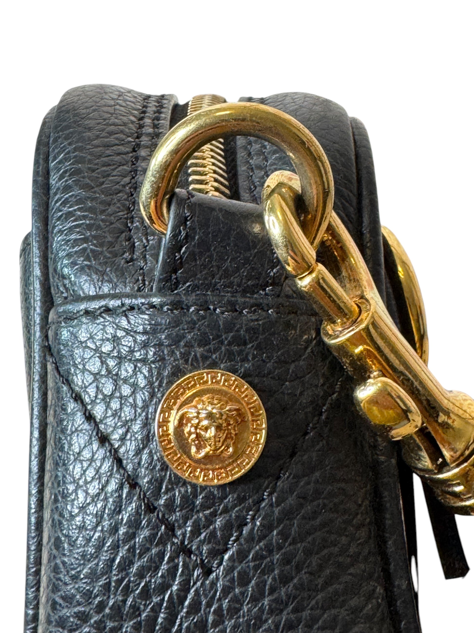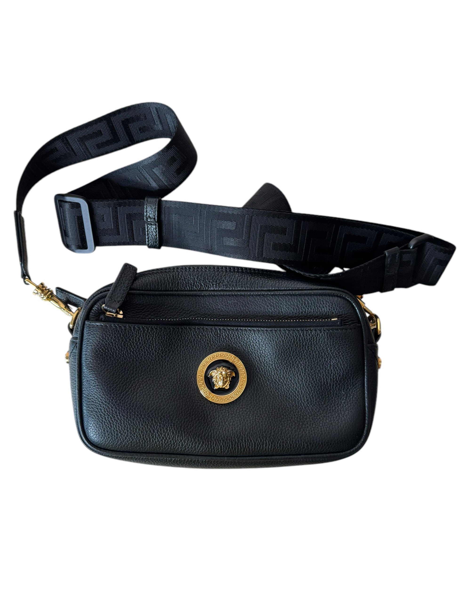 Borsa a tracolla originale Versace da uomo, realizzata in vera pelle di vitello martellata nera, con dettagli metallici oro lucido. Sul fronte spicca l’iconica Medusa dorata incastonata in una cornice Greca. Dotata di tracolla regolabile con motivo Greca jacquard e pannello posteriore in tessuto tecnico traspirante per massimo comfort.