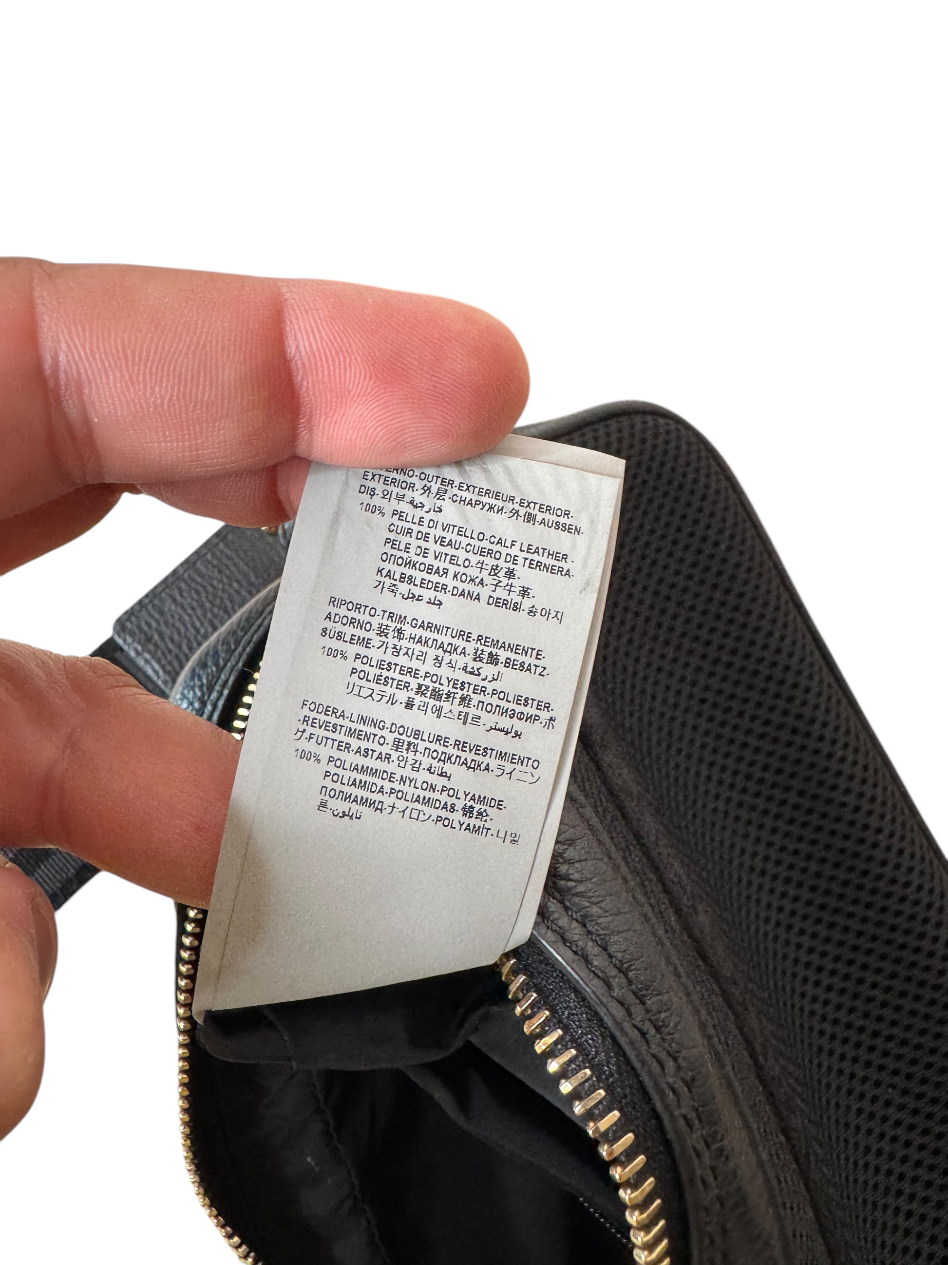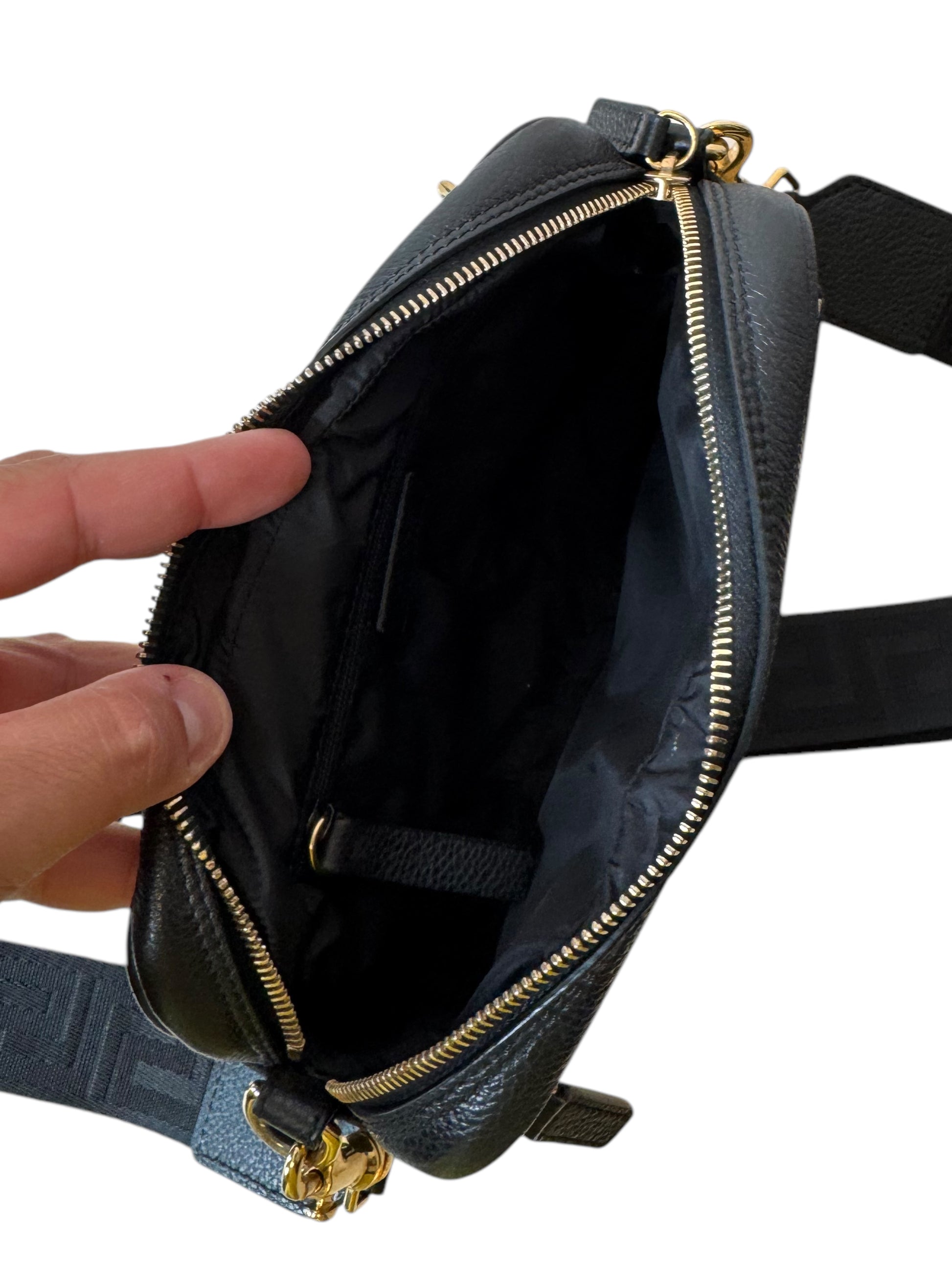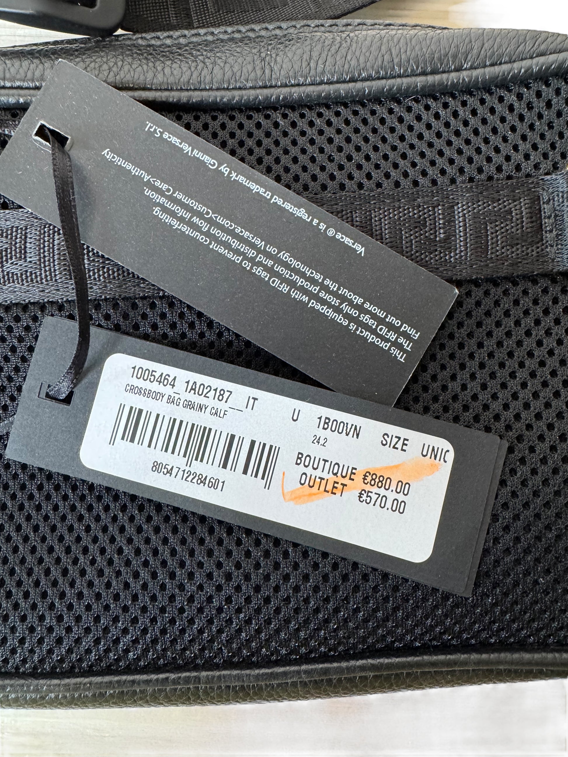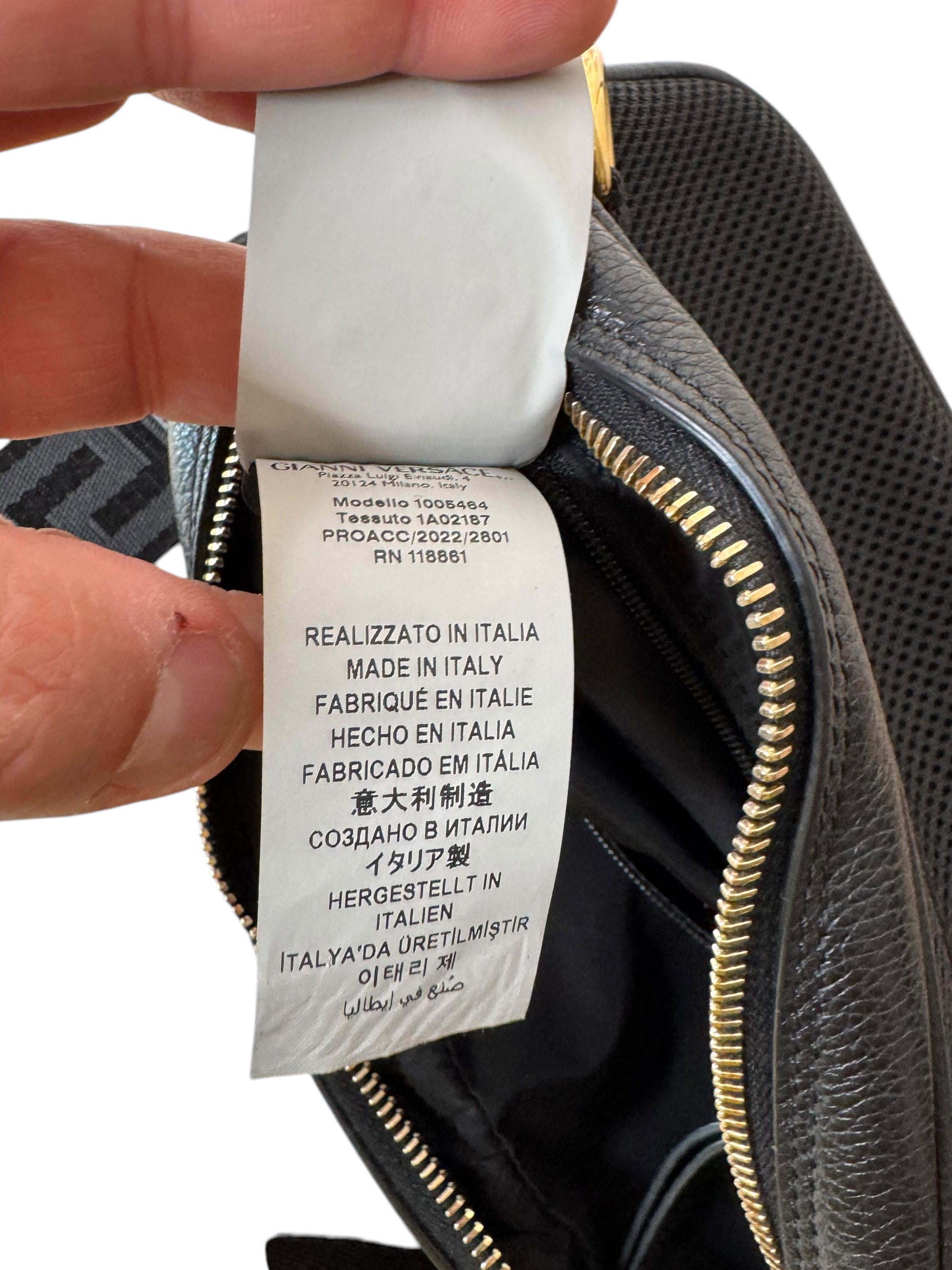 Borsa a tracolla originale Versace da uomo, realizzata in vera pelle di vitello martellata nera, con dettagli metallici oro lucido. Sul fronte spicca l’iconica Medusa dorata incastonata in una cornice Greca. Dotata di tracolla regolabile con motivo Greca jacquard e pannello posteriore in tessuto tecnico traspirante per massimo comfort.