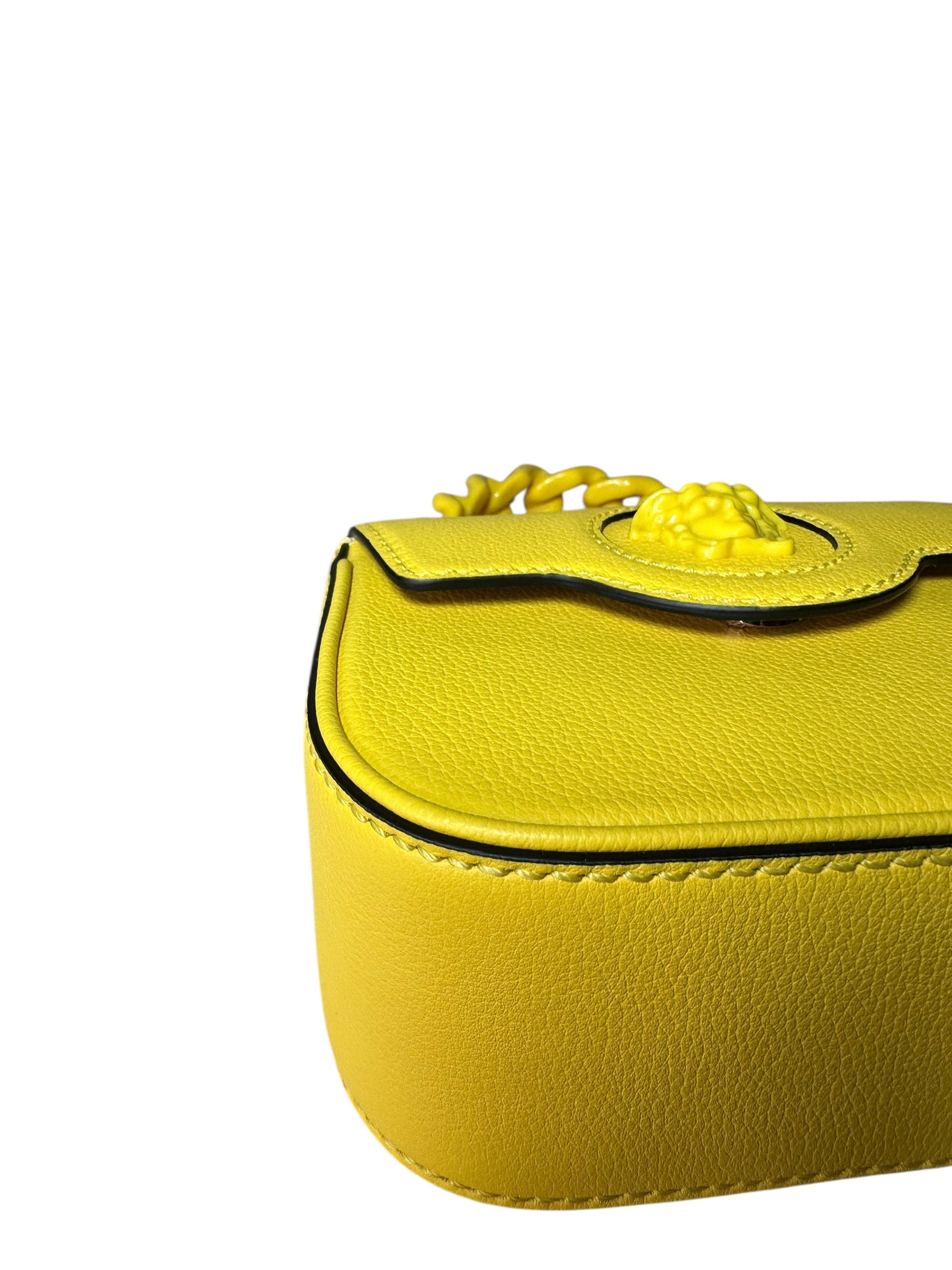 Iconica borsa Versace realizzata in pelle martellata gialla, impreziosita dal dettaglio Medusa tono su tono sul flap frontale. Il manico superiore è in resina gialla con intreccio effetto catena, che dona un carattere deciso e riconoscibile. La chiusura è a bottone magnetico. Interno in pelle liscia color lilla con logo stampato e slot portacarte. Dotata di tracolla regolabile e rimovibile in pelle nello stesso colore.