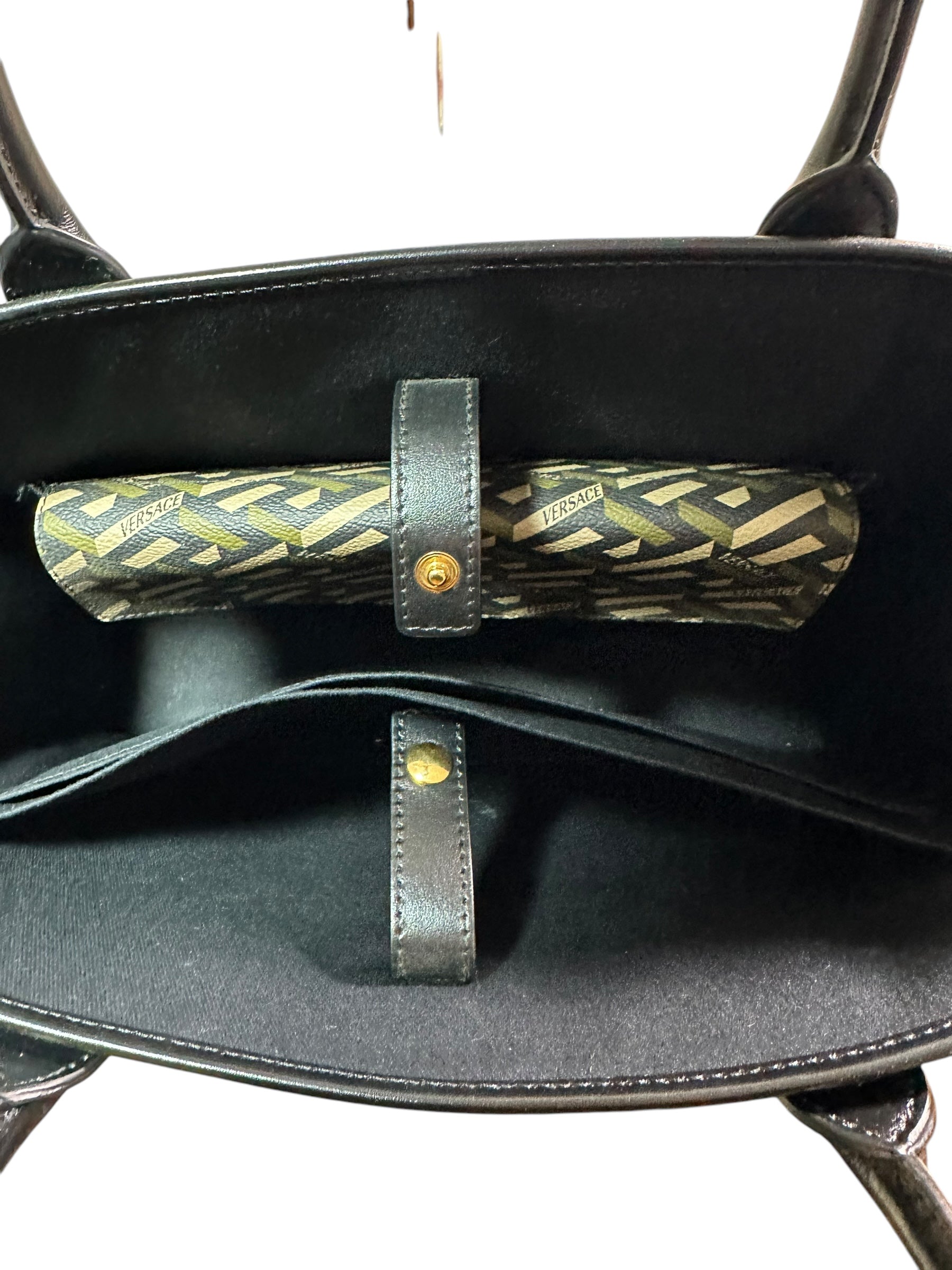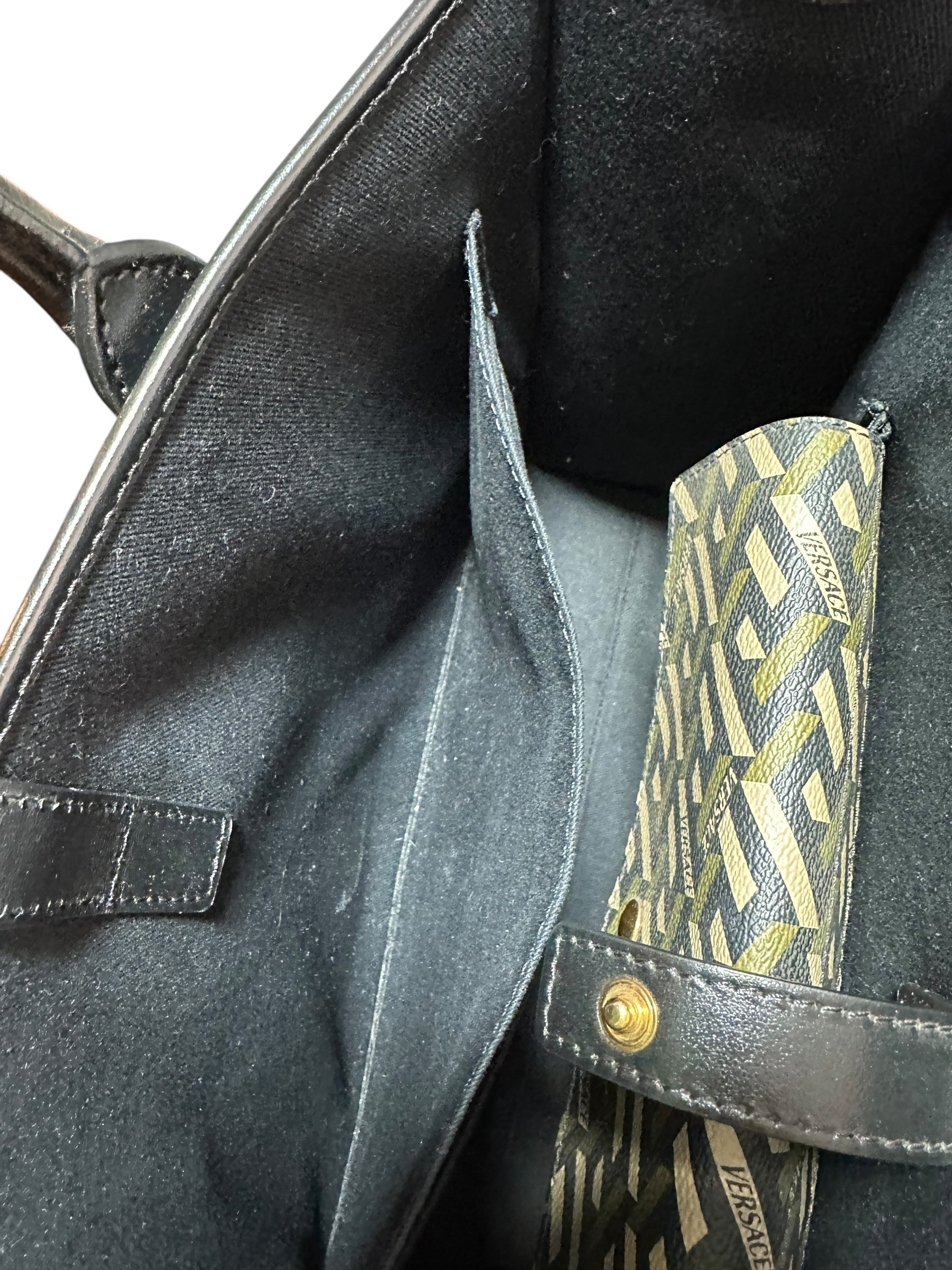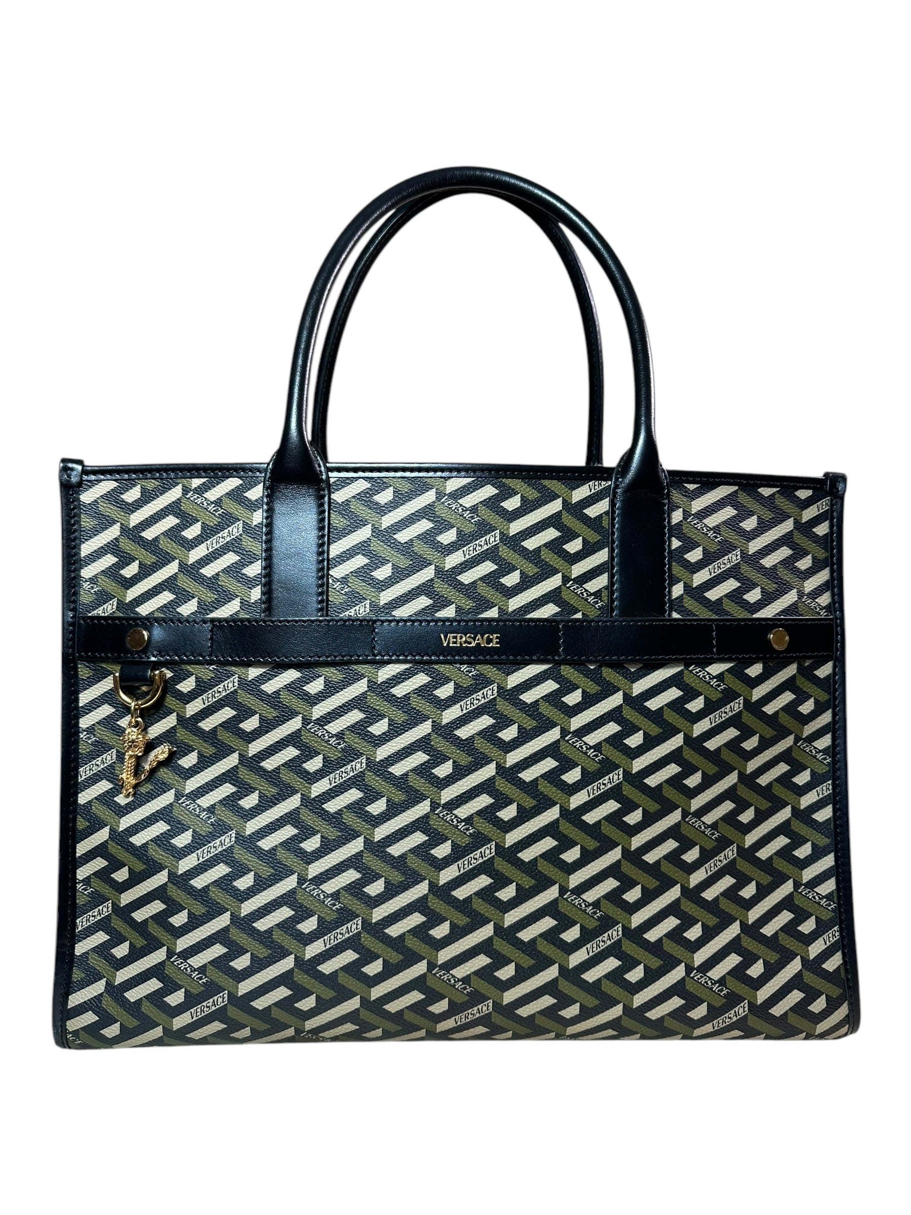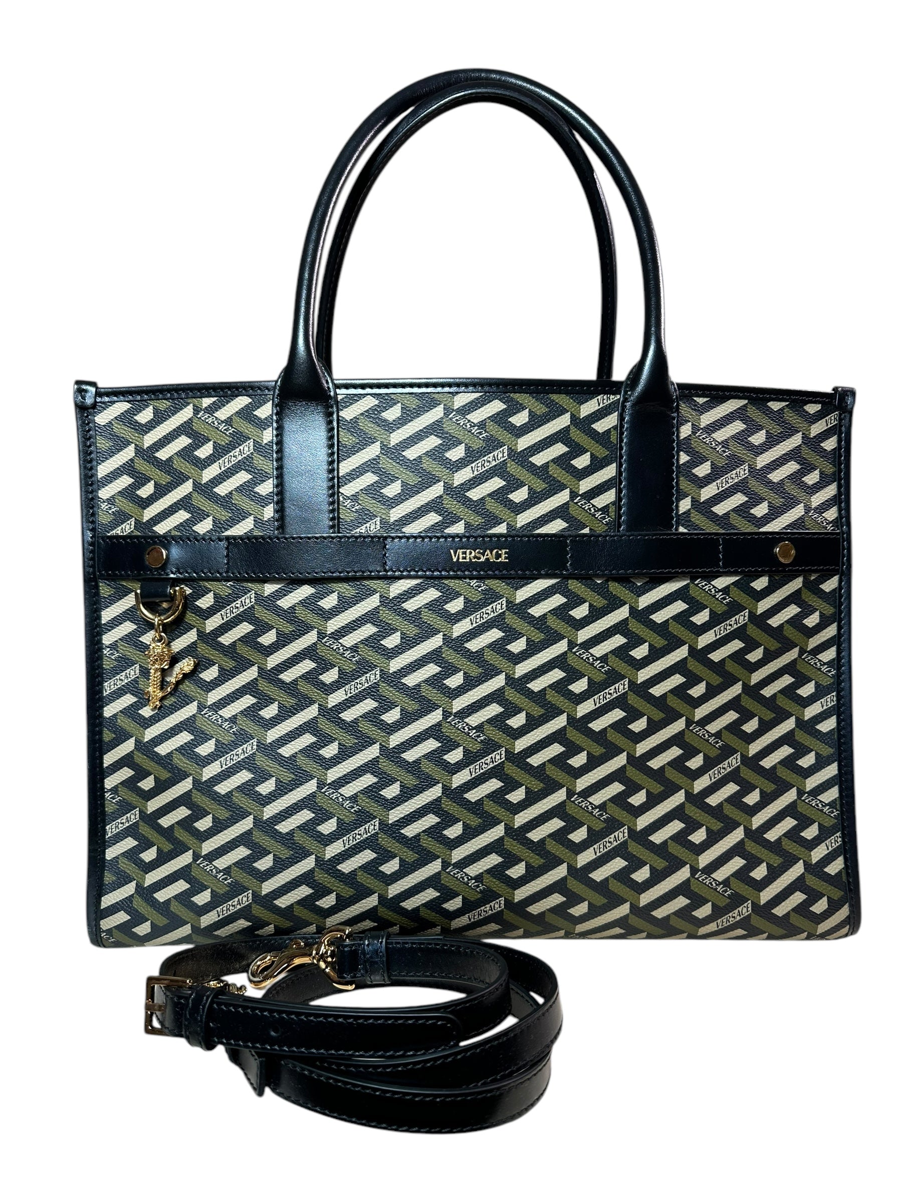 Versace borsa shopper in tela con stampa a greca, manici e tracolla rimovibile in pelle. Charms in metallo dorato con medusa sul davanti. Ampio vano all’interno con mini pochette applicata e tasca laterale. Lievissimo segno di usura nella parte posteriore vicino all’angolo. Vine spedita con dust bag.