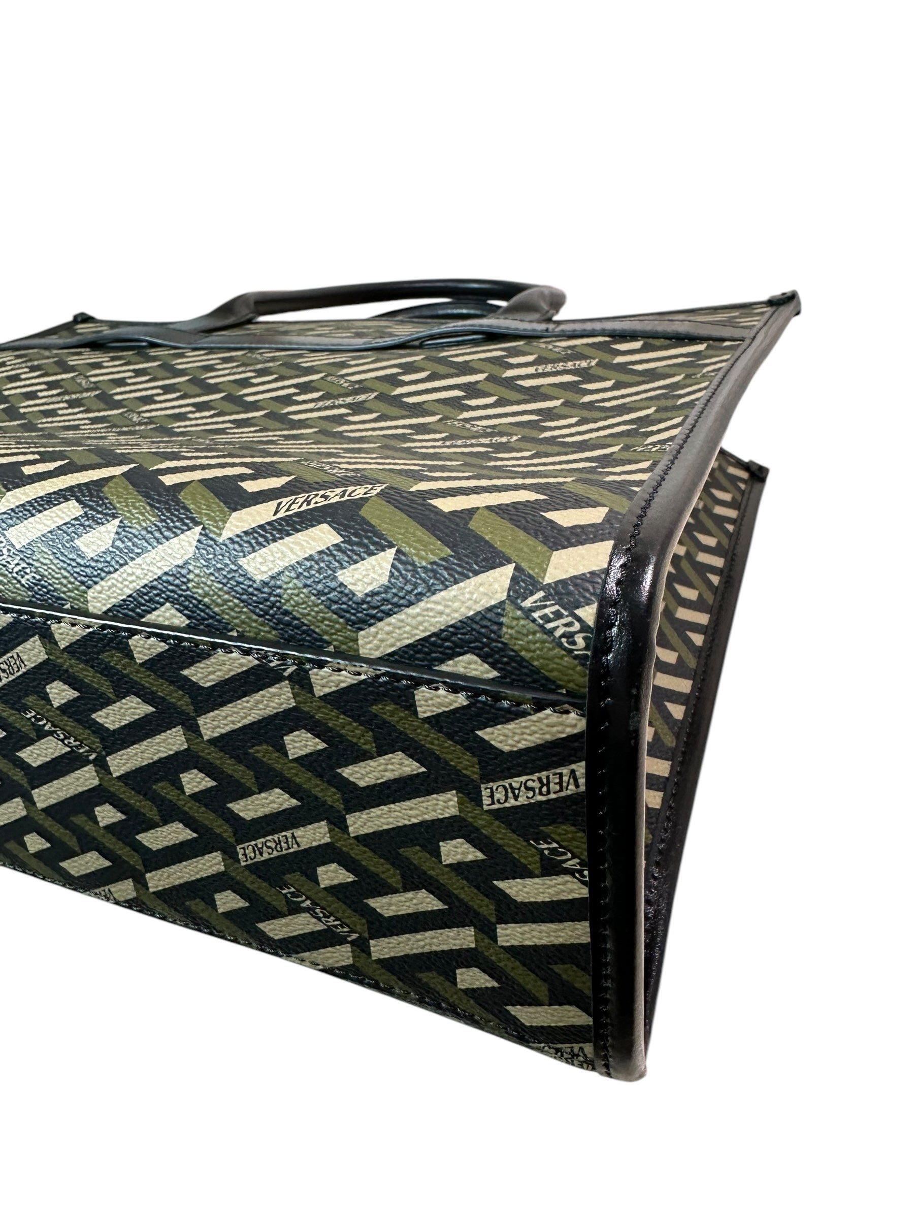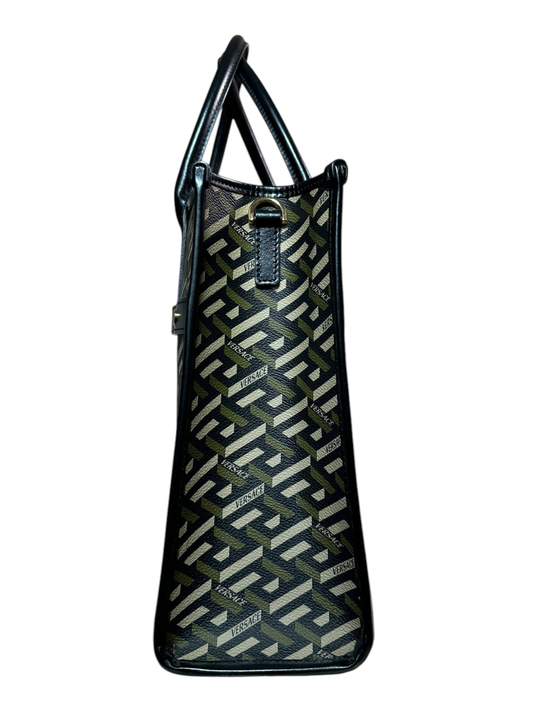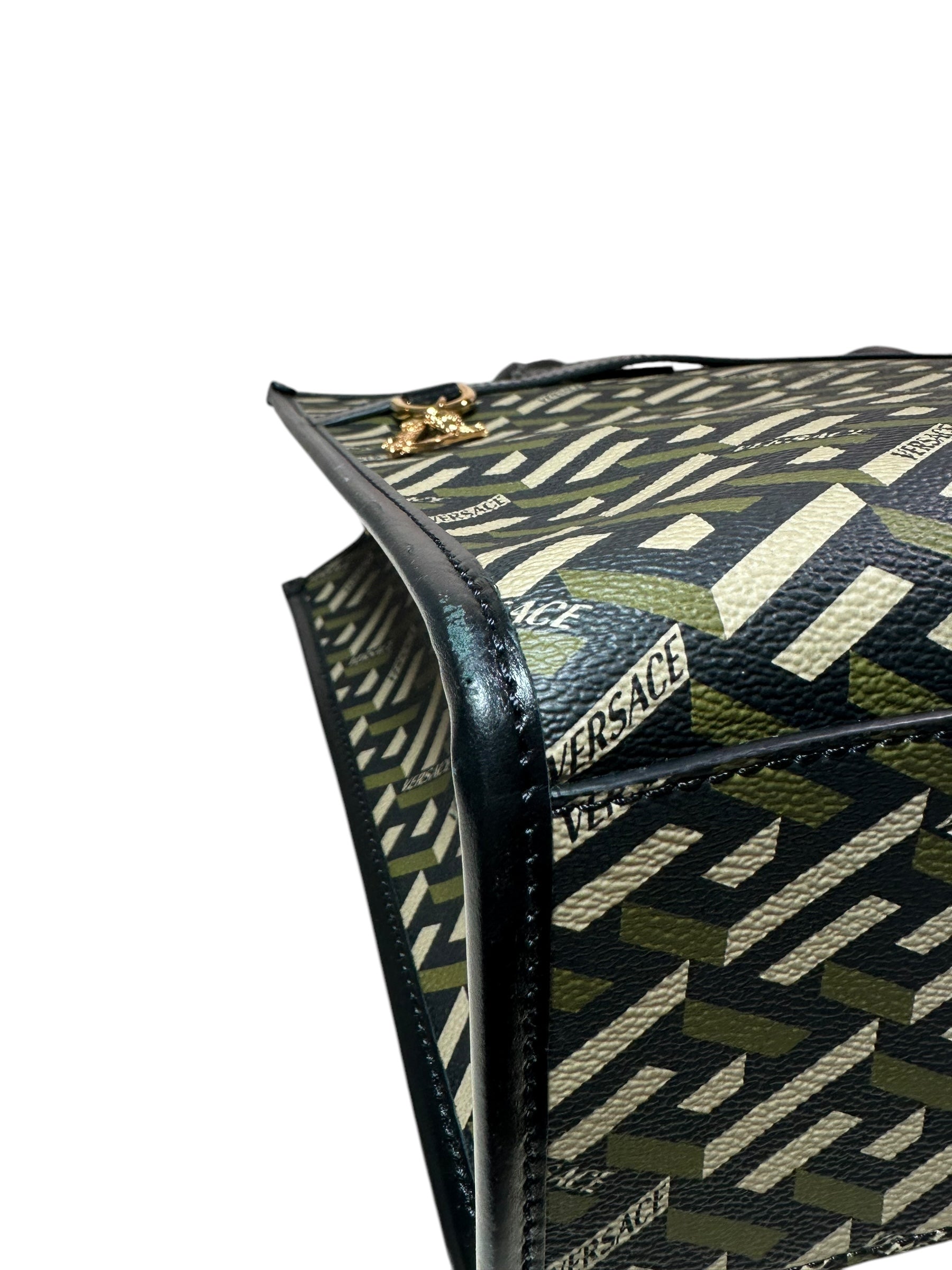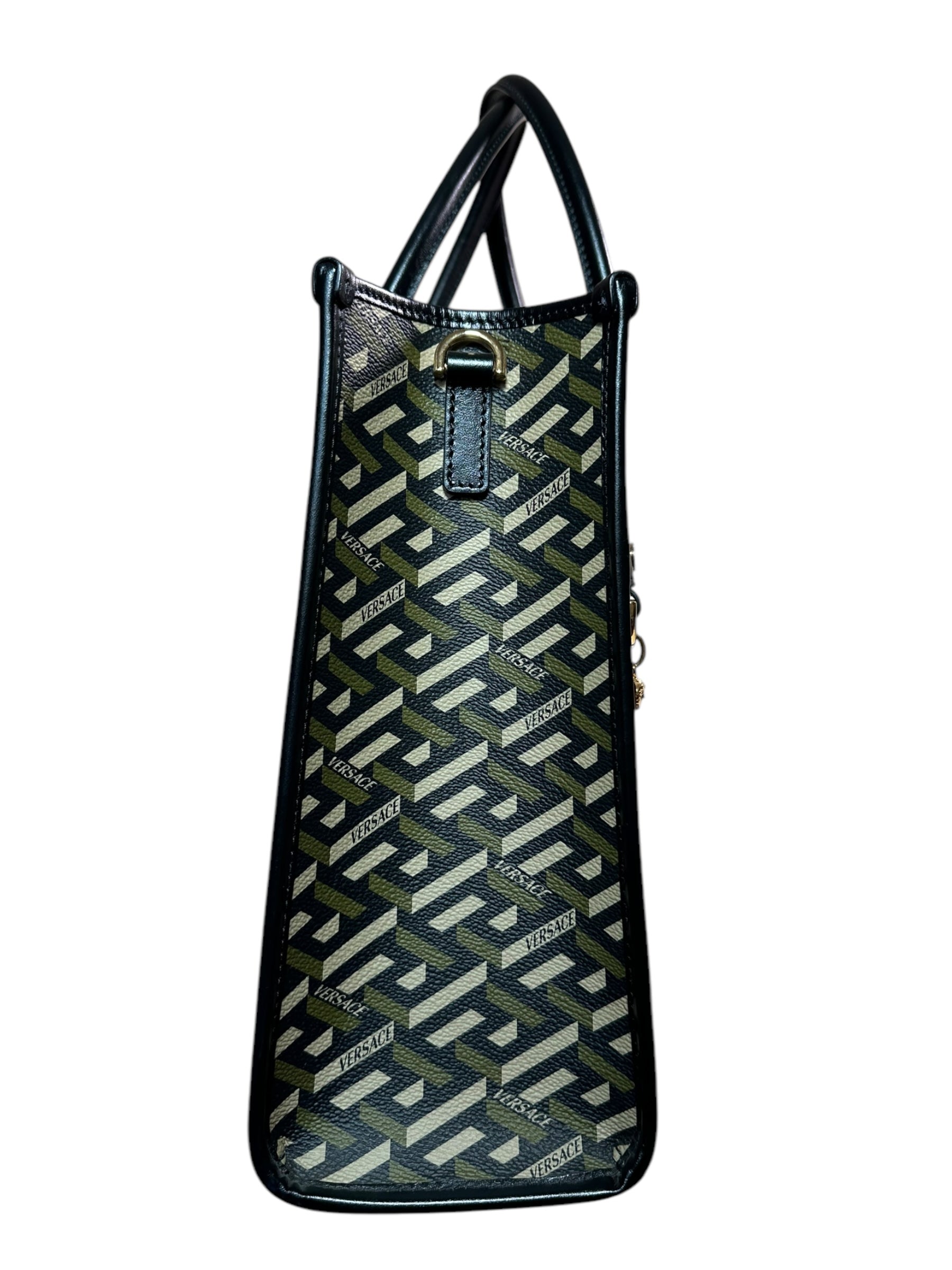 Versace borsa shopper in tela con stampa a greca, manici e tracolla rimovibile in pelle. Charms in metallo dorato con medusa sul davanti. Ampio vano all’interno con mini pochette applicata e tasca laterale. Lievissimo segno di usura nella parte posteriore vicino all’angolo. Vine spedita con dust bag.
