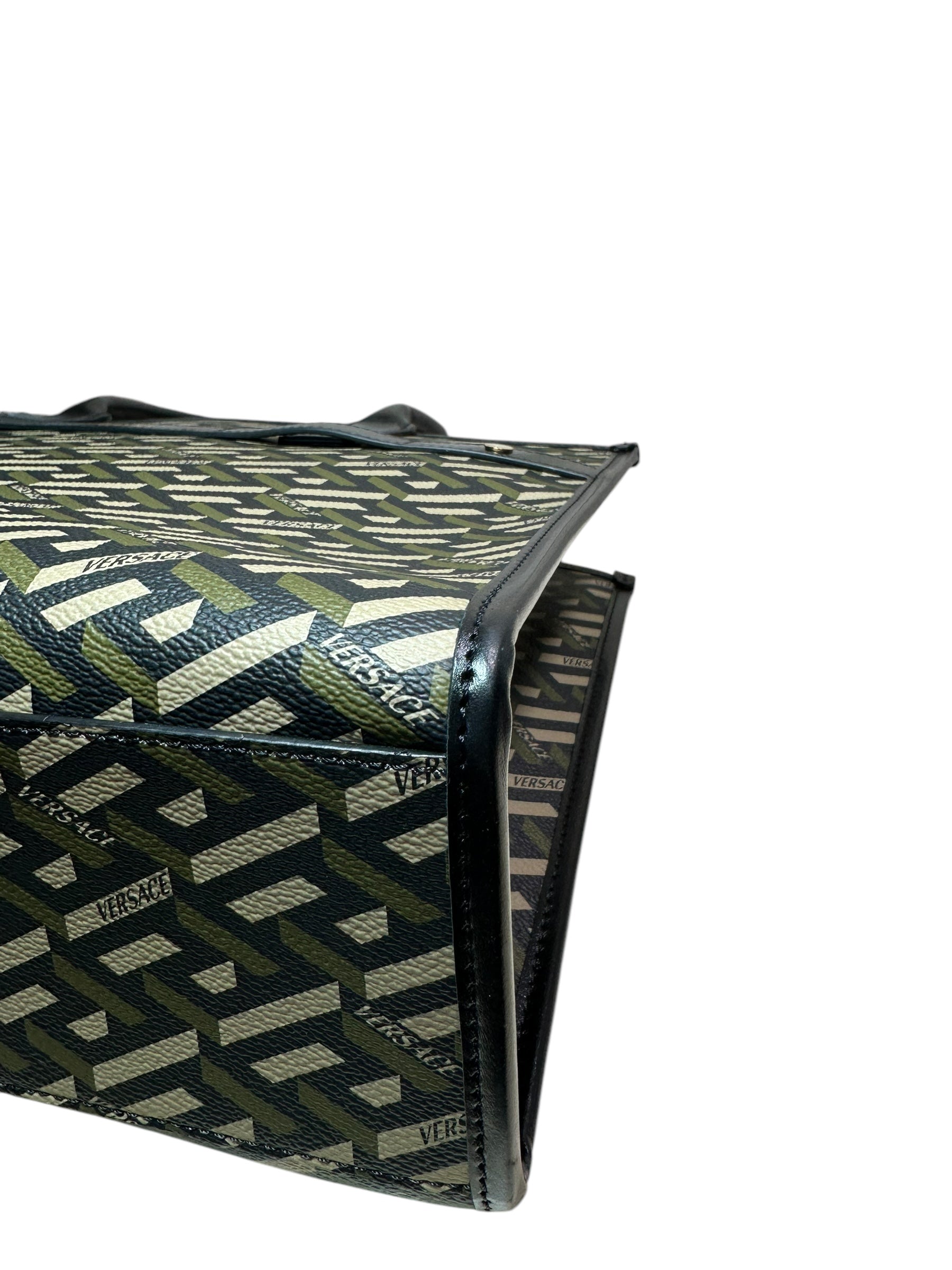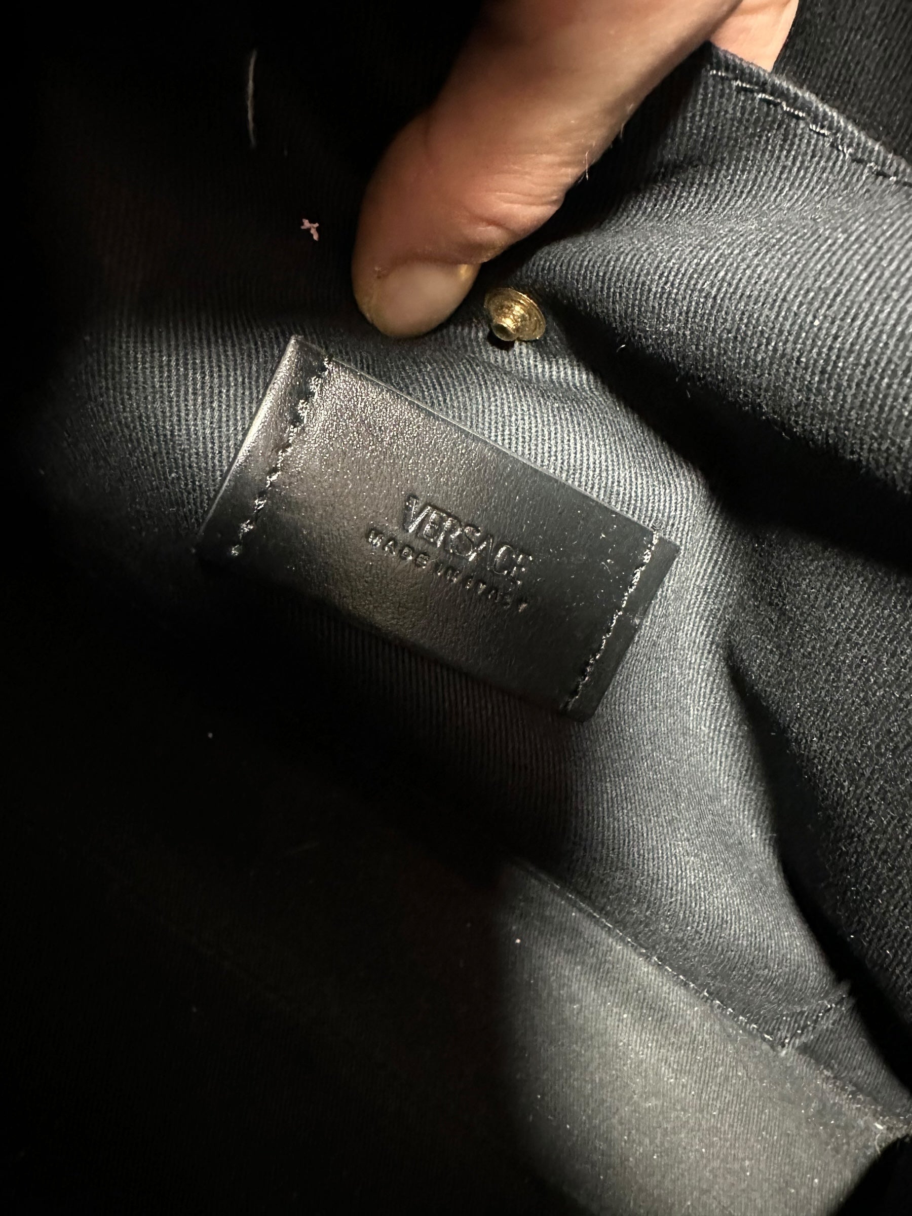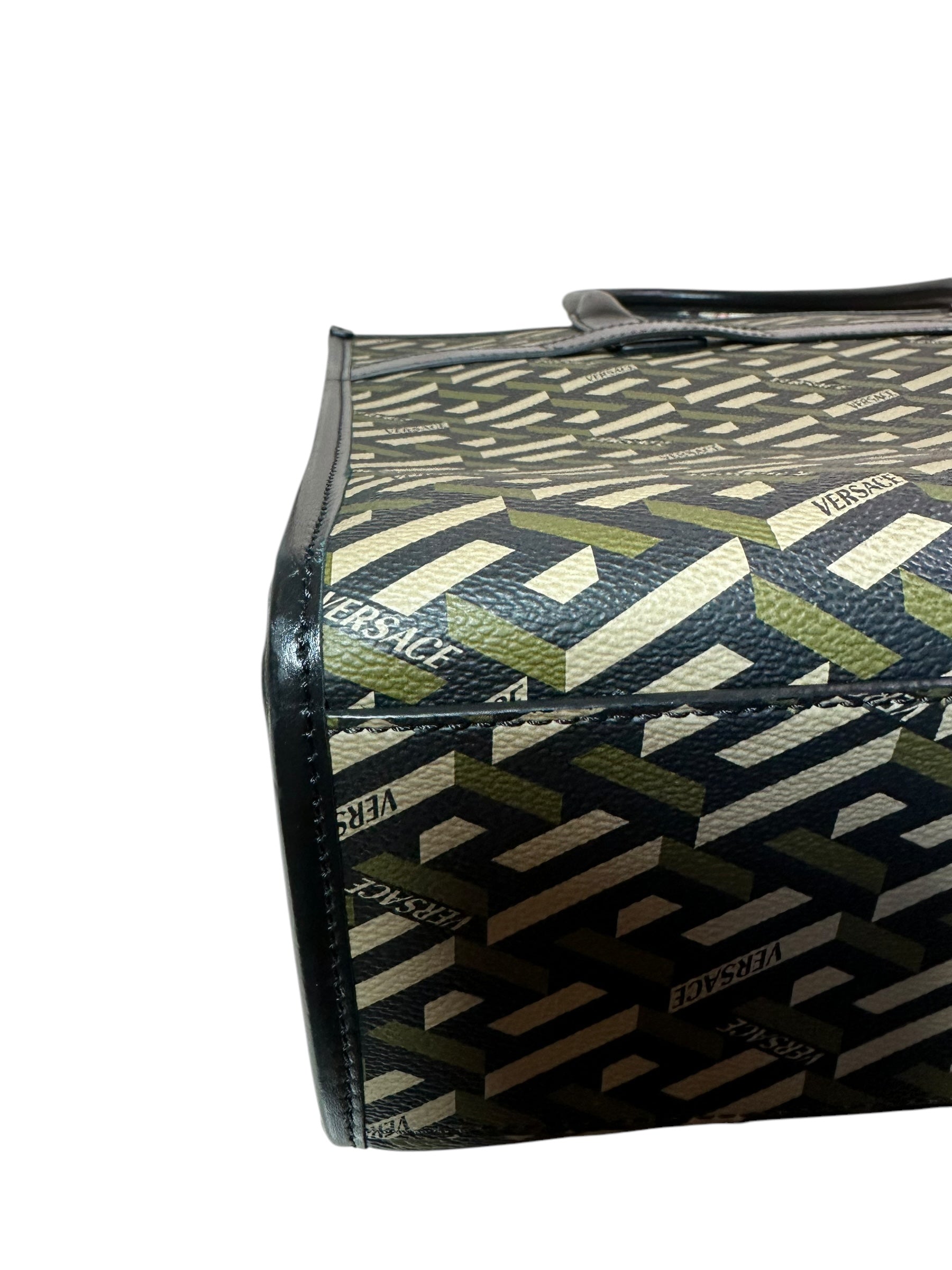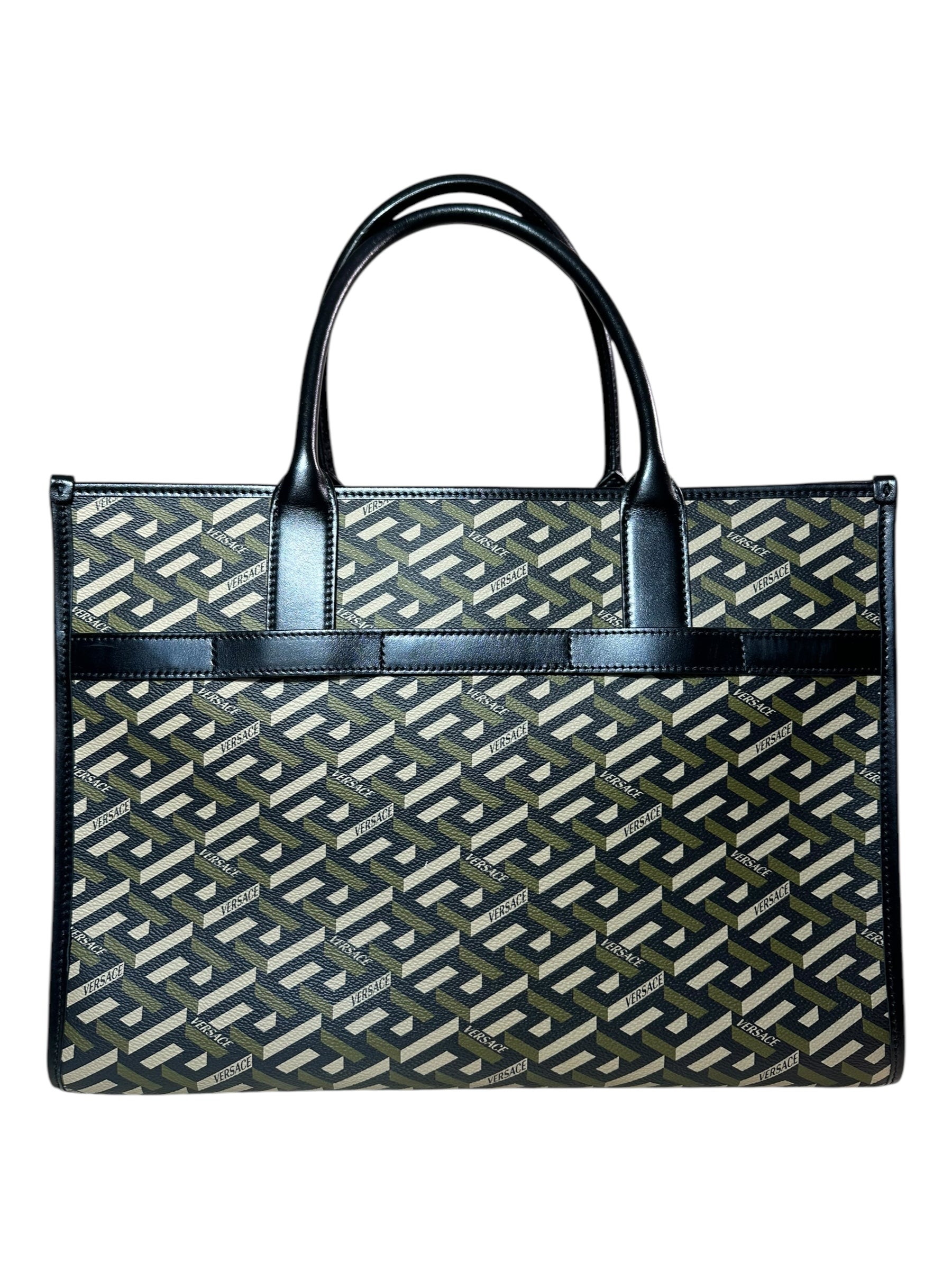 Versace borsa shopper in tela con stampa a greca, manici e tracolla rimovibile in pelle. Charms in metallo dorato con medusa sul davanti. Ampio vano all’interno con mini pochette applicata e tasca laterale. Lievissimo segno di usura nella parte posteriore vicino all’angolo. Vine spedita con dust bag.