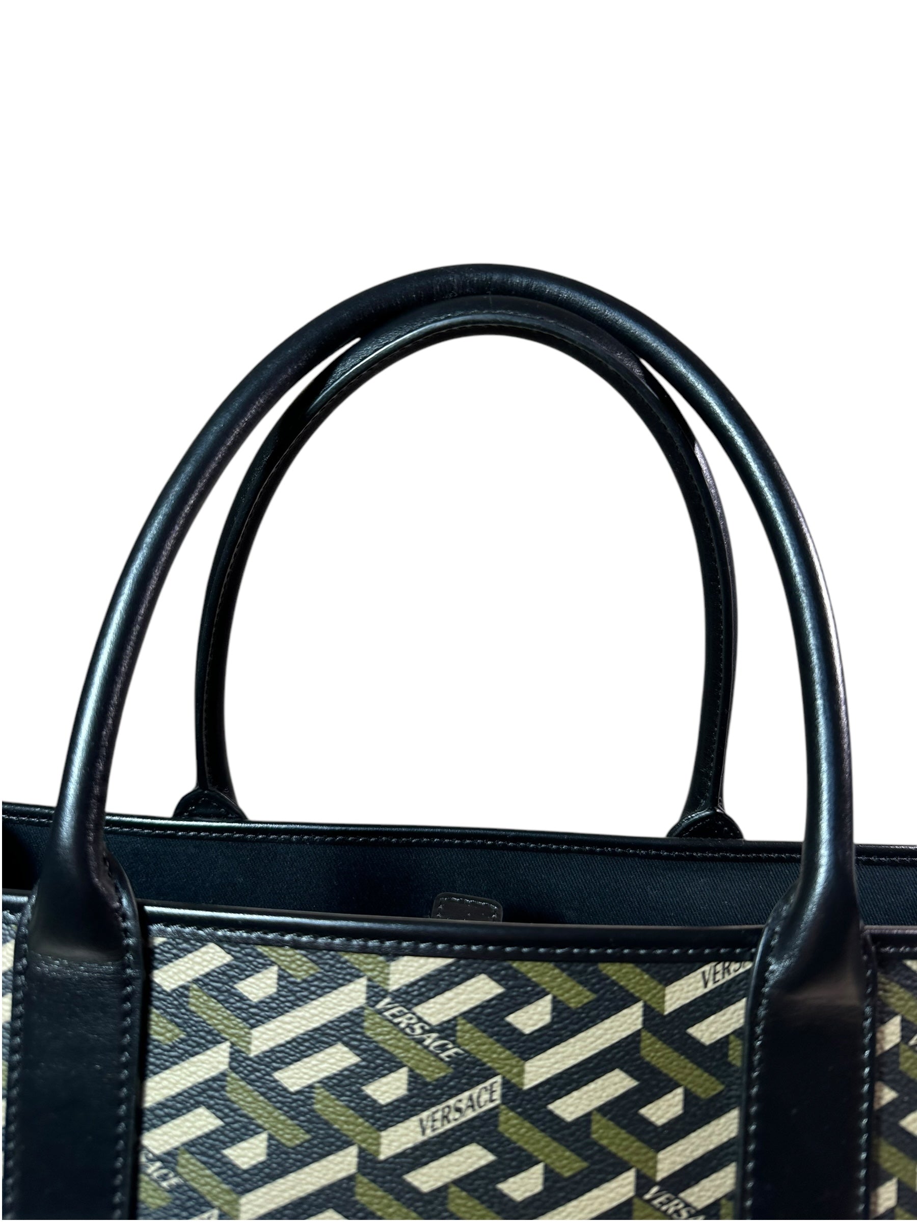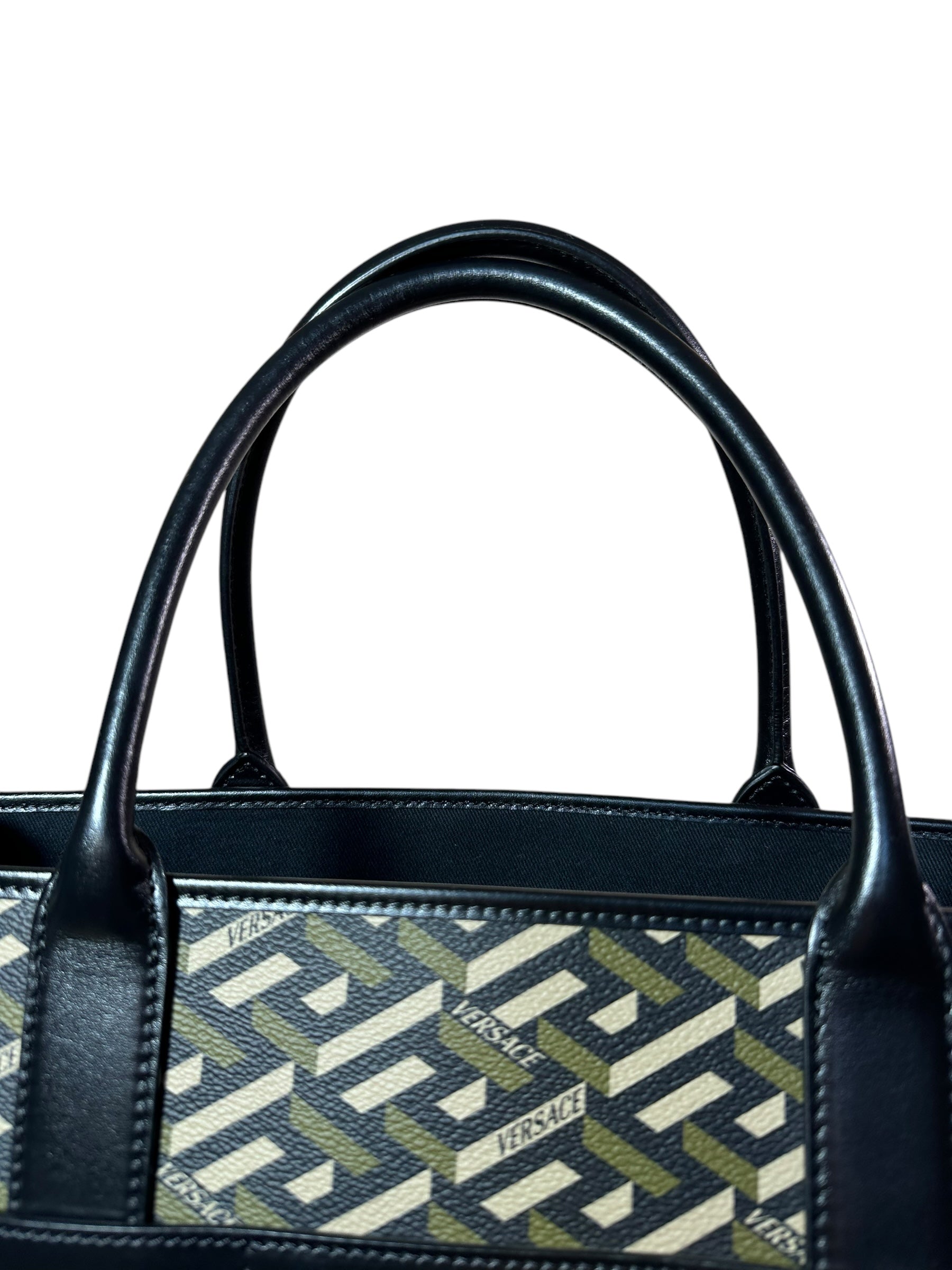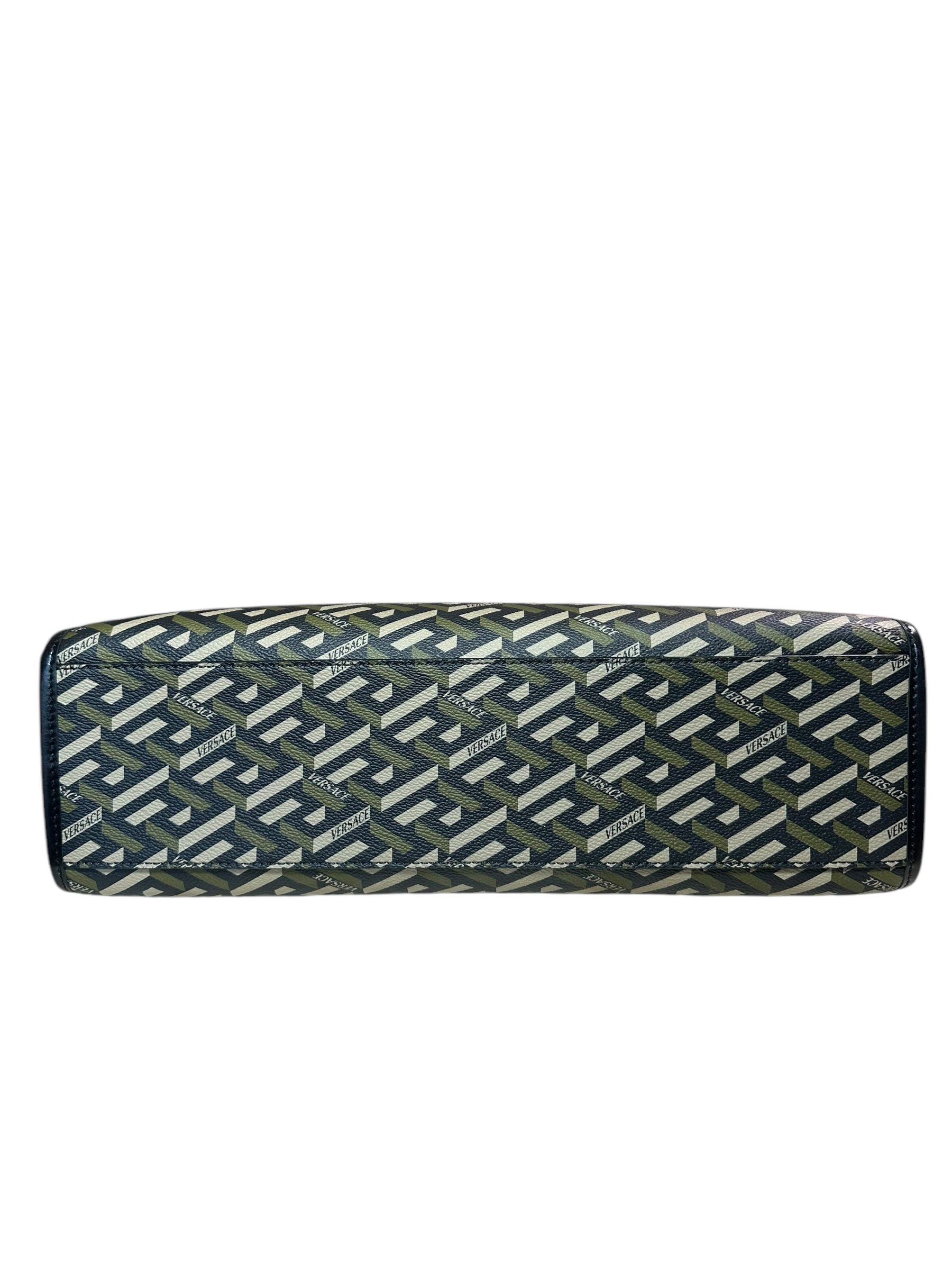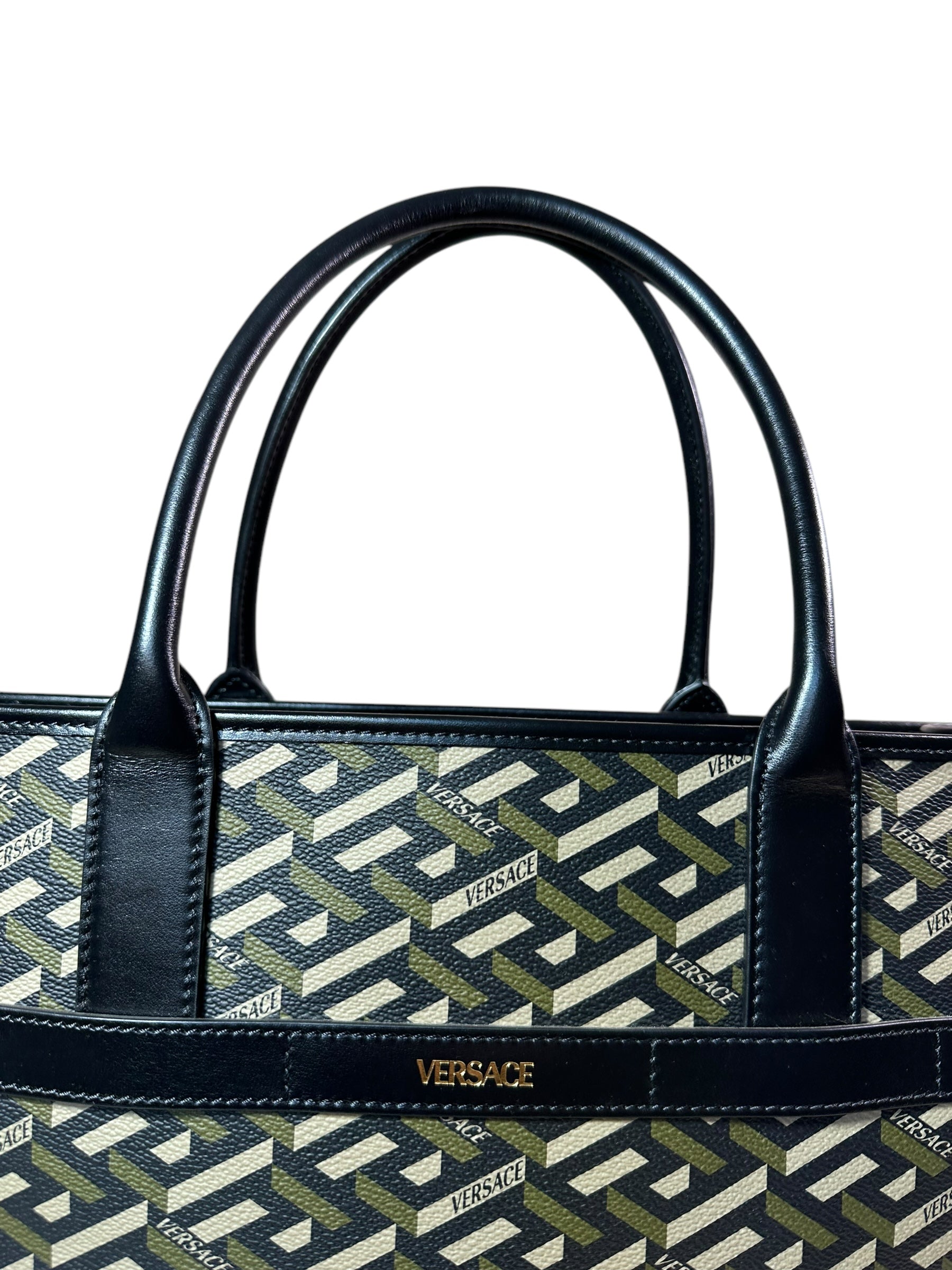 Versace borsa shopper in tela con stampa a greca, manici e tracolla rimovibile in pelle. Charms in metallo dorato con medusa sul davanti. Ampio vano all’interno con mini pochette applicata e tasca laterale. Lievissimo segno di usura nella parte posteriore vicino all’angolo. Vine spedita con dust bag.