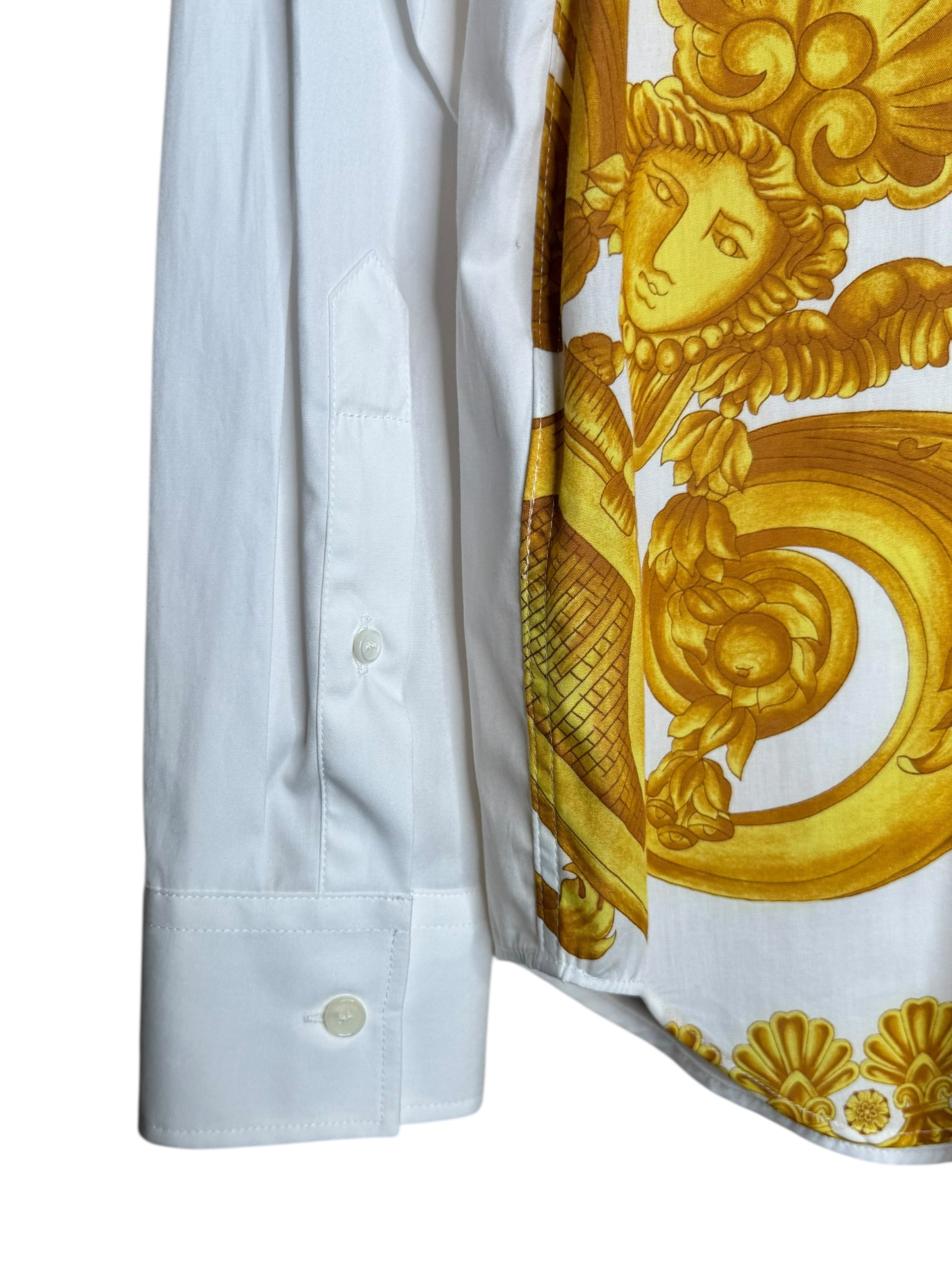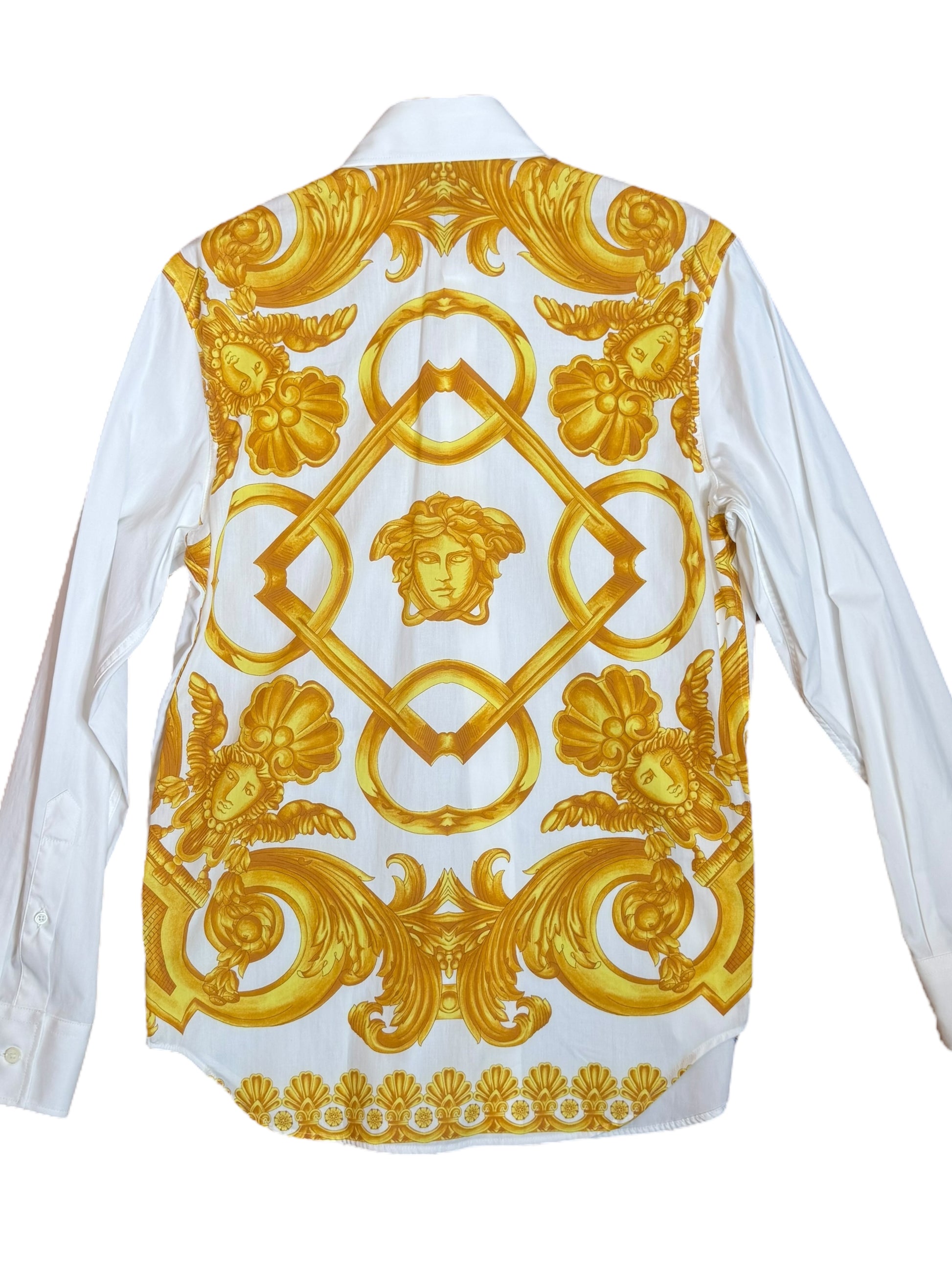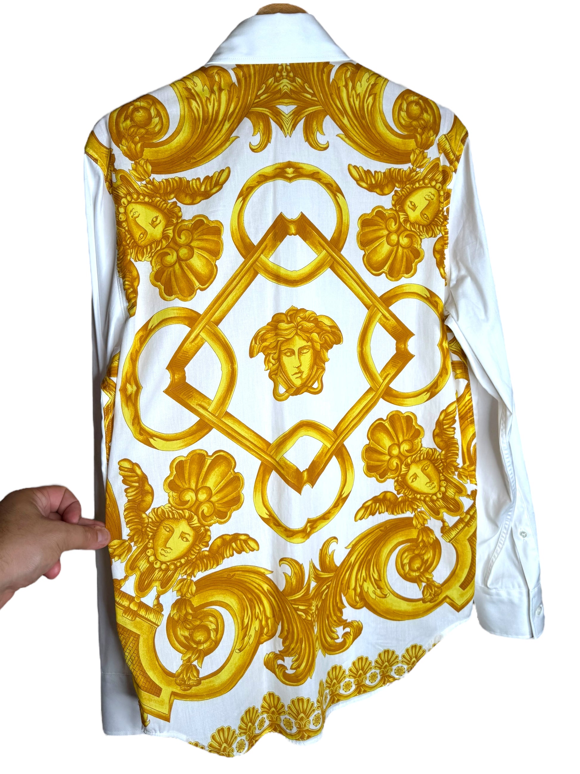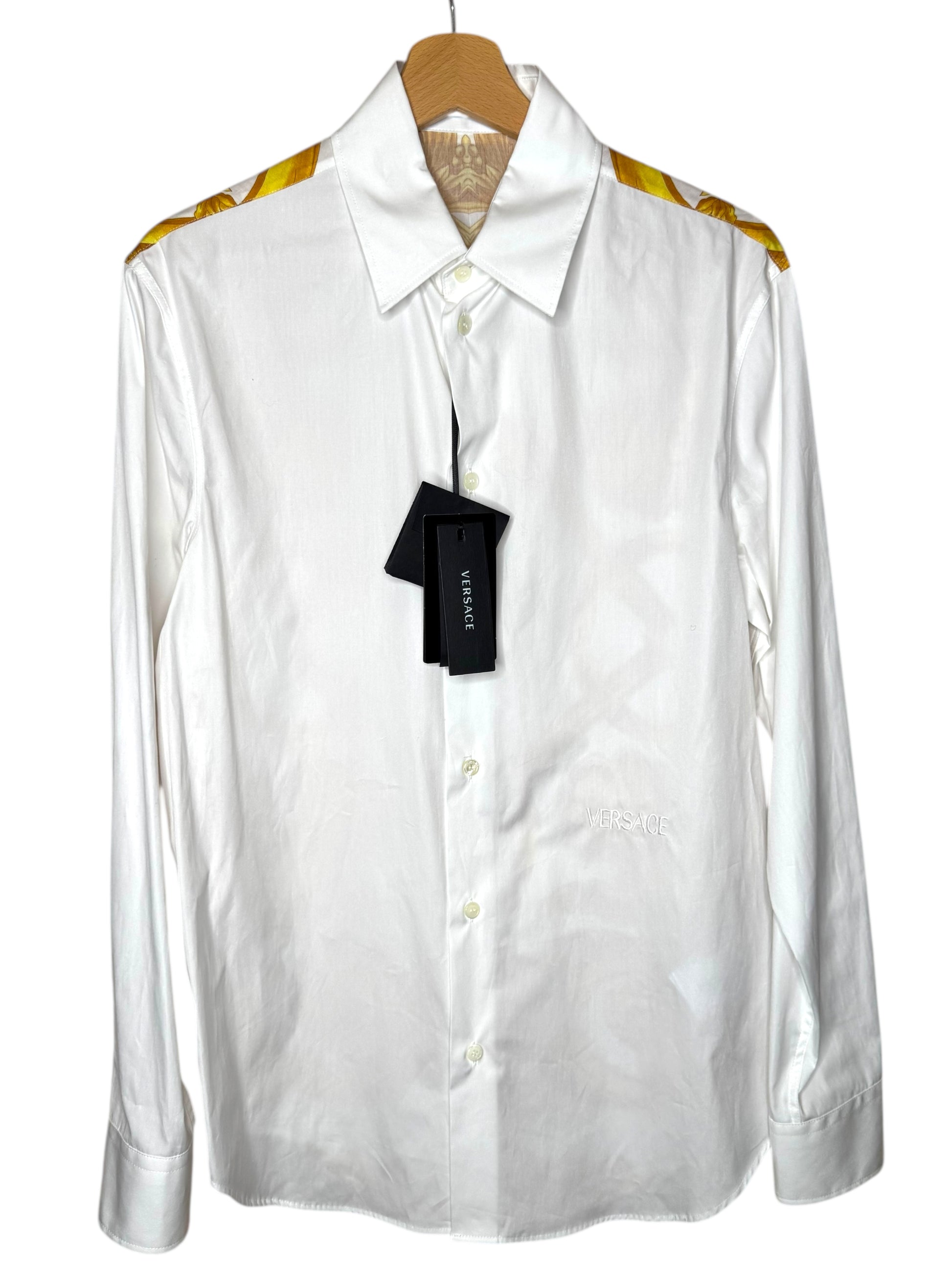 Camicia uomo Versace della linea contemporanea, modello “Informal Shirt” in cotone bianco con ricamo logo frontale e inserti stampa Barocco Heritage oro sulle spalle e interamente sul retro. Realizzata in pregiato cotone, con dettagli in poliestere per il ricamo. Prodotto nuovo con cartellino originale e NFC Medusa per verifica autenticità. Prezzo retail €900.