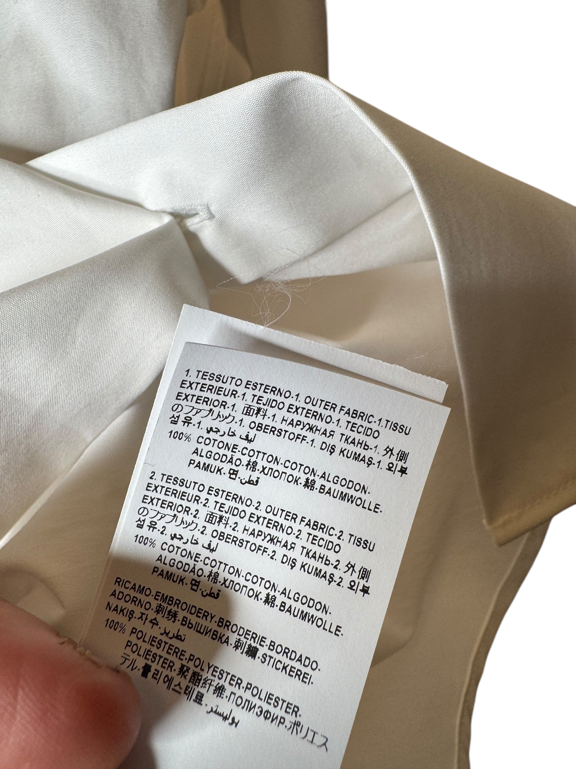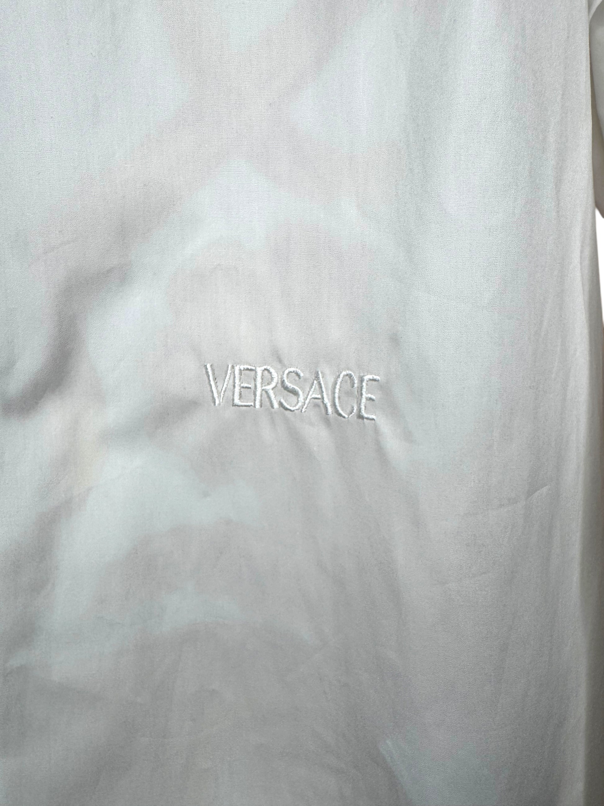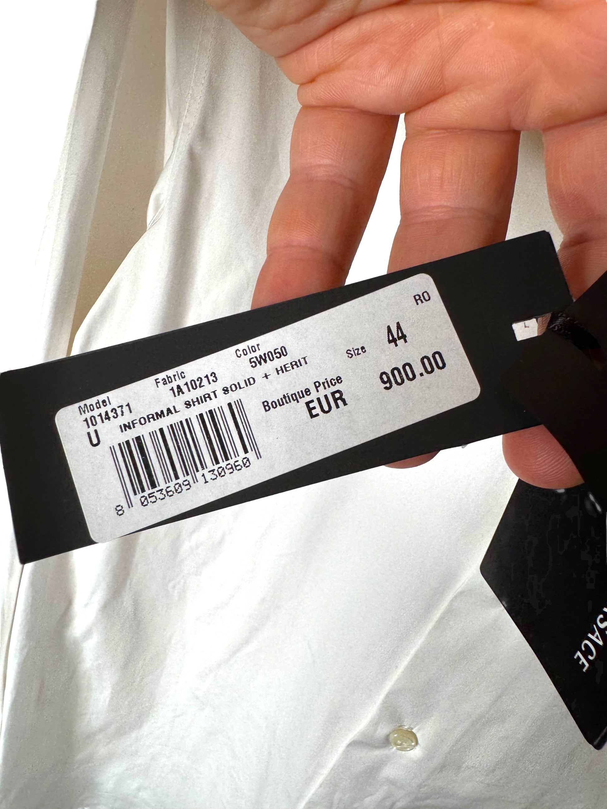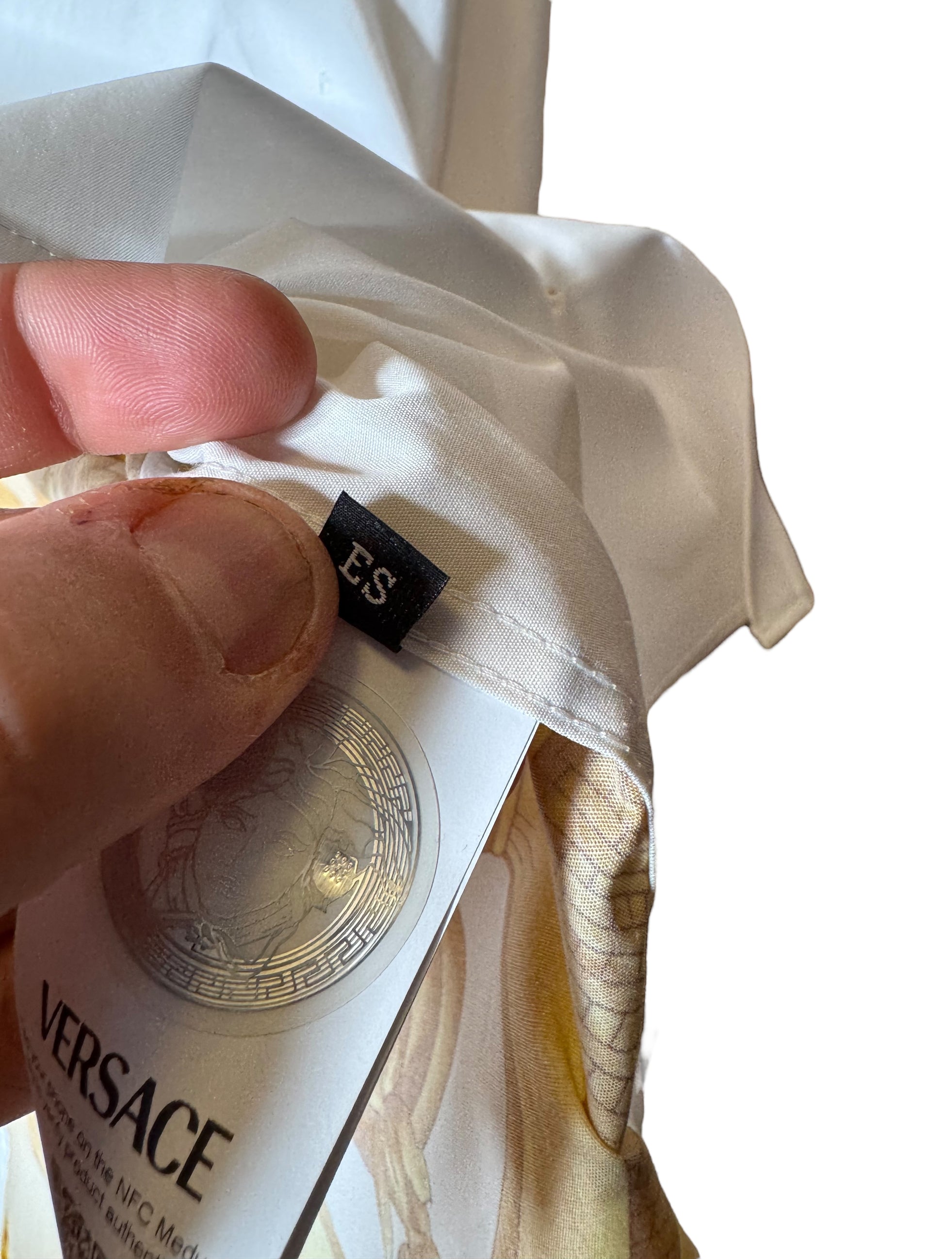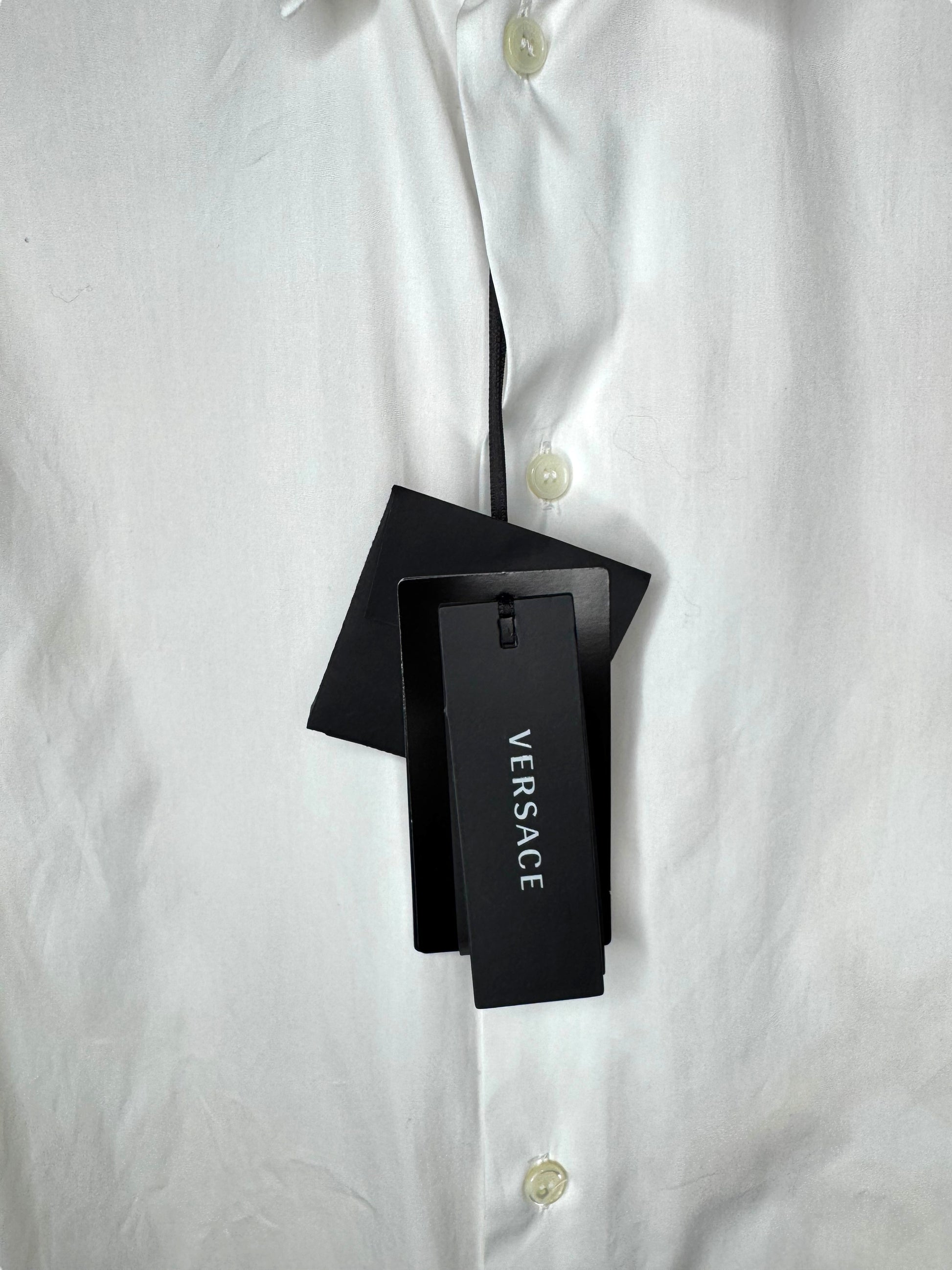 Camicia uomo Versace della linea contemporanea, modello “Informal Shirt” in cotone bianco con ricamo logo frontale e inserti stampa Barocco Heritage oro sulle spalle e interamente sul retro. Realizzata in pregiato cotone, con dettagli in poliestere per il ricamo. Prodotto nuovo con cartellino originale e NFC Medusa per verifica autenticità. Prezzo retail €900.