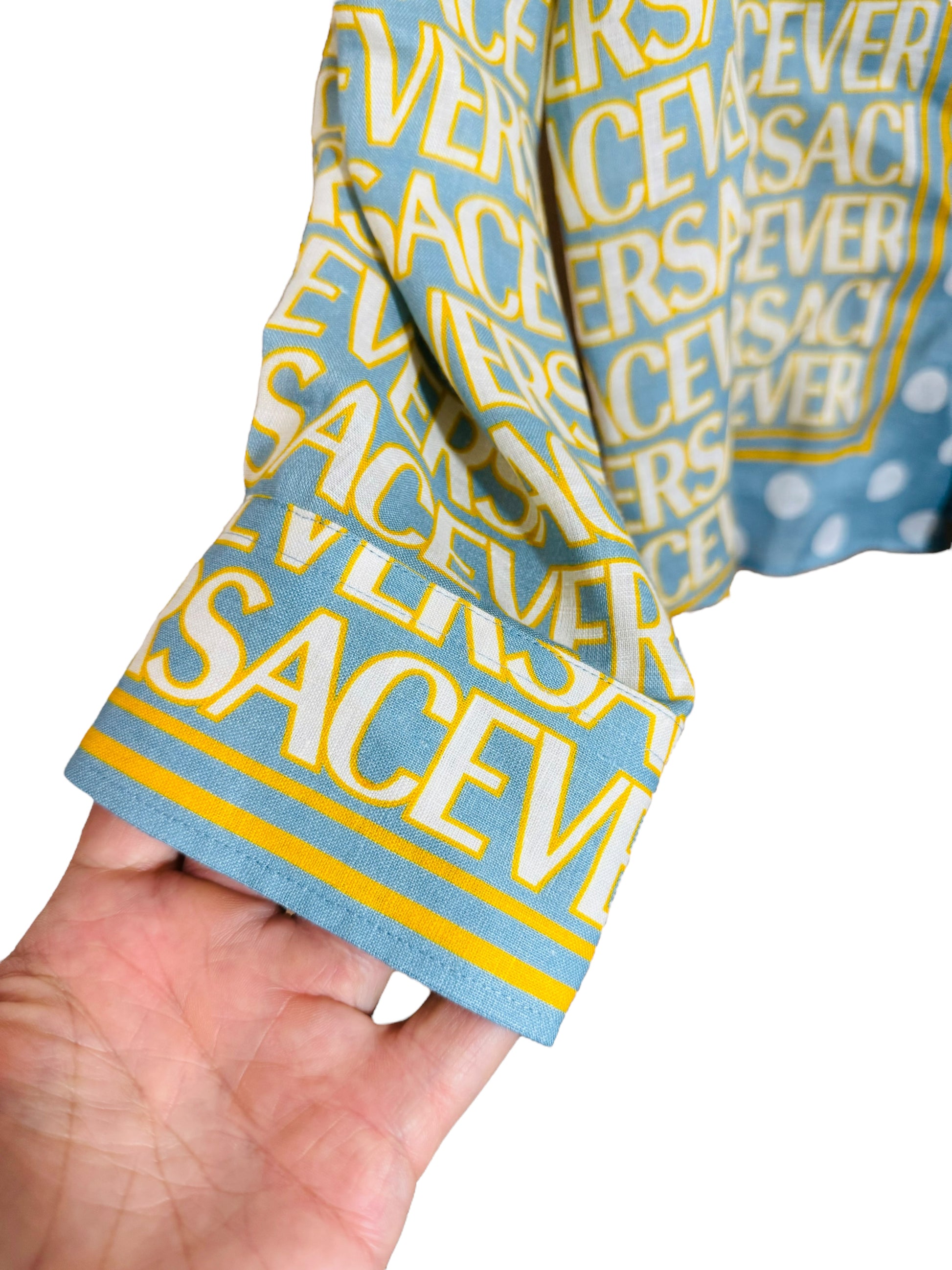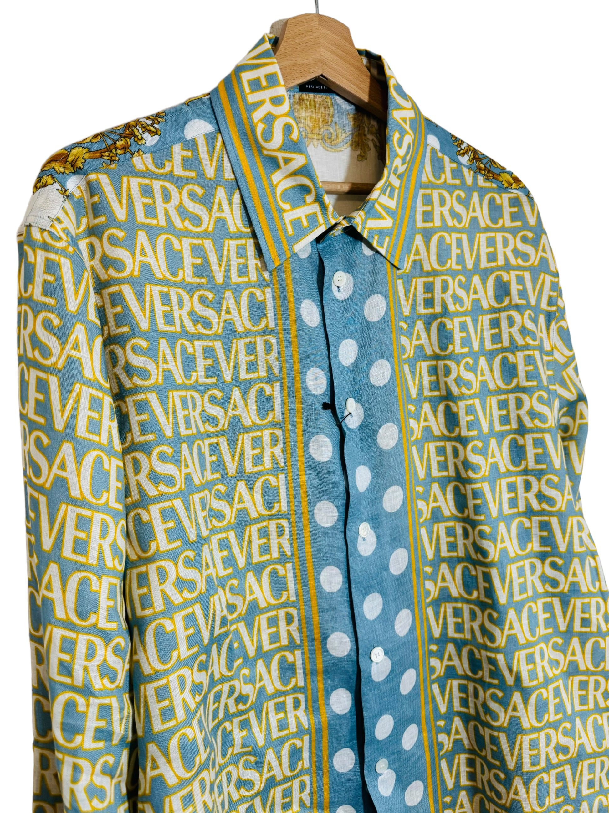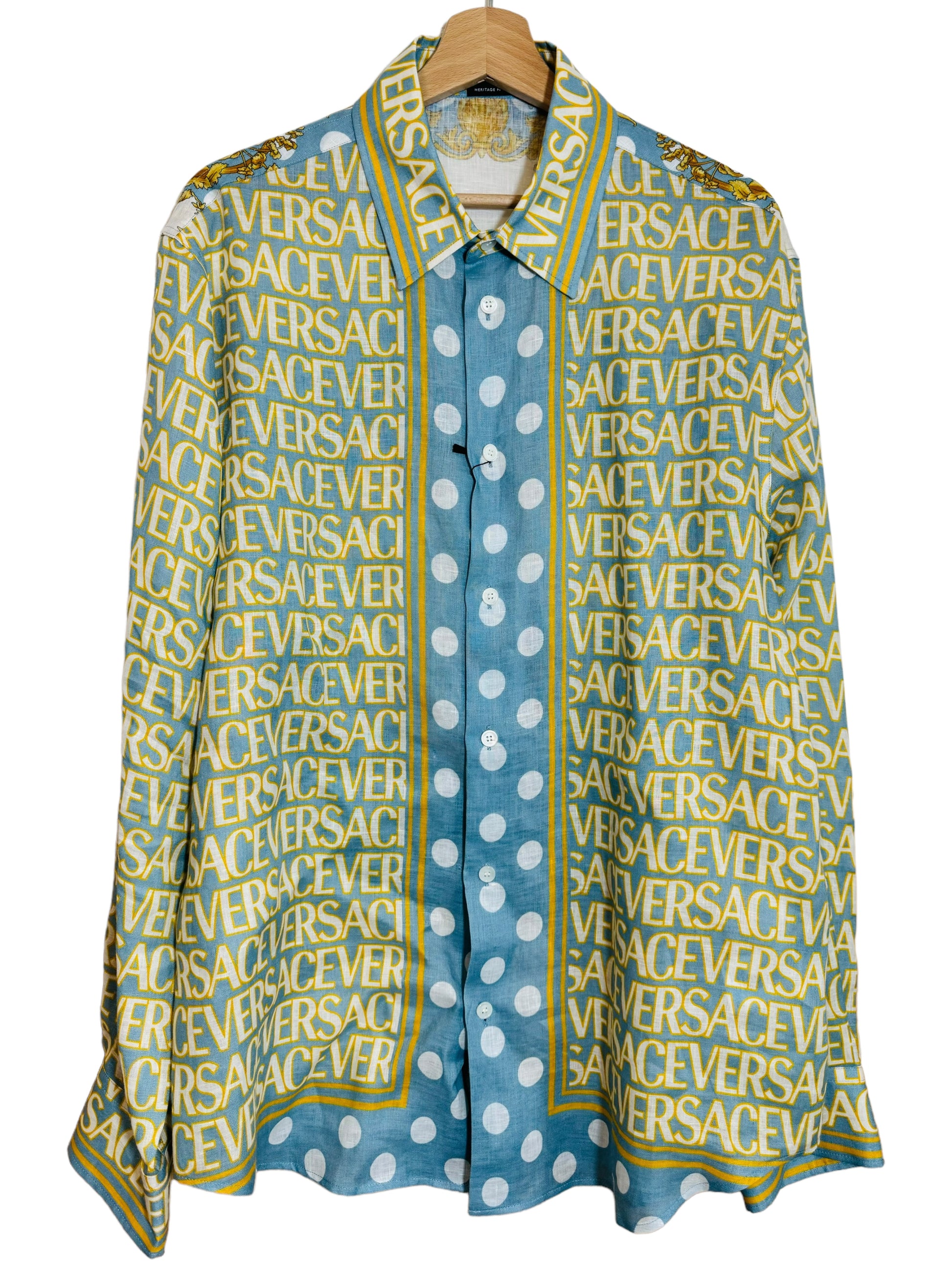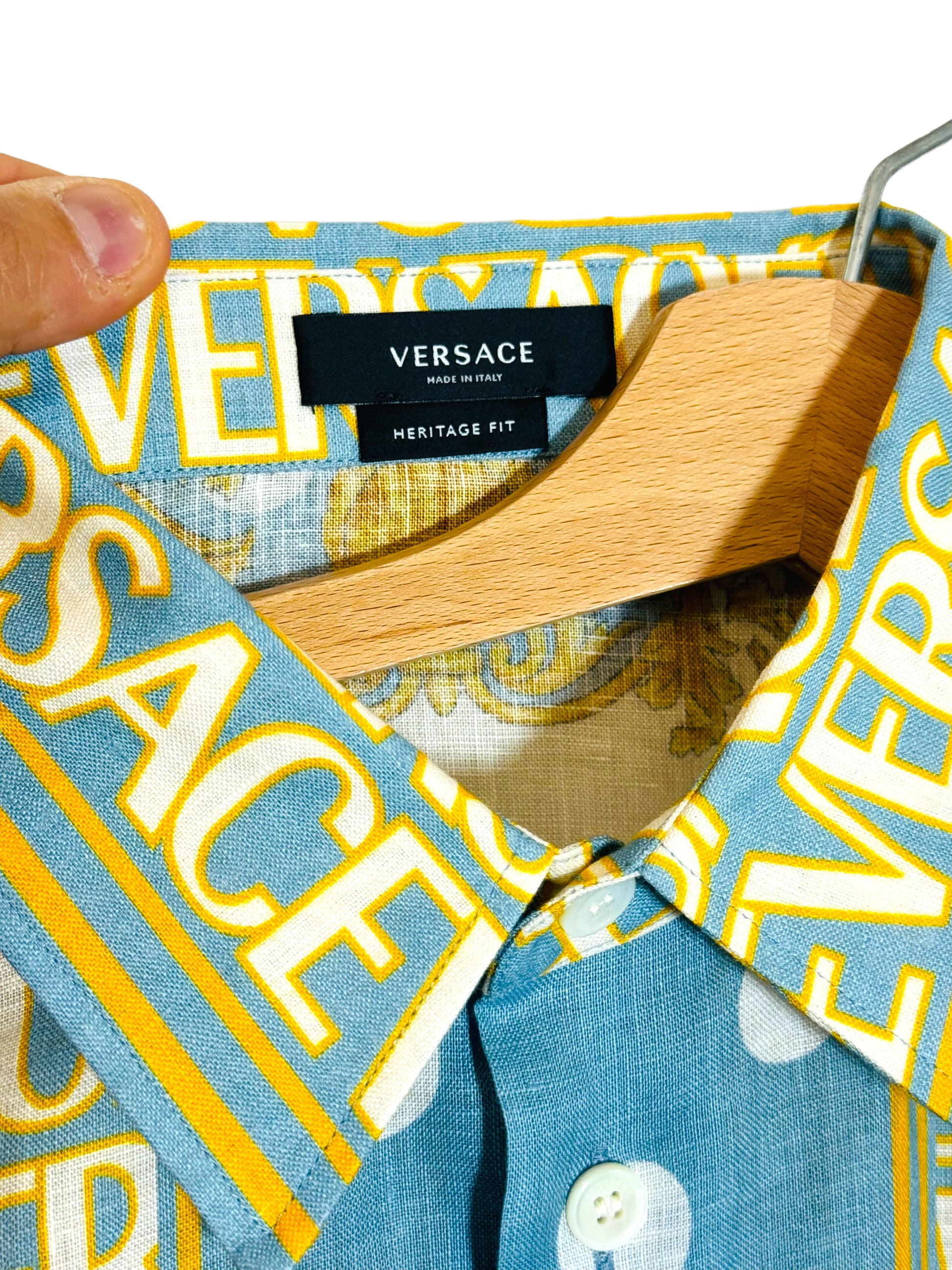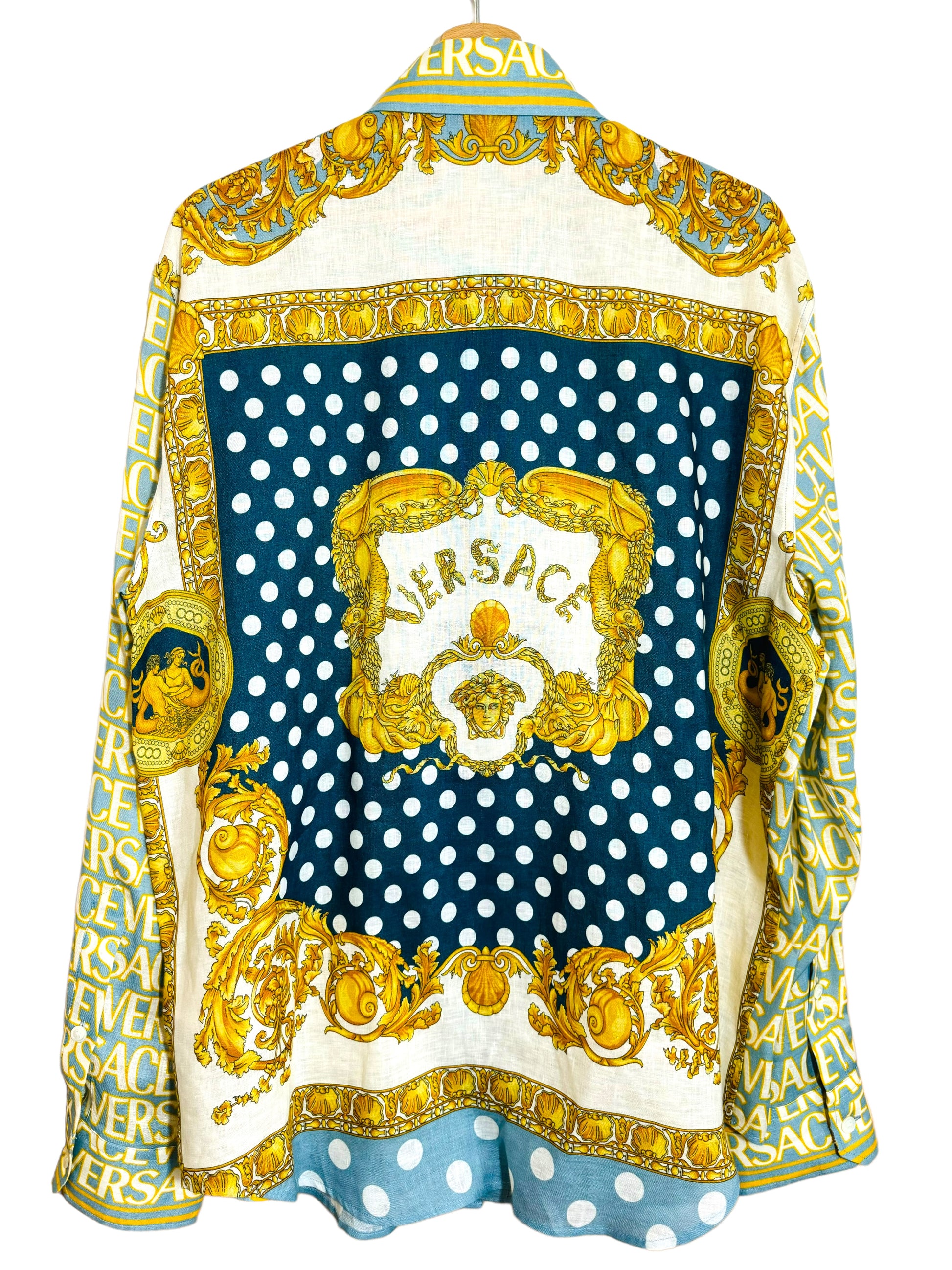 Versace camicia in lino Con stampa all-over e pois sul davanti e barocco e pois sul retro. Mai indossata.