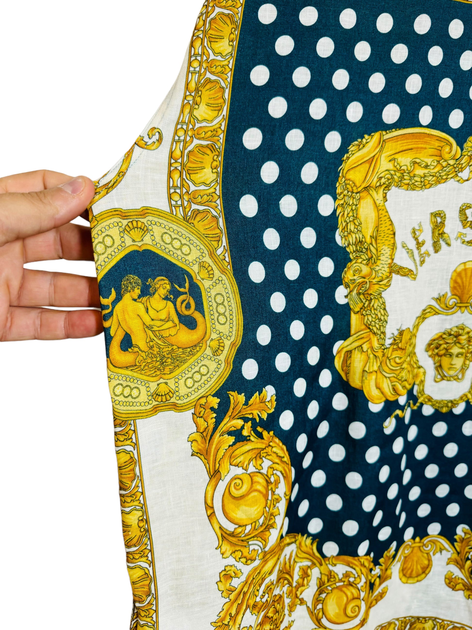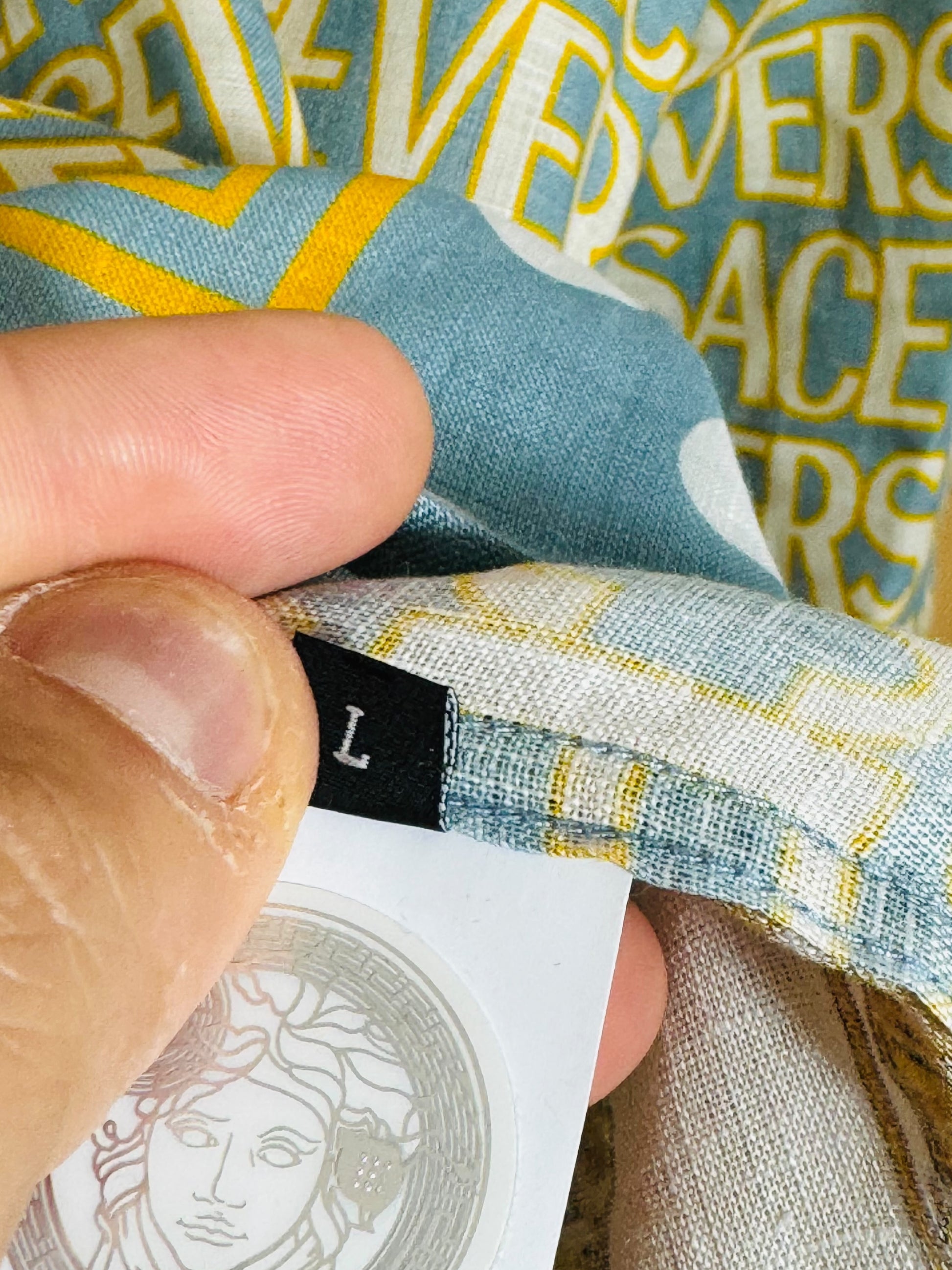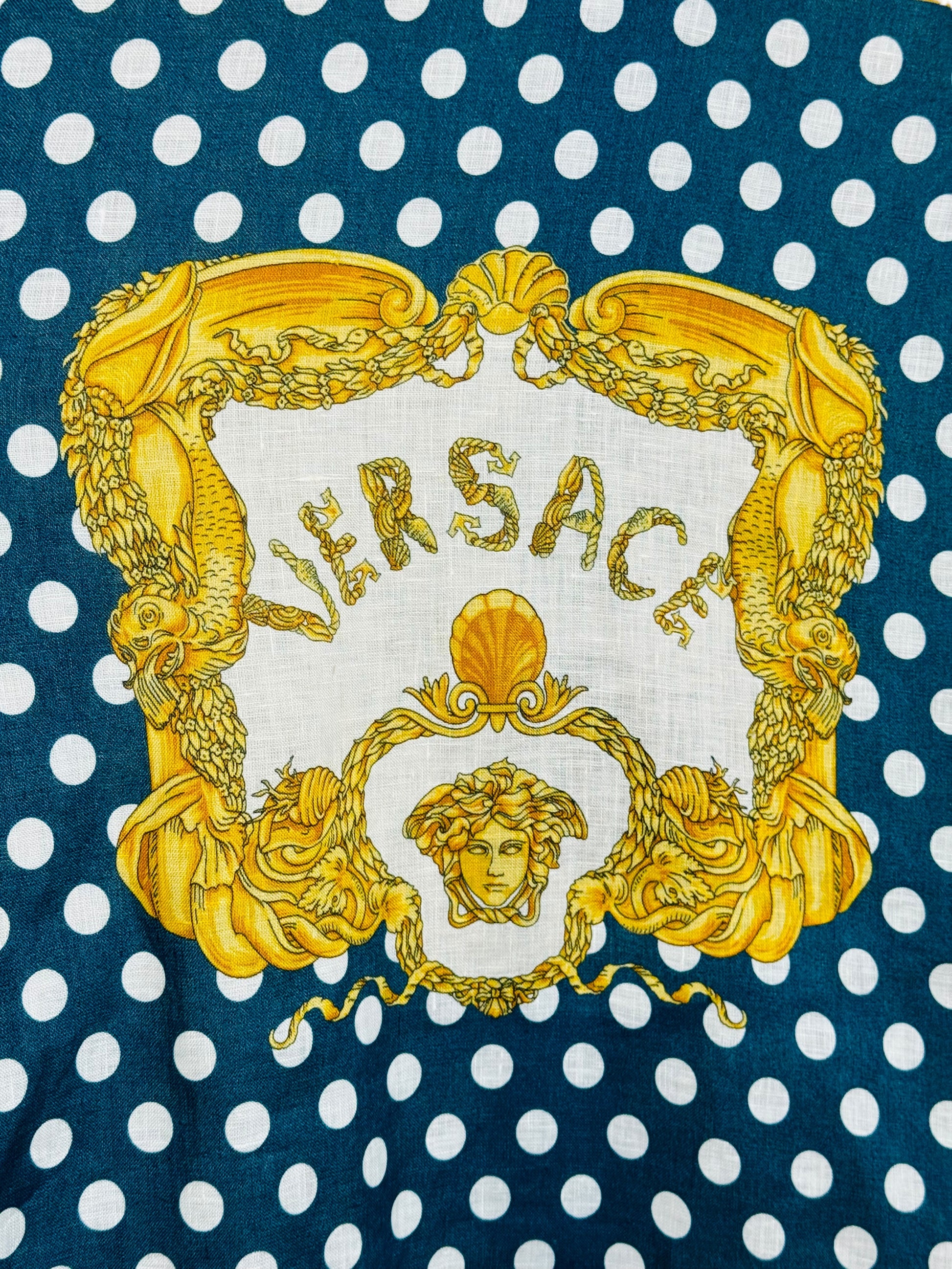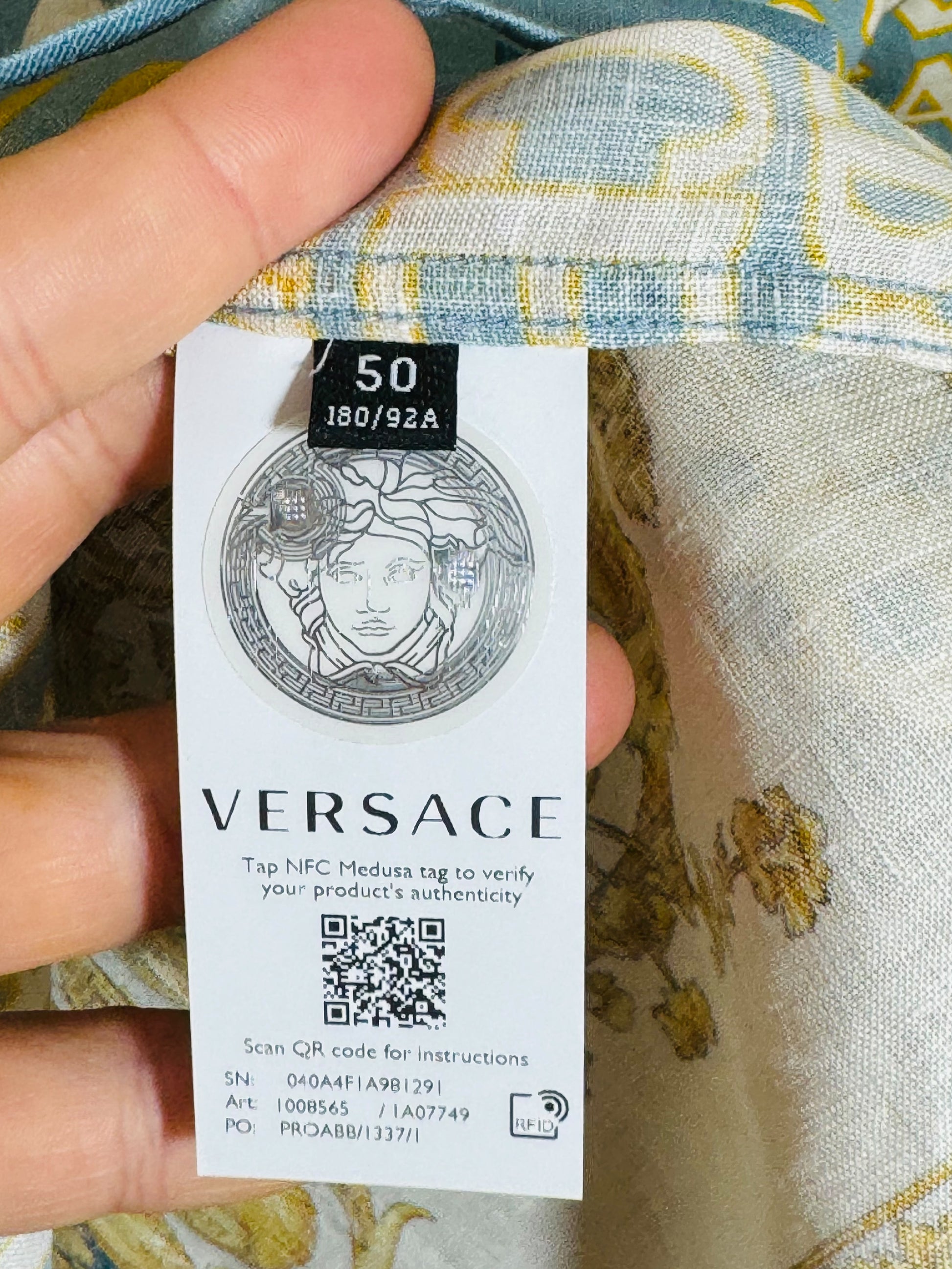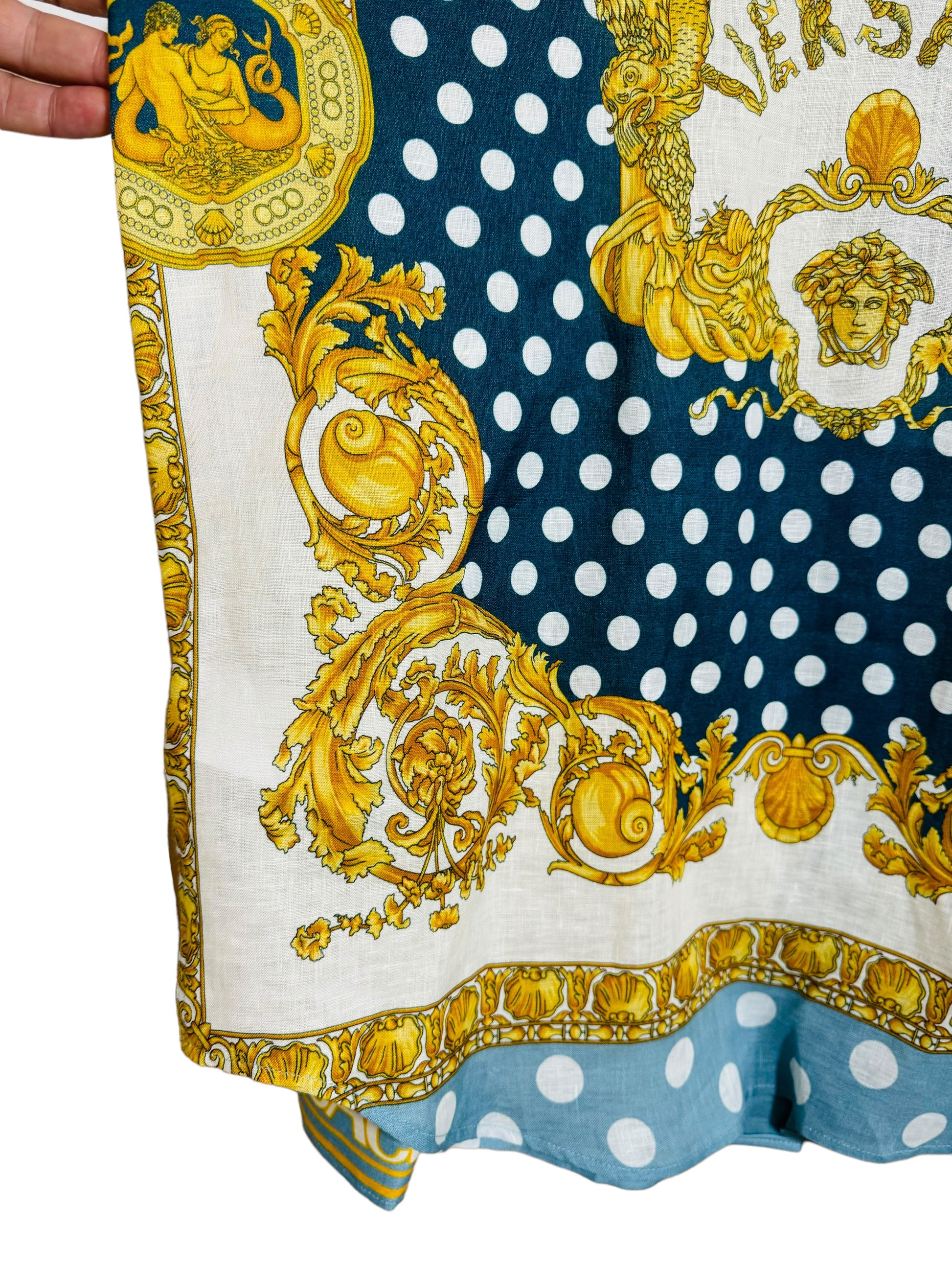 Versace camicia in lino Con stampa all-over e pois sul davanti e barocco e pois sul retro. Mai indossata.