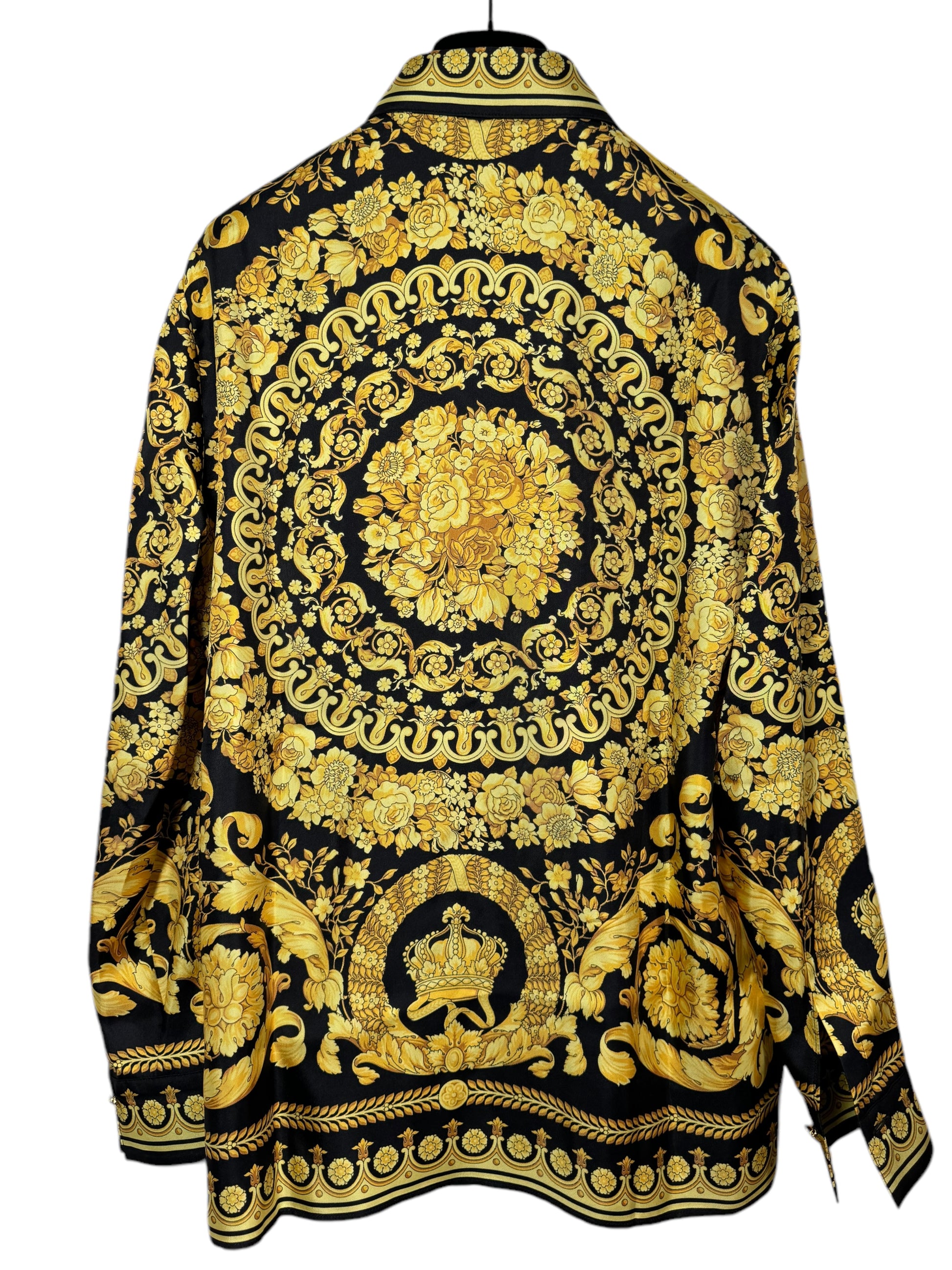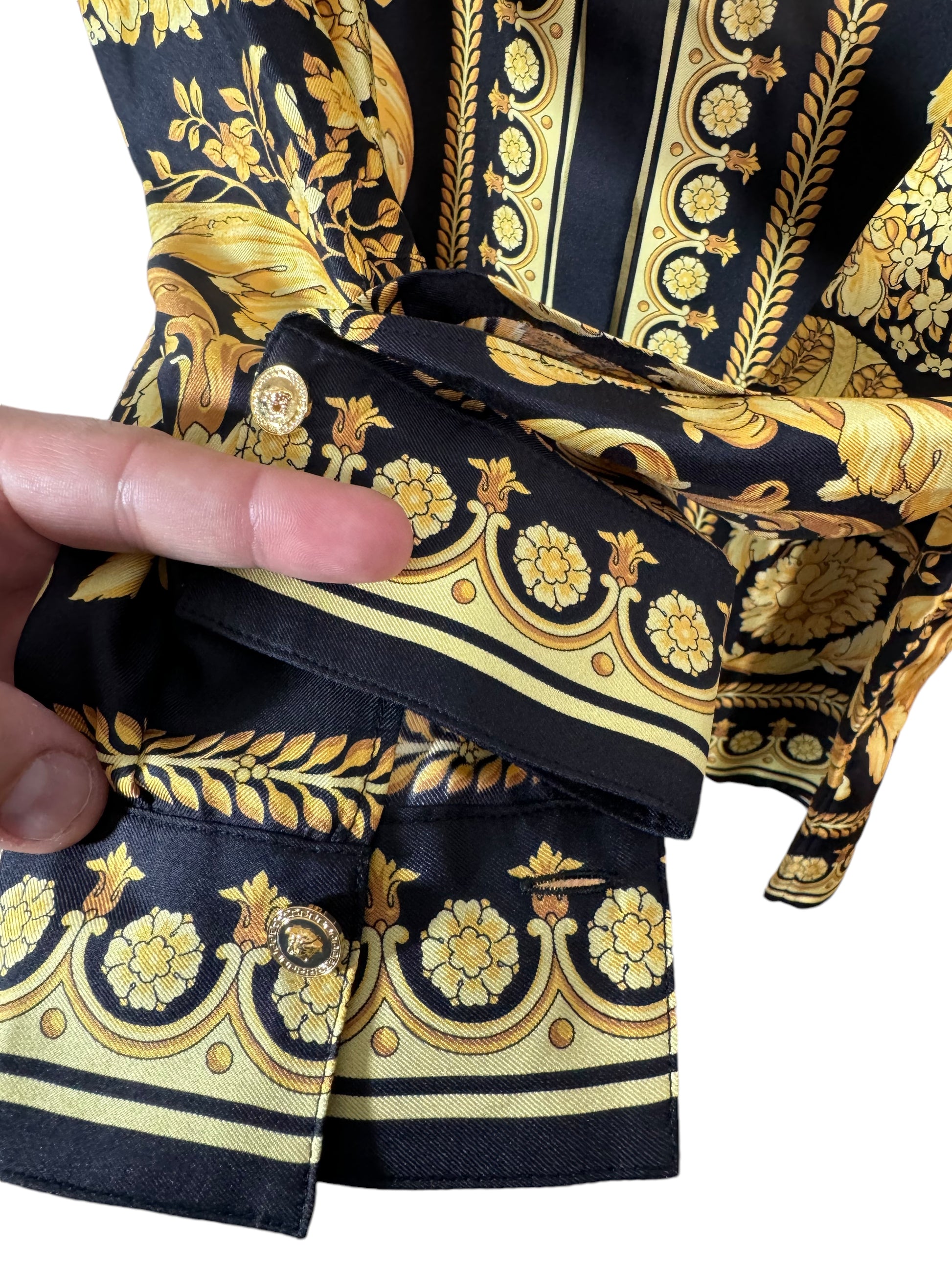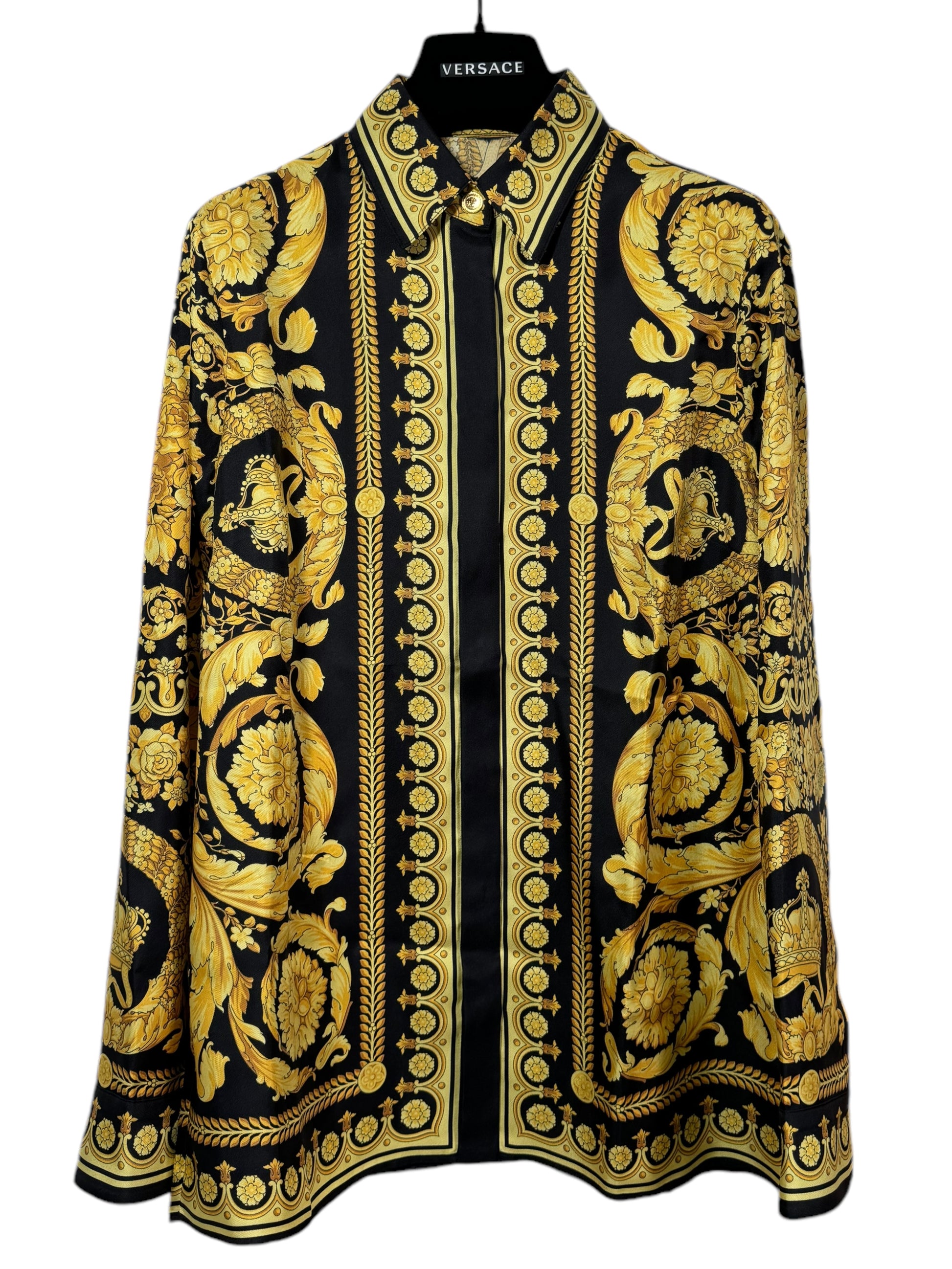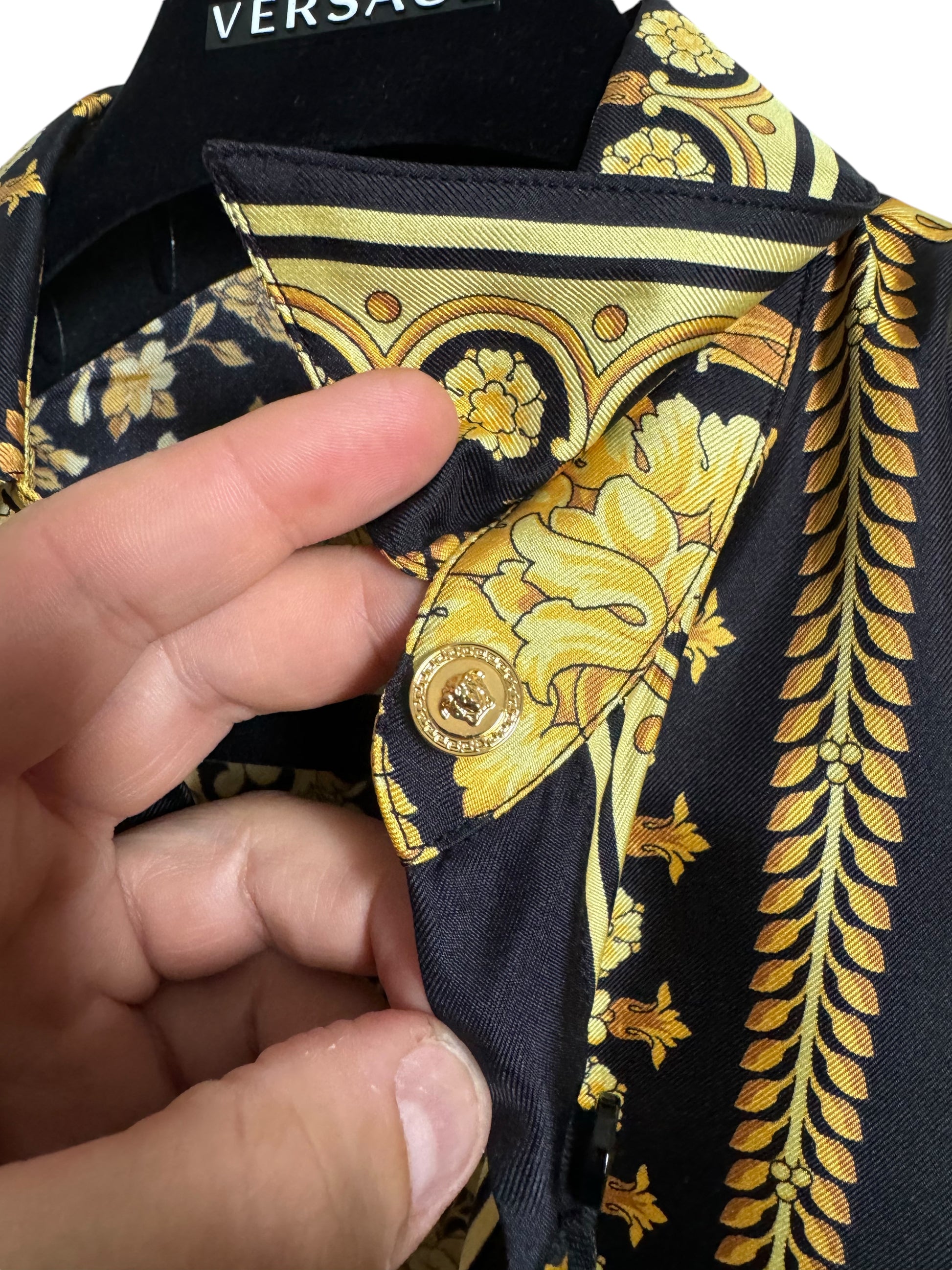Versace camicia in seta con iconica stampa barocca, bottoni dorati a testa di MEDUSA al collo e nei polsini. Colletto a punta, cannoncino con abbottonatura nascosta.