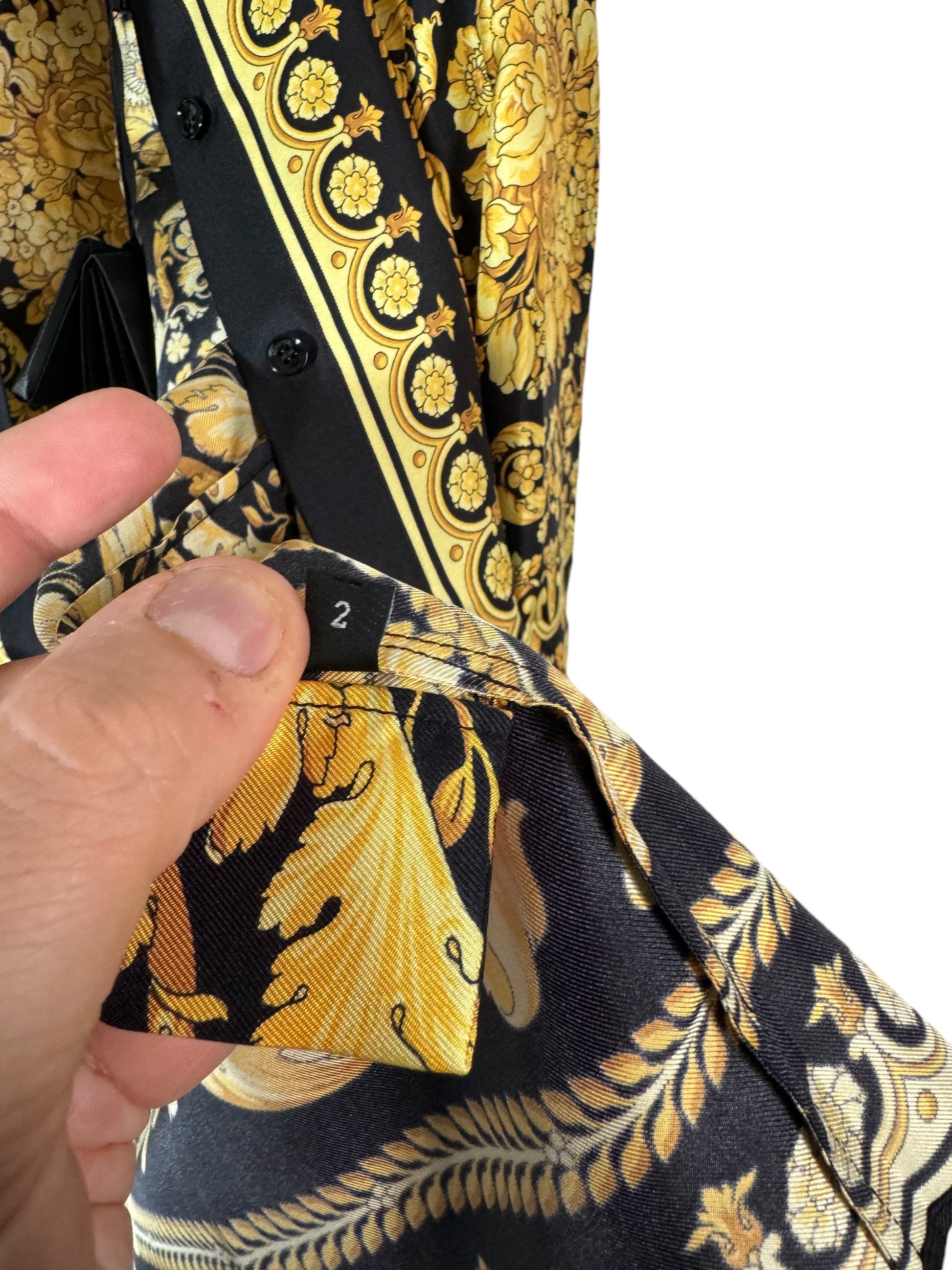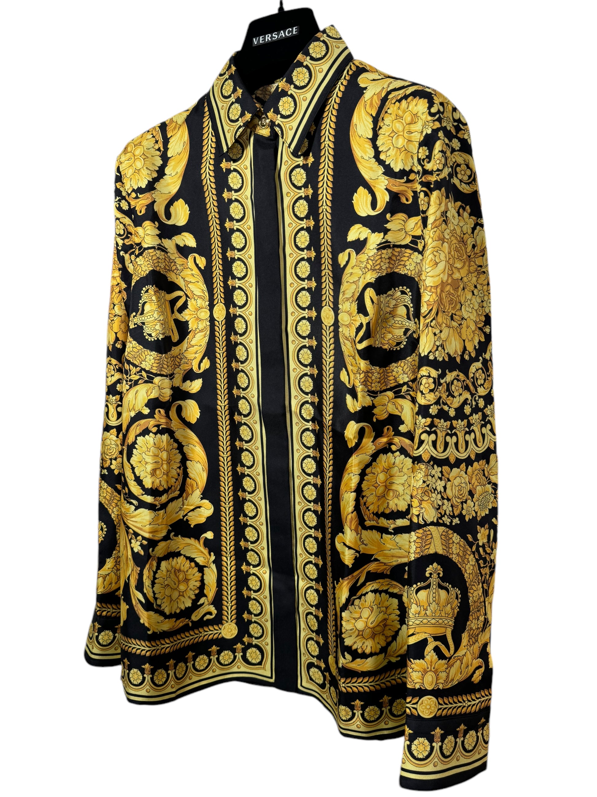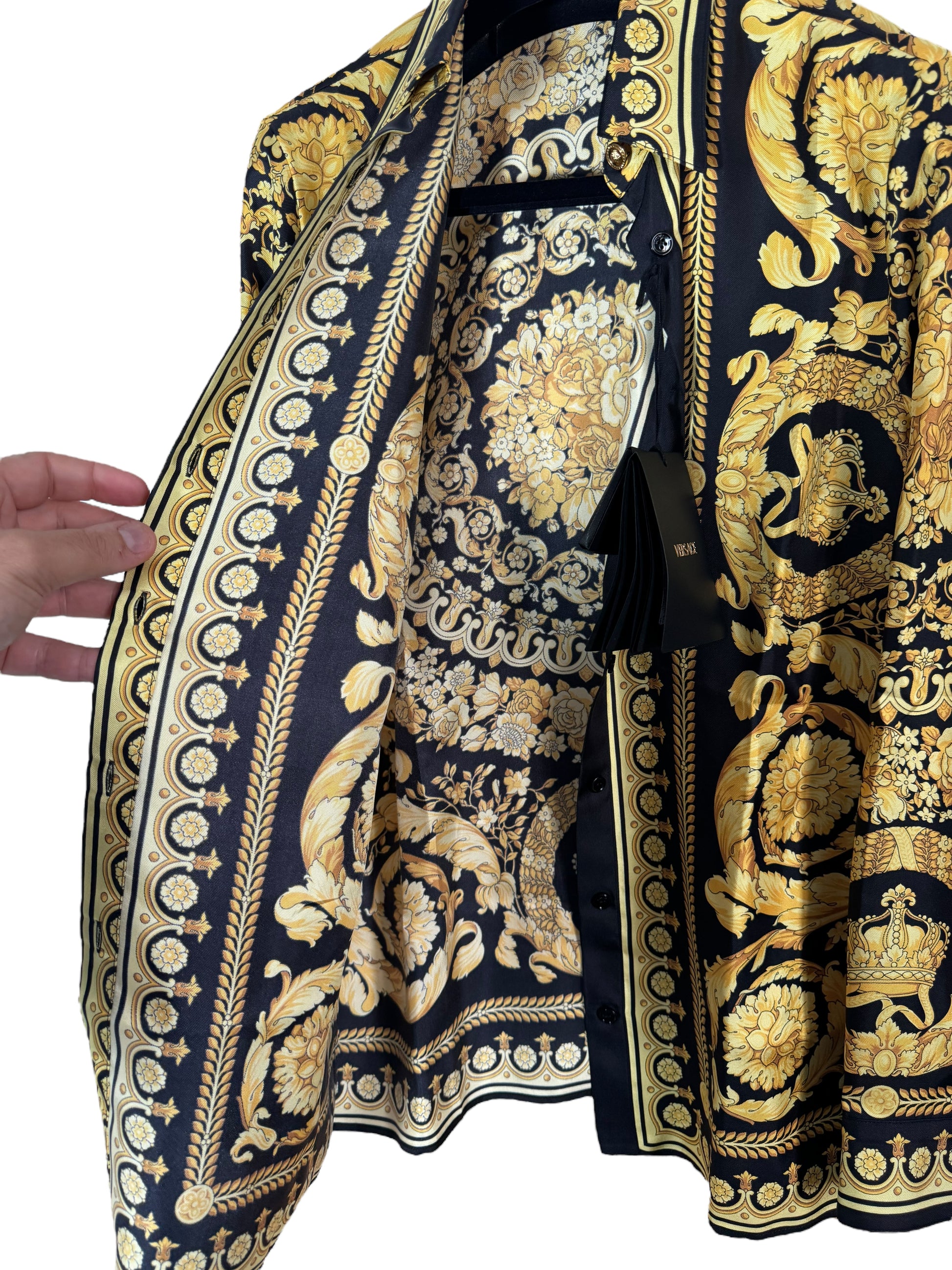Versace camicia in seta con iconica stampa barocca, bottoni dorati a testa di MEDUSA al collo e nei polsini. Colletto a punta, cannoncino con abbottonatura nascosta.