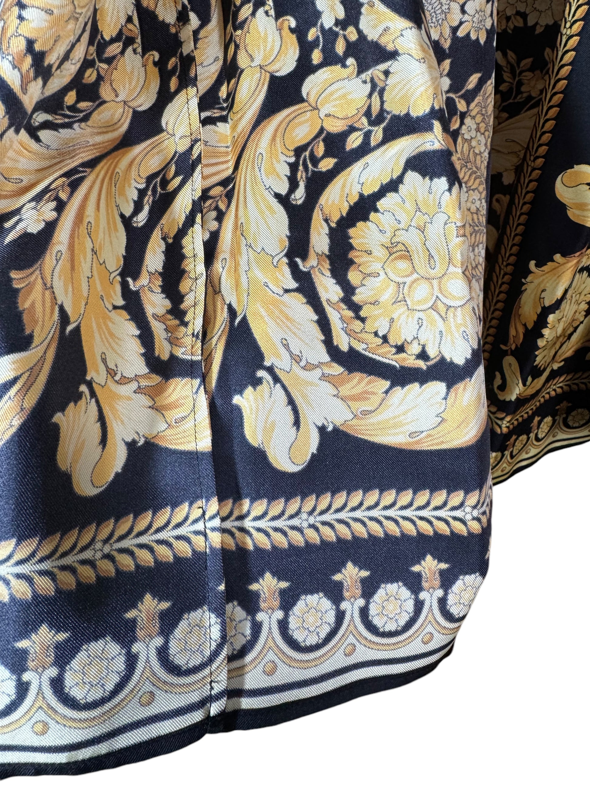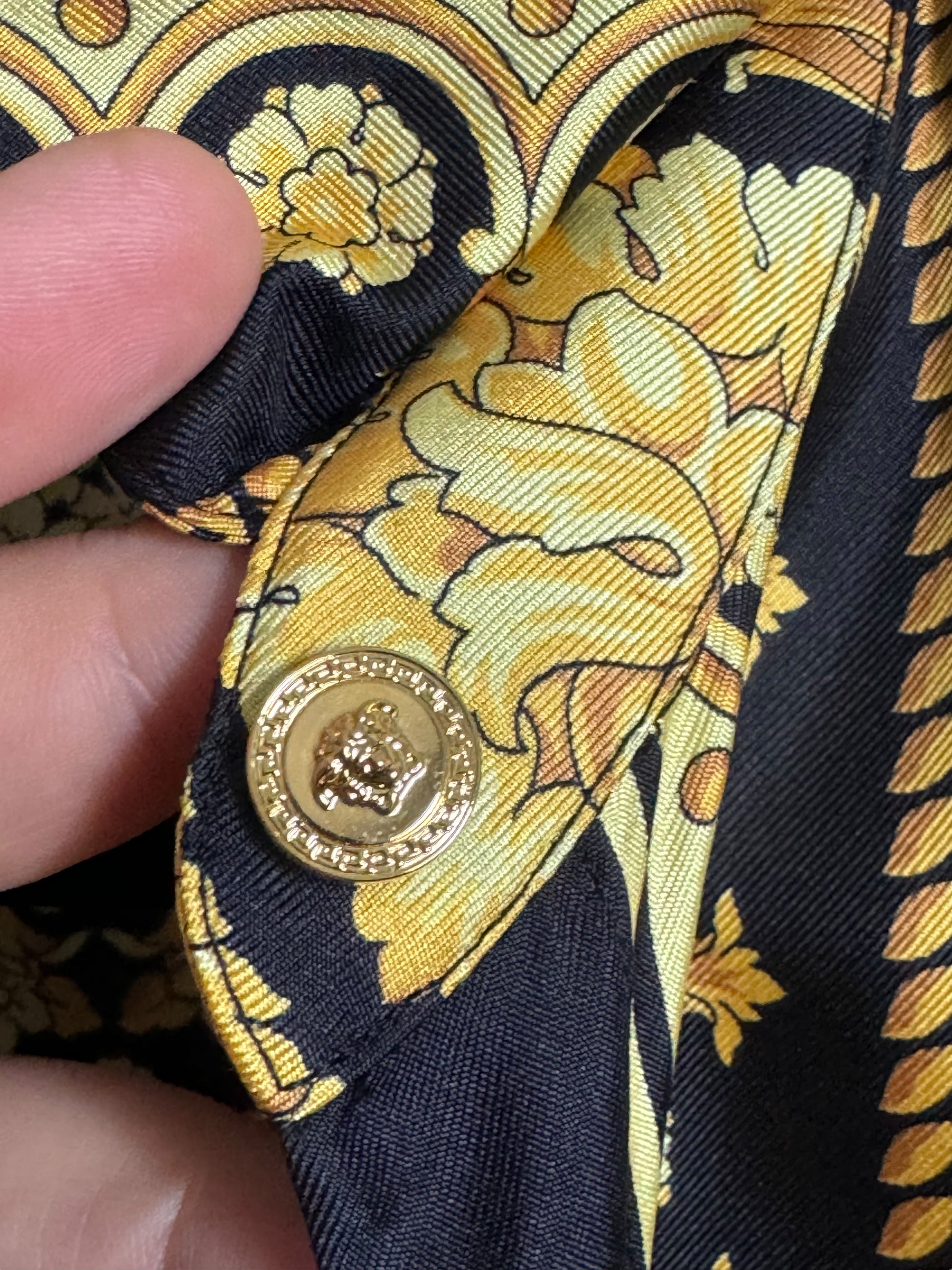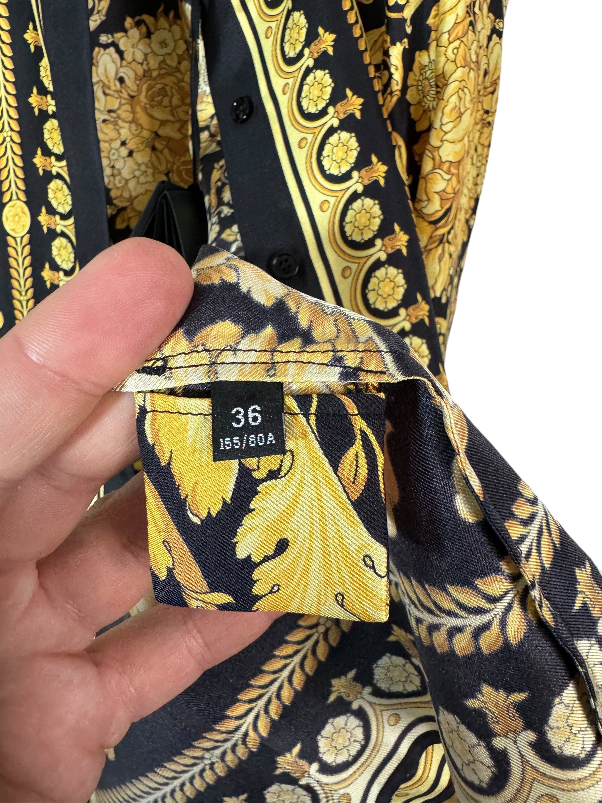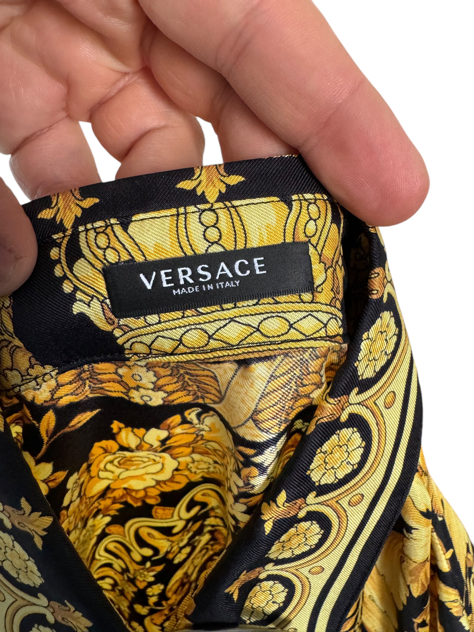 Versace camicia in seta con iconica stampa barocca, bottoni dorati a testa di MEDUSA al collo e nei polsini. Colletto a punta, cannoncino con abbottonatura nascosta.