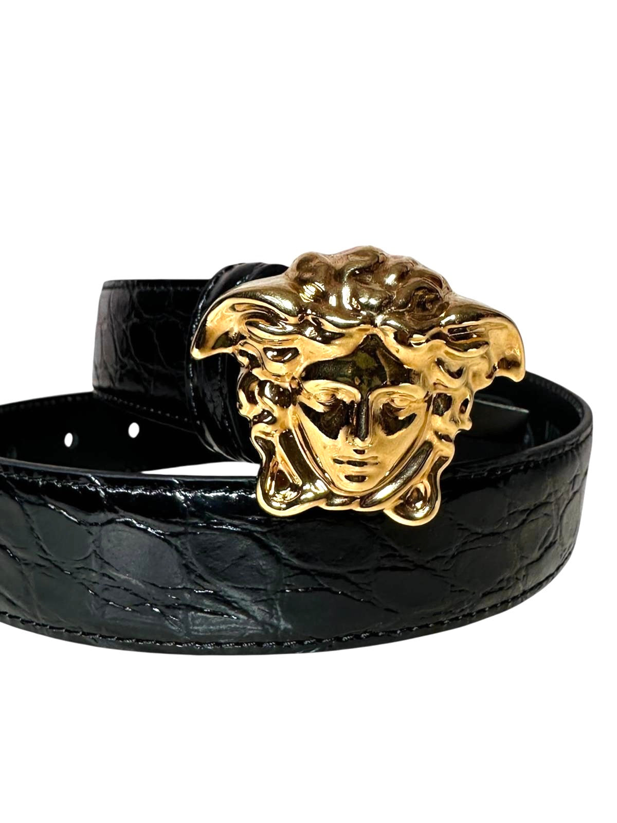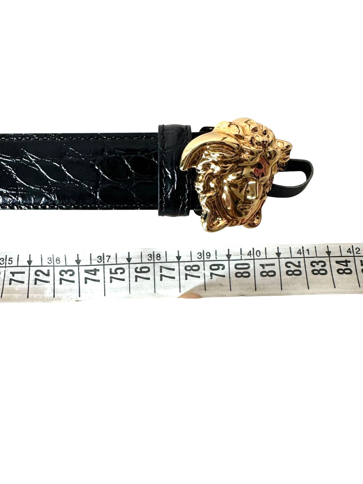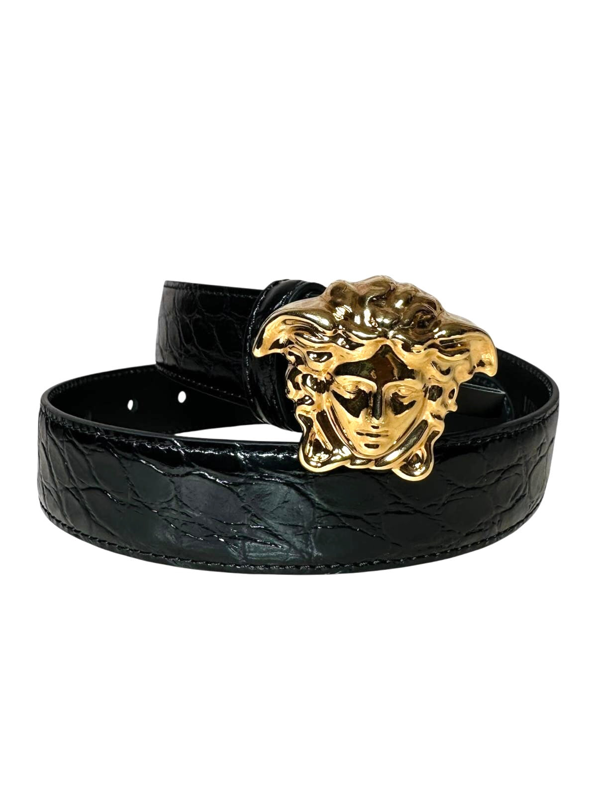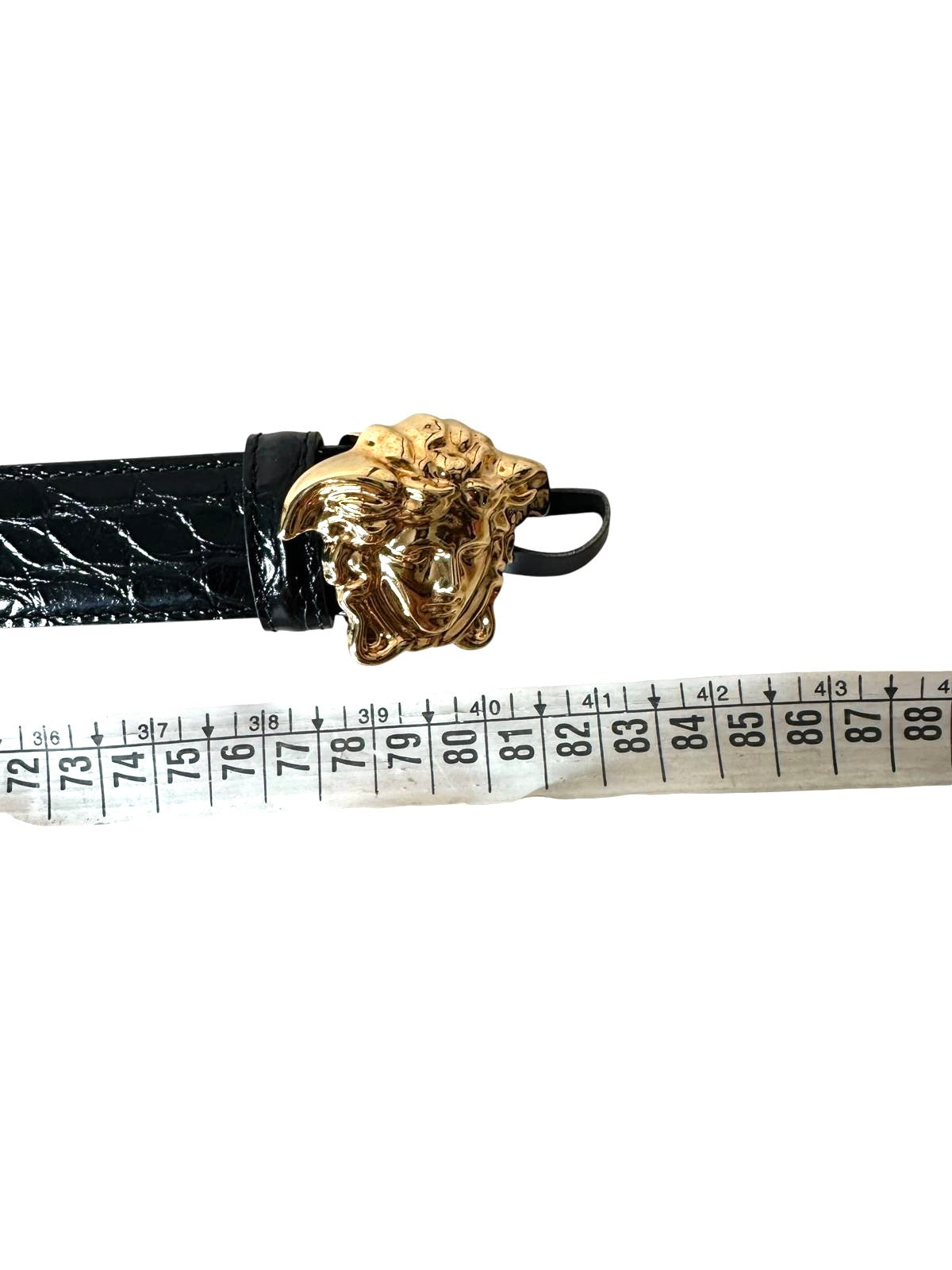 Cintura firmata Versace in pelle nera lucida con stampa effetto cocco, impreziosita dalla celebre fibbia dorata con testa di Medusa in rilievo, simbolo iconico della Maison. Il design deciso e il materiale strutturato rendono questo accessorio perfetto per completare look eleganti o grintosi.