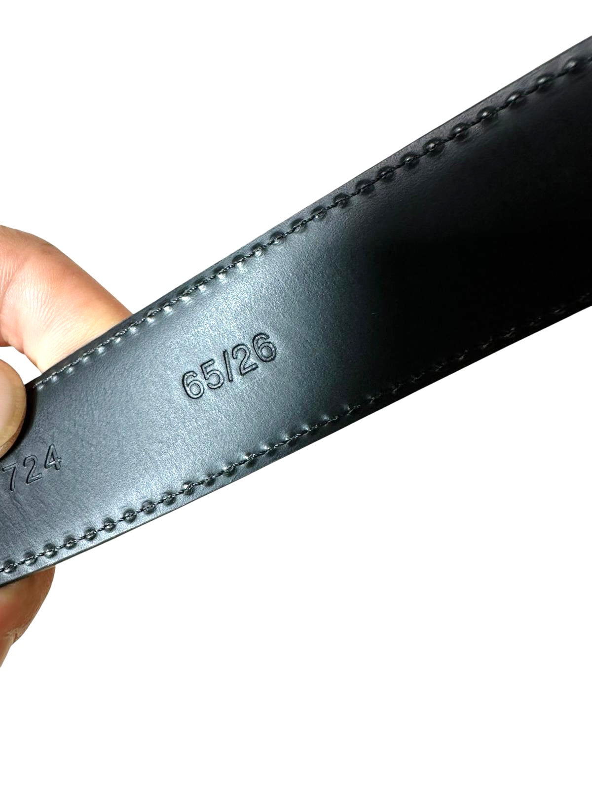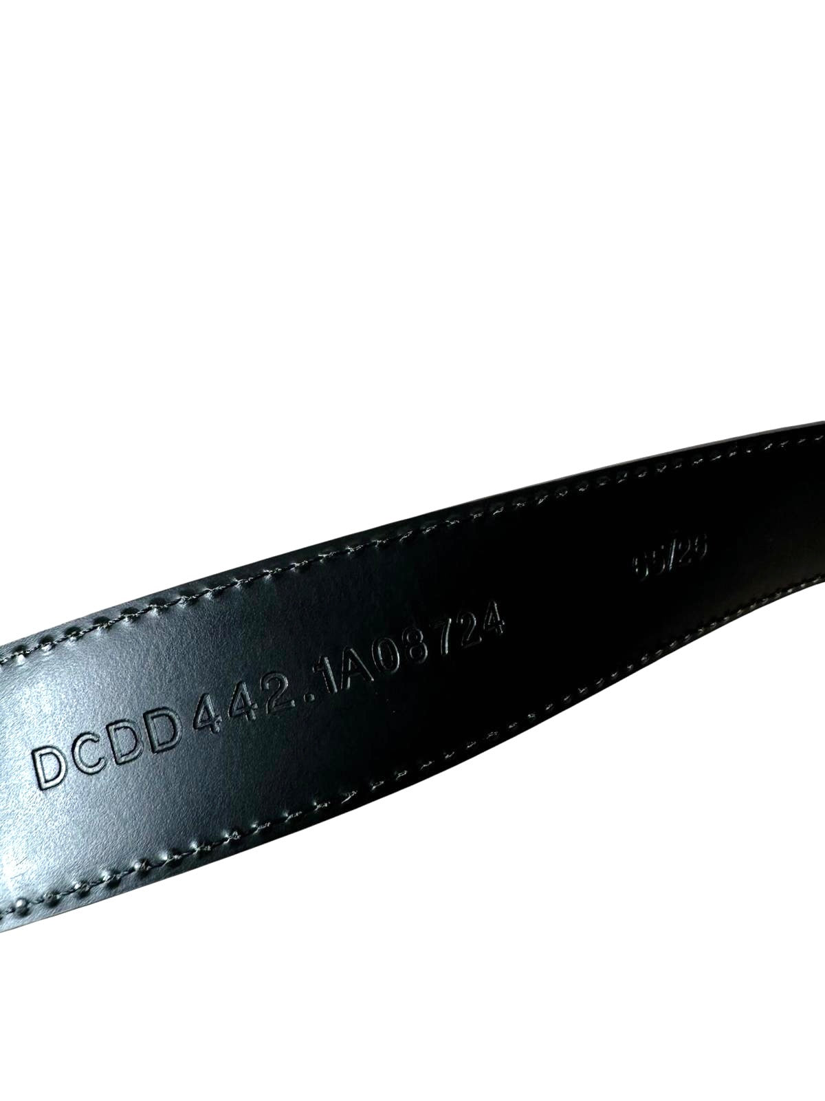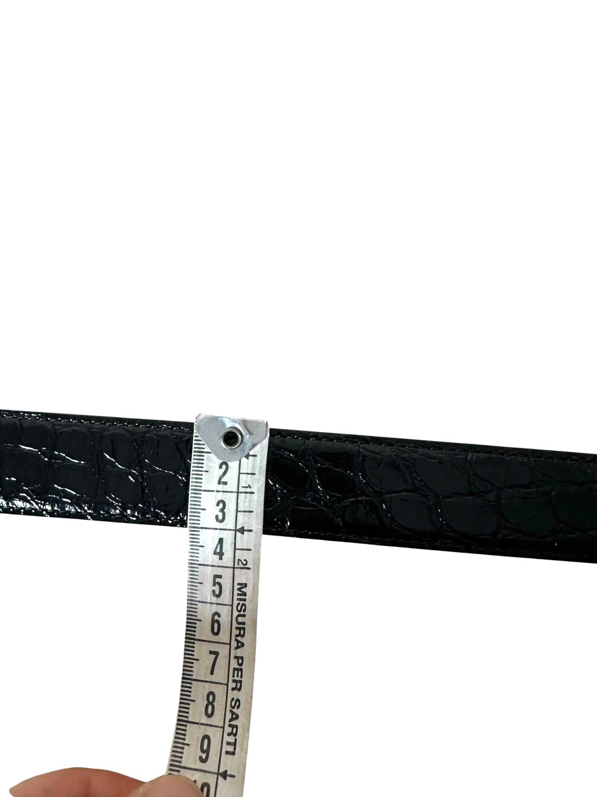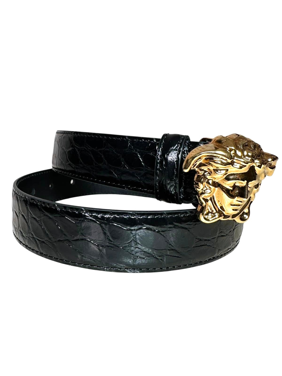 Cintura firmata Versace in pelle nera lucida con stampa effetto cocco, impreziosita dalla celebre fibbia dorata con testa di Medusa in rilievo, simbolo iconico della Maison. Il design deciso e il materiale strutturato rendono questo accessorio perfetto per completare look eleganti o grintosi.