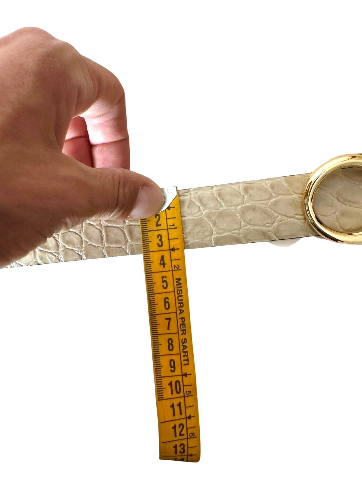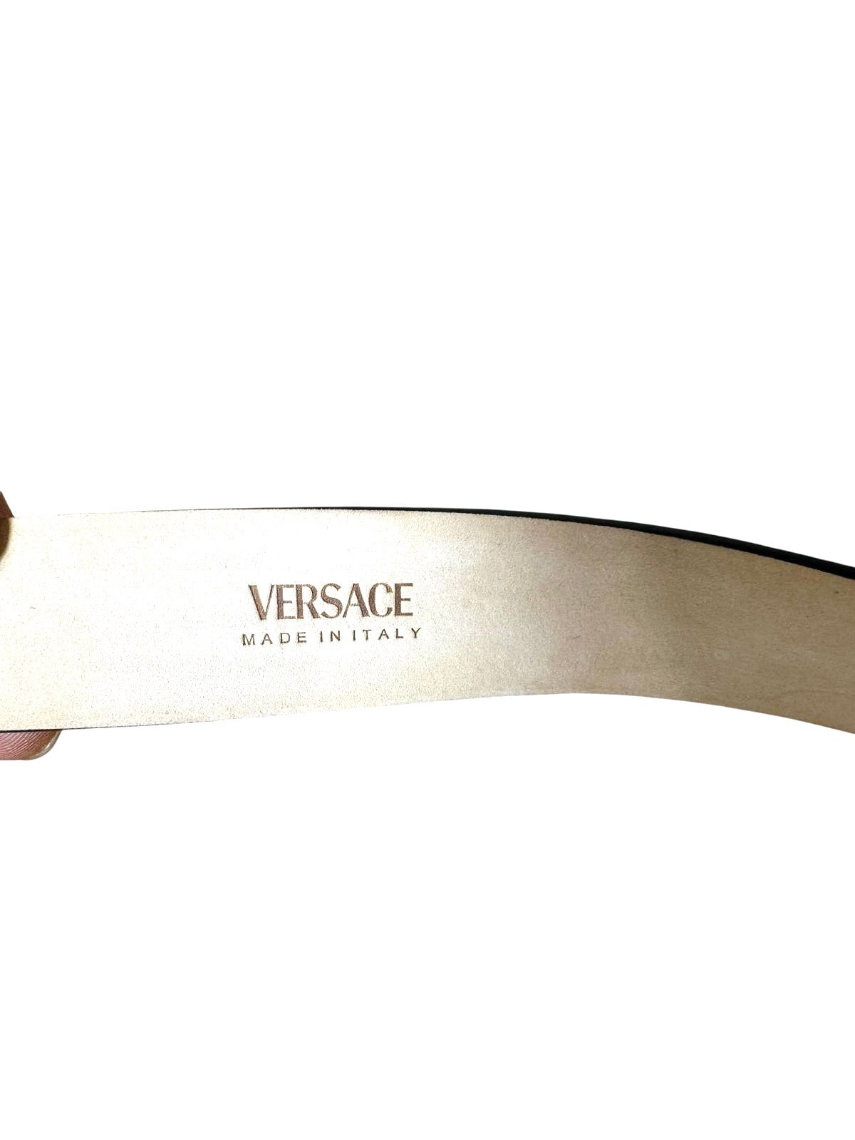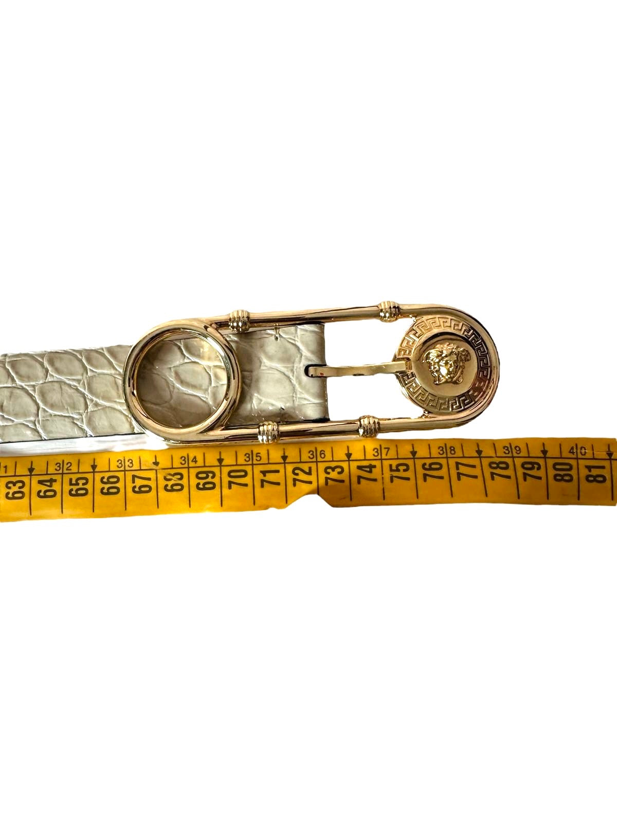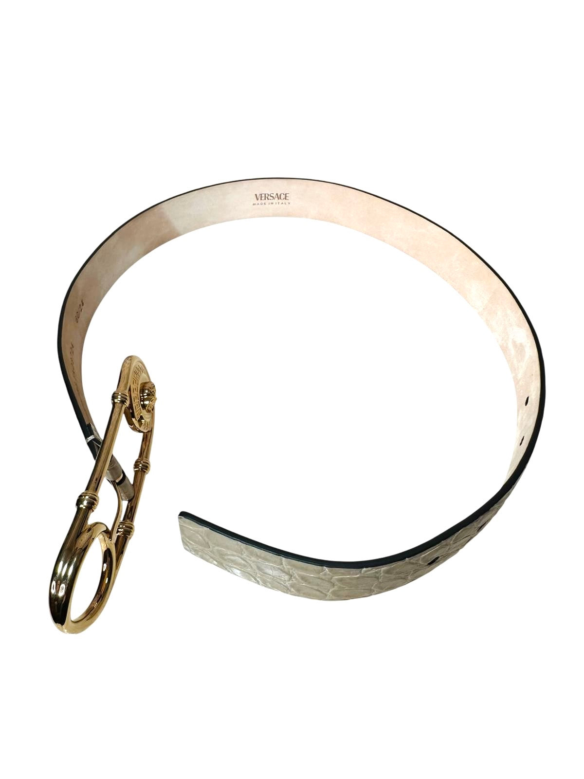 Cintura Versace vintage in pelle effetto cocco lucida, in tonalità beige chiaro con finitura leggermente perlata. La fibbia dorata, ispirata a una maxi spilla di sicurezza, è impreziosita dall'iconico emblema Medusa in rilievo e da dettagli in stile greca incisa. Un accessorio dallo stile deciso e riconoscibile, perfetto per aggiungere un tocco luxury a qualsiasi outfit.