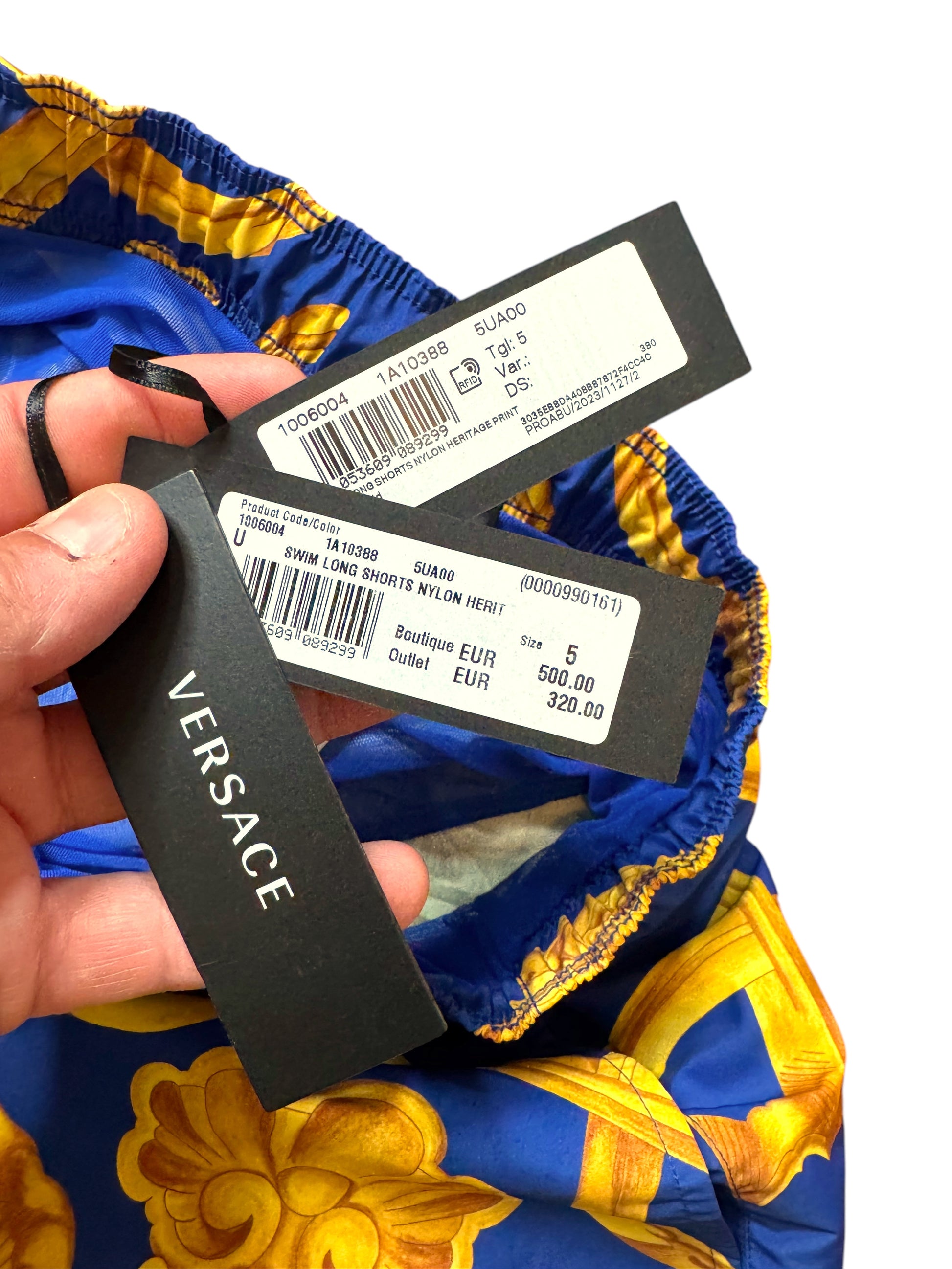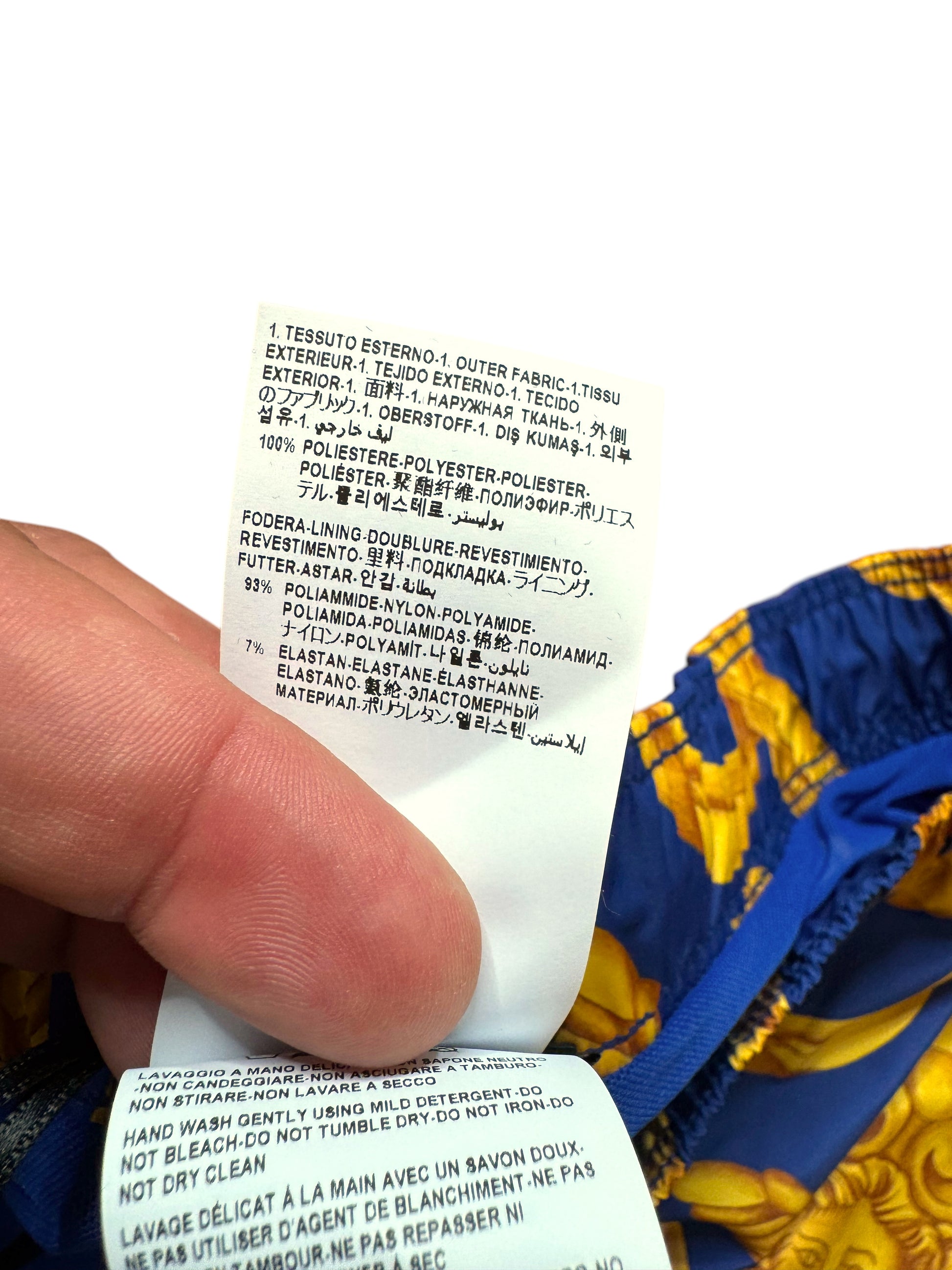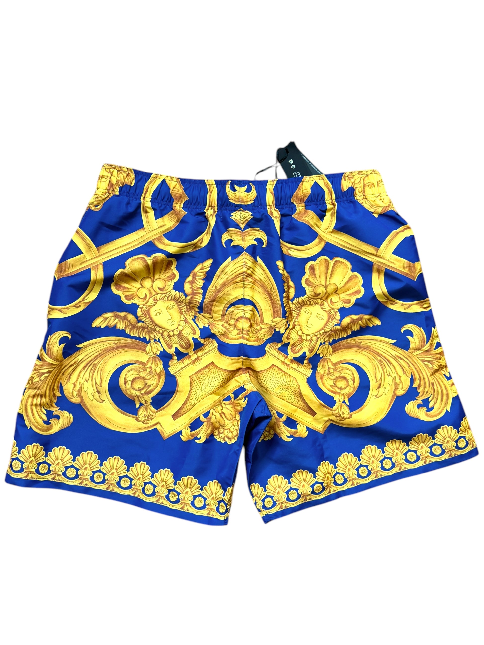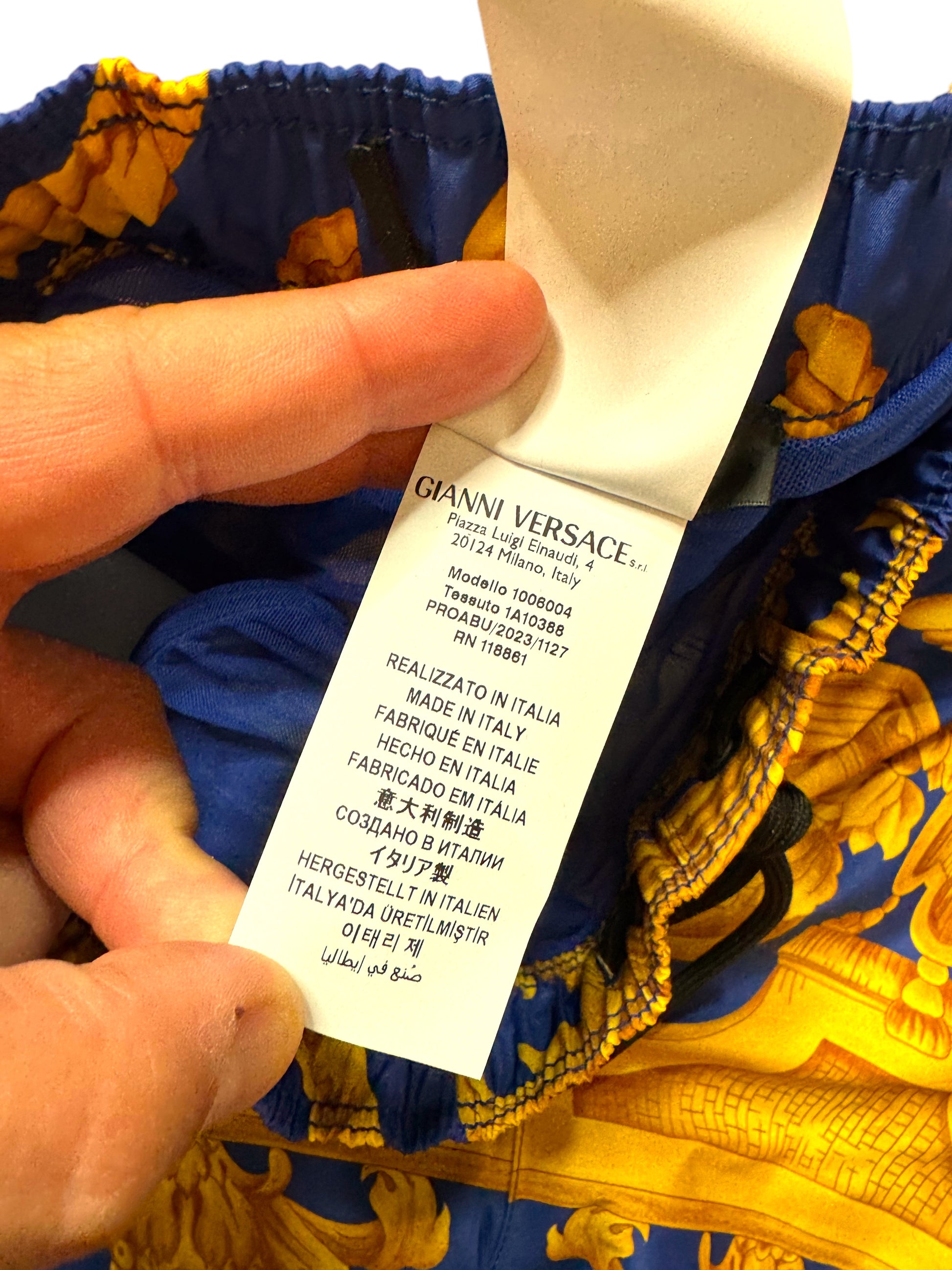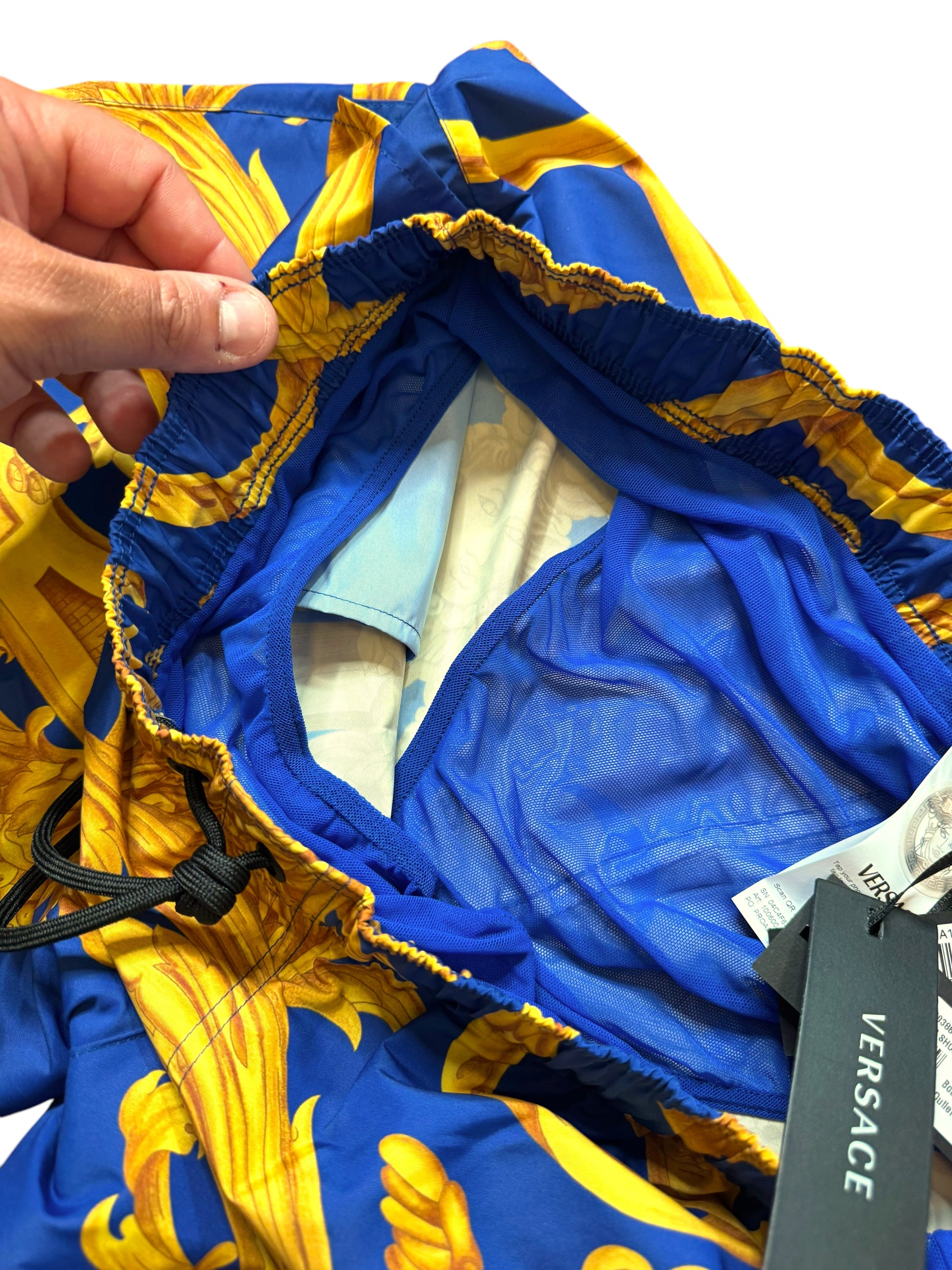 Costume da bagno da uomo Versace, originale, con iconica stampa barocca nei toni blu e oro.