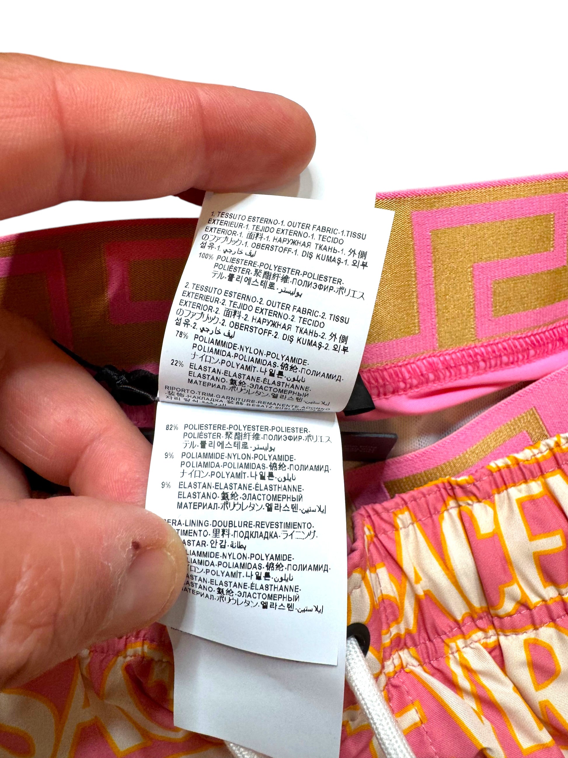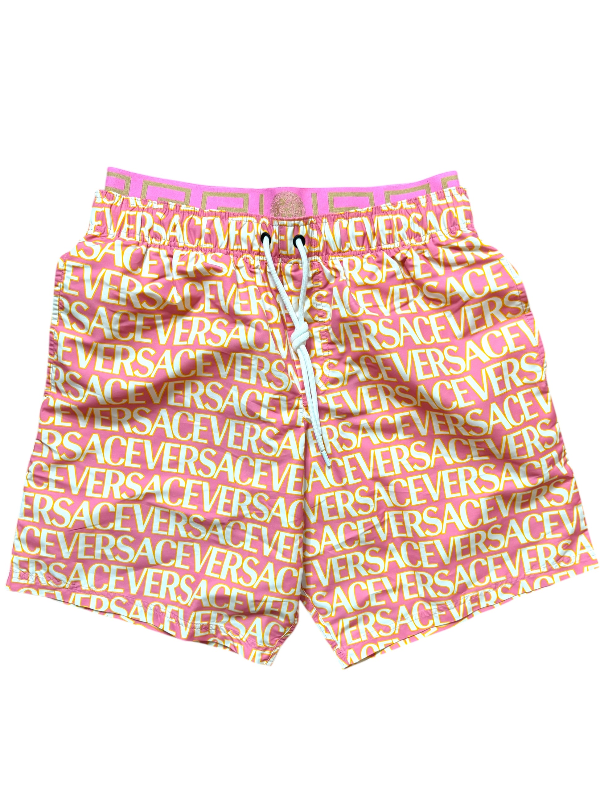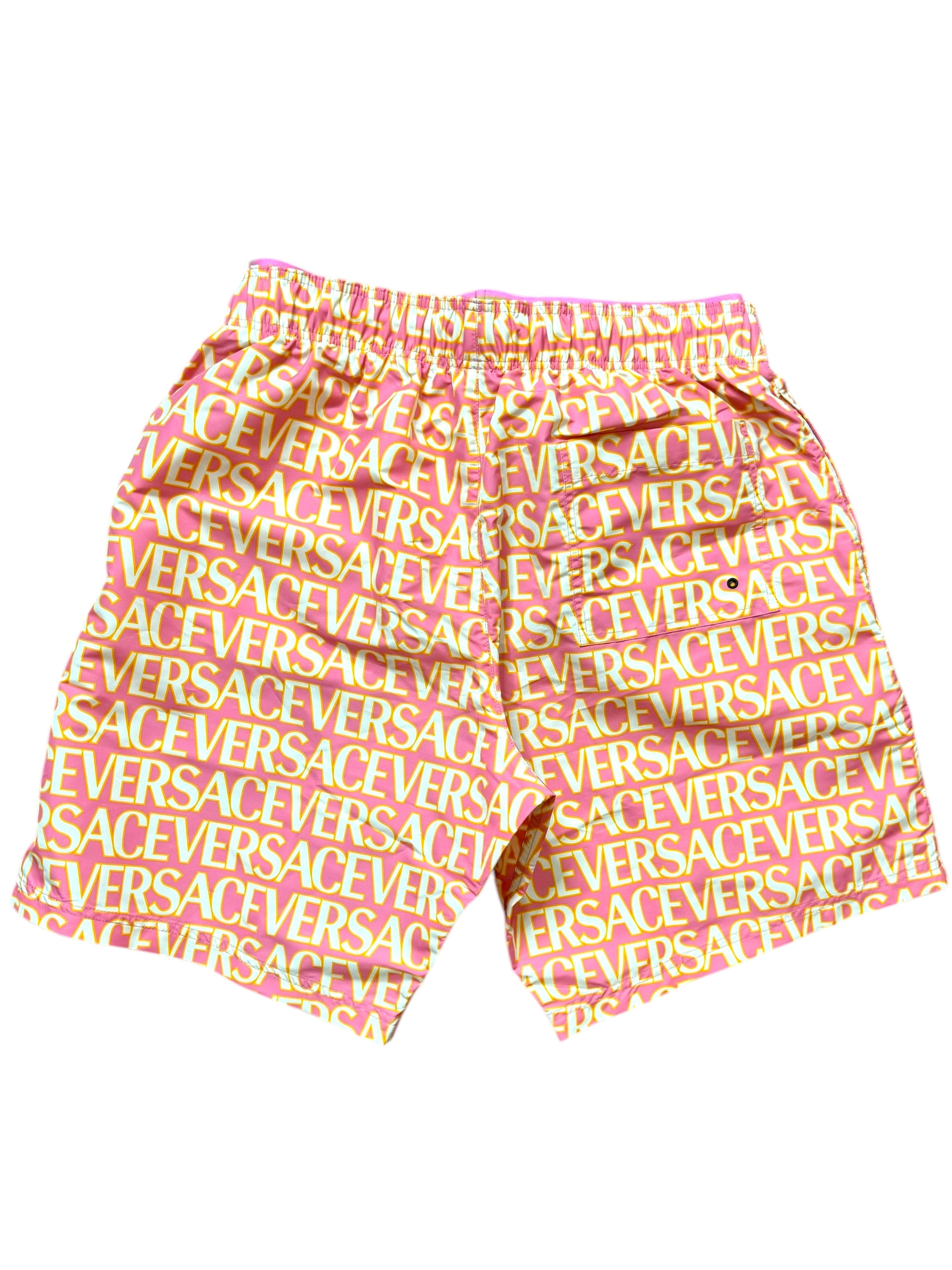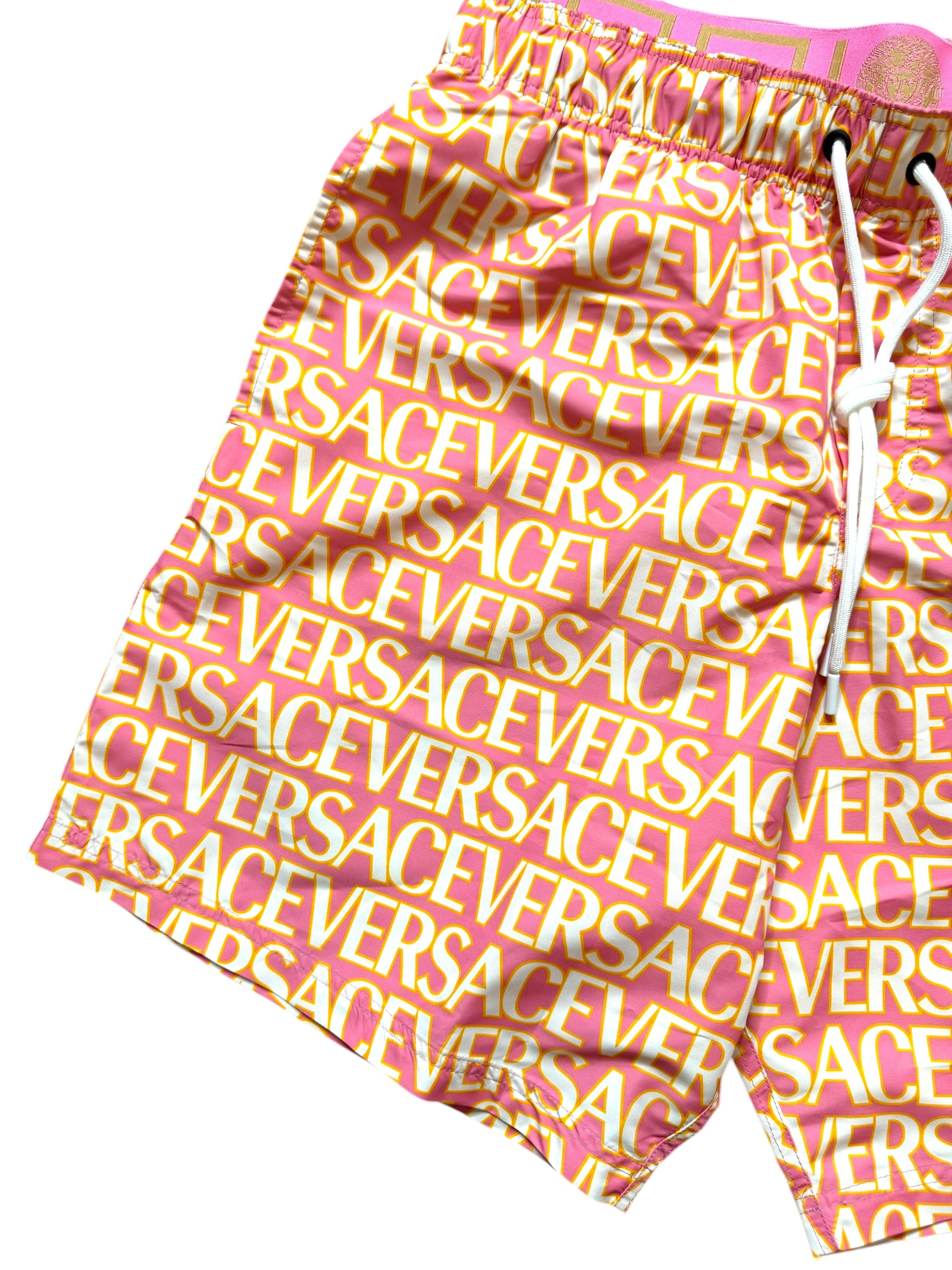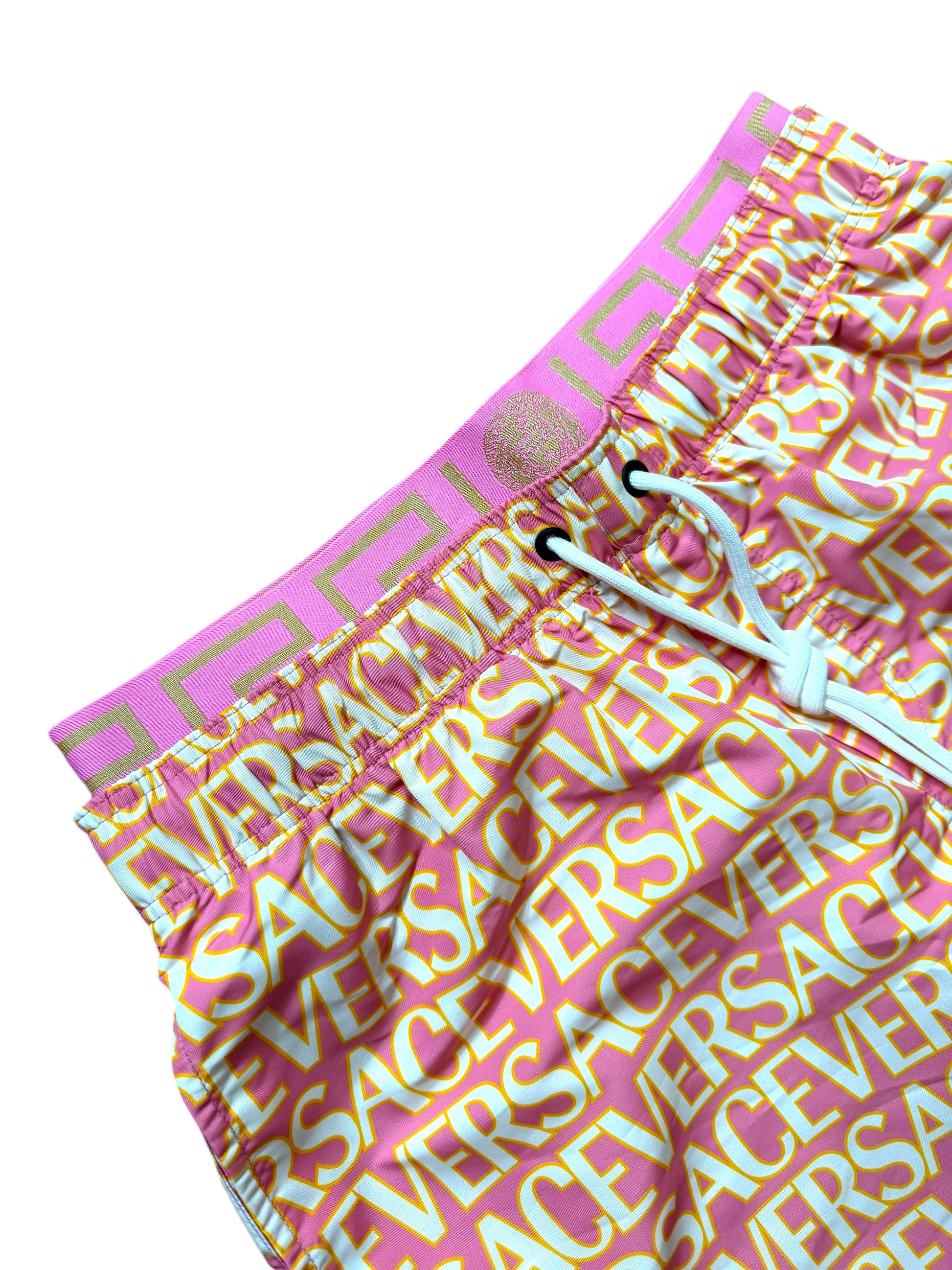 Costume da bagno da uomo Versace, originale, con stampa logo “VERSACE” all-over nei colori rosa e giallo.