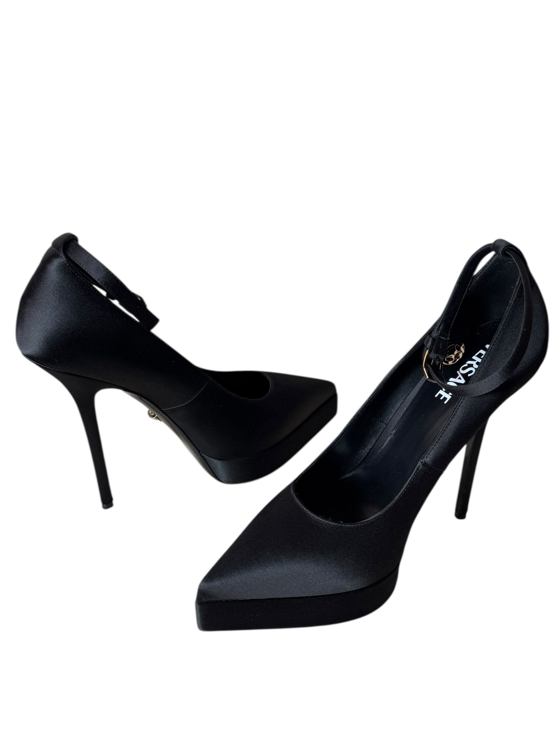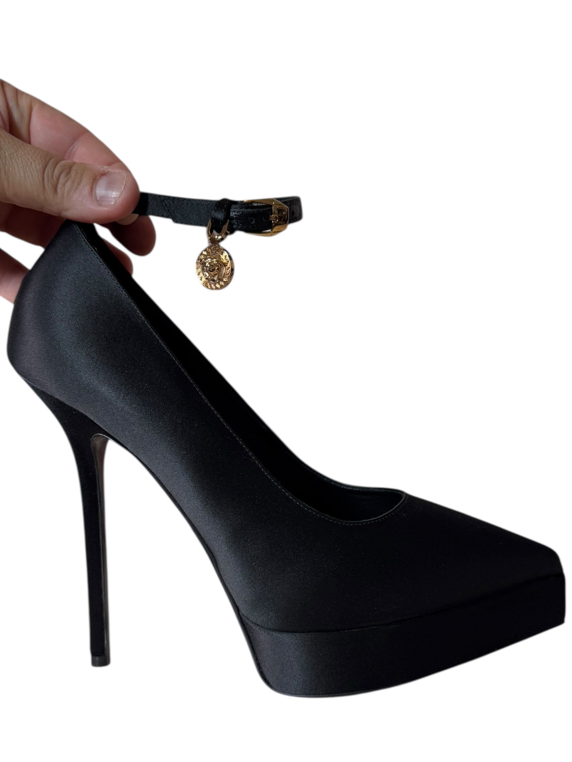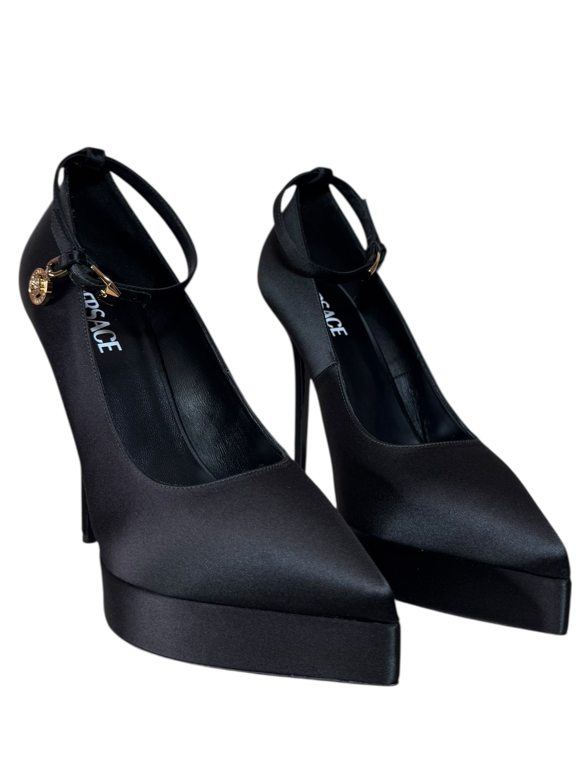 Versace Décolleté in Raso Nero con Plateau e Tacco a Spillo – Medusa Charm