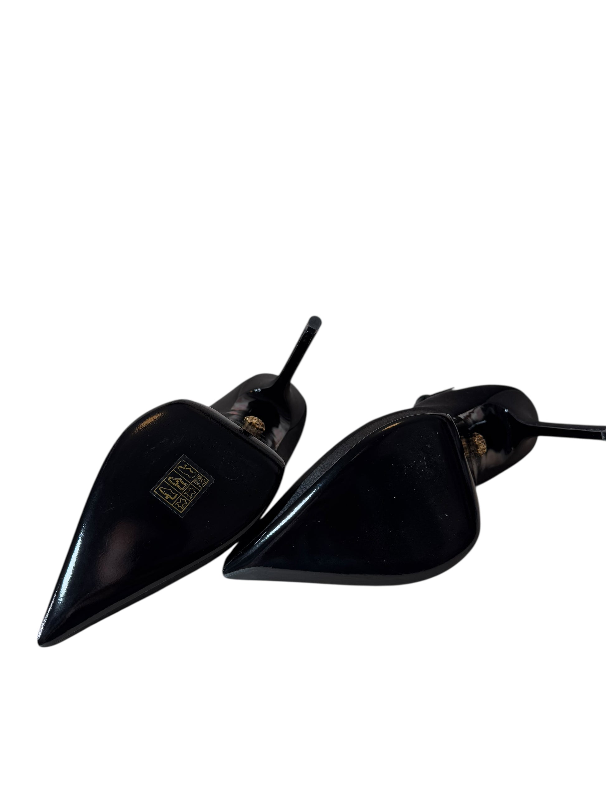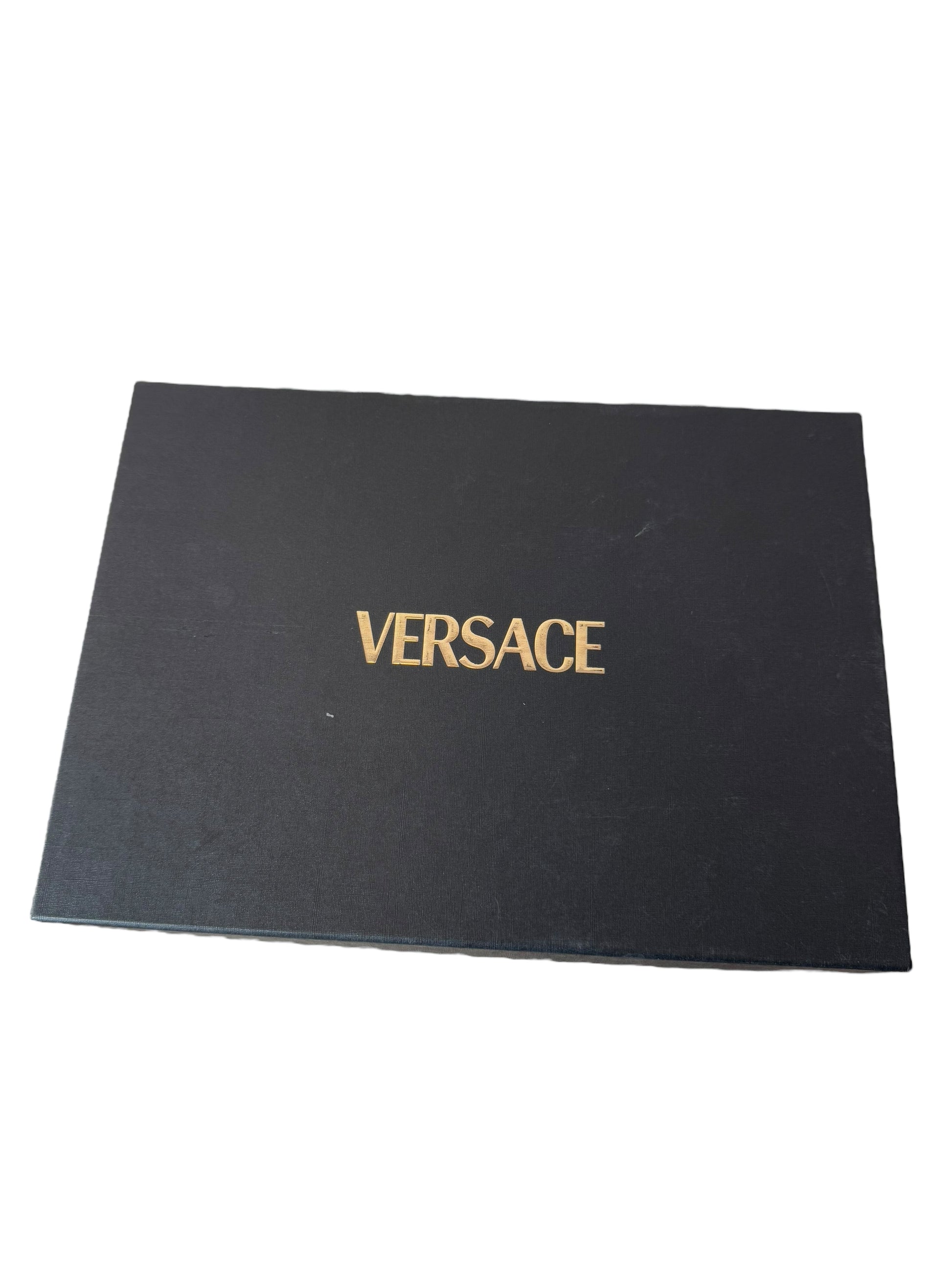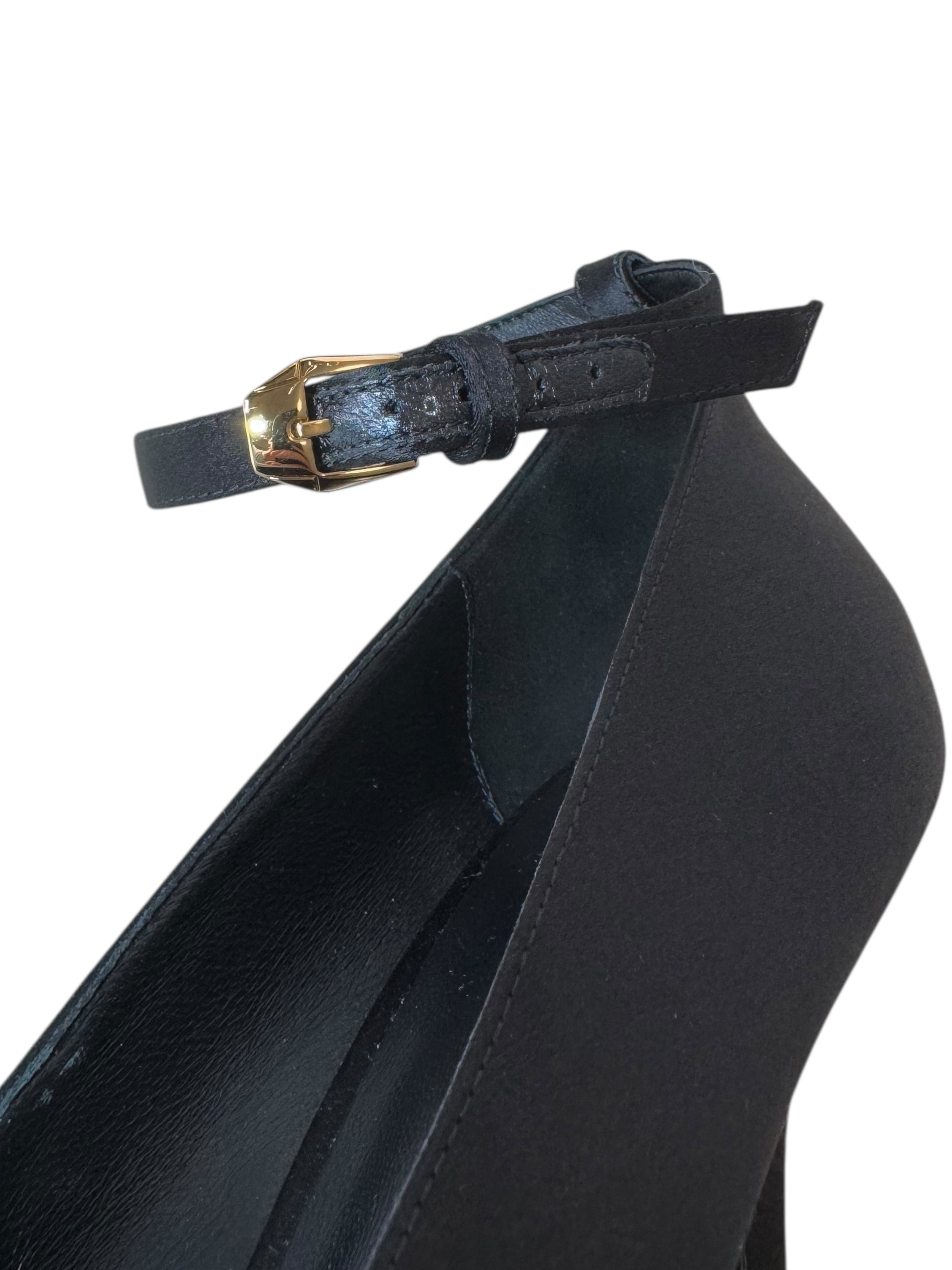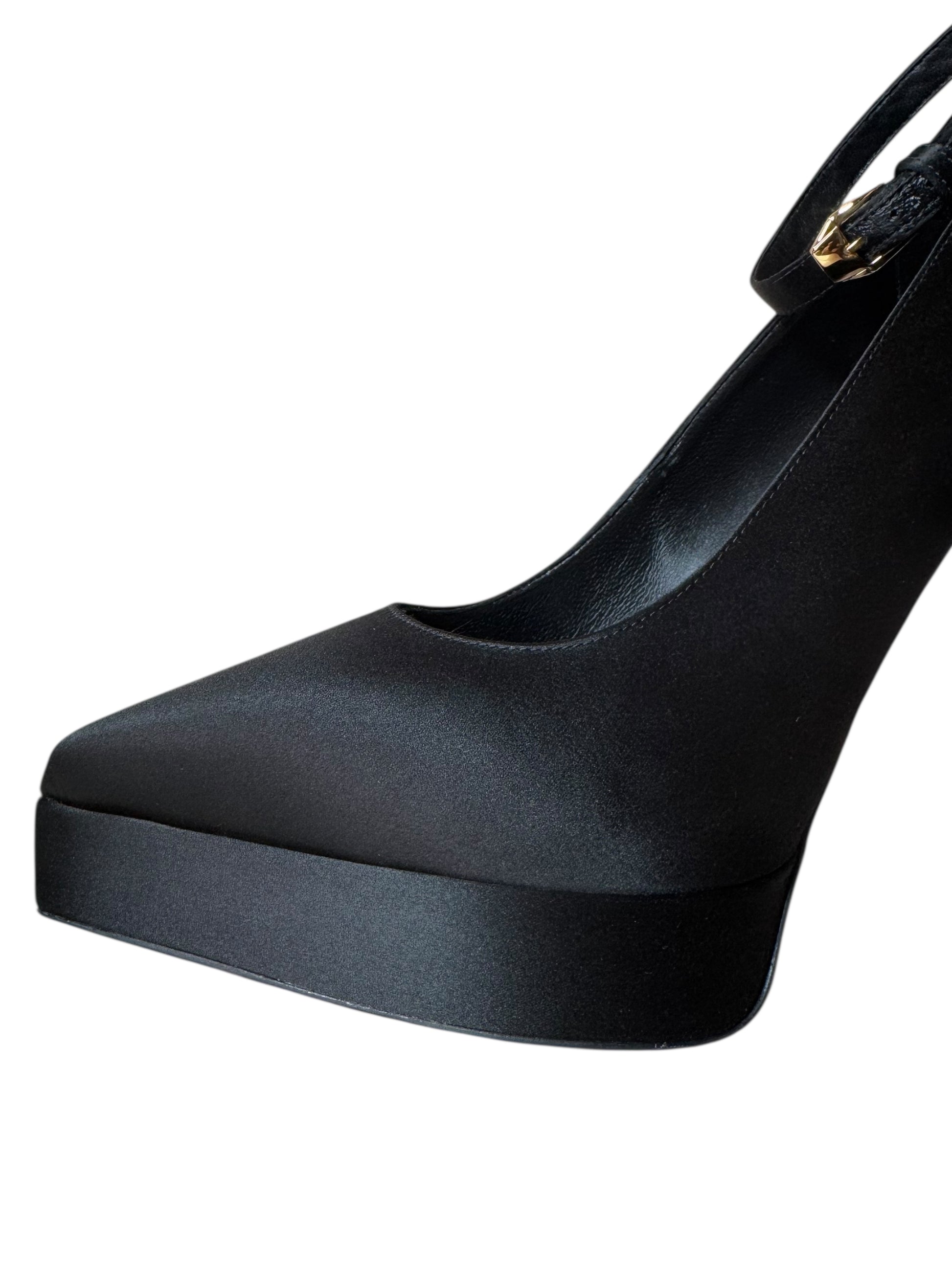 Décolleté in raso nero con punta affusolata, plateau anteriore e tacco a spillo alto. Il cinturino alla caviglia è arricchito da un charm dorato con il motivo Medusa, firma iconica della Maison. Linee eleganti e silhouette slanciata per un modello d’impatto, pensato per le occasioni più sofisticate. Made in Italy.