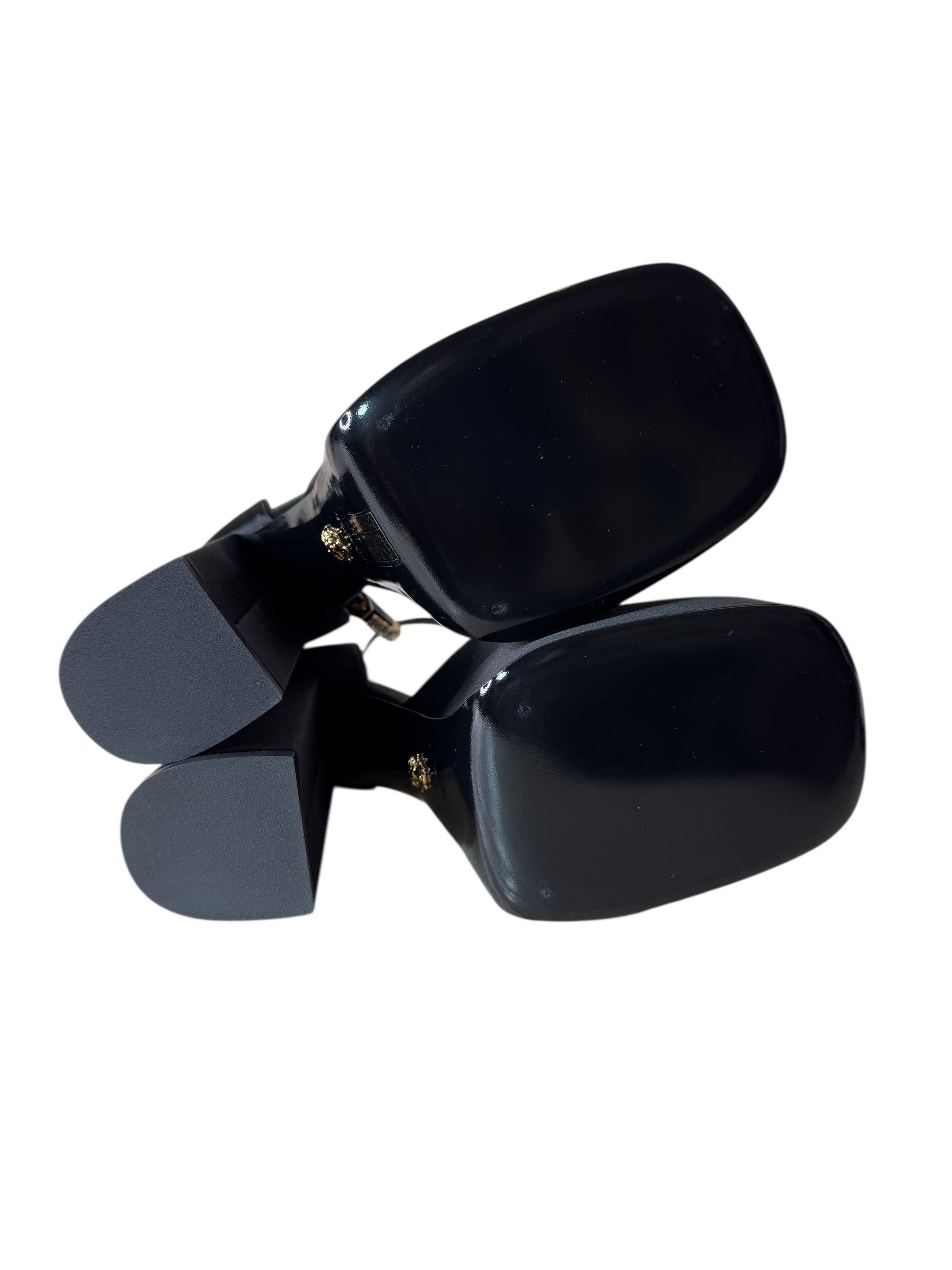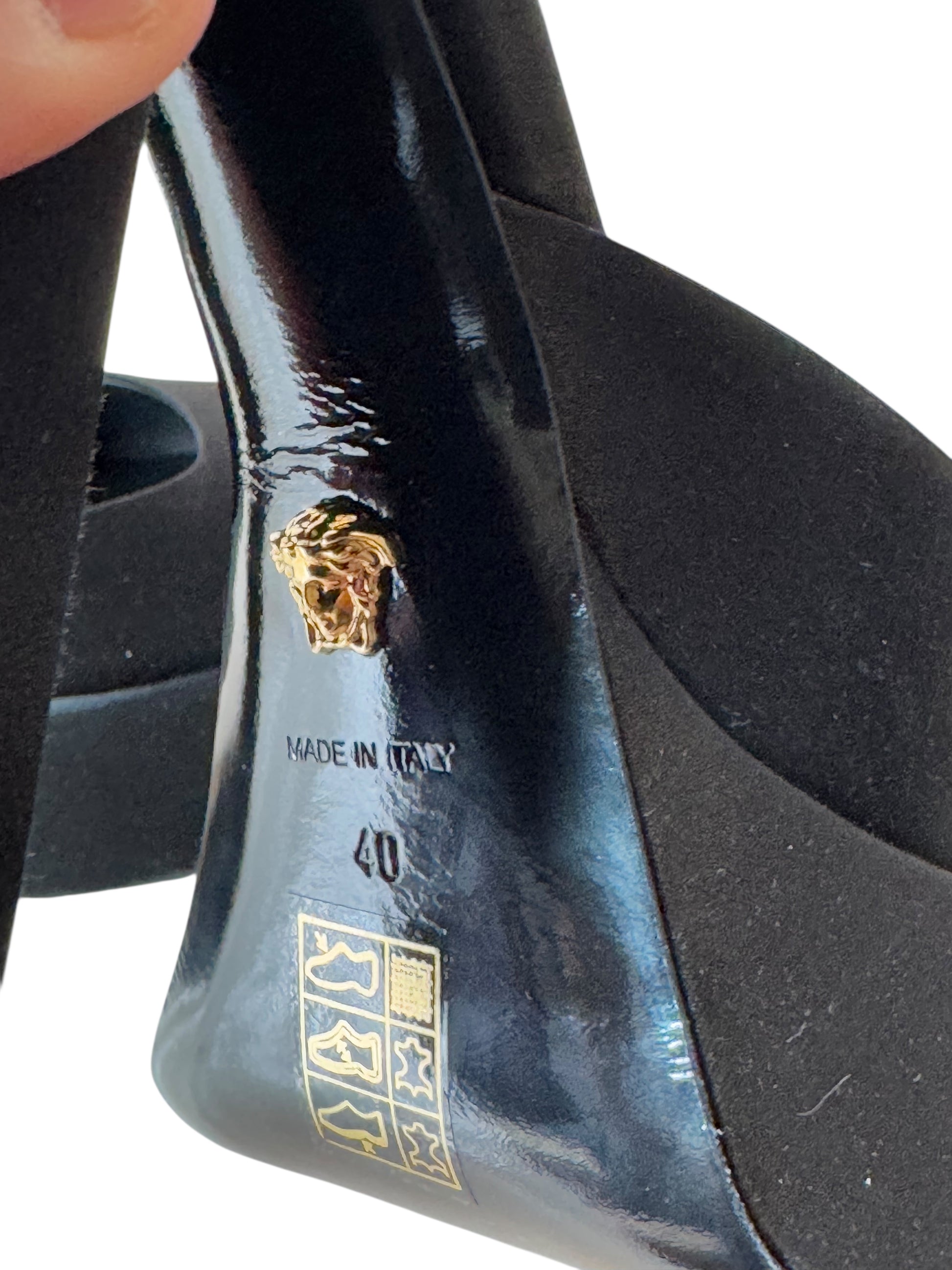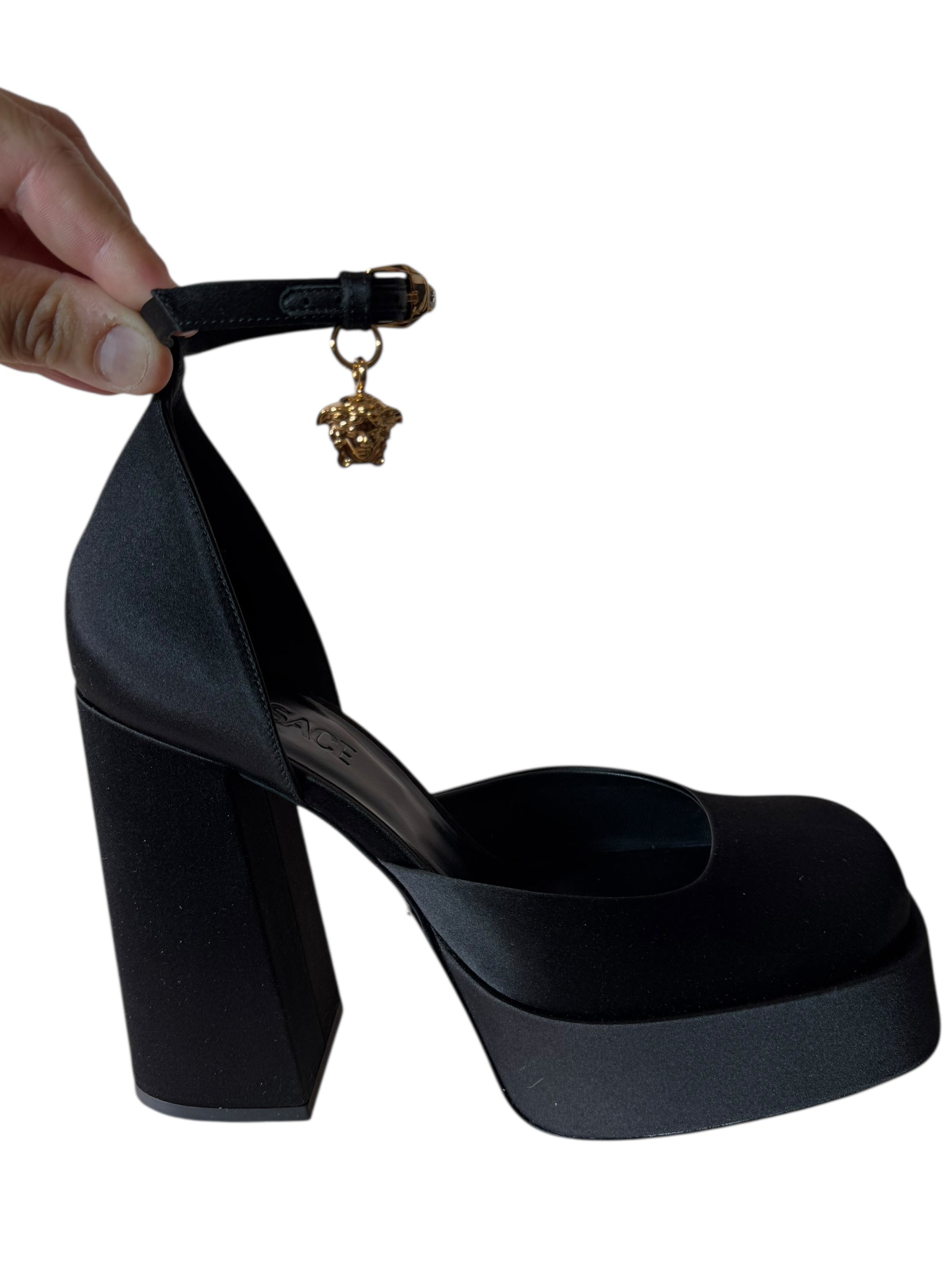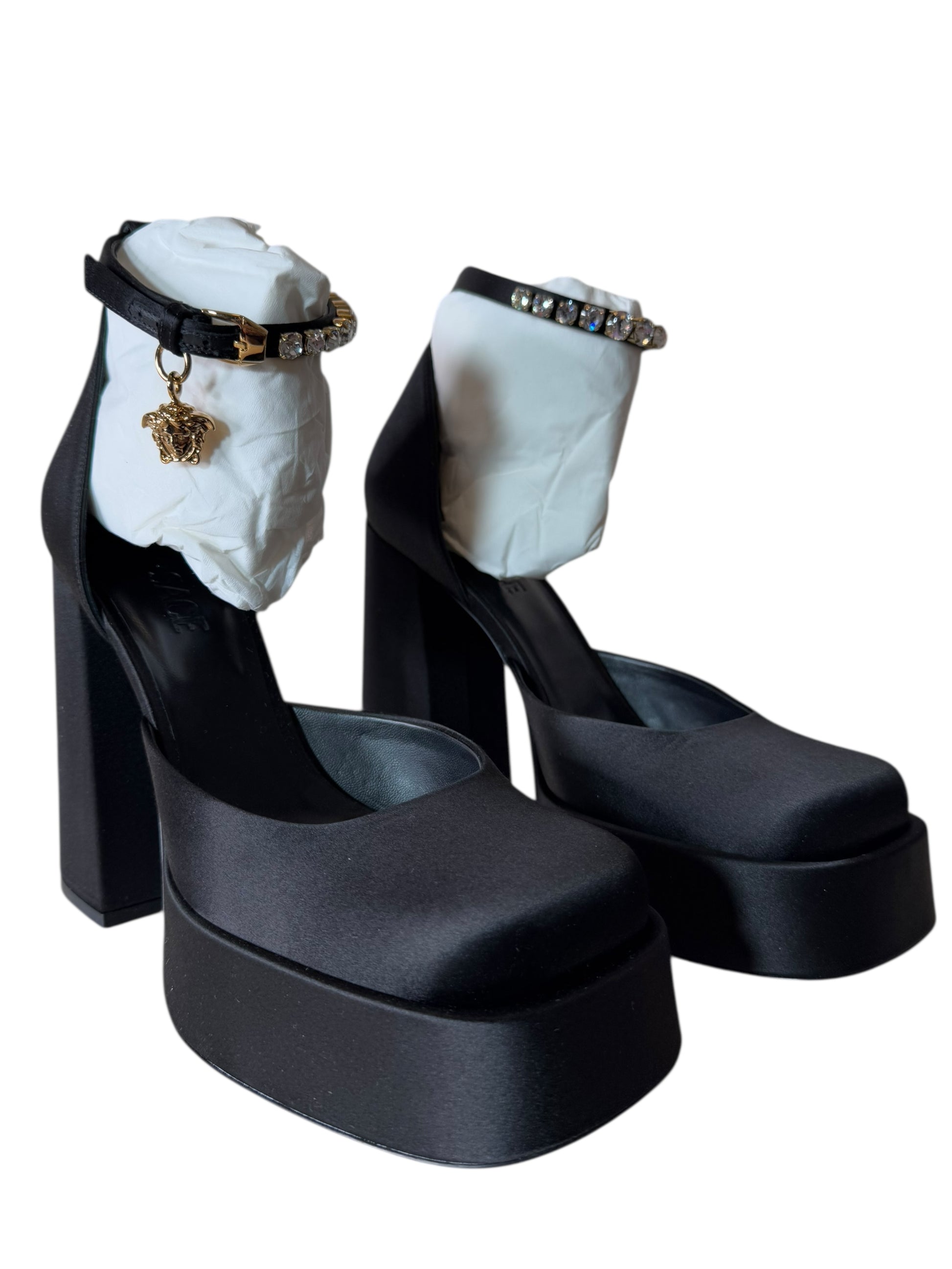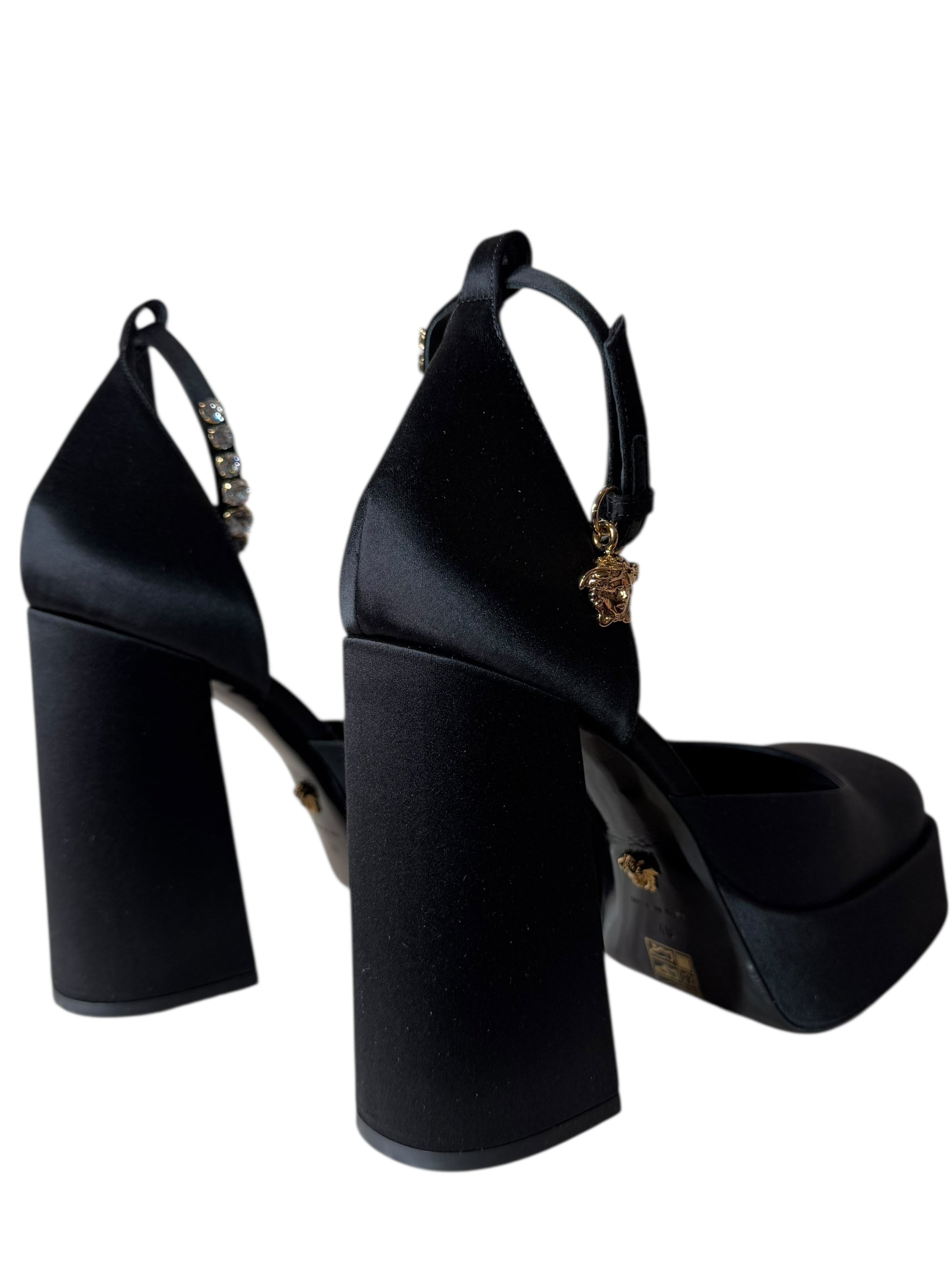 Décolleté in raso nero con plateau strutturato e tacco largo. Il cinturino alla caviglia è impreziosito da cristalli e charm dorato a forma di Medusa, simbolo iconico della Maison. Linee decise e materiali ricercati si uniscono in un modello dal forte impatto visivo. Made in Italy.