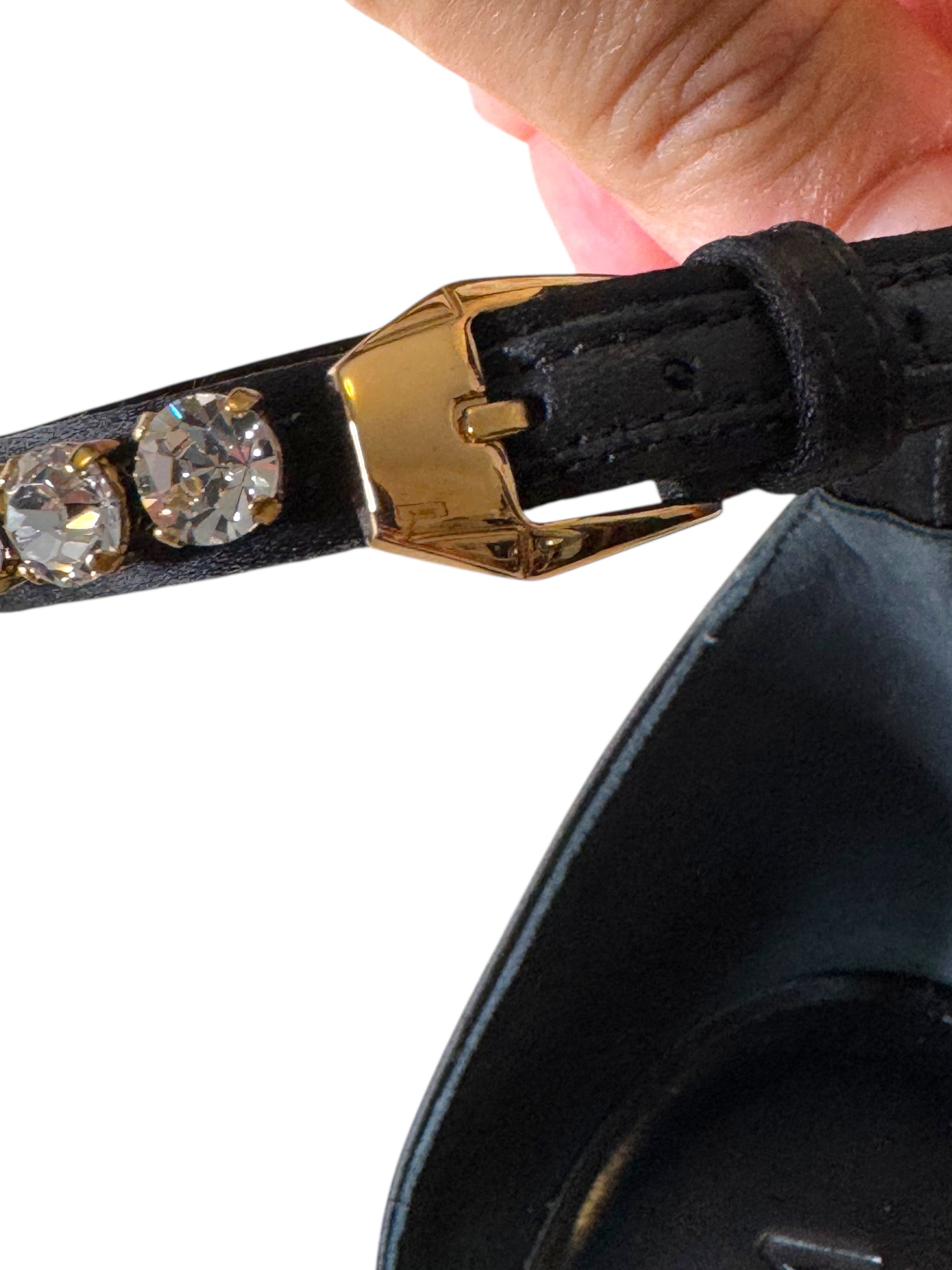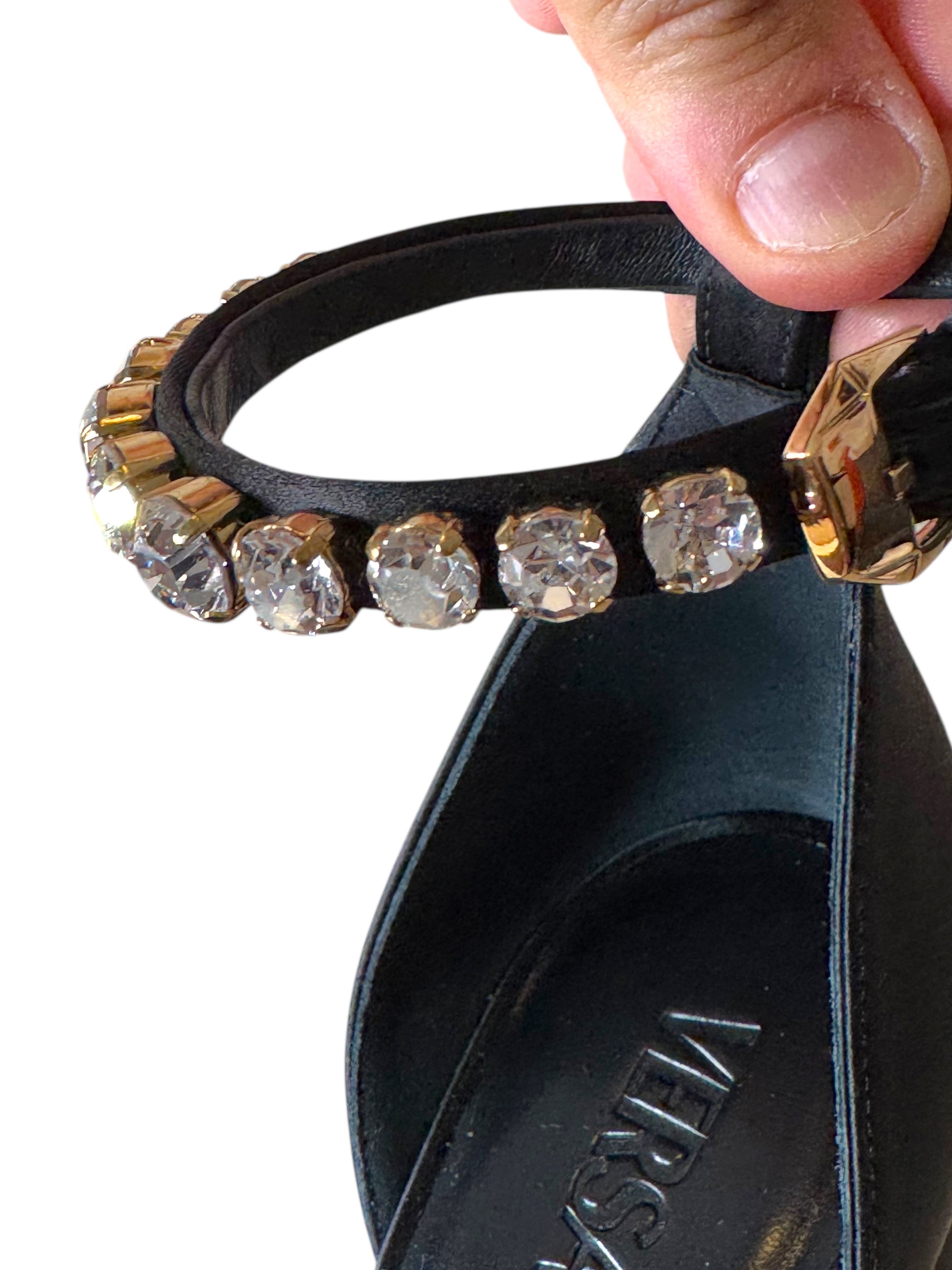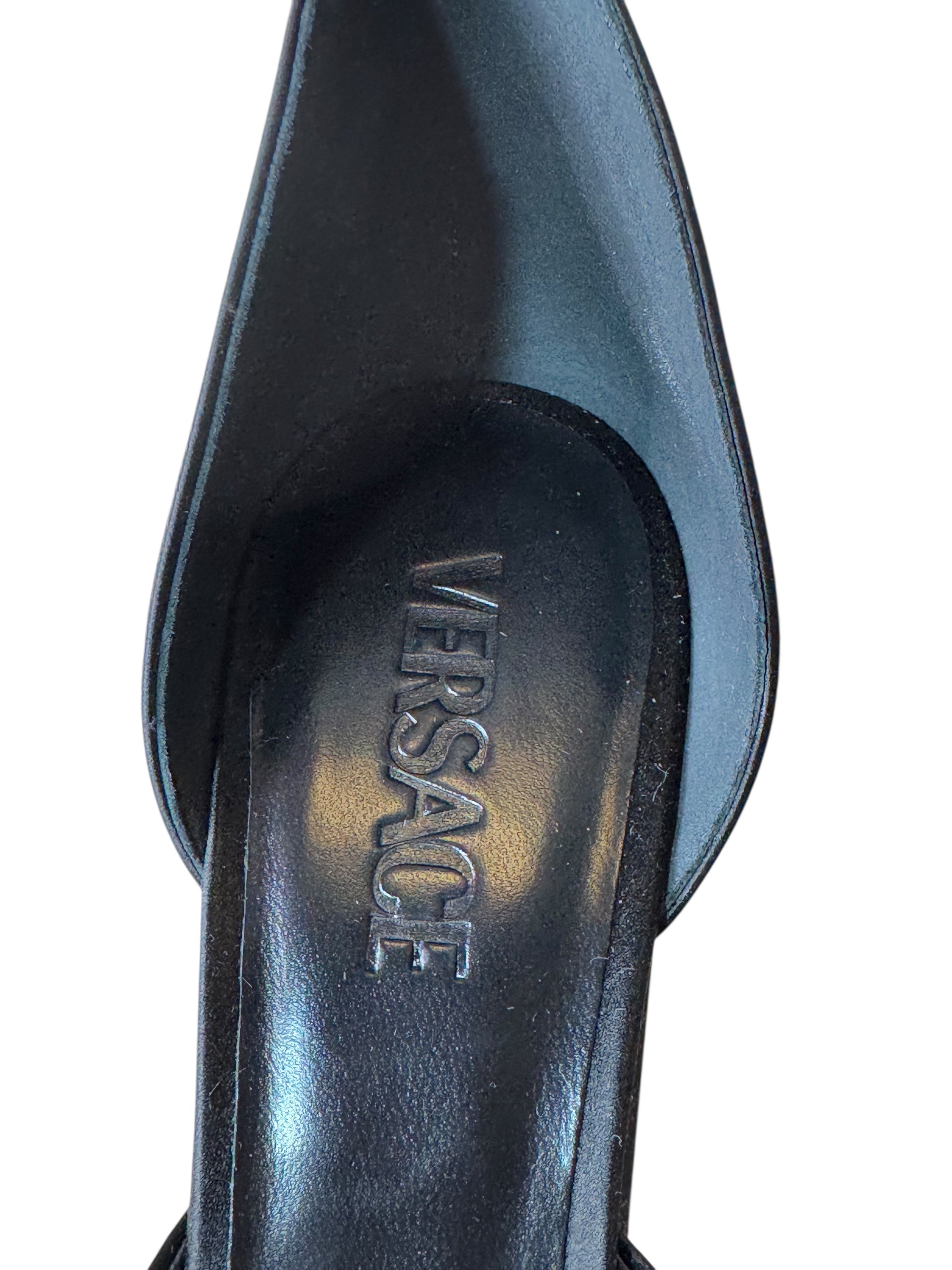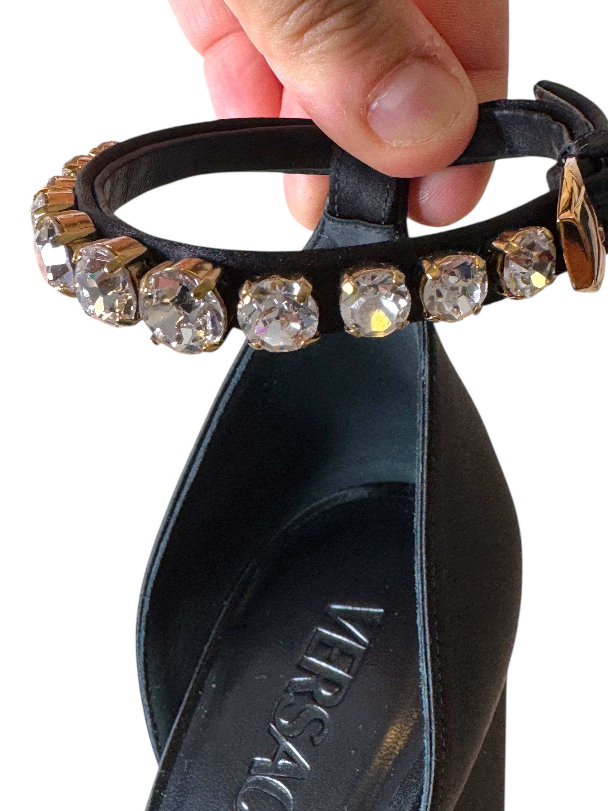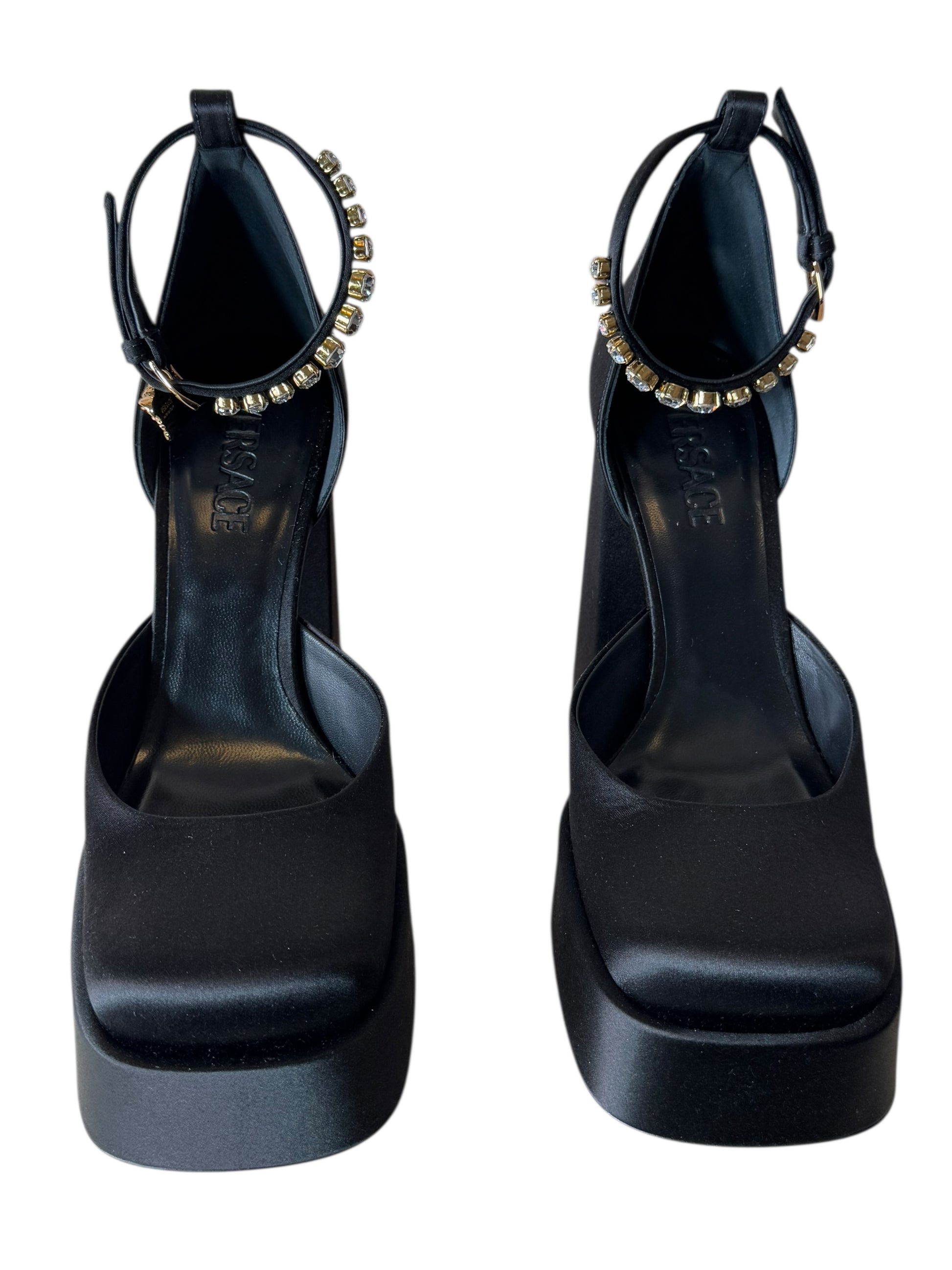 Versace Décolleté in Raso Nero con Plateau, Tacco Largo e Cinturino Gioiello – Taglia 40