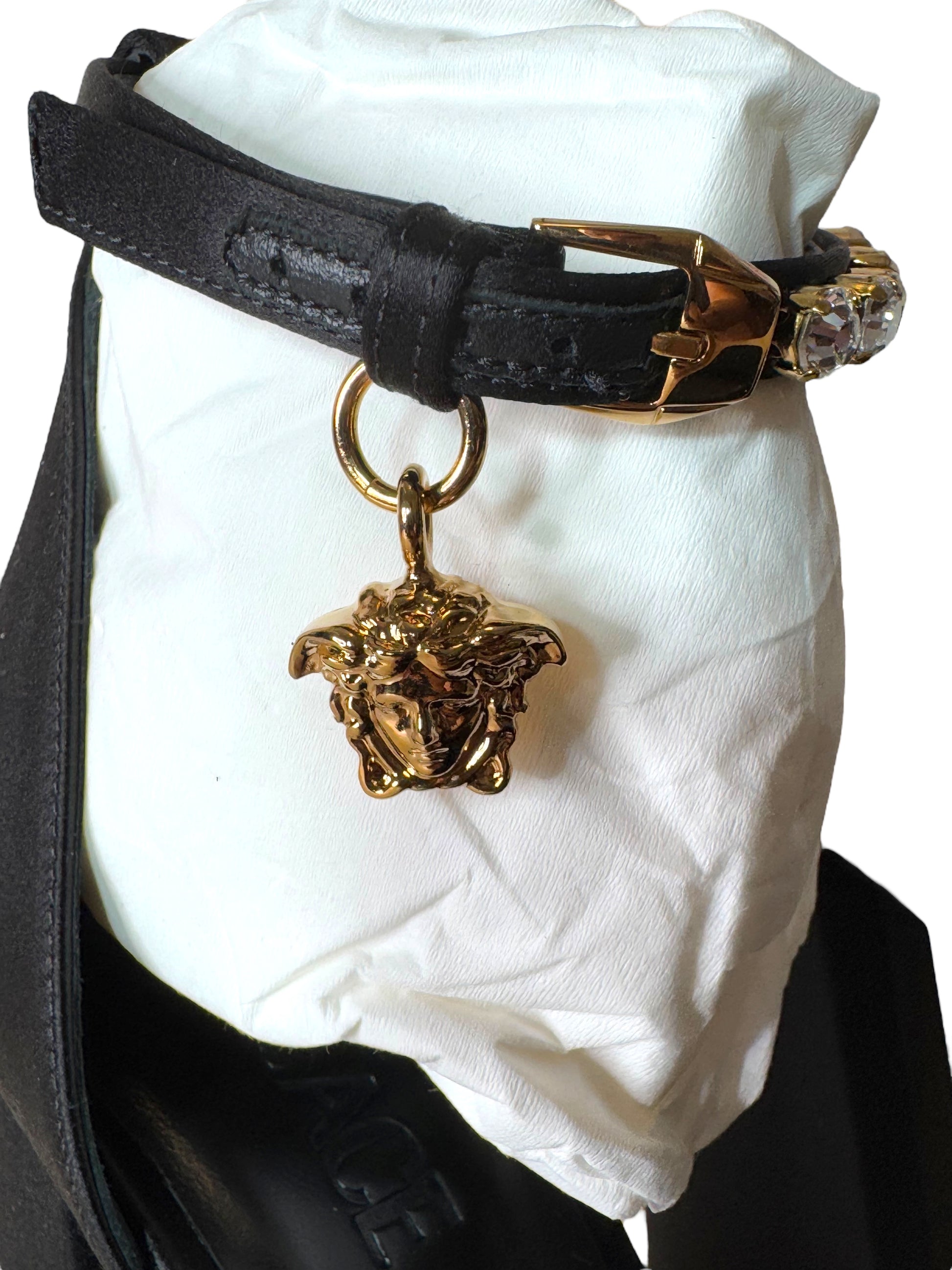 • Dettagli: Cinturino con cristalli e pendente Medusa dorato