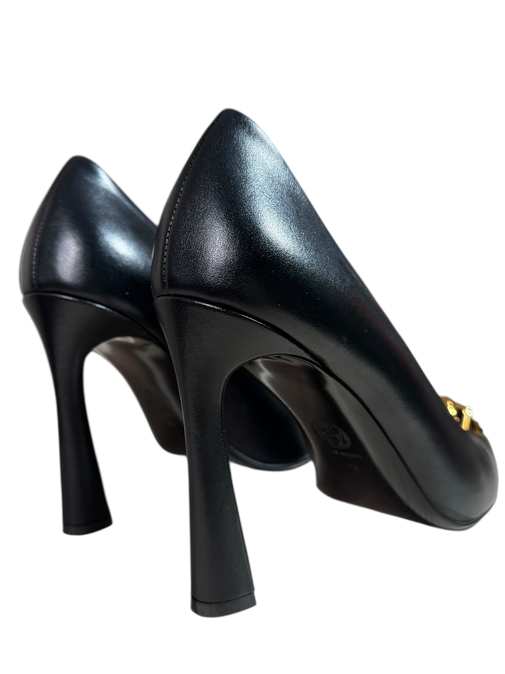 Versace décolleté La Medusa in pelle nera con logo dorato, tacco alto It 41.