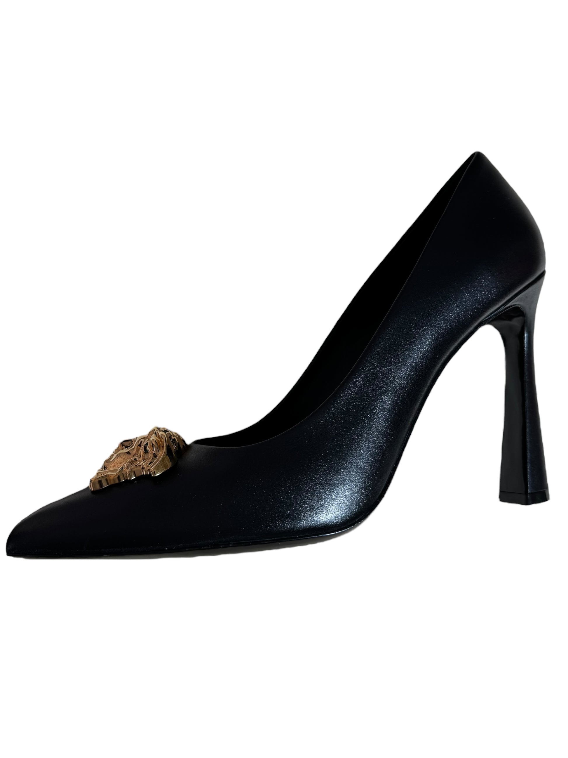 Décolleté Versace La Medusa in pelle nera liscia, con iconico logo Medusa in metallo dorato sulla punta. Modello a punta con tacco alto, elegante e femminile. Realizzate in Italia con materiali di alta qualità.