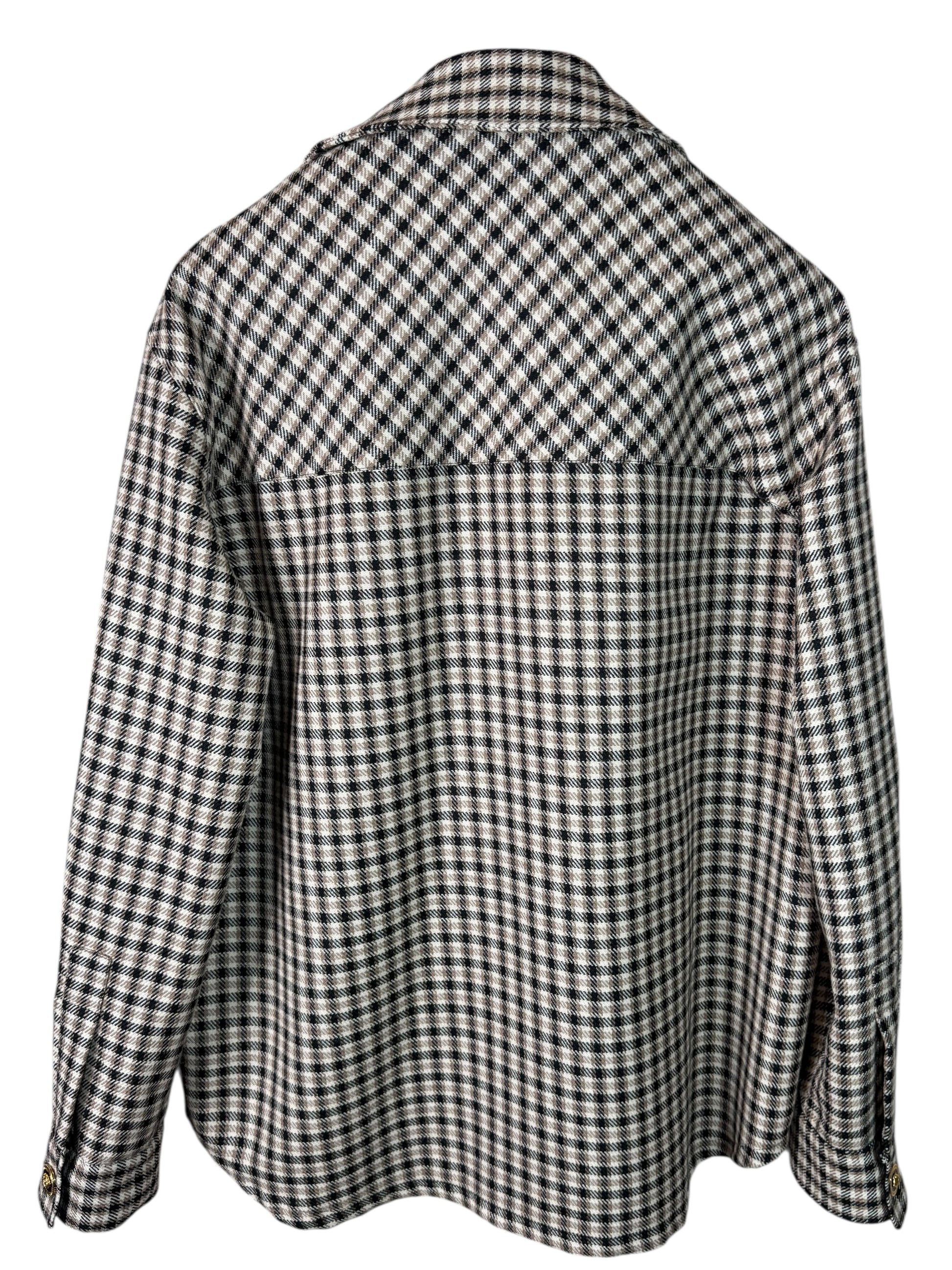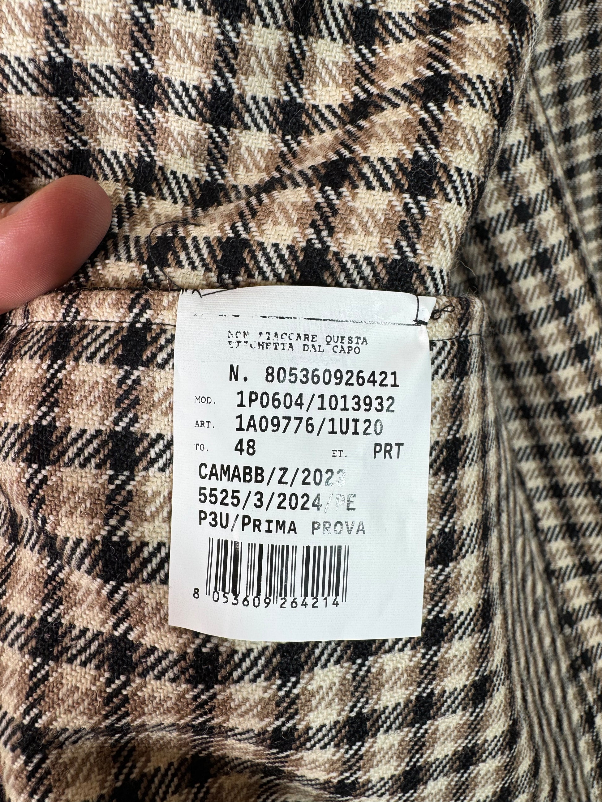 Giacca Versace da uomo in tessuto a quadri nei toni beige, marrone e nero. Modello con chiusura frontale a bottoni Medusa in metallo dorato e tasche applicate laterali anch’esse con bottoni Medusa. Colletto a revers, polsini con bottone e costruzione sartoriale di alta qualità. Le uniche etichette presenti sono quelle visibili in foto. Il capo non è mai stato utilizzato.