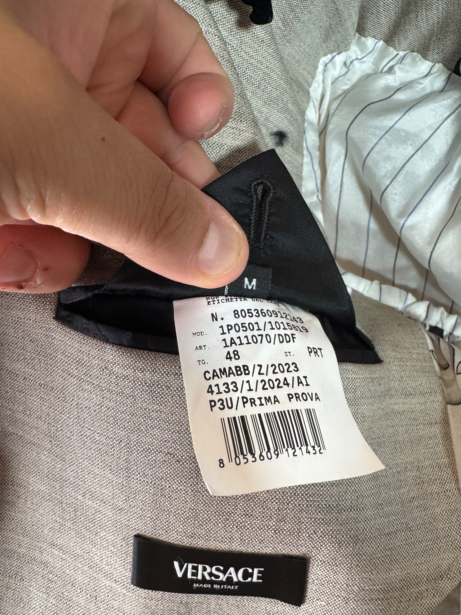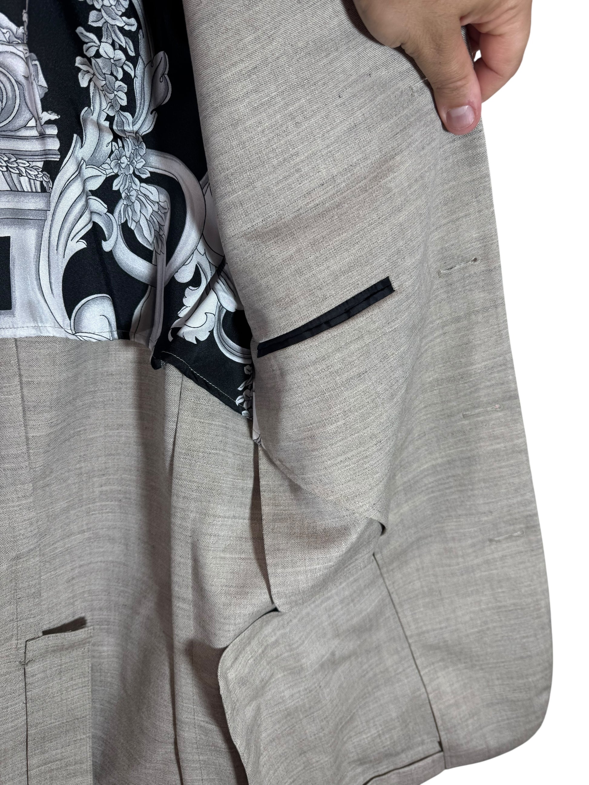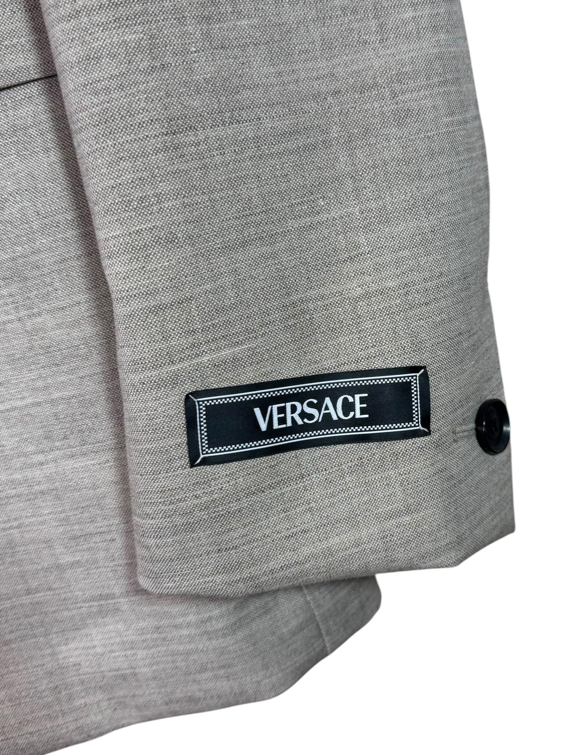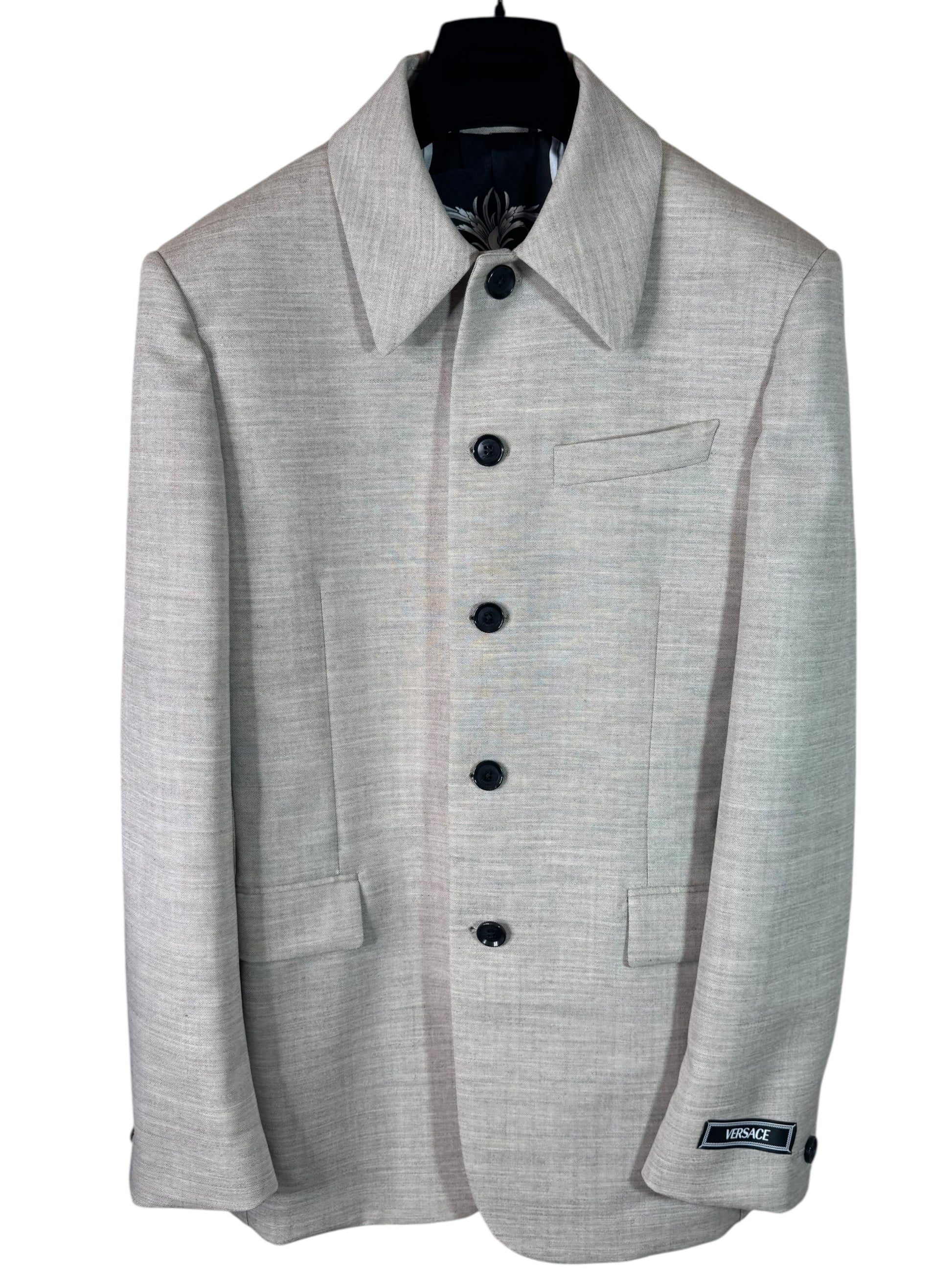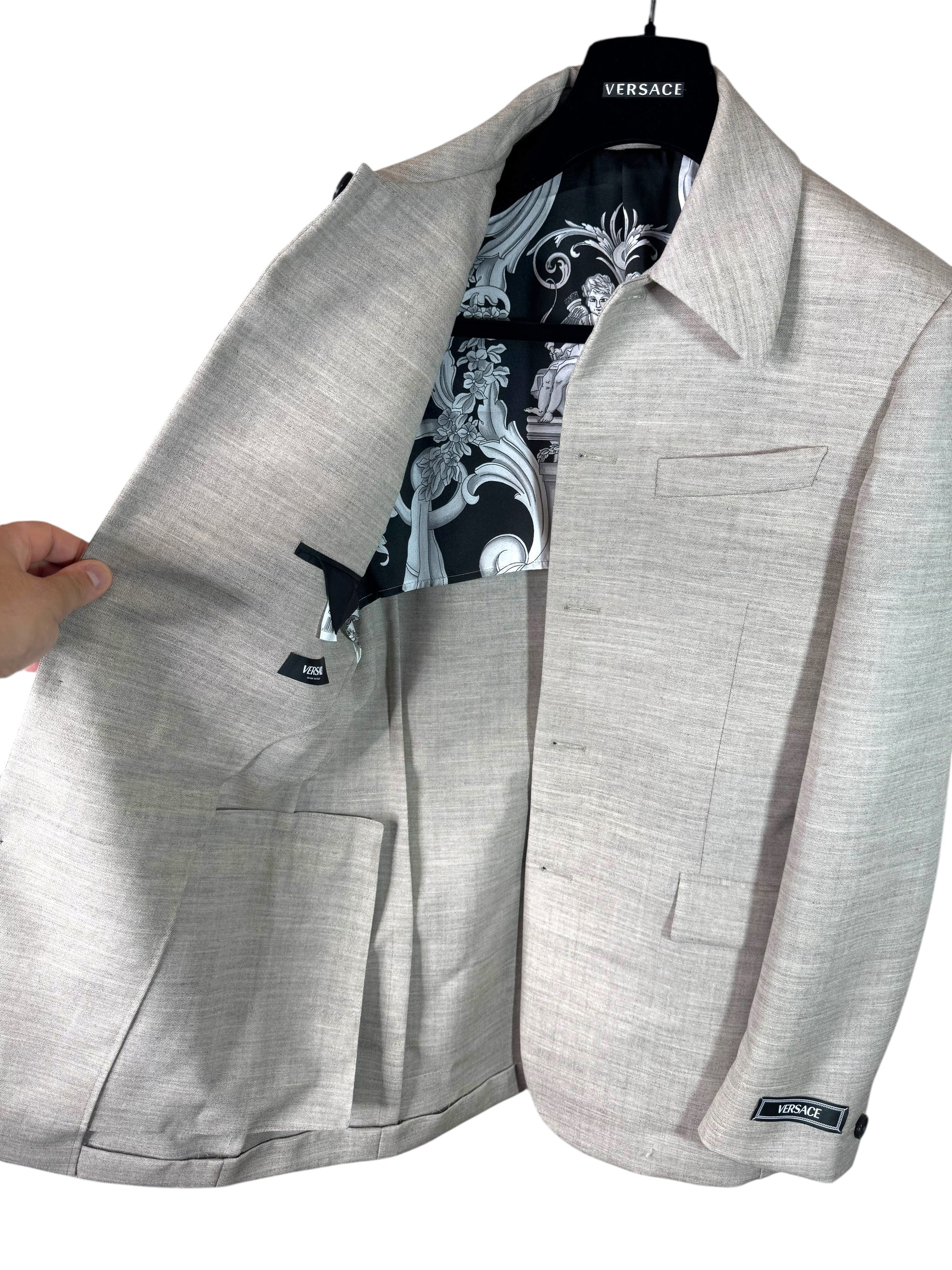 Giacca uomo firmata Versace, realizzata in Italia. Modello in tessuto grigio con bottoni logati, fodera interna con stampa Baroque in bianco e nero e dettaglio logo applicato sulla manica. Un capo raffinato e moderno, perfetto per outfit eleganti o formali.