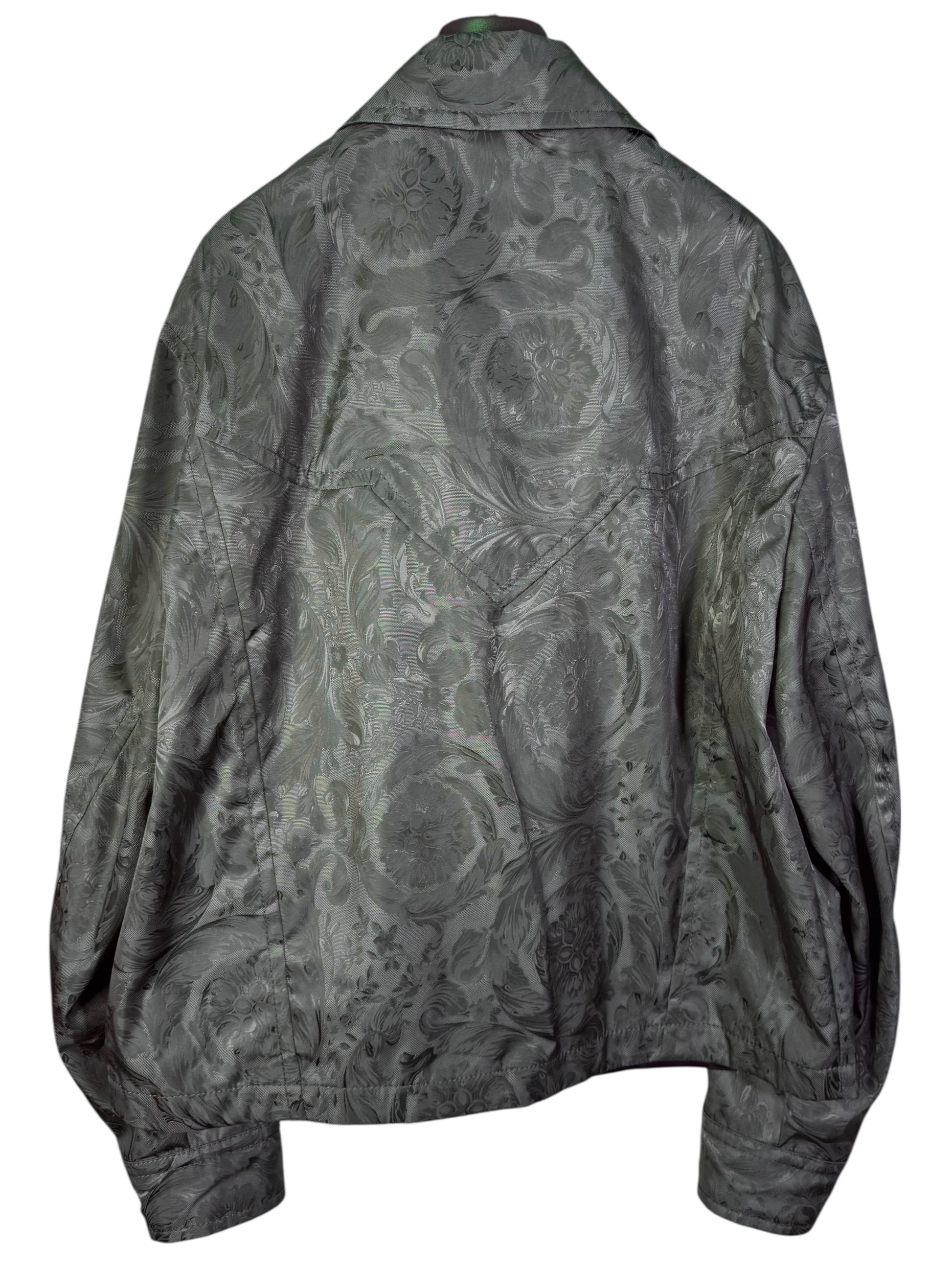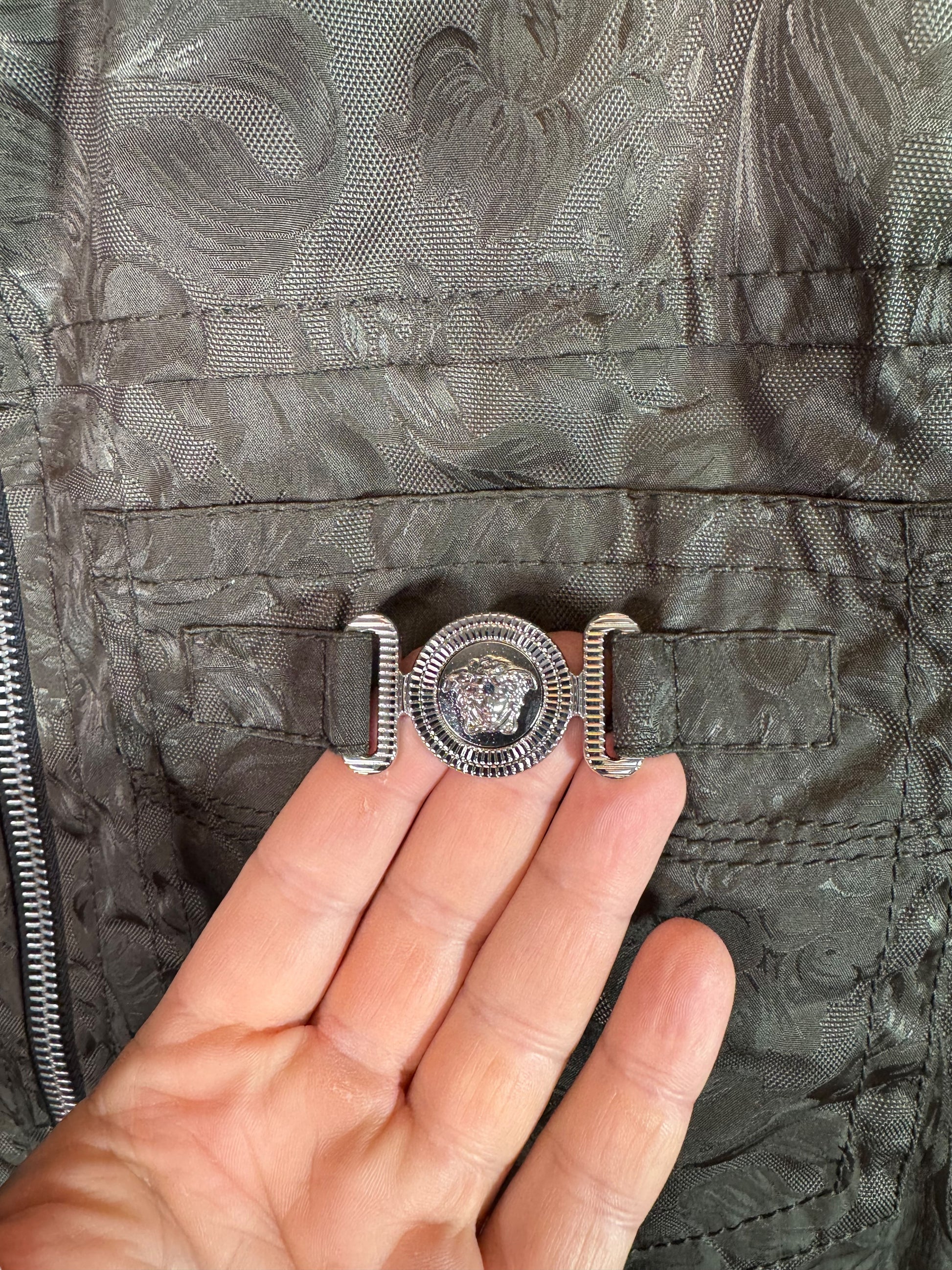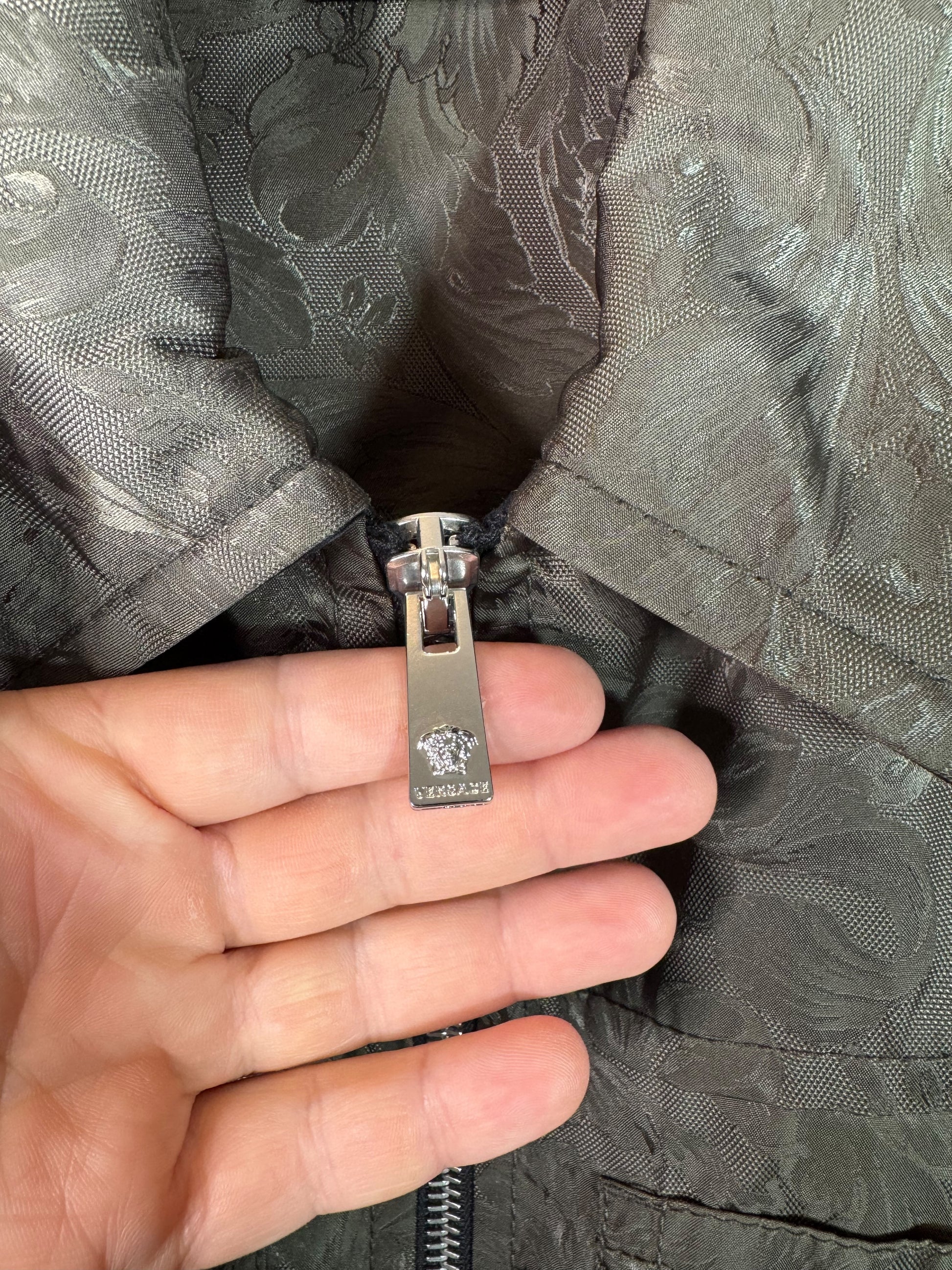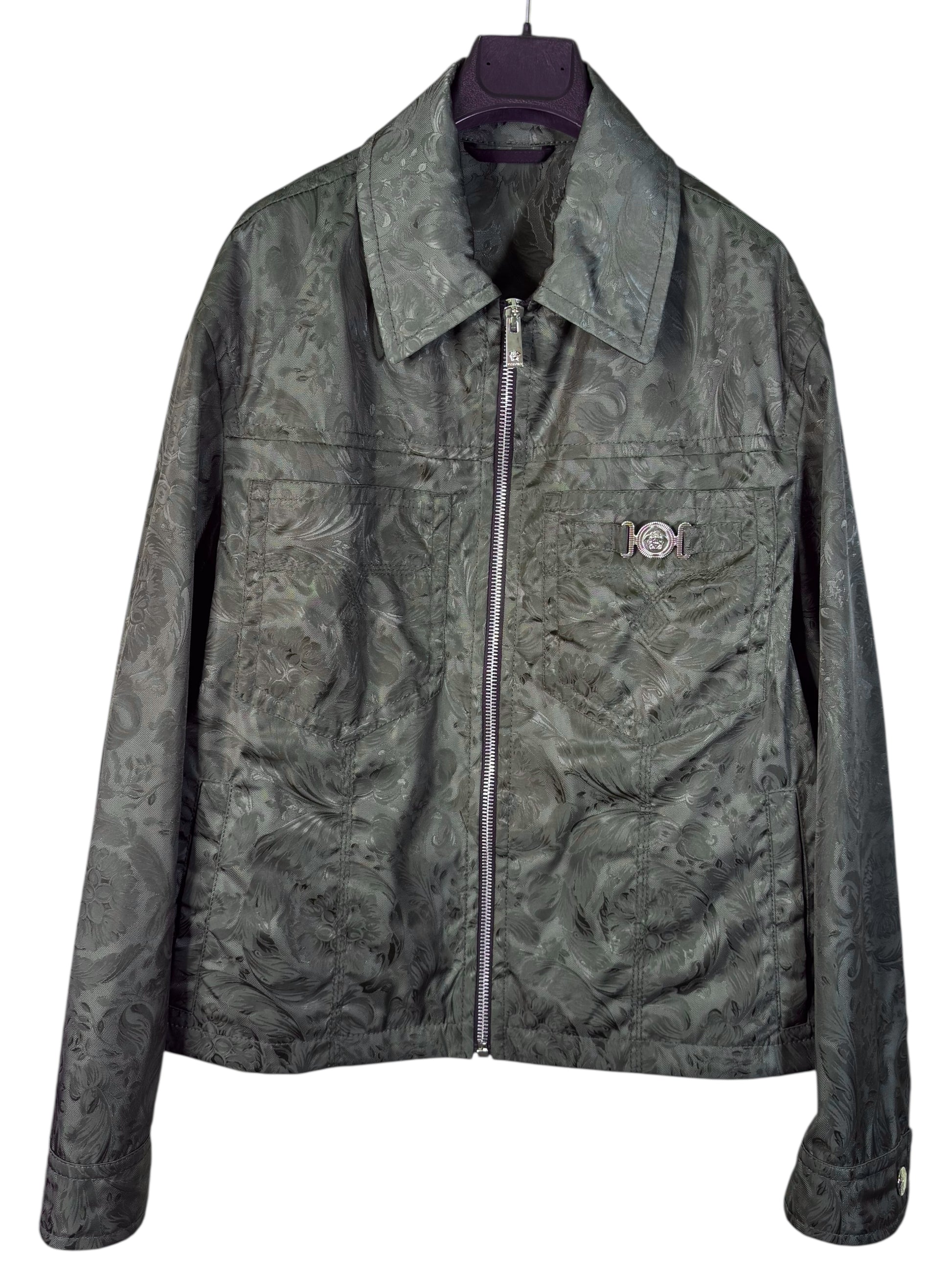 Giacca uomo Versace, Made in Italy. Modello in tessuto verde con lavorazione jacquard baroque tono su tono. Chiusura con zip logata, tasche frontali e iconico dettaglio Medusa in metallo applicato sul petto. Bottoni ai polsini logati e fodera interna coordinata. Un capo esclusivo, sofisticato e dal forte impatto stilistico.